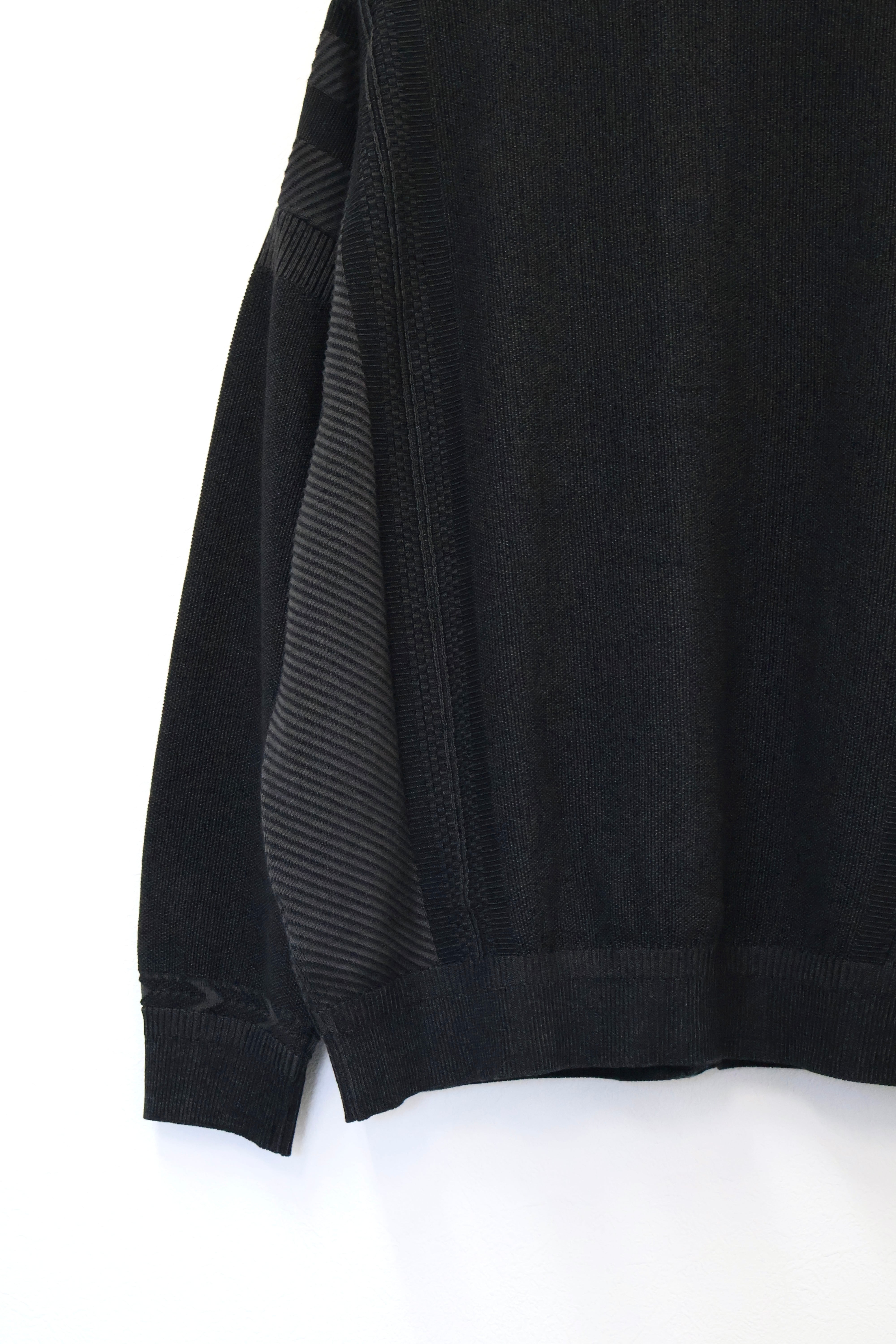 身頃中央と袖の鹿の子編みの細かな凹凸で冬の終わりのザラついた細かな水の様な雪を表し、身頃脇の斜線柄で春のやわらかな雨を表し、身頃の肩部分から裾にかけての柄で雪が解けて流れる様を表しています。