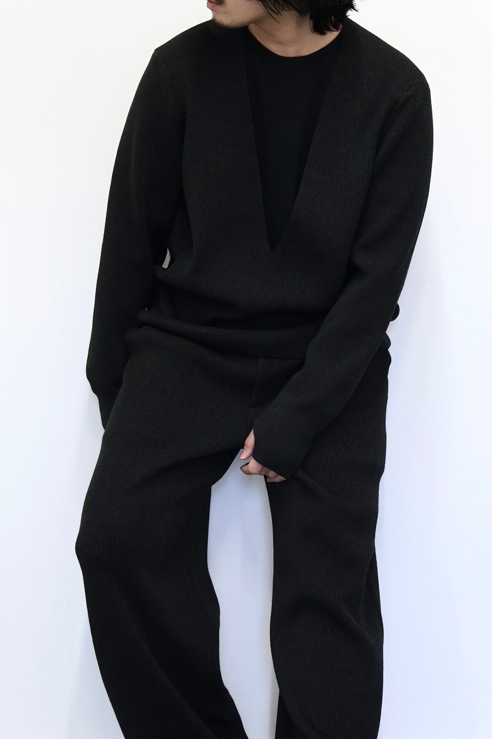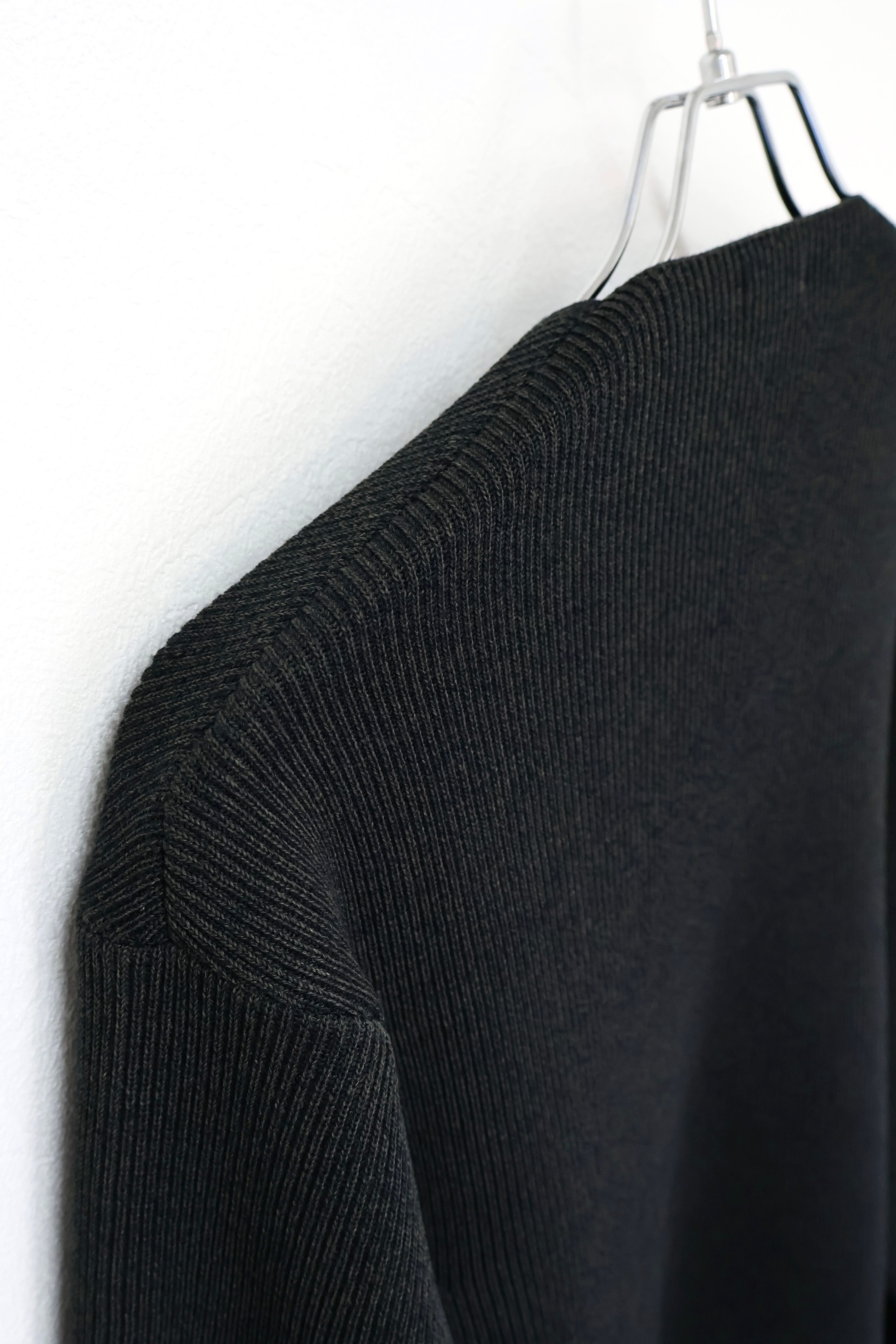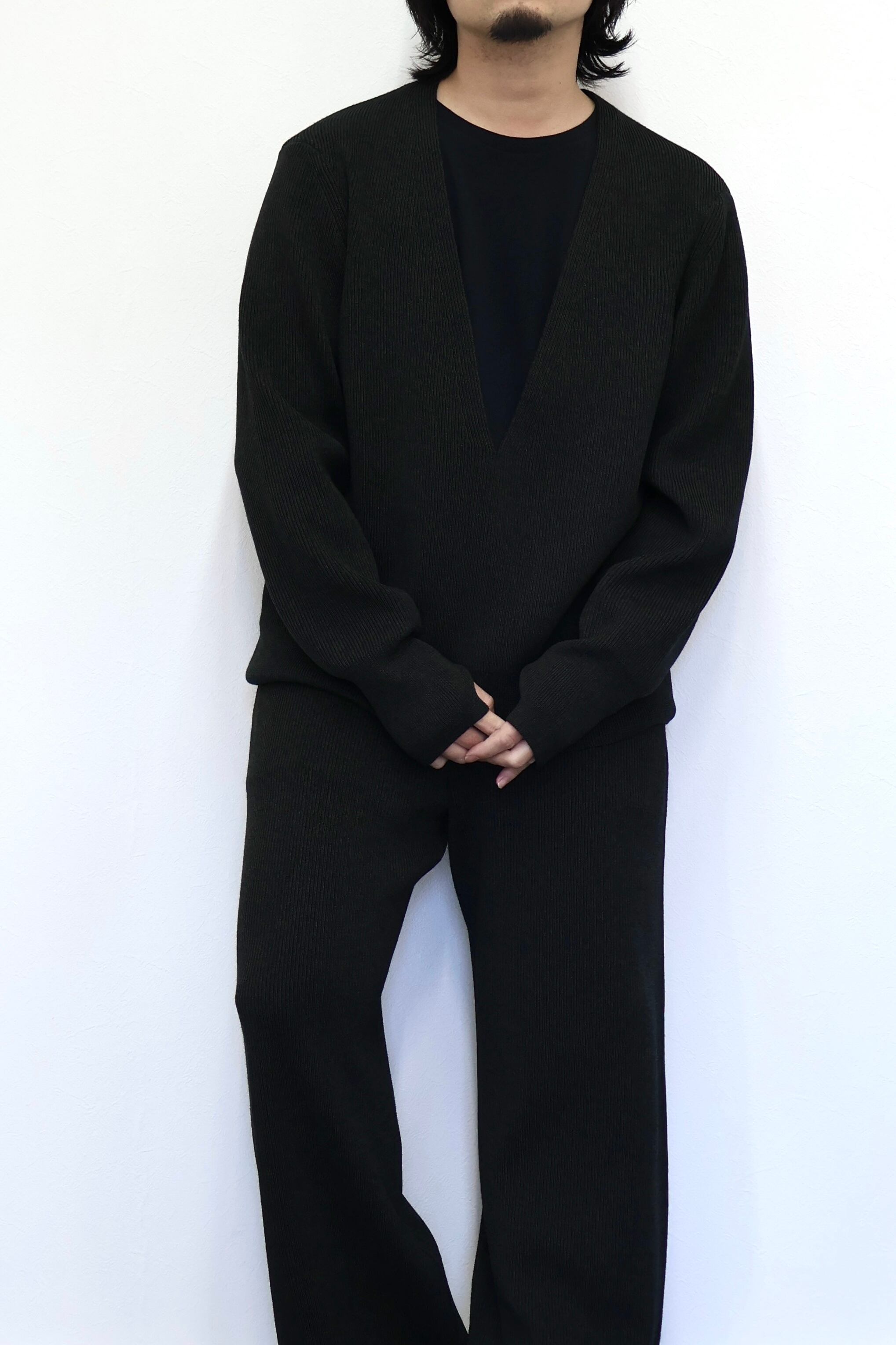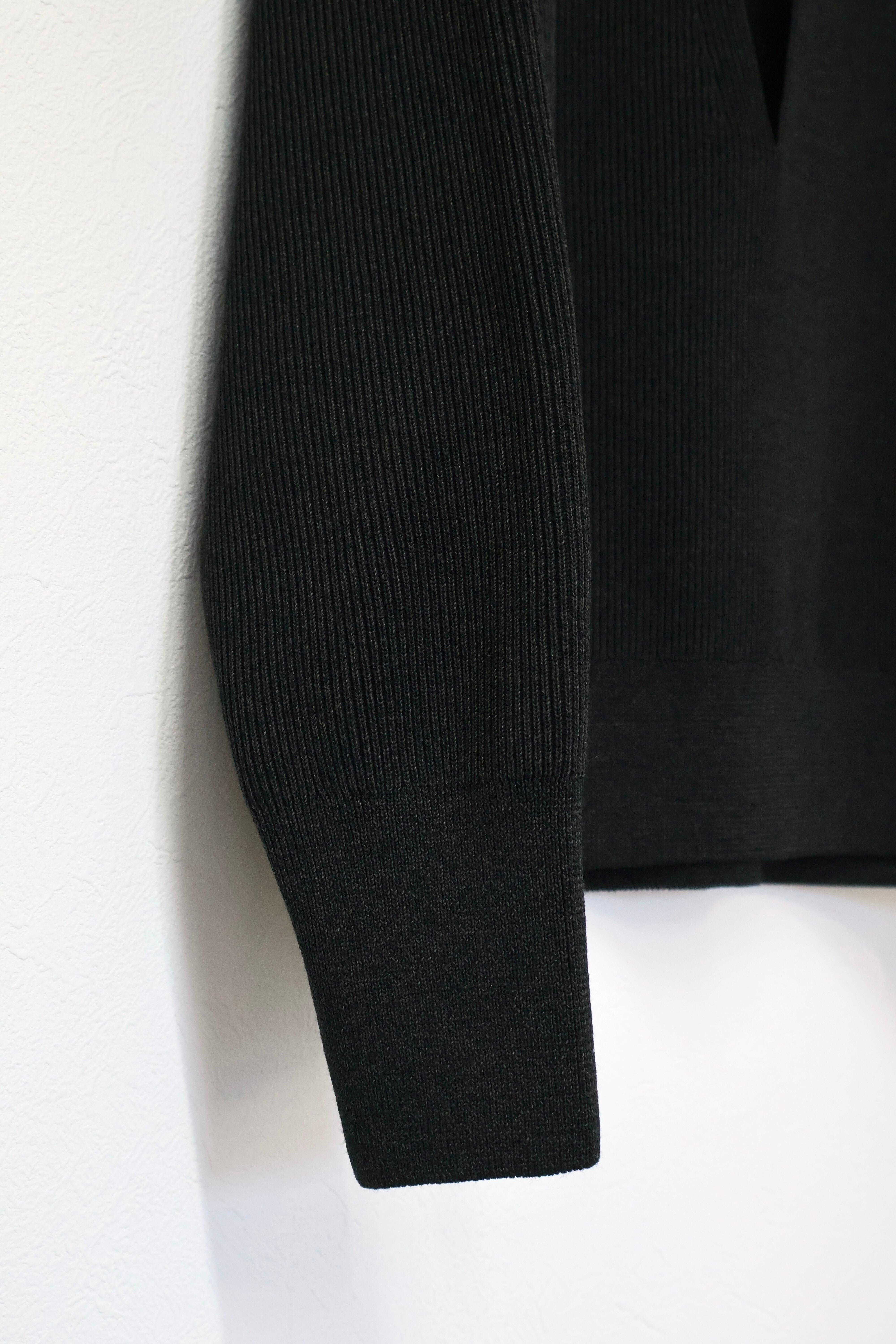 エアリーな膨らみを持つポリエステルと防縮ウールを撚糸した細番糸をバランスの難しいすっきりした両畦編みに落としこみ、きれいなハリ感とピリングしにくいドライタッチに仕上げたミドルゲージニット。春先の気候を考慮し様々なアイテムとレイヤードできるように深くあけたVゾーンが特徴の長袖 Vネックニット。ネック後ろが抜けてこないよう狭めに設計した天幅や、畦編みの開き具合や多少のダレ感も計算し、余り分量のでやすいアームホールは大胆にカッティングしたパターン設計。リラックス感あるサイジングでいて、かつ美しいバランスを求めて仕上げたアイテム。