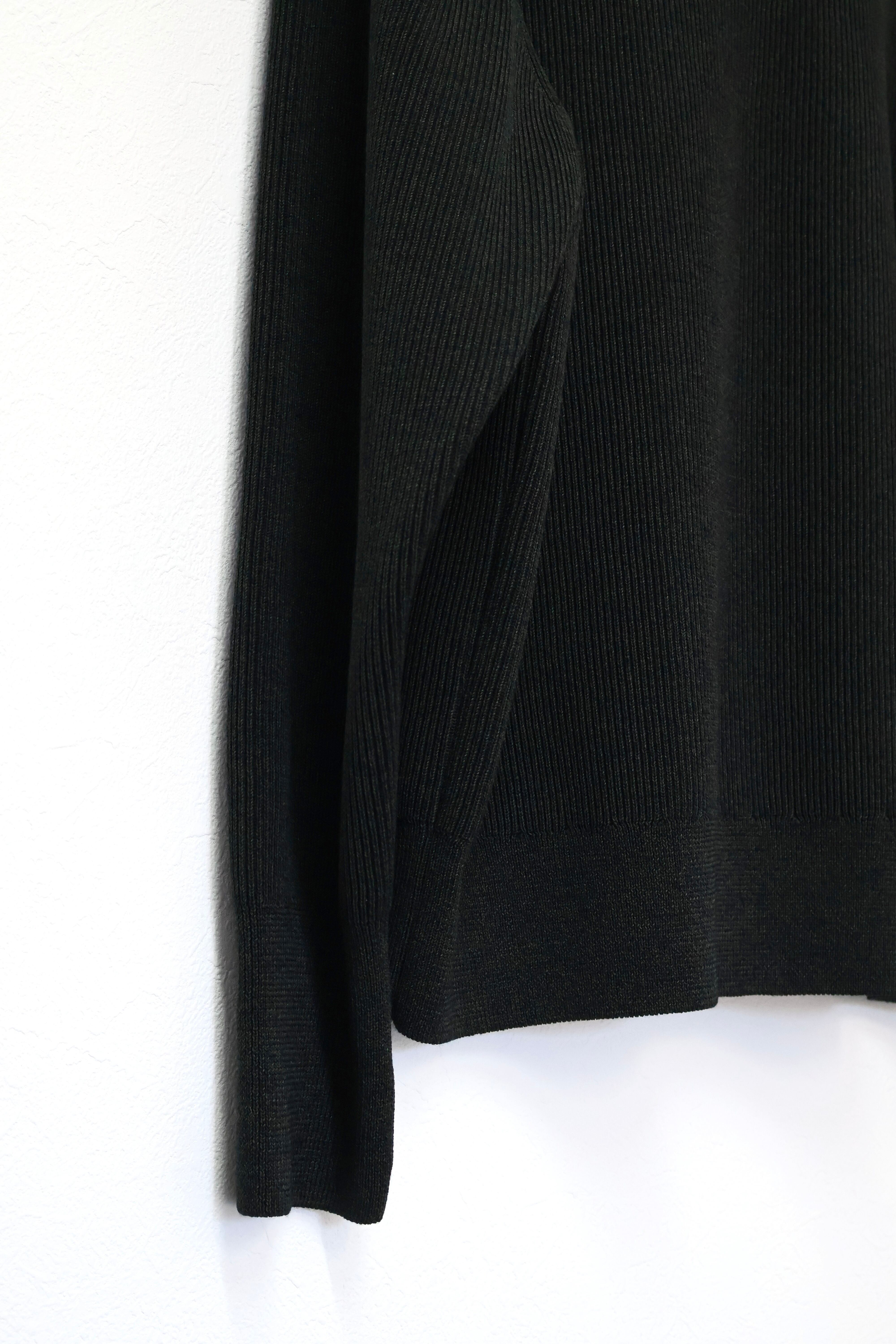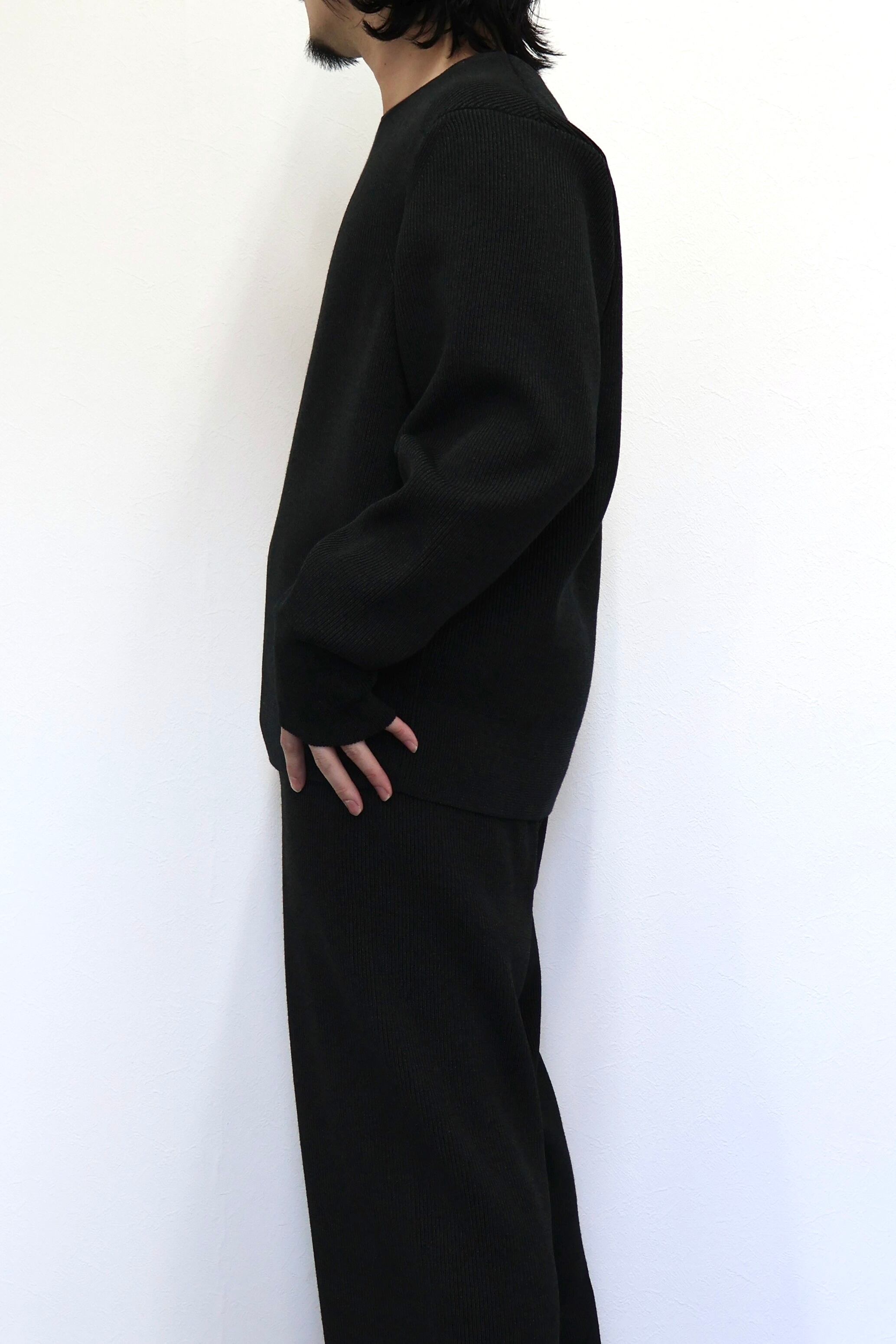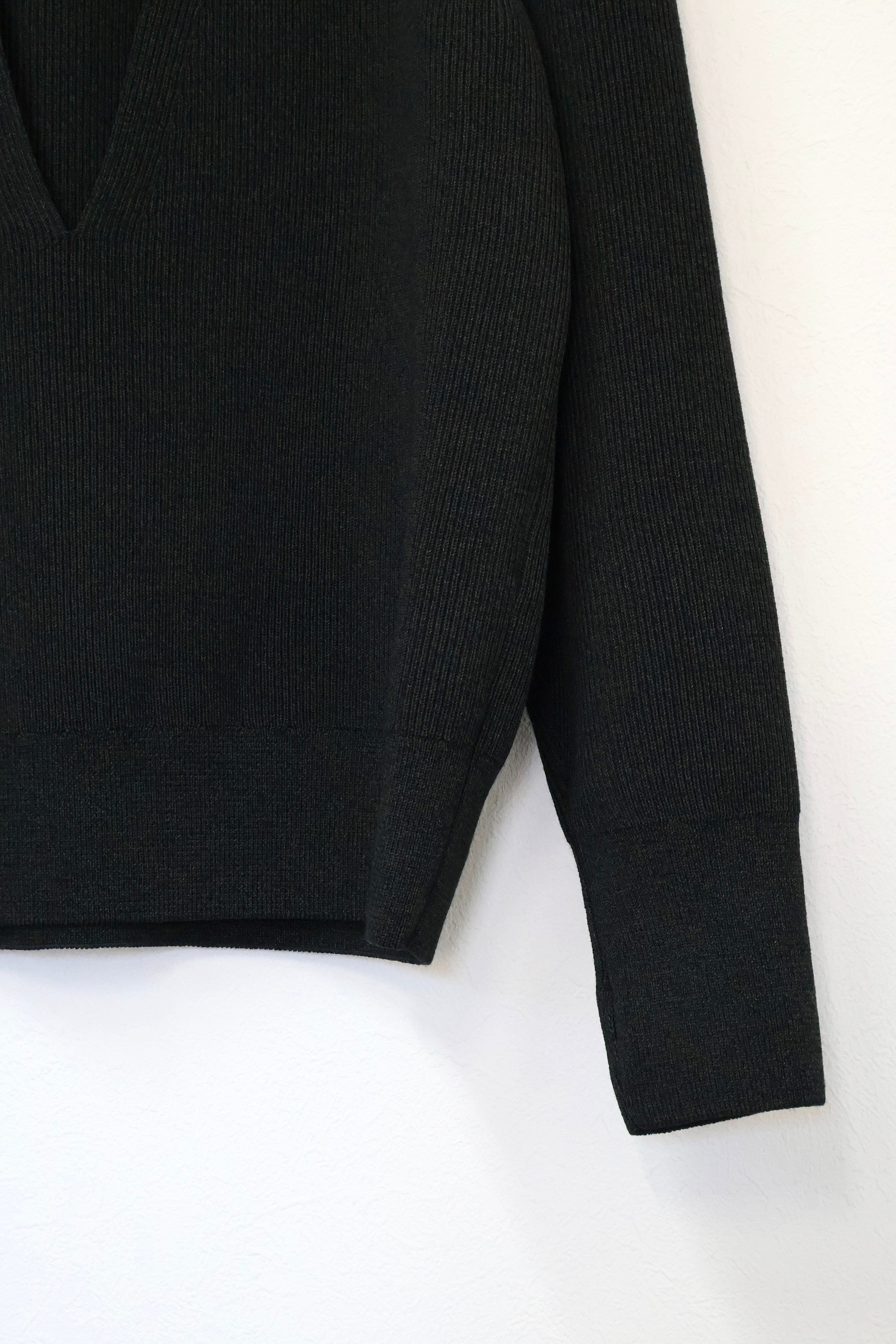エアリーな膨らみを持つポリエステルと防縮ウールを撚糸した細番糸をバランスの難しいすっきりした両畦編みに落としこみ、きれいなハリ感とピリングしにくいドライタッチに仕上げたミドルゲージニット。春先の気候を考慮し様々なアイテムとレイヤードできるように深くあけたVゾーンが特徴の長袖 Vネックニット。ネック後ろが抜けてこないよう狭めに設計した天幅や、畦編みの開き具合や多少のダレ感も計算し、余り分量のでやすいアームホールは大胆にカッティングしたパターン設計。リラックス感あるサイジングでいて、かつ美しいバランスを求めて仕上げたアイテム。