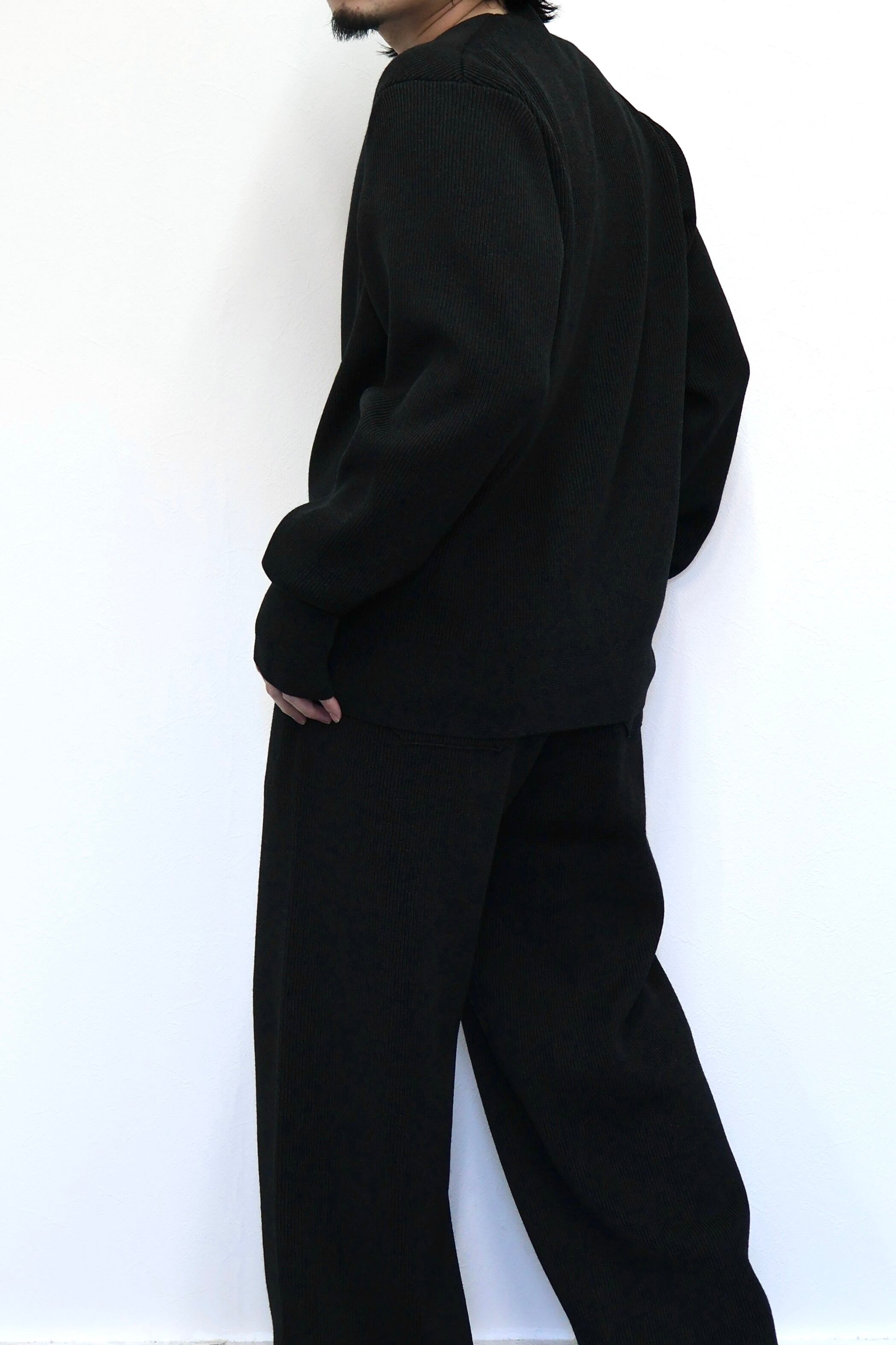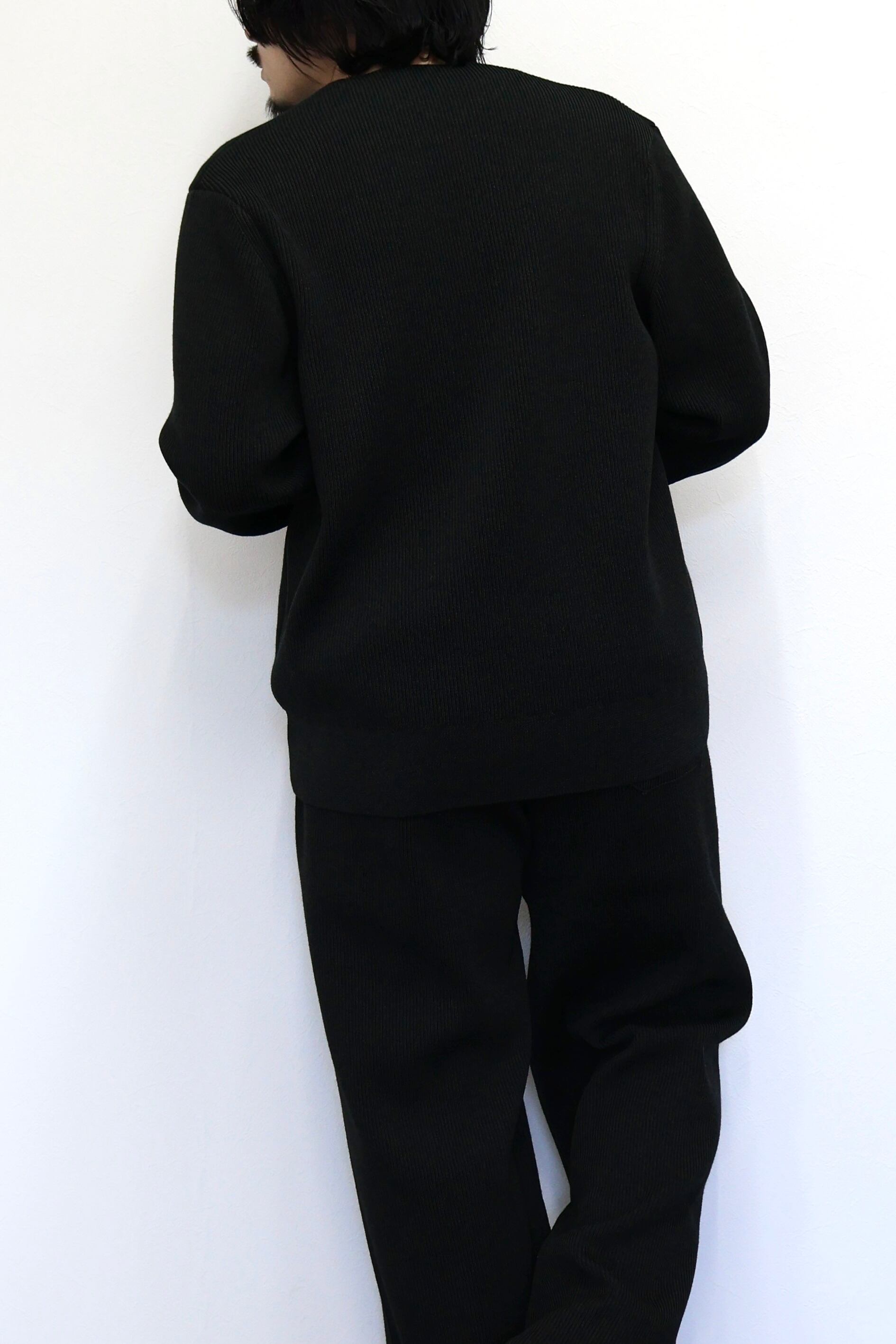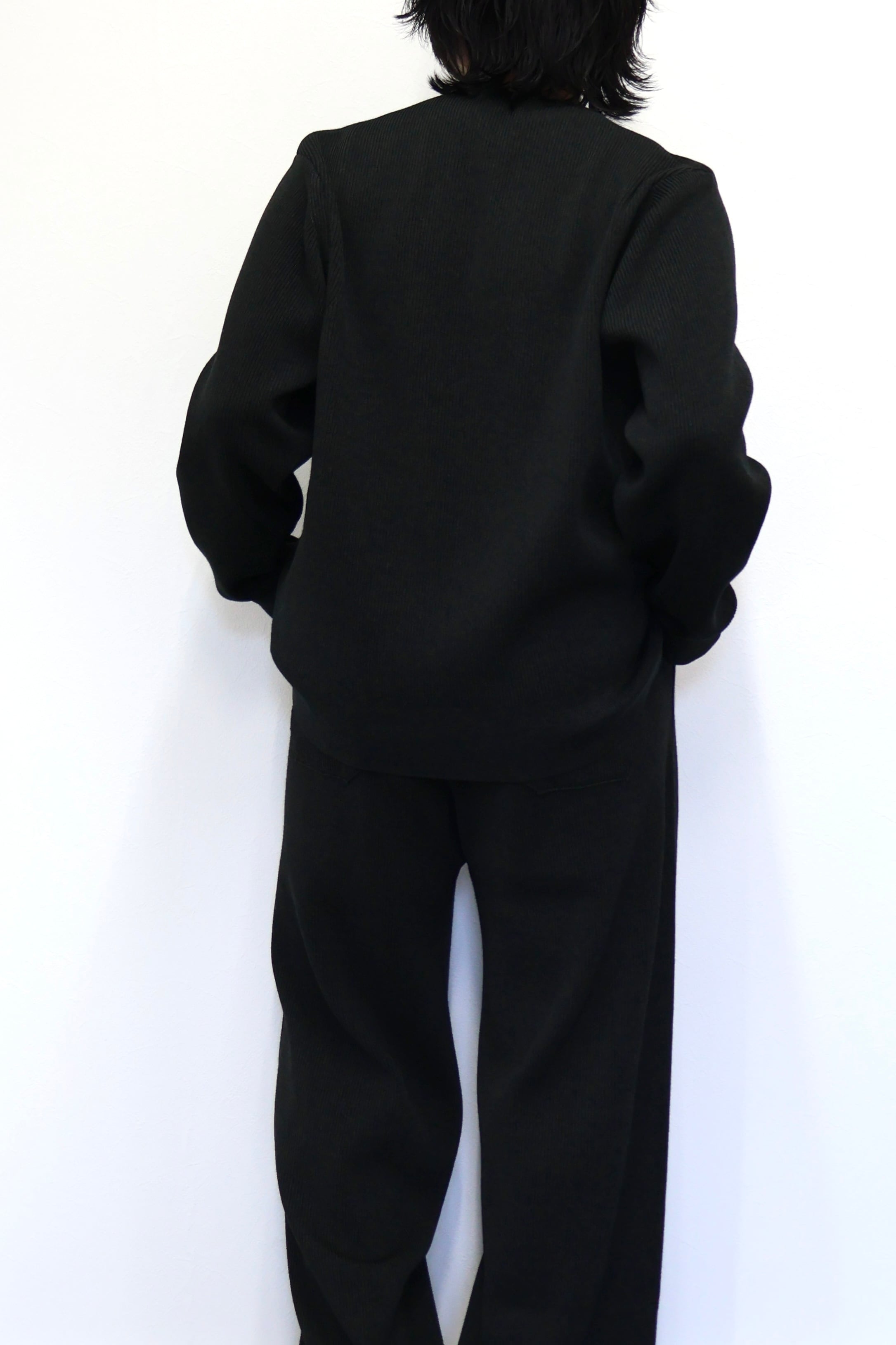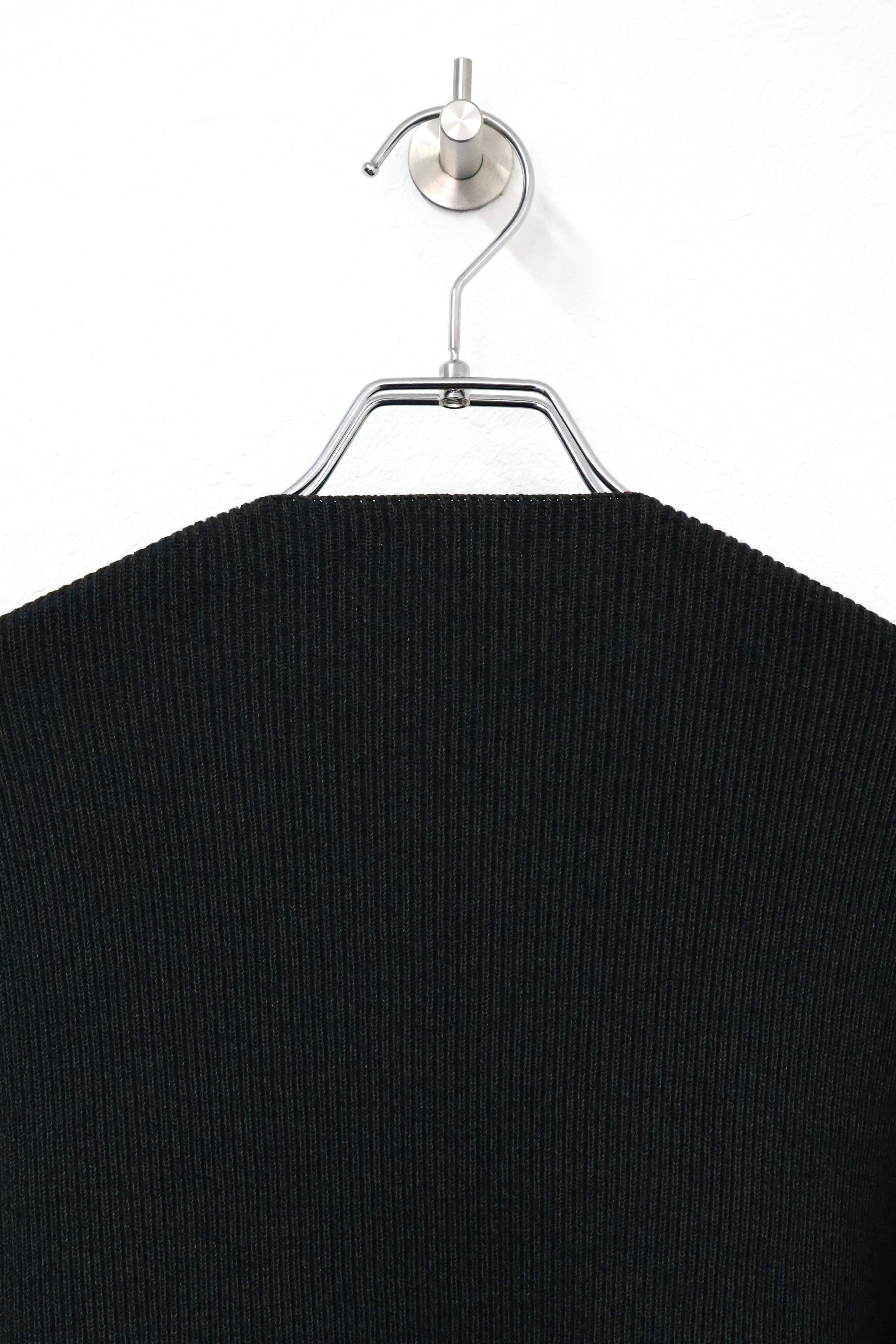 エアリーな膨らみを持つポリエステルと防縮ウールを撚糸した細番糸をバランスの難しいすっきりした両畦編みに落としこみ、きれいなハリ感とピリングしにくいドライタッチに仕上げたミドルゲージニット。春先の気候を考慮し様々なアイテムとレイヤードできるように深くあけたVゾーンが特徴の長袖 Vネックニット。ネック後ろが抜けてこないよう狭めに設計した天幅や、畦編みの開き具合や多少のダレ感も計算し、余り分量のでやすいアームホールは大胆にカッティングしたパターン設計。リラックス感あるサイジングでいて、かつ美しいバランスを求めて仕上げたアイテム。