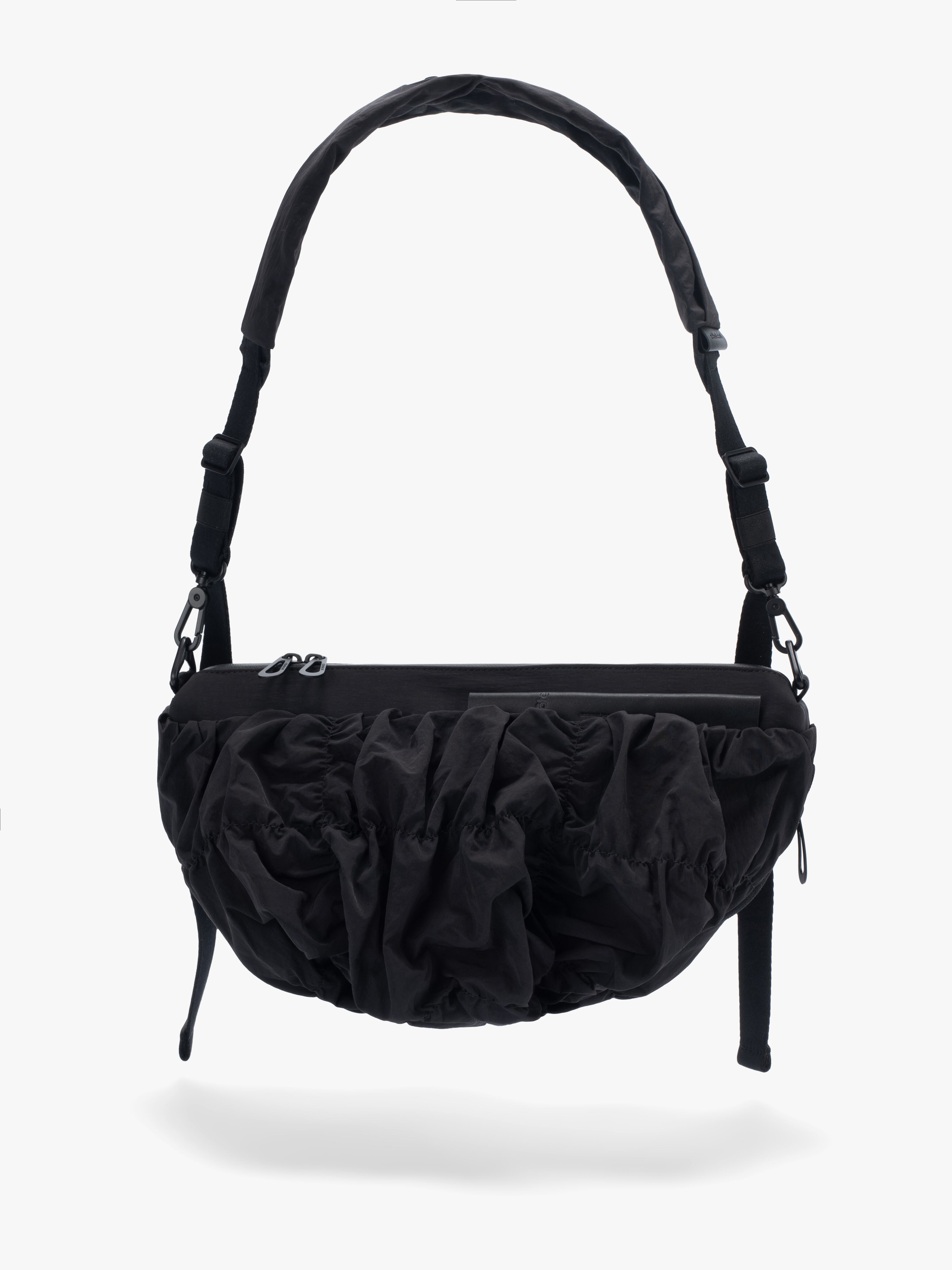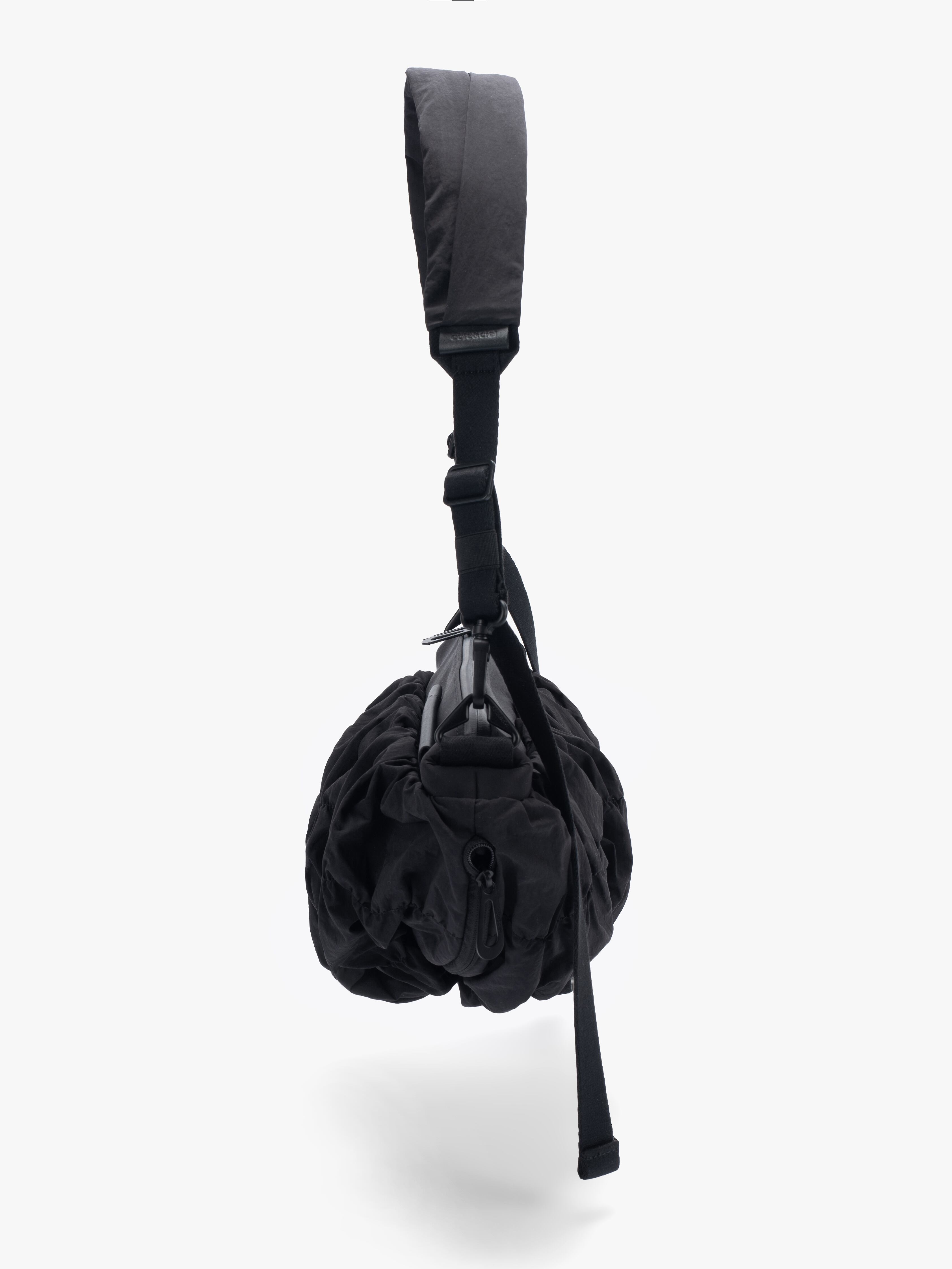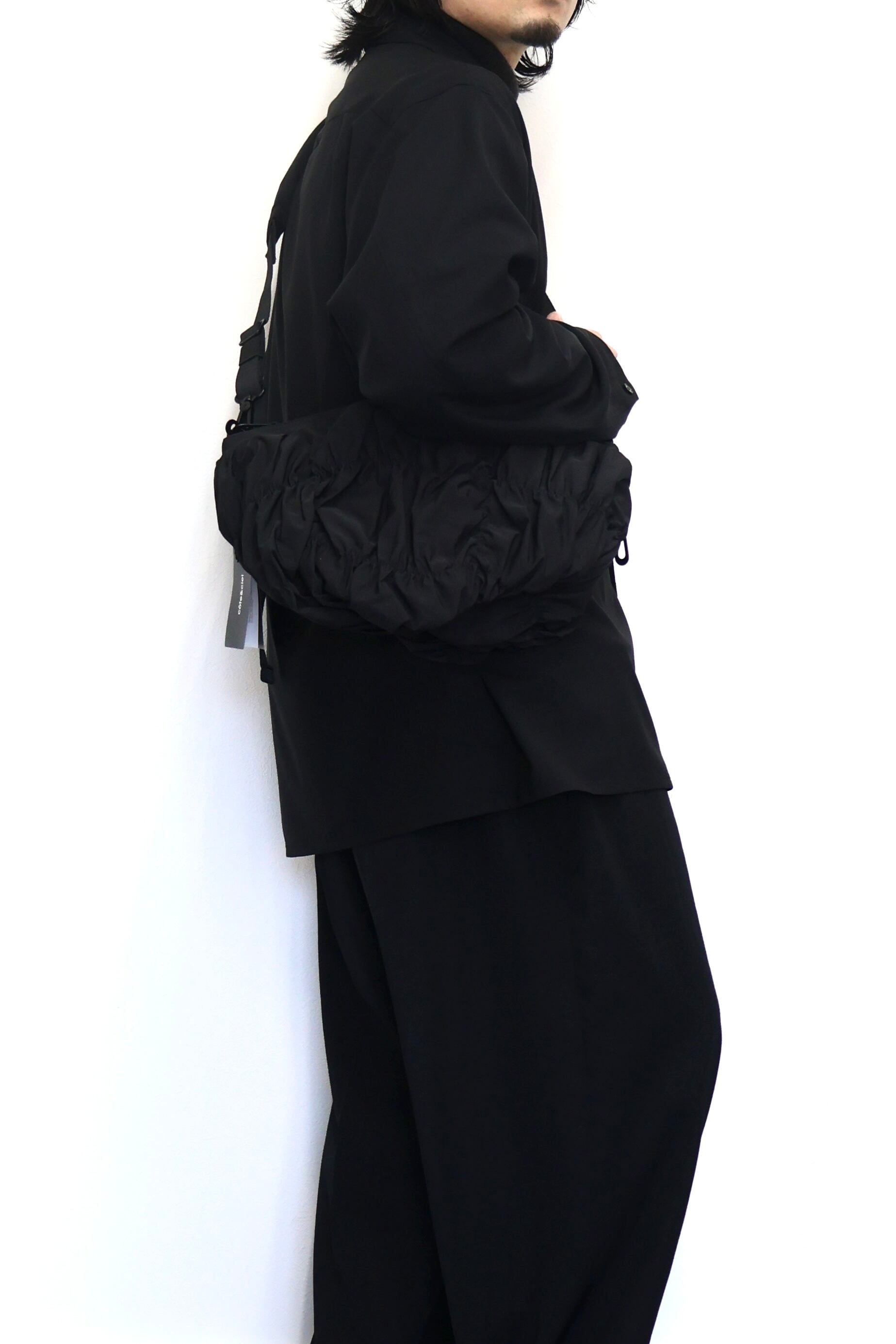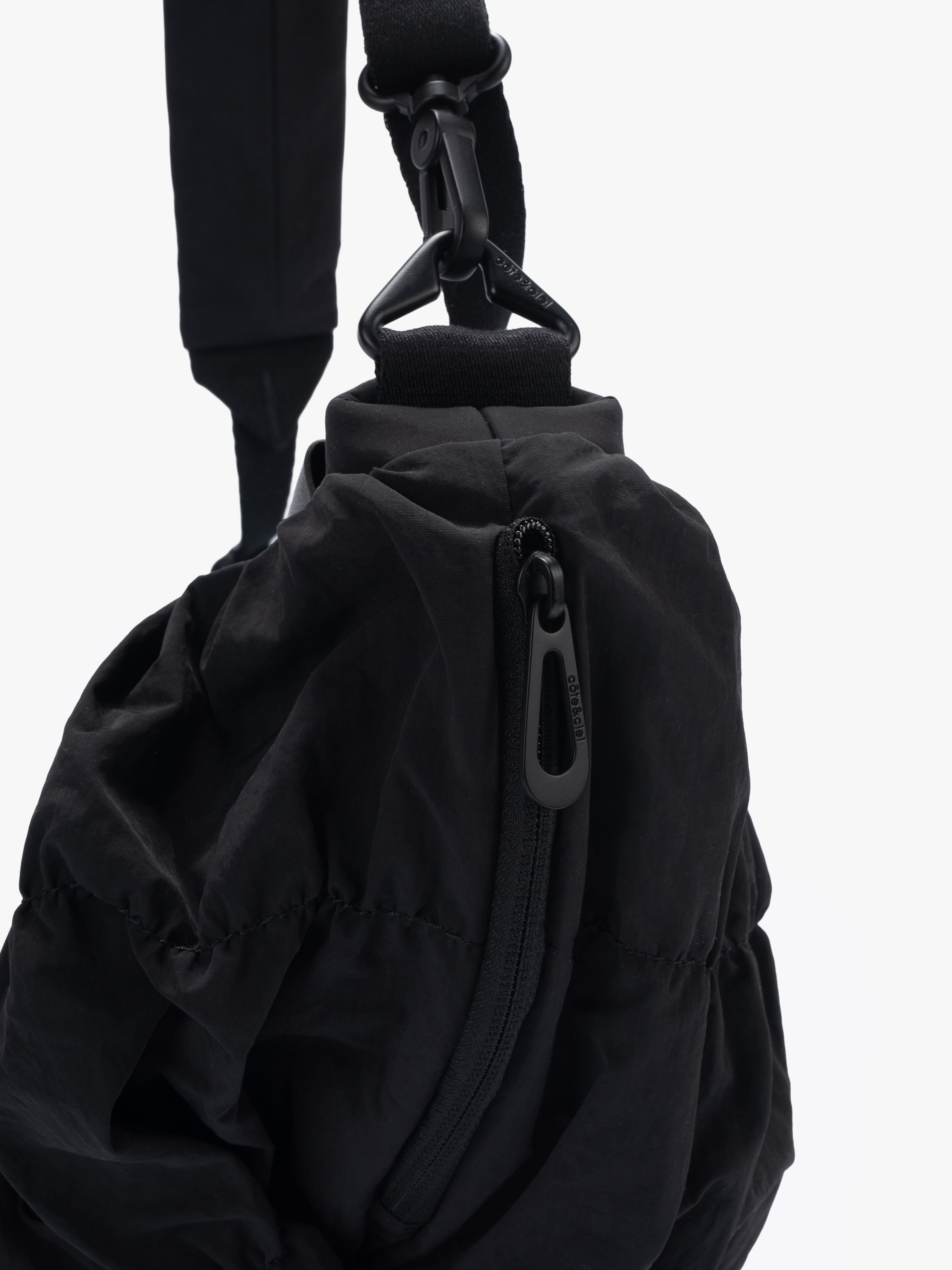 「ORNE」は身体の動きに調和するように設計されておりその彫刻的なシルエットが自然に身体のラインに寄り添います。滑らかなナイロンを使用した「Gathered Black」の素材は柔らかく折り目を寄せることで流動的で質感豊かな表情を作り出しています。バッグの底部に施されたわずかな「ひねり」が躍動感を強調。フォルム全体に立体的な奥行きを与えています。メインコンパートメントには撥水ファスナーを採用。外側のレザータグにはcôte&cielのブランドロゴが型押し。また取り外し可能なファスナー付きの「ADDA」ショルダーストラップは単体でミニマルなクロスボディバッグとしてもお使いいただけます。