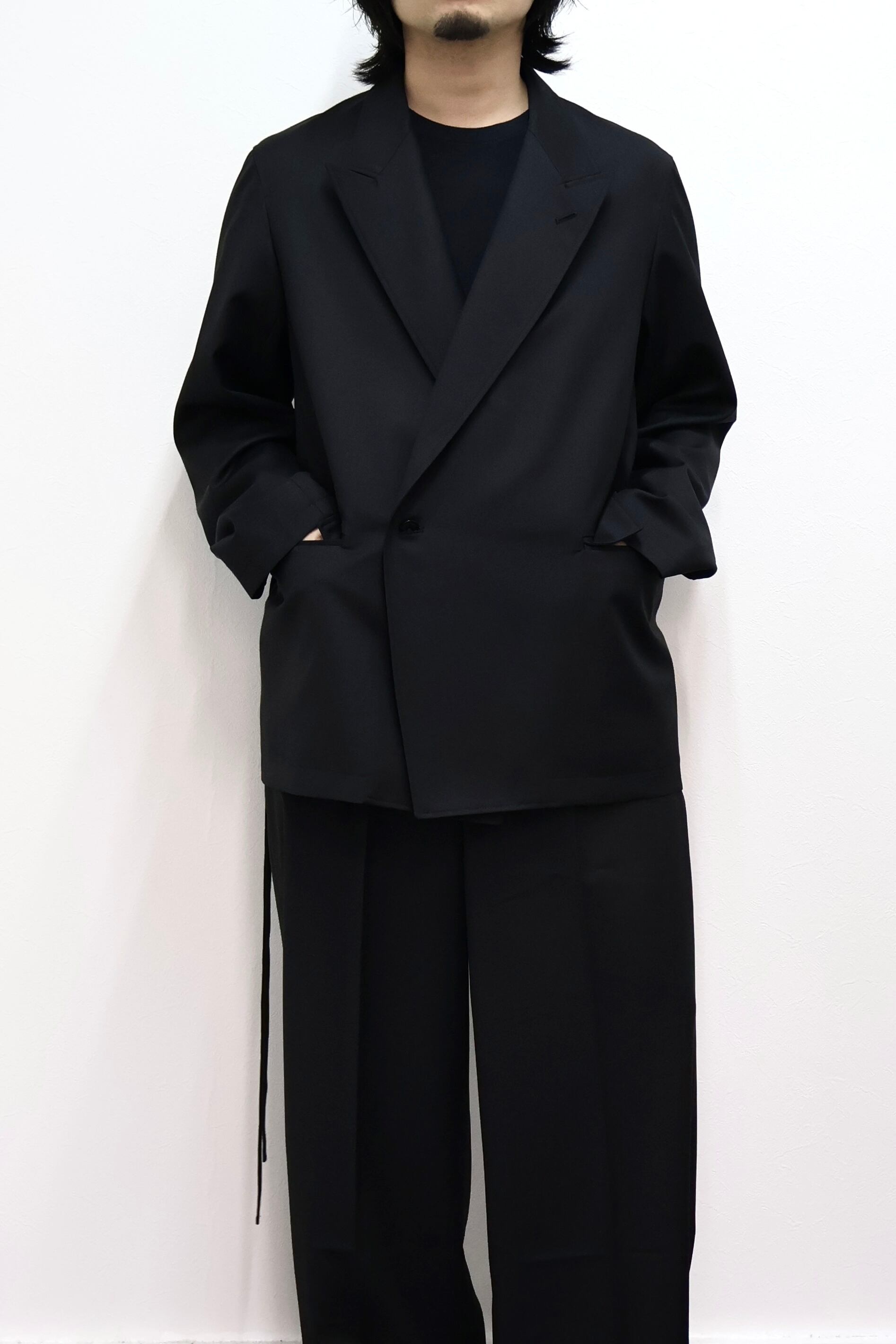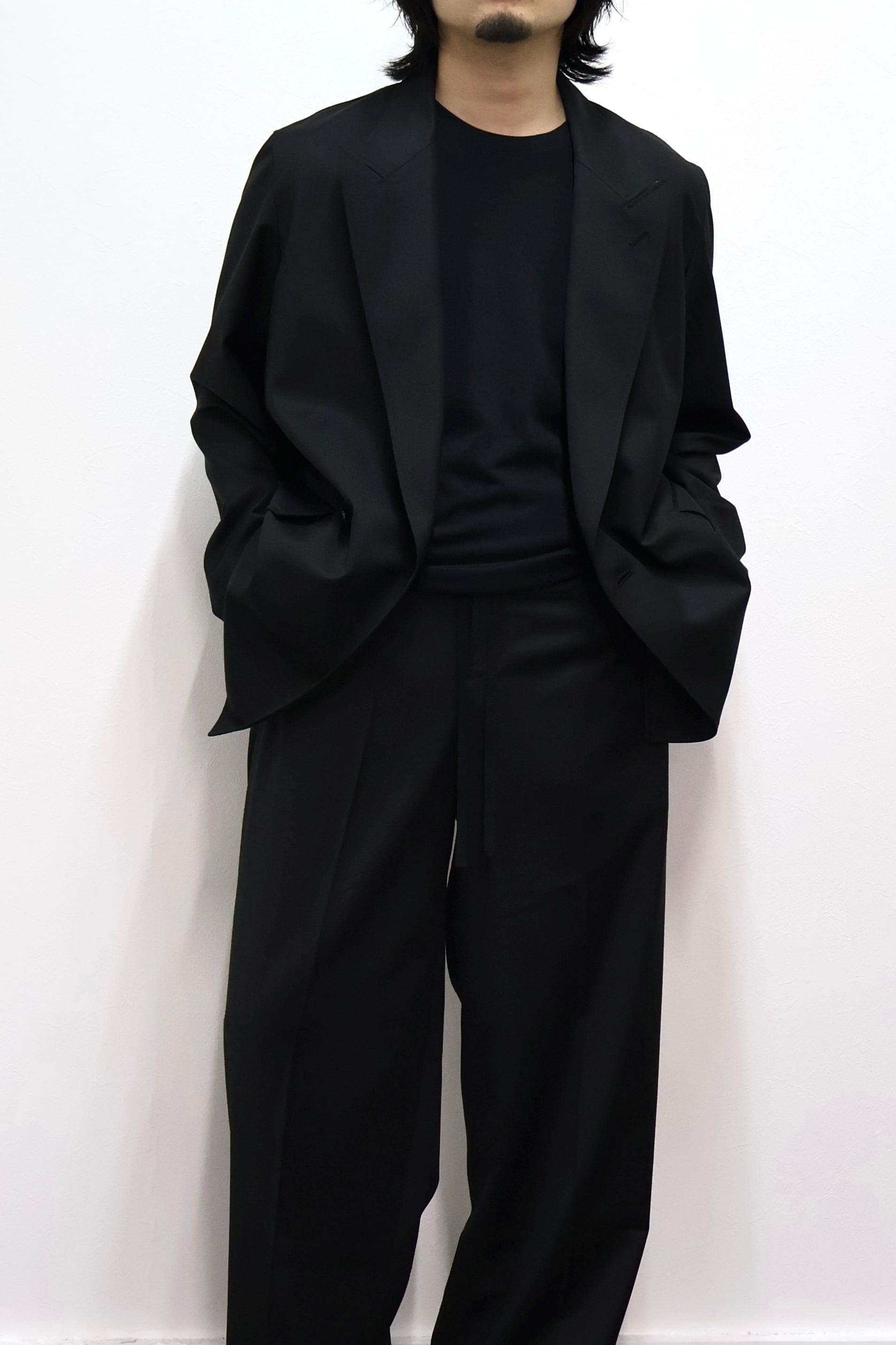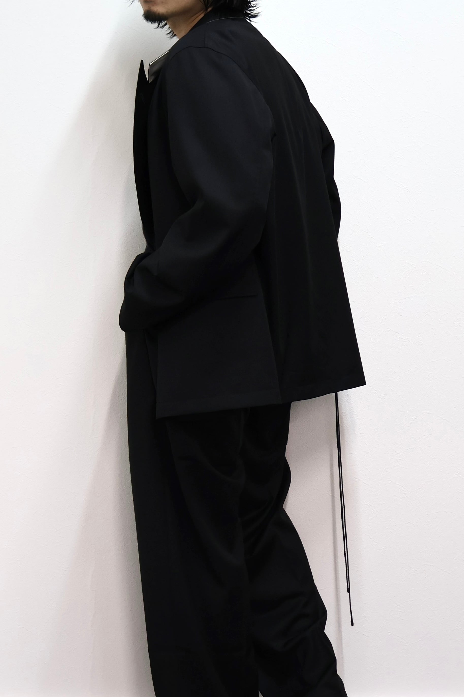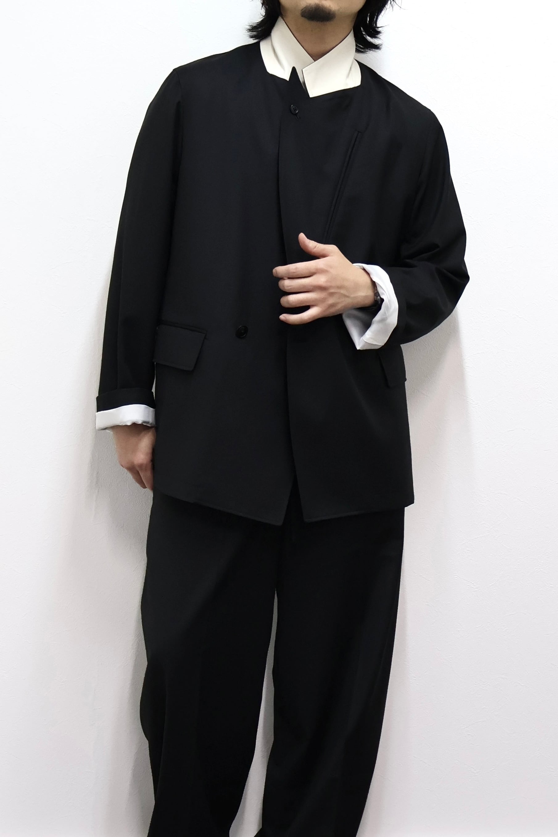 サイズ感は少し肩を落としつつ、身幅広めにとったのリラックスフィット。ソフト感を重視し、芯は極力薄いものを採用。肩パットや雪わたも排除して制作しており羽織のような雰囲気に。
