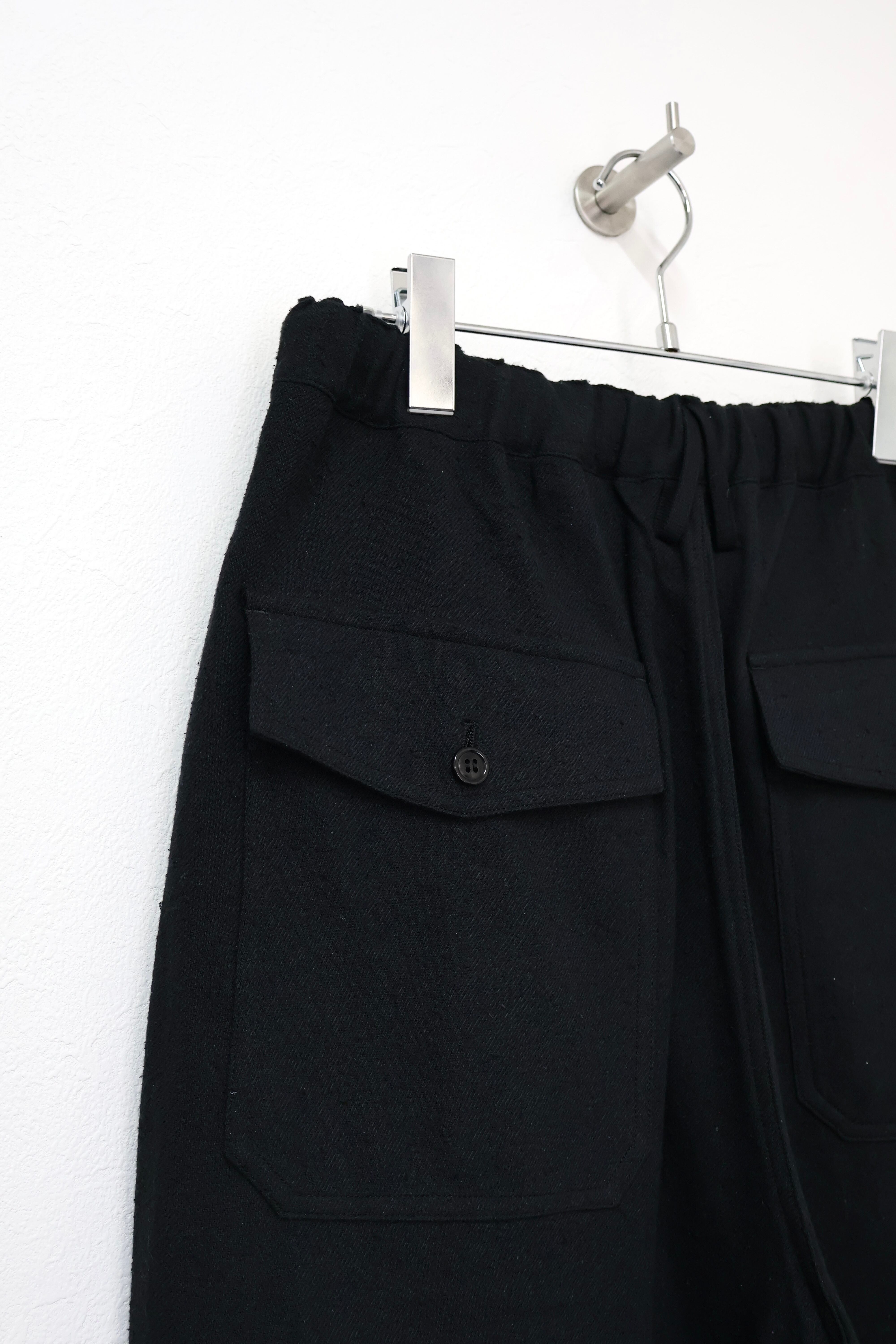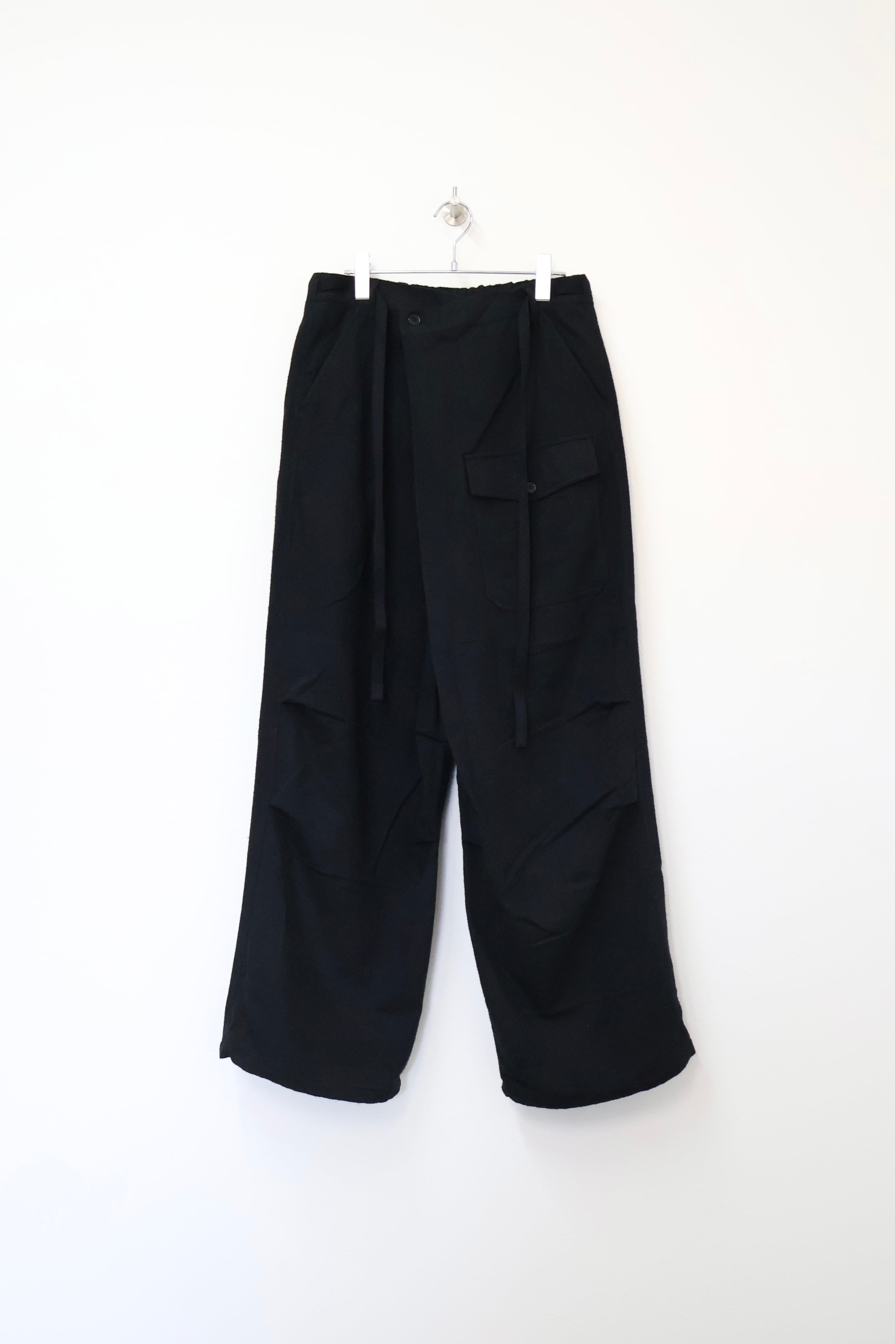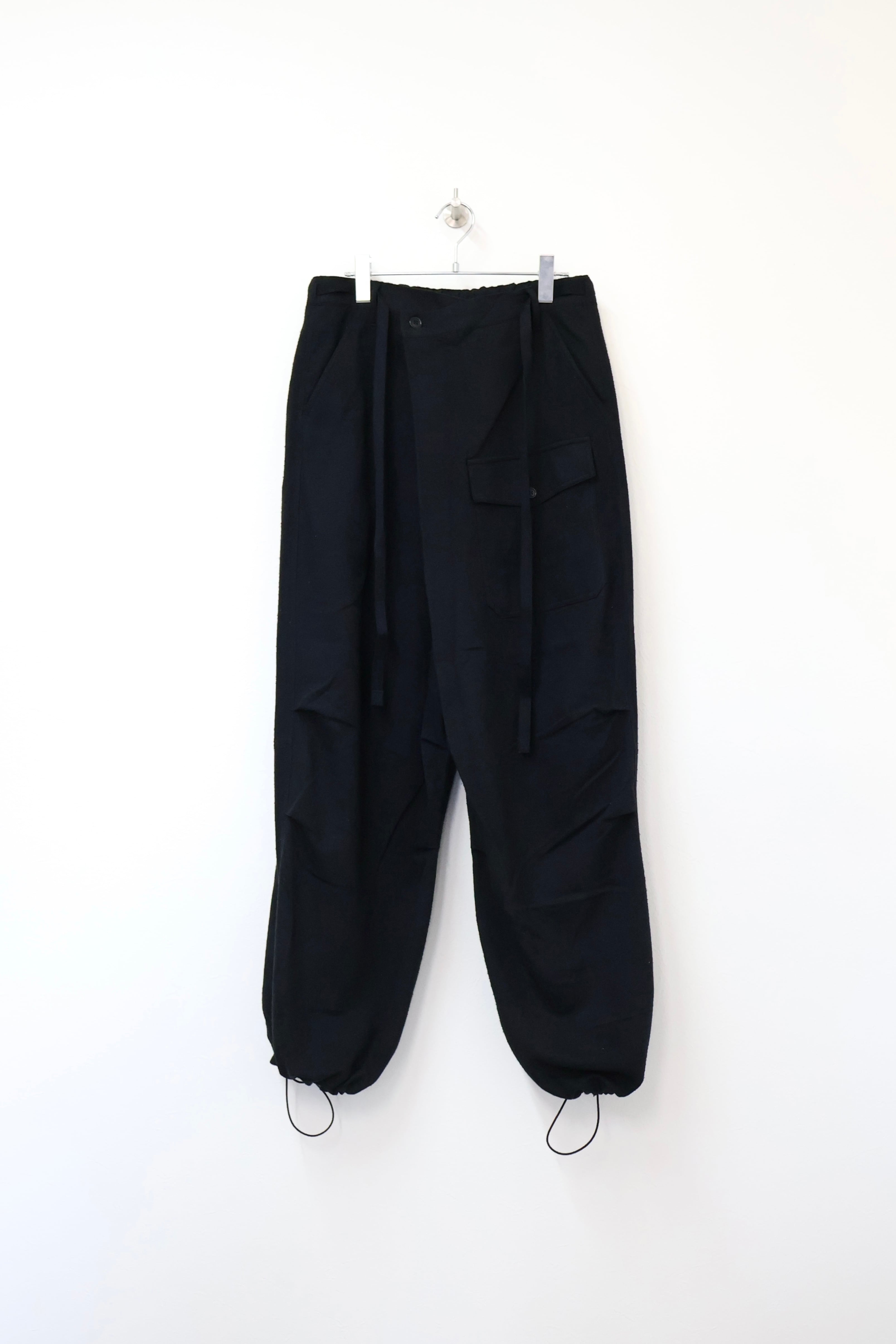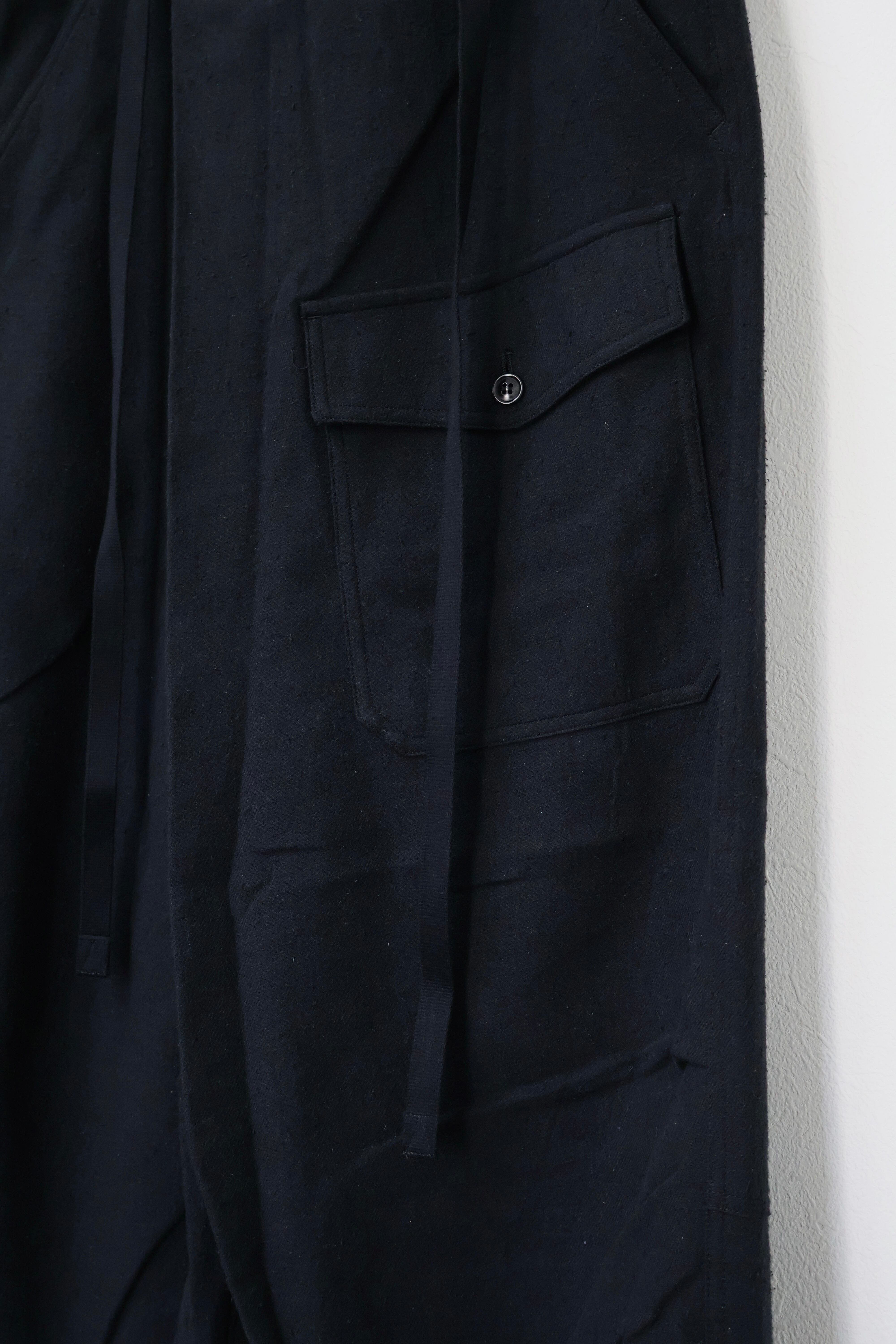 新型ラップディテールオーバーパンツ。前見頃の大きなタックが印象的なパターン構造にイギリス軍のSAS OVER PANTSのディティールを組み合わせたデザイン。シルエットはボリューム感のあるワイドストレート。ウエストは平紐、裾はスピンドルにてシルエットの調整可能。生地は播州産地にて織りあげたシルクコットンヴィンテージネル。滑らかな肌触りと落ち感、素材特有のネップ感が魅力の素材。保温性、吸湿性、放湿性が高い点も魅力。