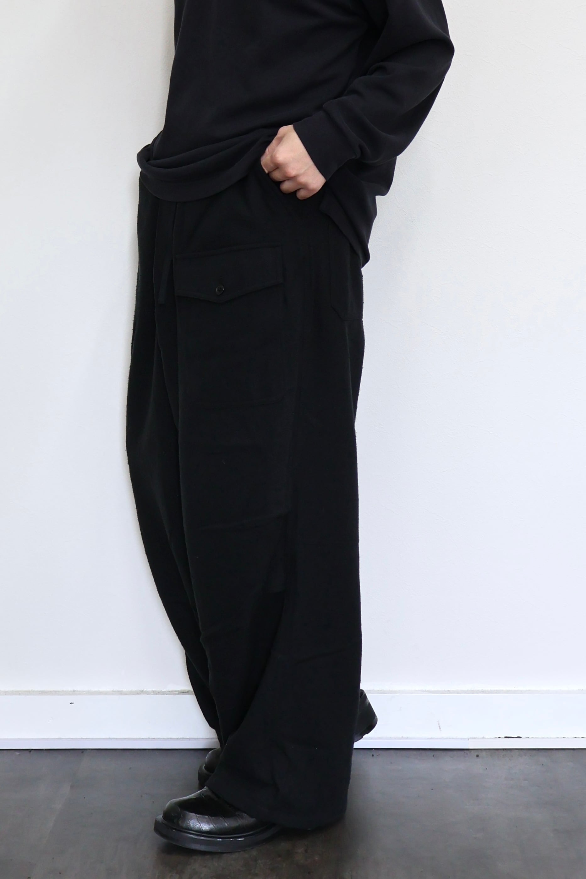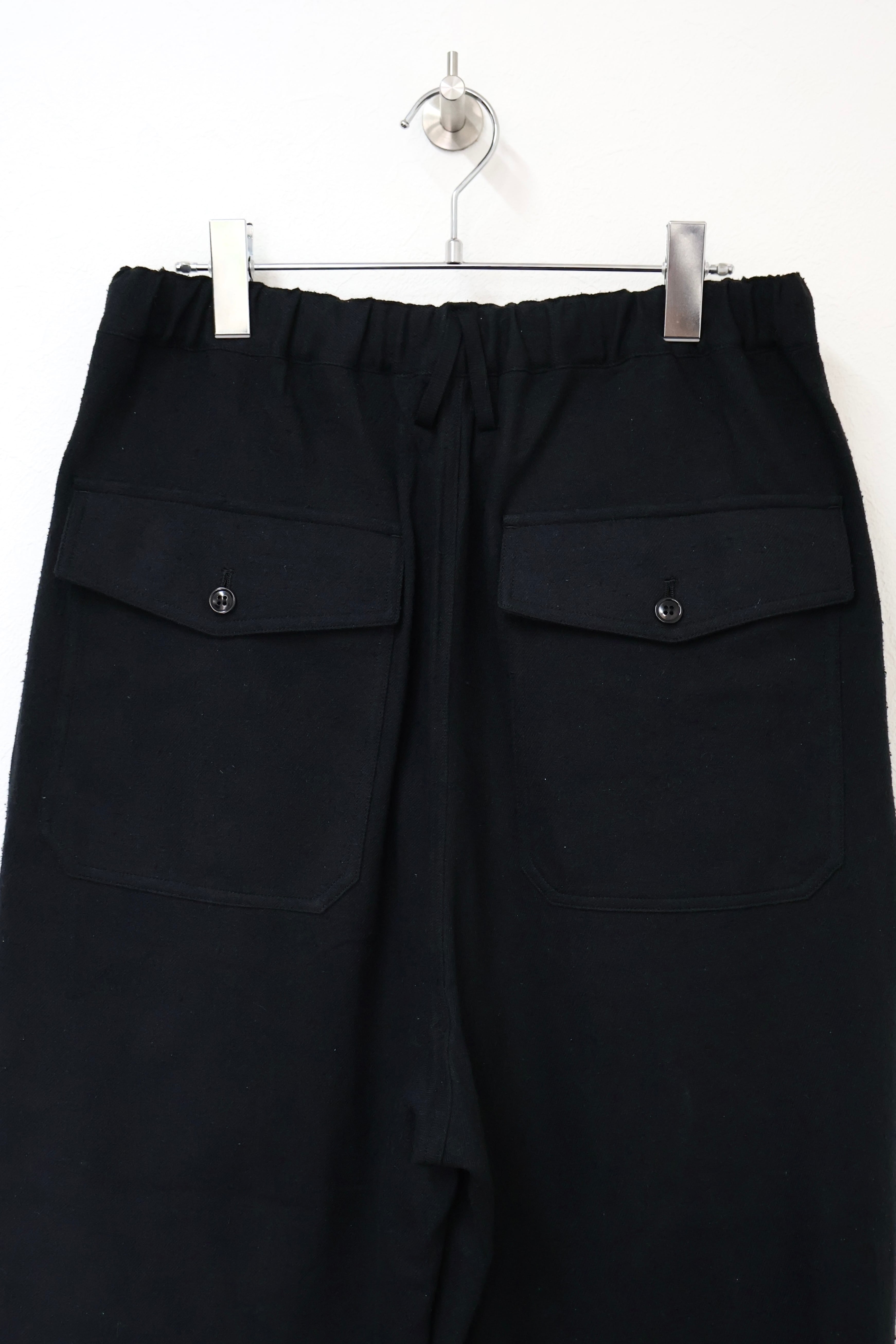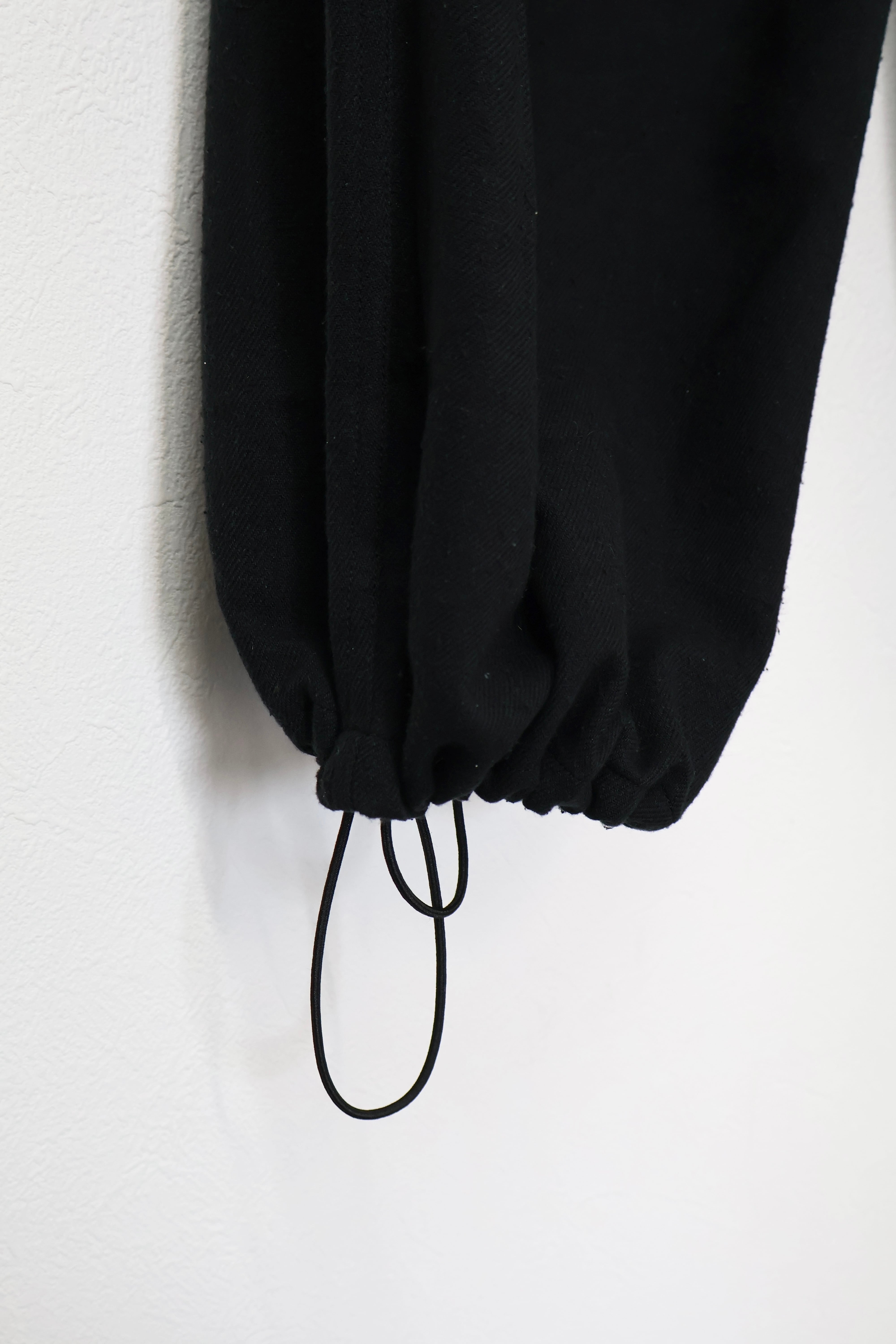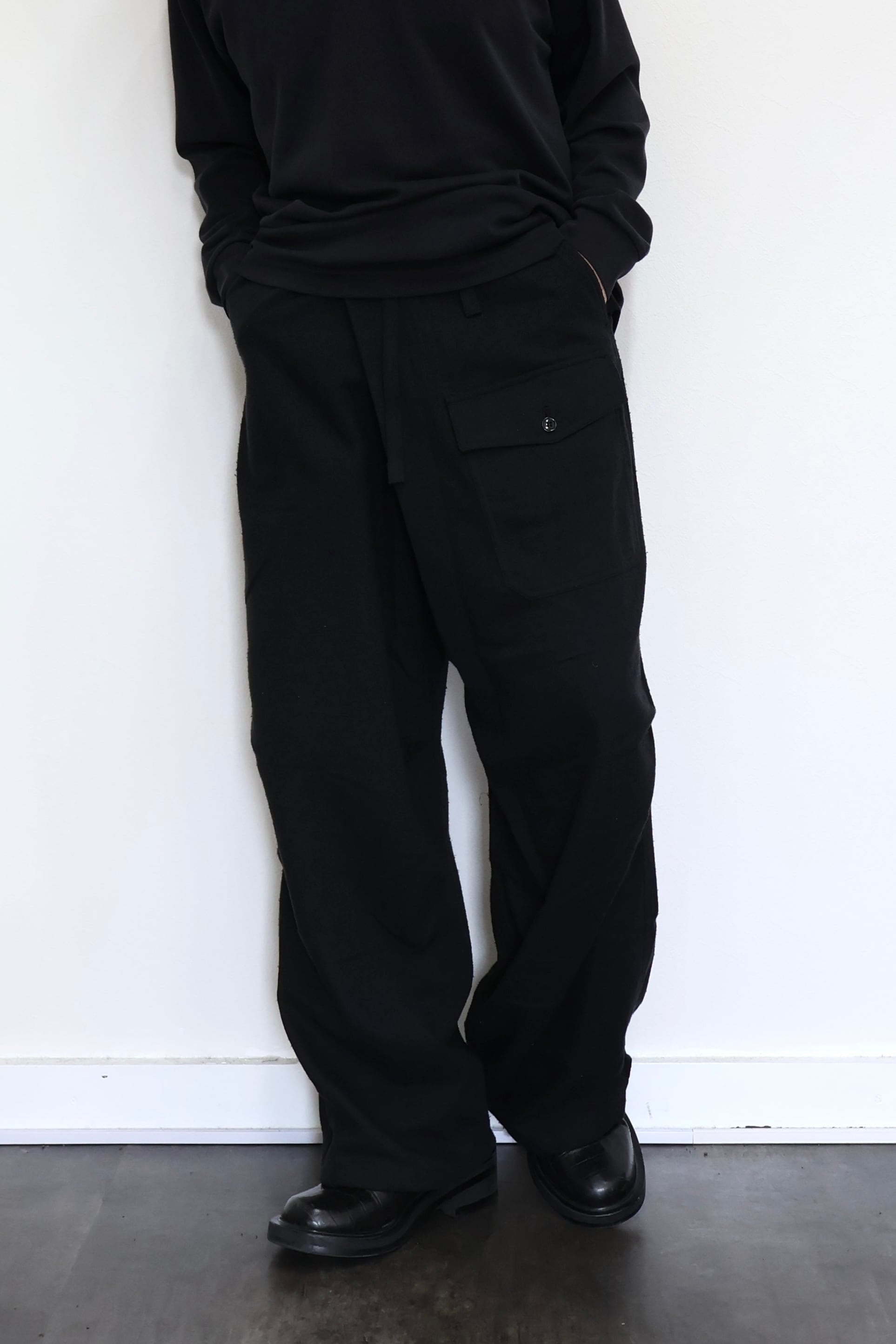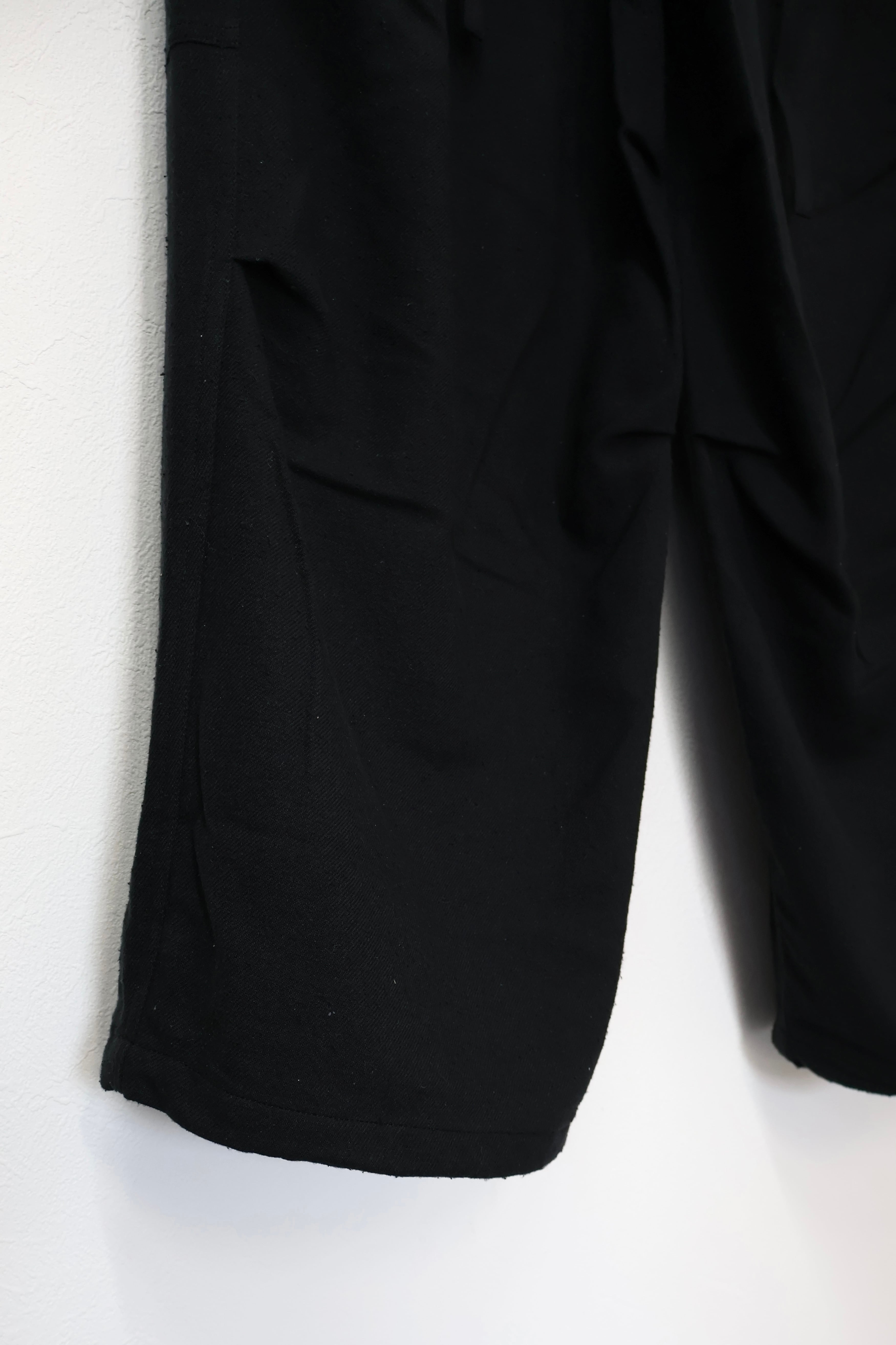 新型ラップディテールオーバーパンツ。前見頃の大きなタックが印象的なパターン構造にイギリス軍のSAS OVER PANTSのディティールを組み合わせたデザイン。シルエットはボリューム感のあるワイドストレート。ウエストは平紐、裾はスピンドルにてシルエットの調整可能。生地は播州産地にて織りあげたシルクコットンヴィンテージネル。滑らかな肌触りと落ち感、素材特有のネップ感が魅力の素材。保温性、吸湿性、放湿性が高い点も魅力。