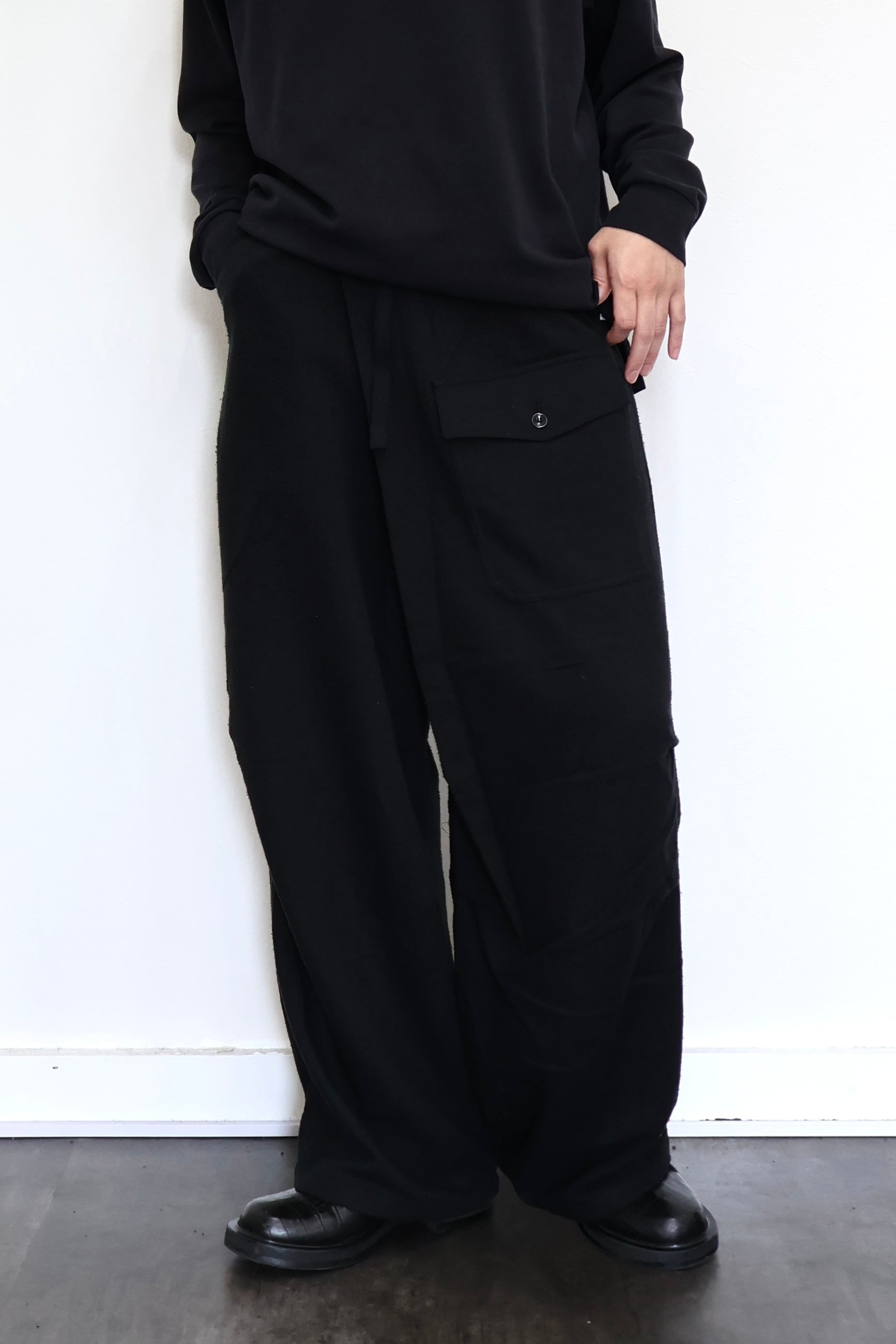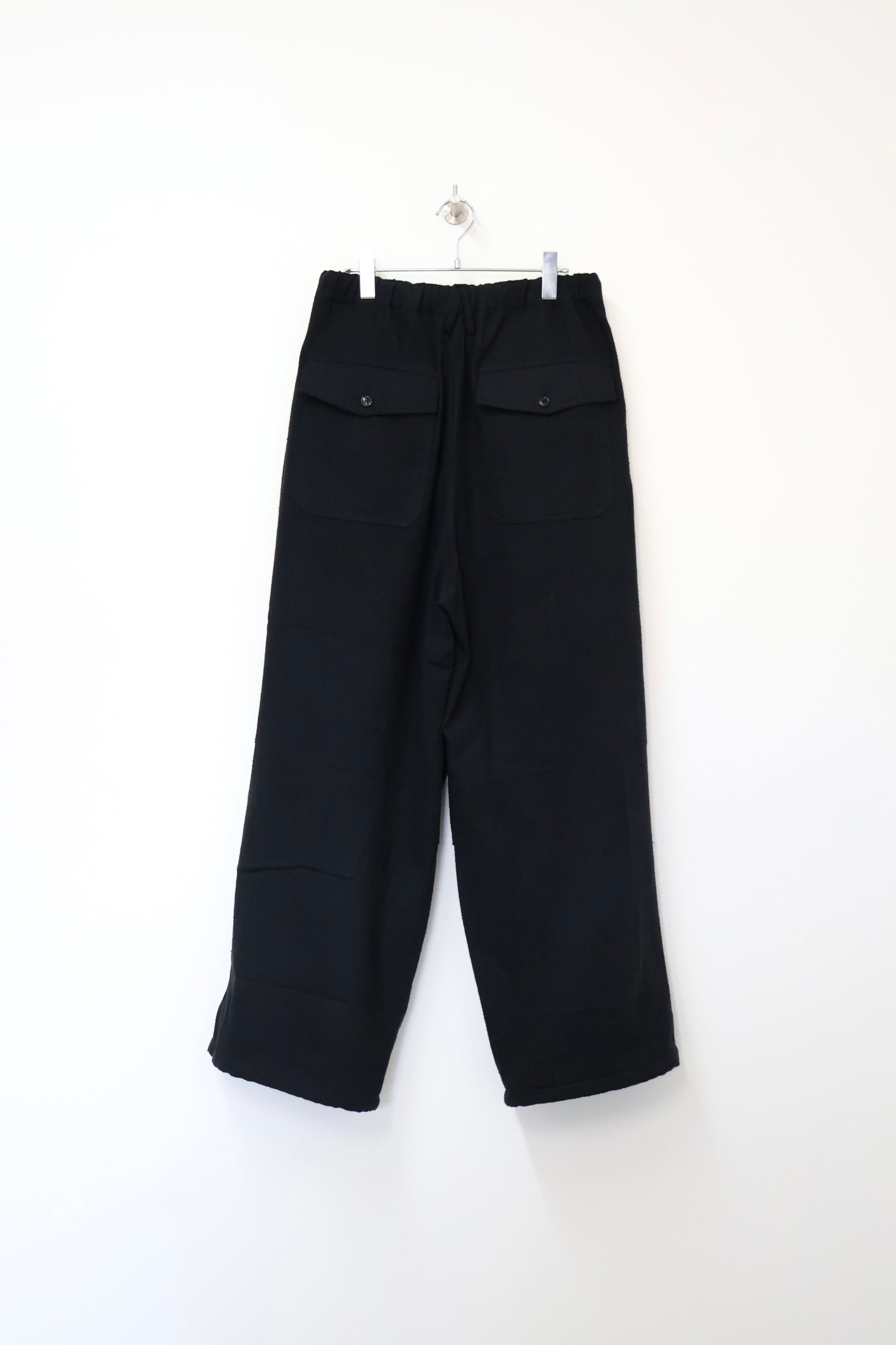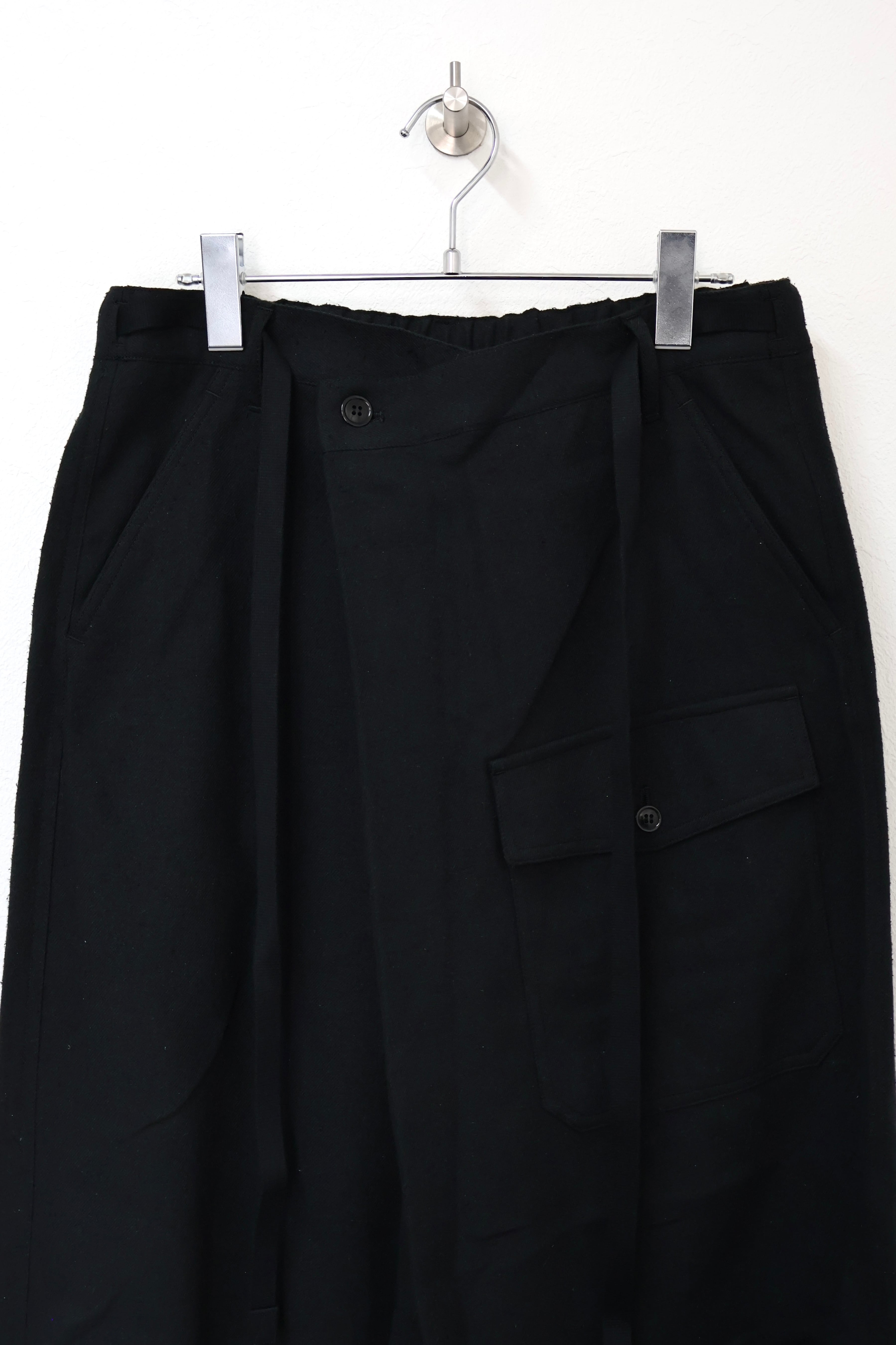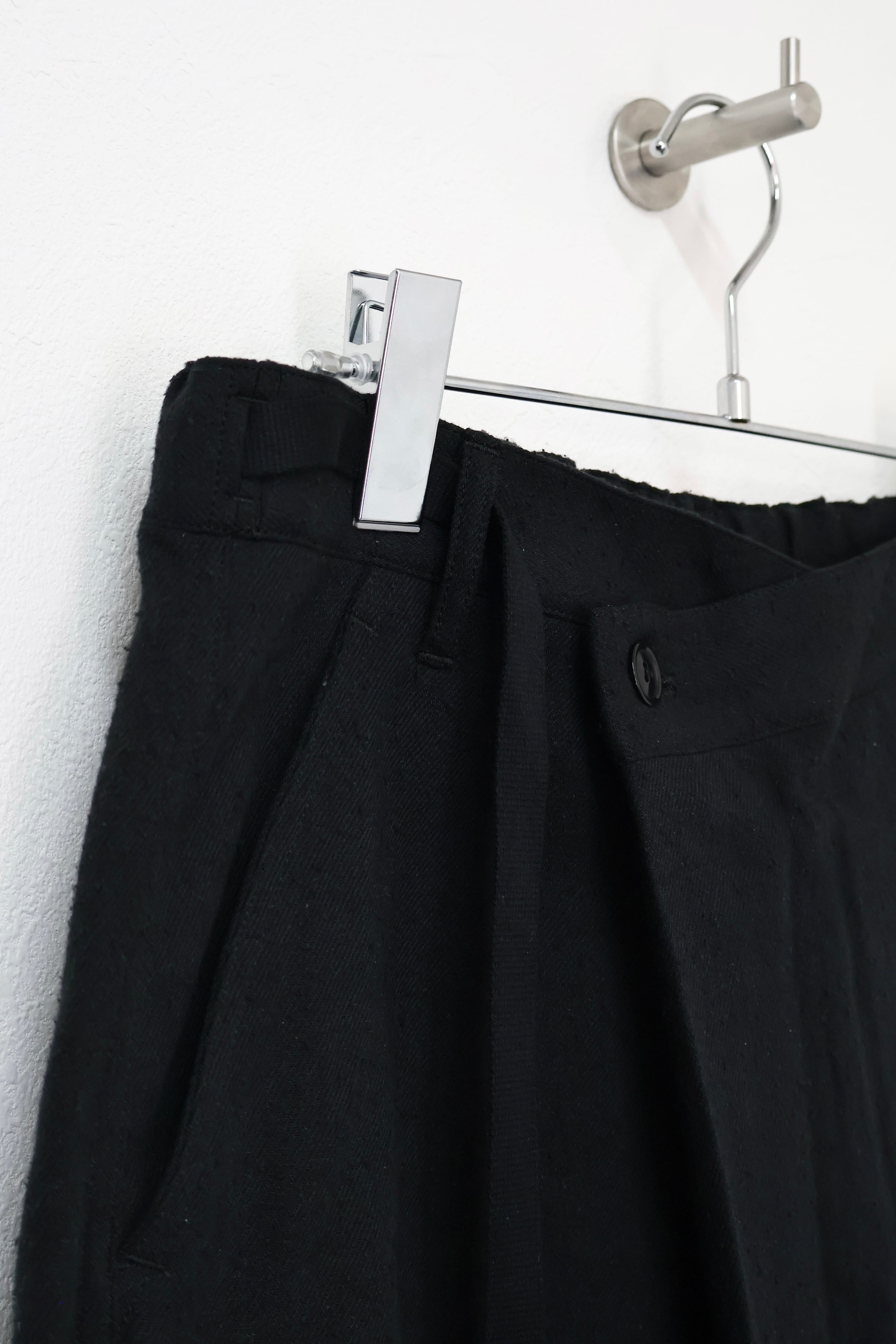 新型ラップディテールオーバーパンツ。前見頃の大きなタックが印象的なパターン構造にイギリス軍のSAS OVER PANTSのディティールを組み合わせたデザイン。シルエットはボリューム感のあるワイドストレート。ウエストは平紐、裾はスピンドルにてシルエットの調整可能。生地は播州産地にて織りあげたシルクコットンヴィンテージネル。滑らかな肌触りと落ち感、素材特有のネップ感が魅力の素材。保温性、吸湿性、放湿性が高い点も魅力。