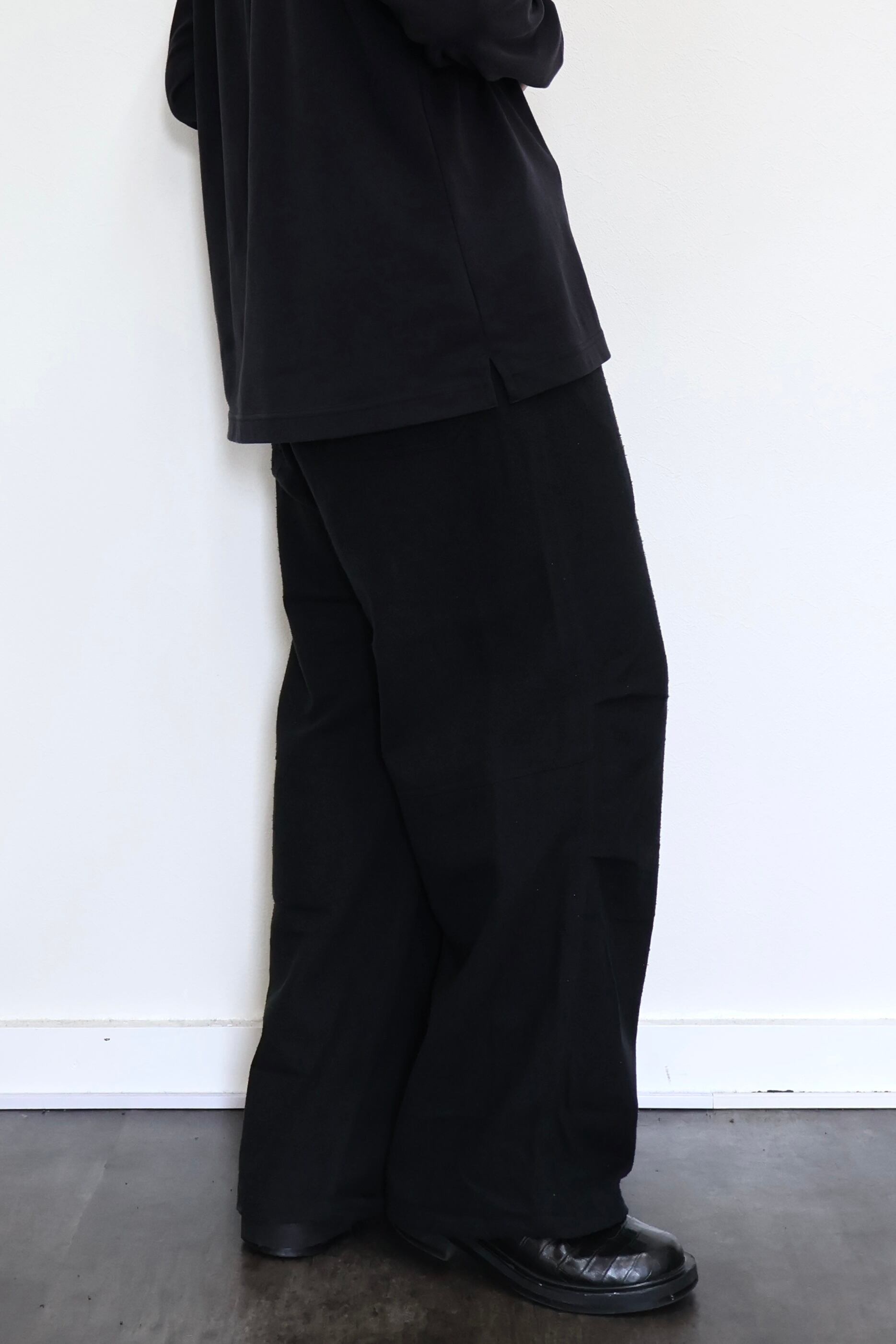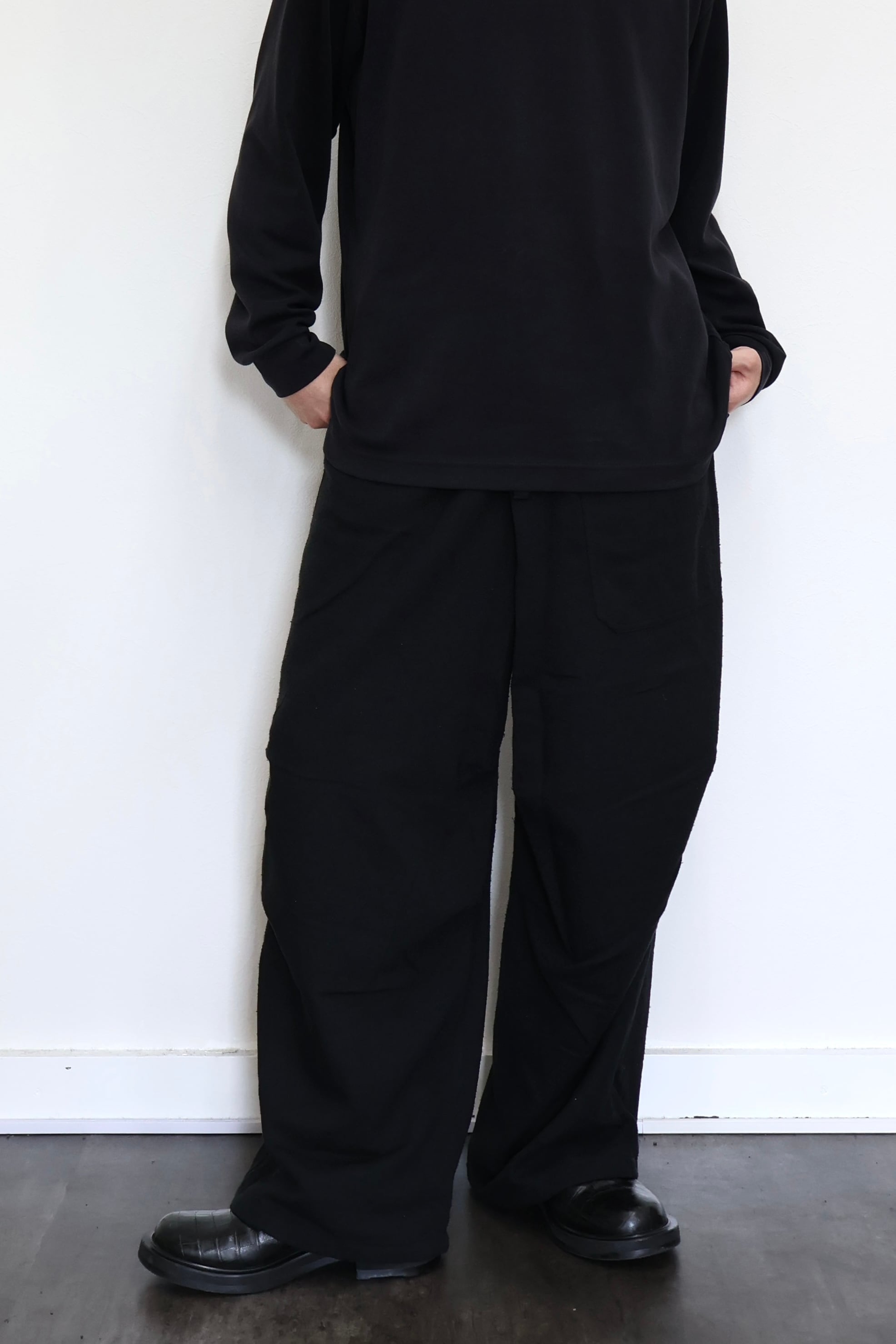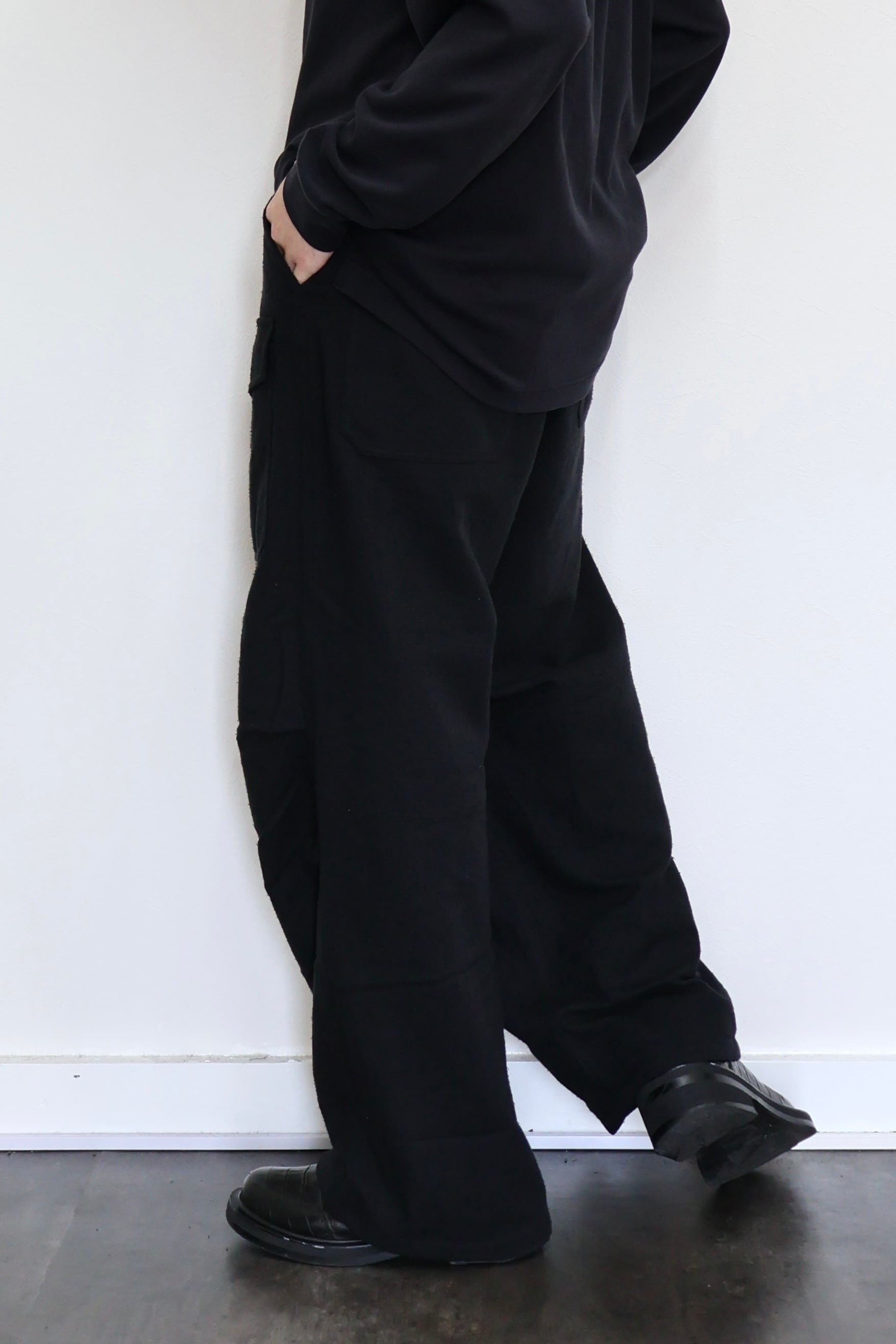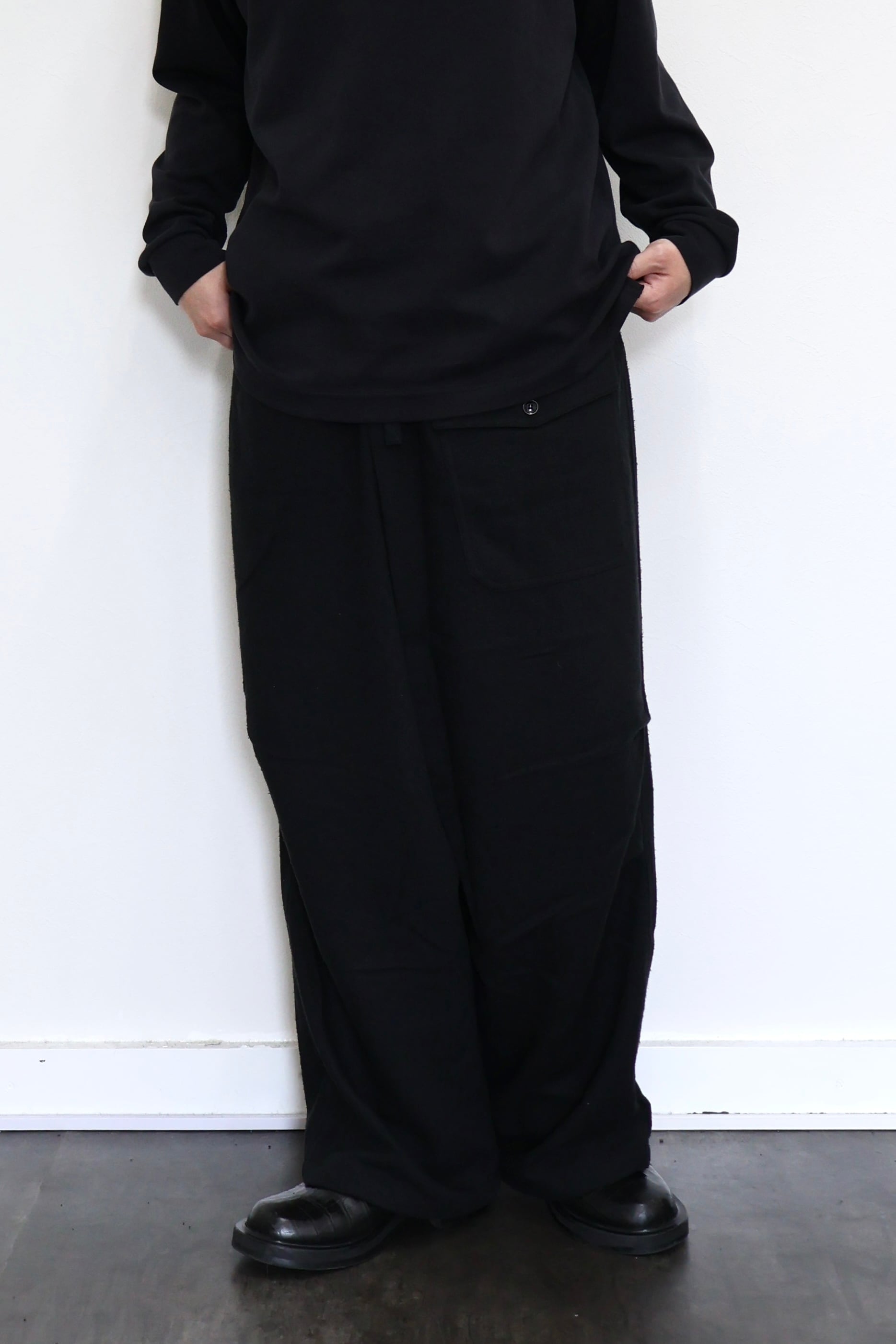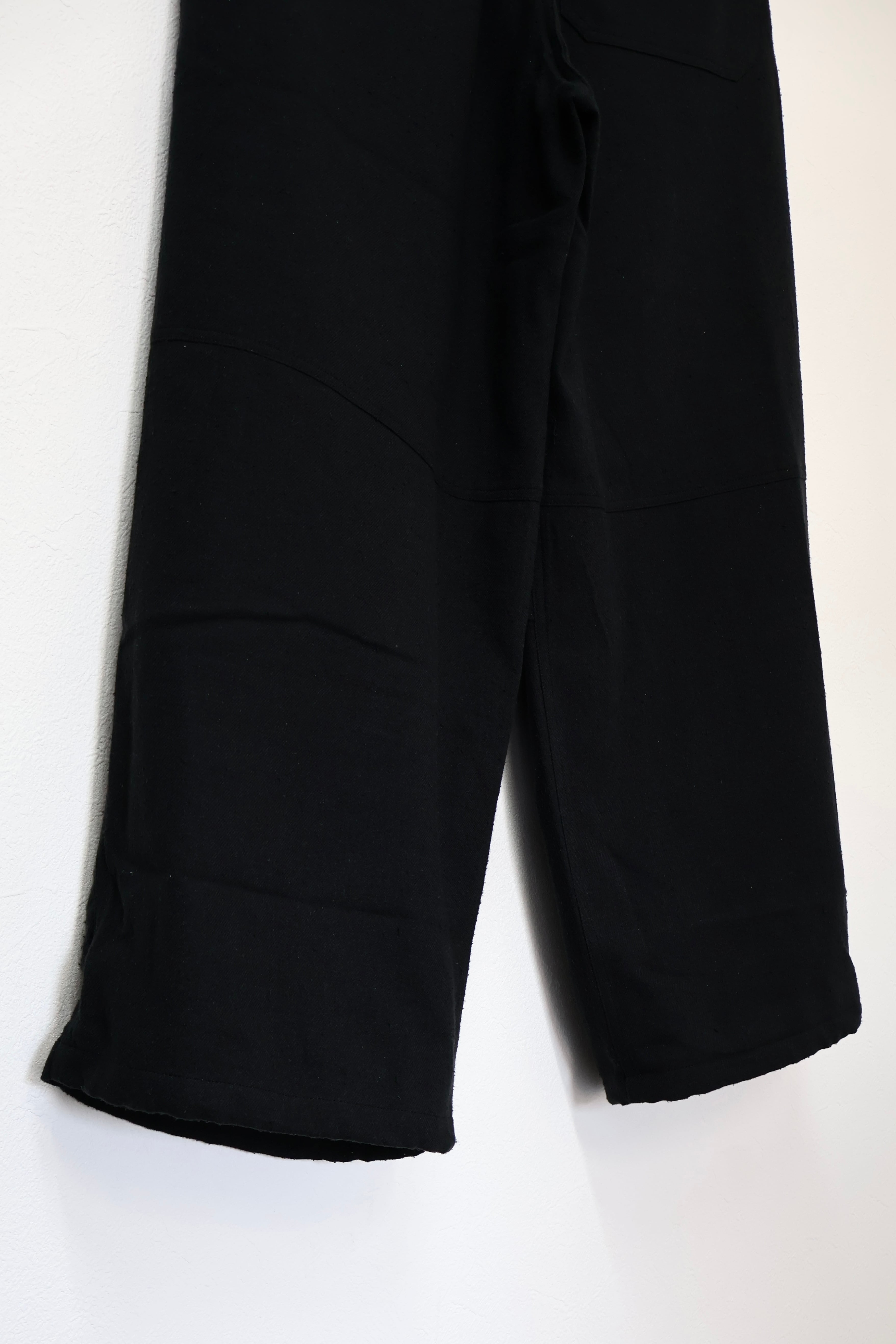 新型ラップディテールオーバーパンツ。前見頃の大きなタックが印象的なパターン構造にイギリス軍のSAS OVER PANTSのディティールを組み合わせたデザイン。シルエットはボリューム感のあるワイドストレート。ウエストは平紐、裾はスピンドルにてシルエットの調整可能。生地は播州産地にて織りあげたシルクコットンヴィンテージネル。滑らかな肌触りと落ち感、素材特有のネップ感が魅力の素材。保温性、吸湿性、放湿性が高い点も魅力。