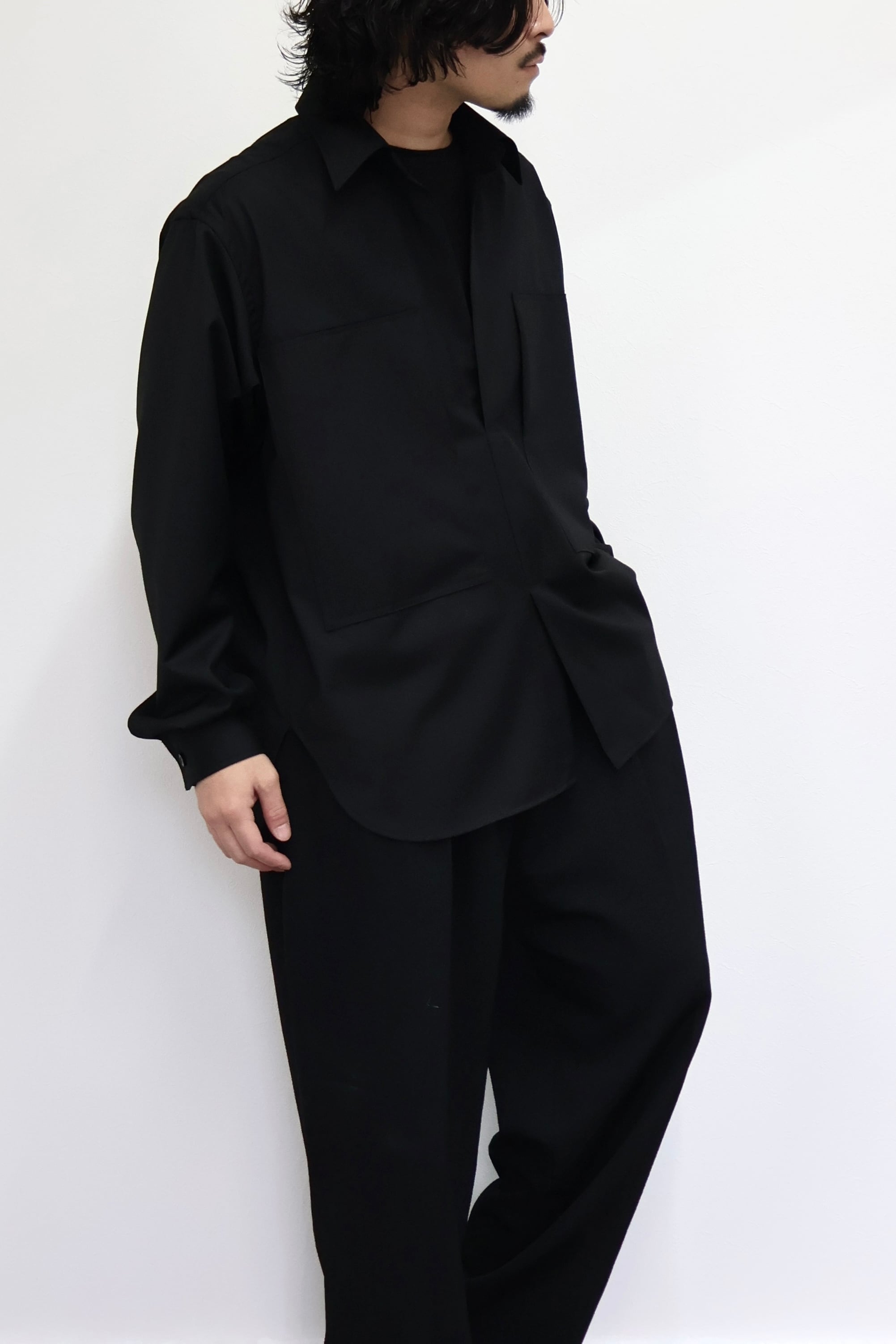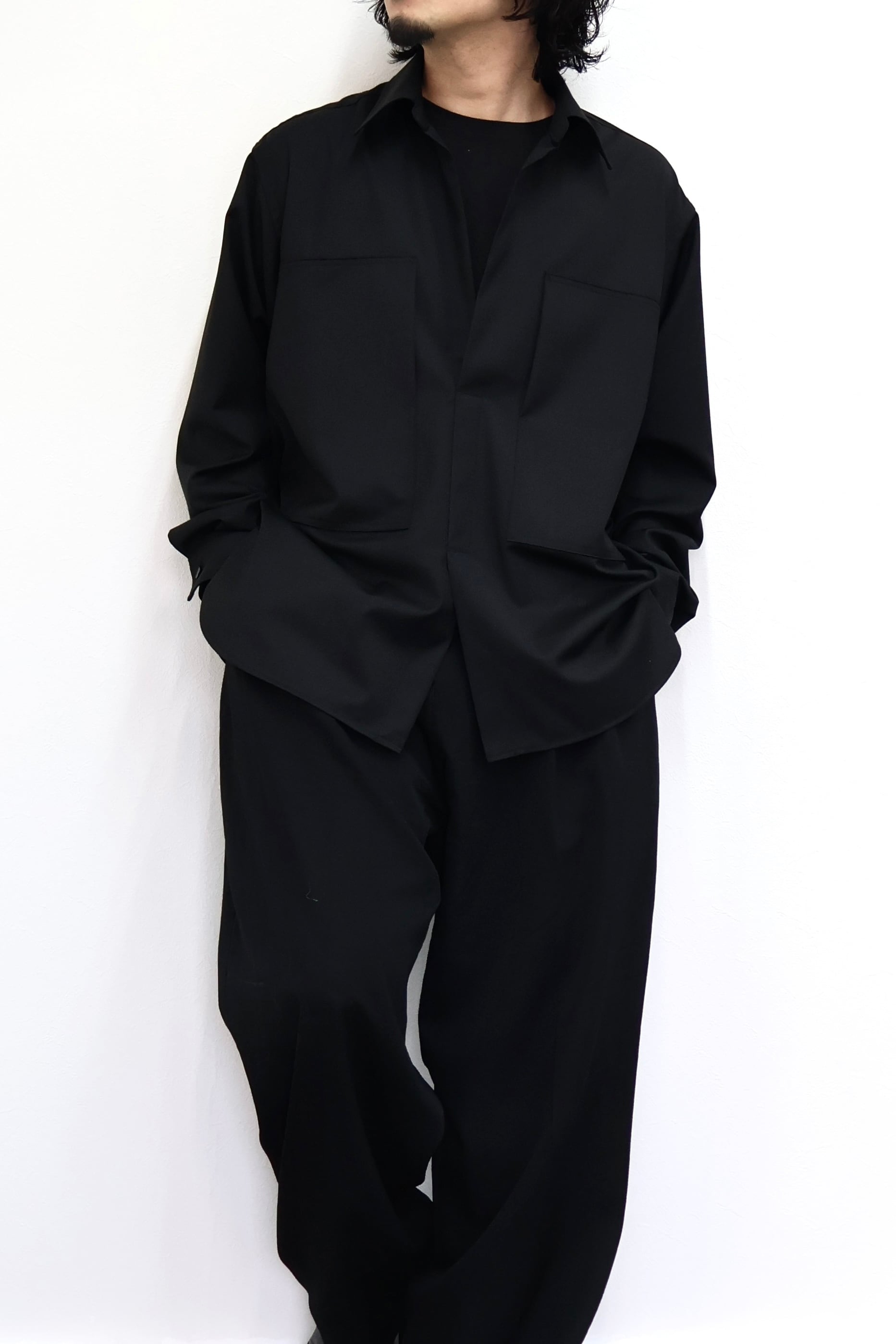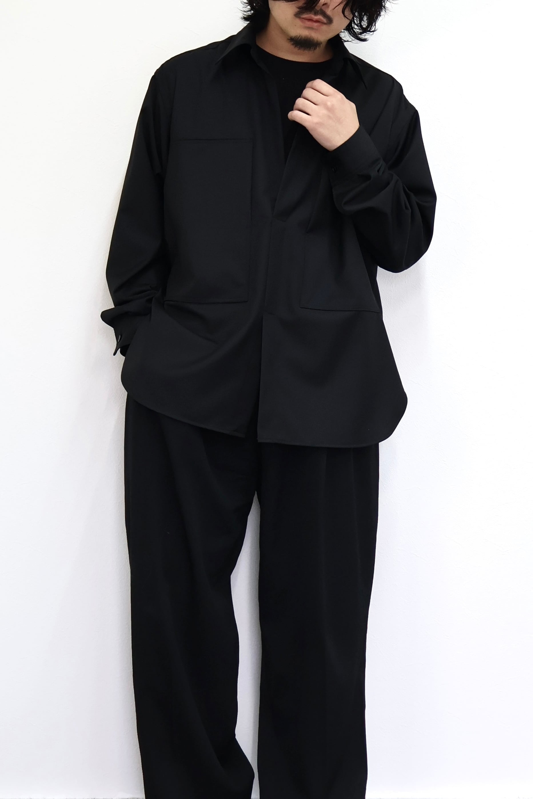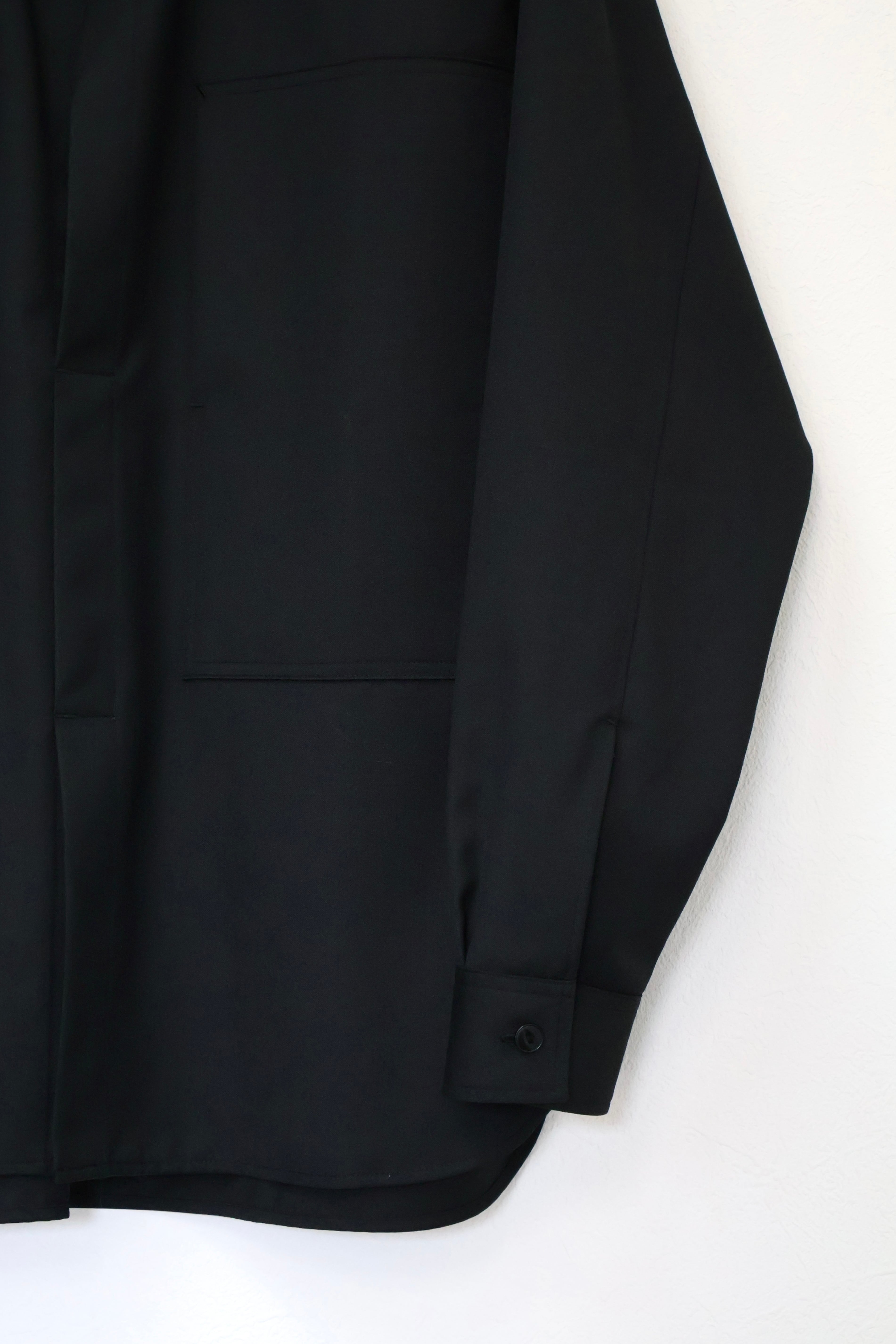 プルオーバーシャツ。ゆったりとしたリラックスフィット。前開きのボタンを無くして一部を縫い留めている変形前開き仕様。カジュアルなデザインながらヴァルースシャツのようなアイテムをイメージ。両胸に大きめのスクエアポケットを配置。生地はウール混テクニカルツイルを使用。滑らかな質感と控えめな光沢、自然なオチ感が特徴の綾織りもの。通年使用可能なイージーケア素材。