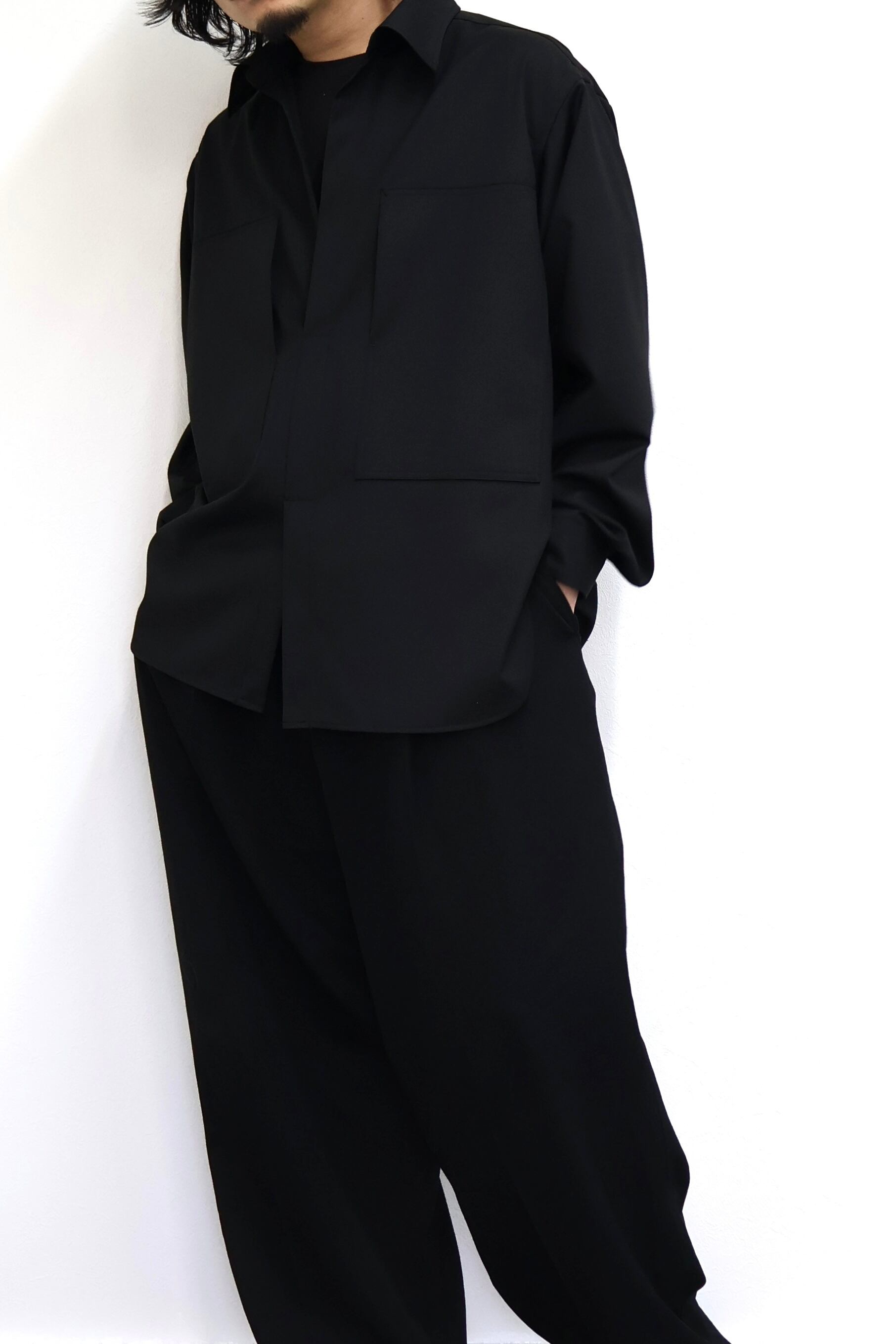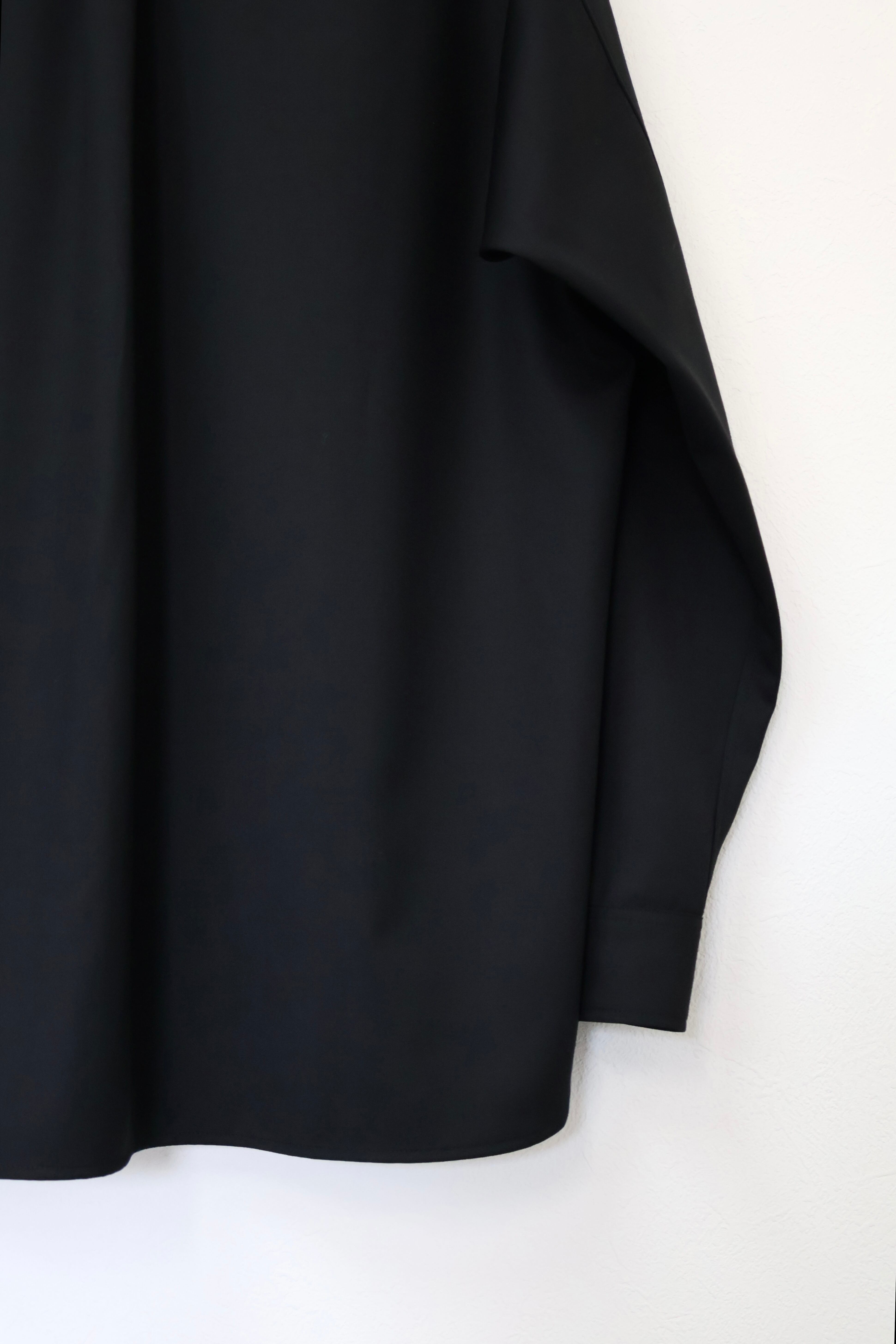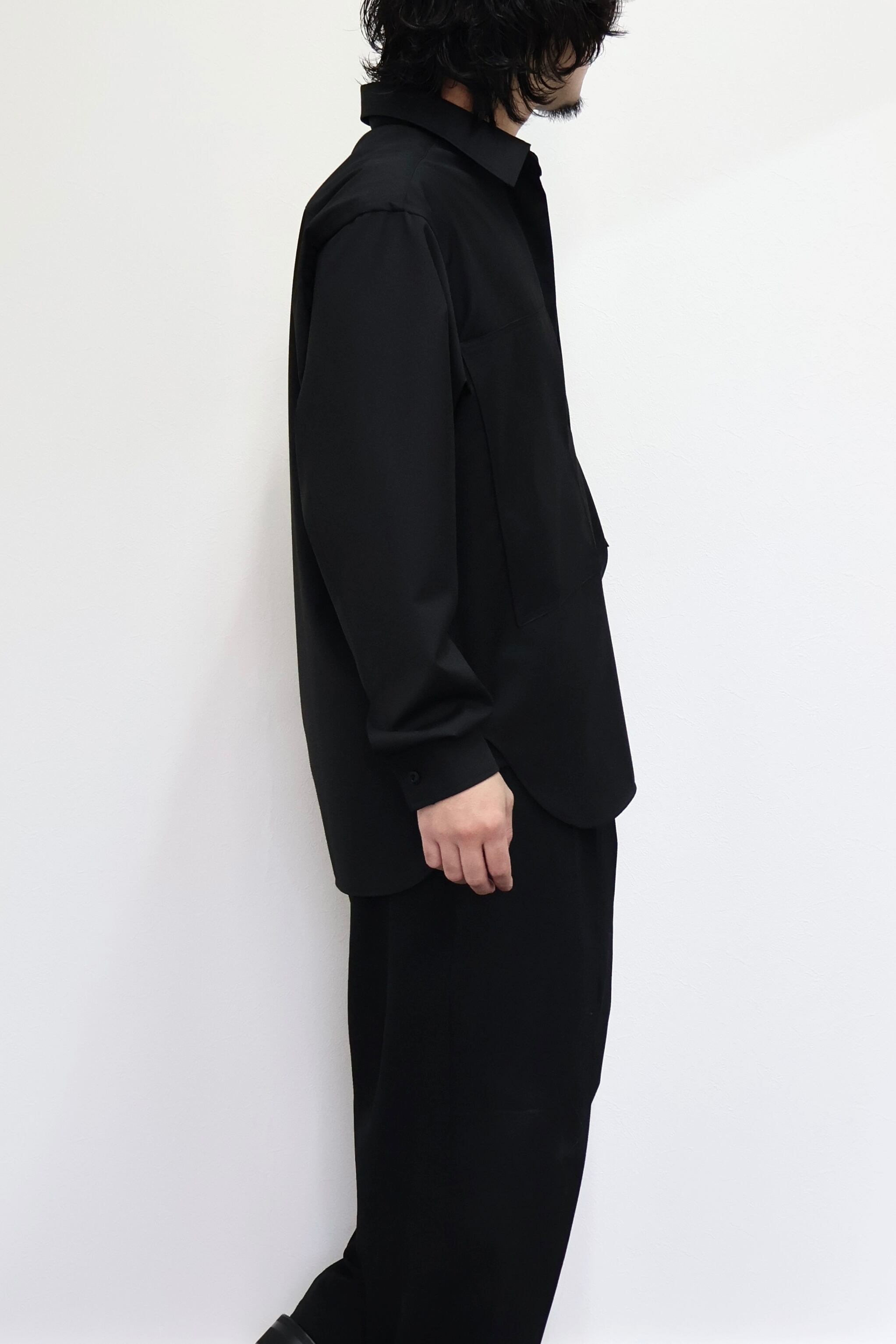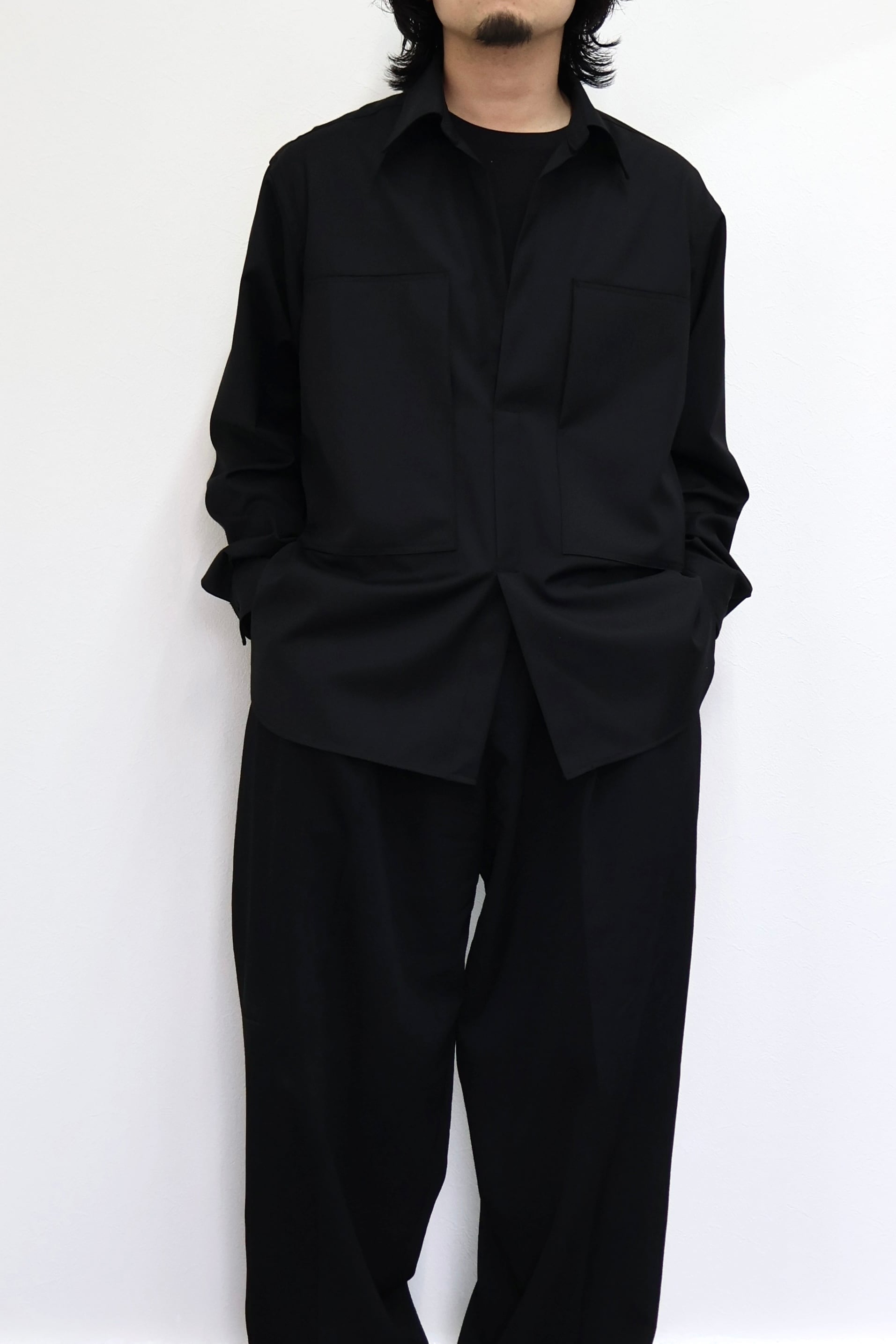 プルオーバーシャツ。ゆったりとしたリラックスフィット。前開きのボタンを無くして一部を縫い留めている変形前開き仕様。カジュアルなデザインながらヴァルースシャツのようなアイテムをイメージ。両胸に大きめのスクエアポケットを配置。生地はウール混テクニカルツイルを使用。滑らかな質感と控えめな光沢、自然なオチ感が特徴の綾織りもの。通年使用可能なイージーケア素材。