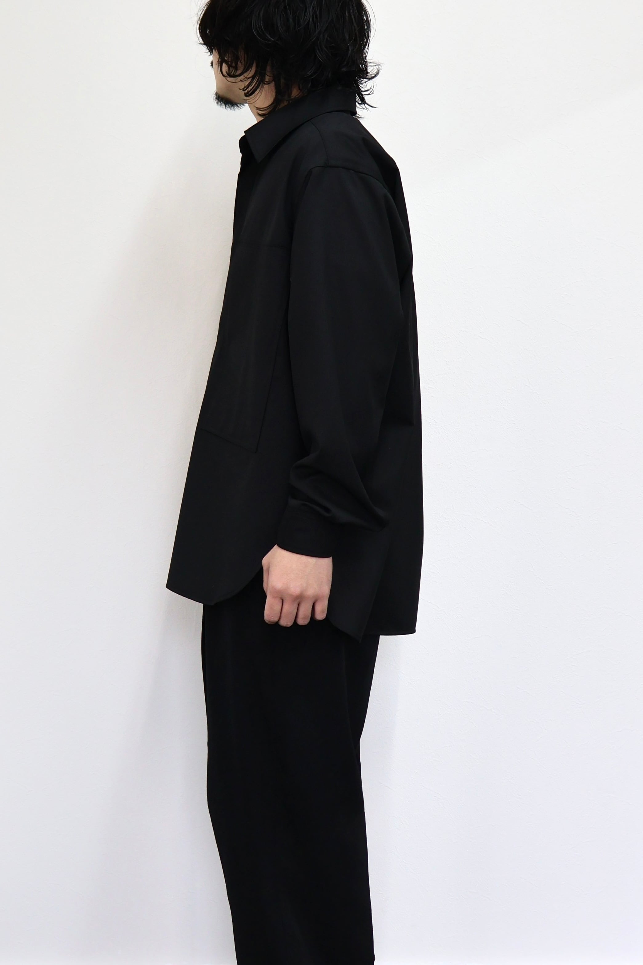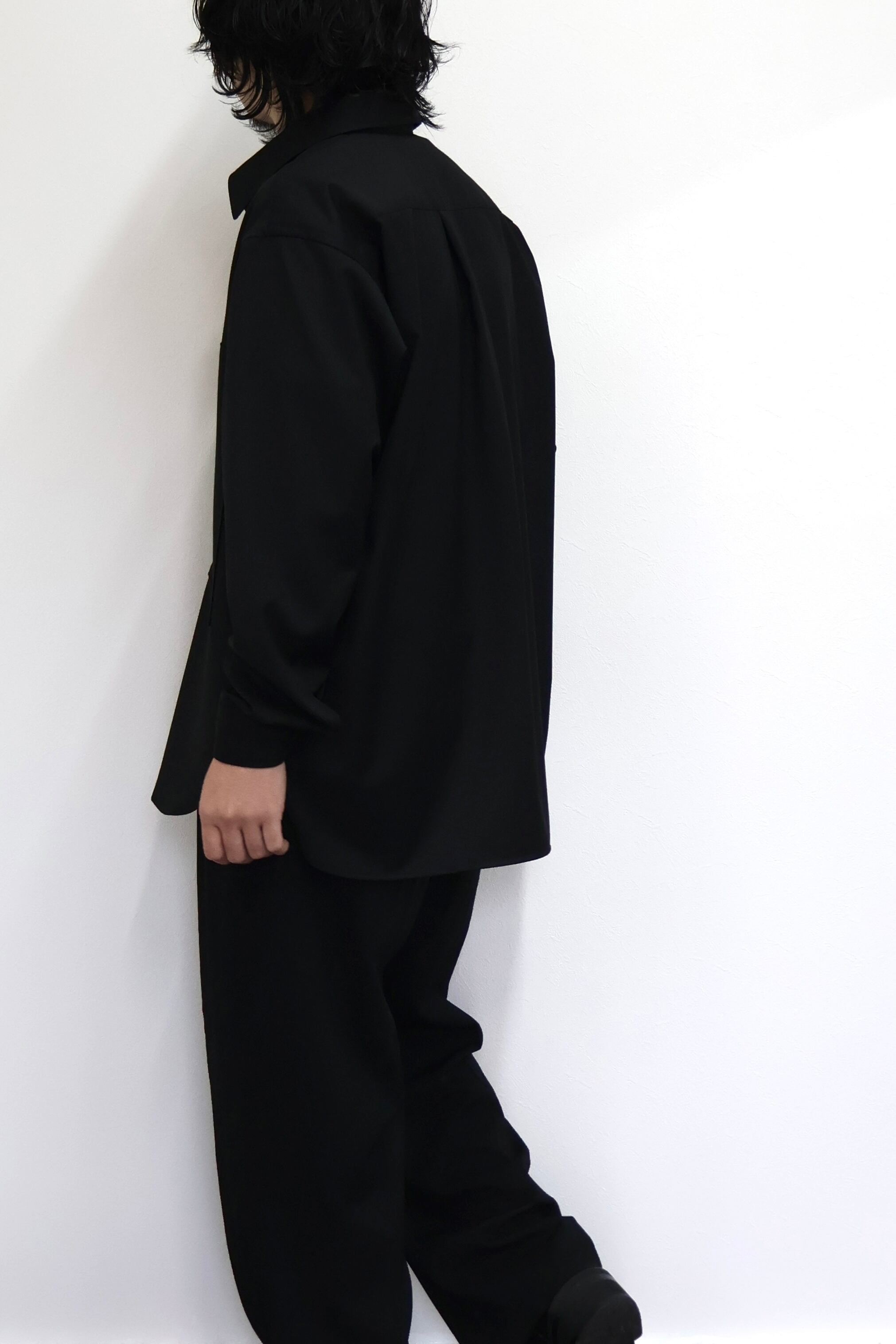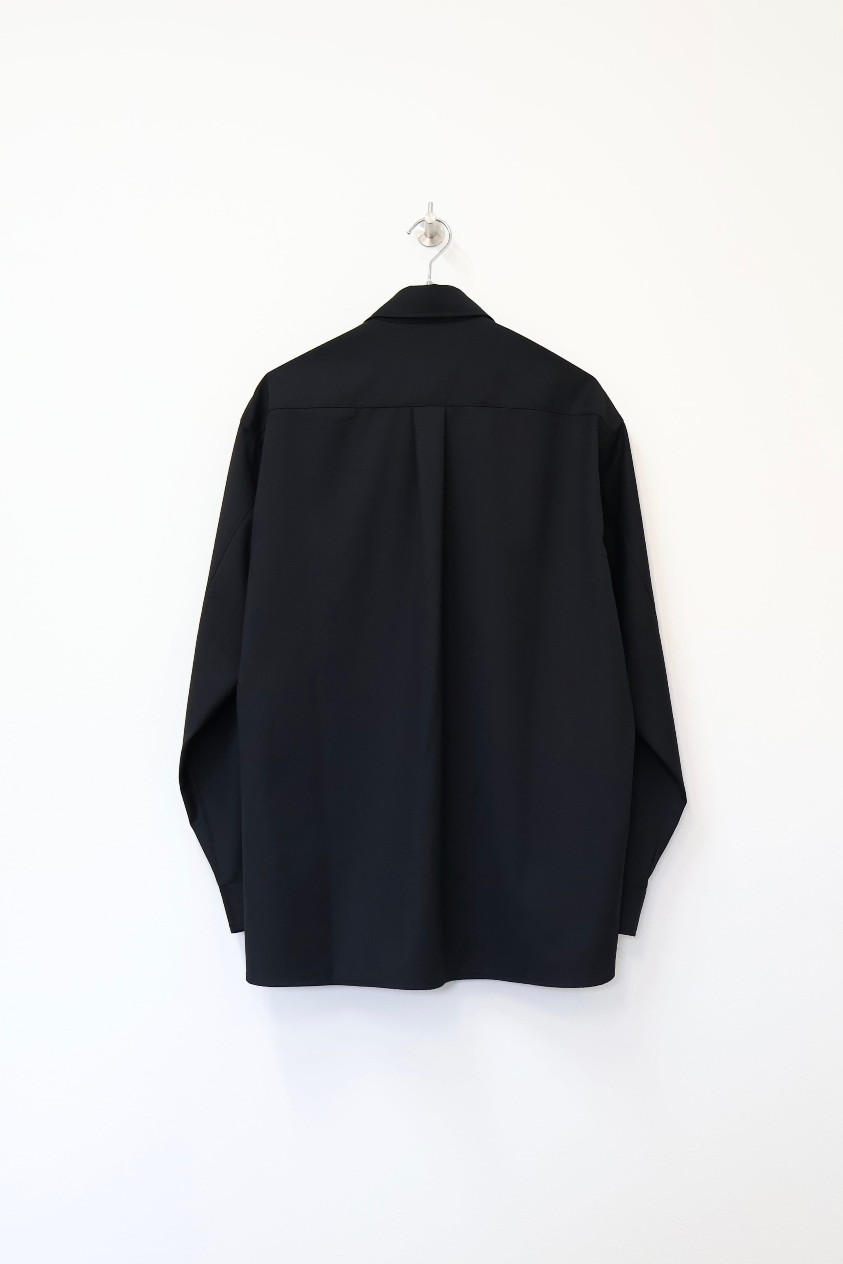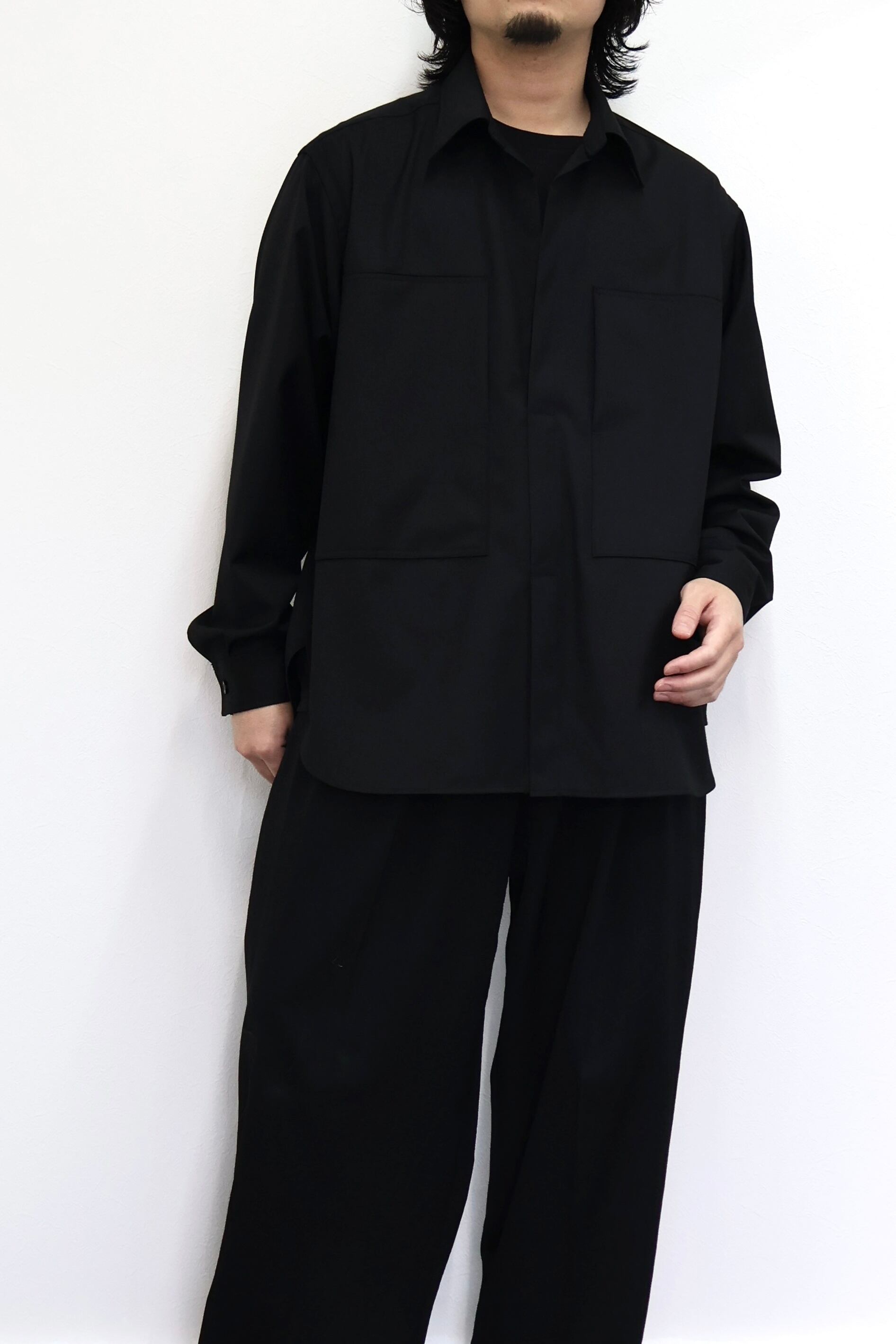 プルオーバーシャツ。ゆったりとしたリラックスフィット。前開きのボタンを無くして一部を縫い留めている変形前開き仕様。カジュアルなデザインながらヴァルースシャツのようなアイテムをイメージ。両胸に大きめのスクエアポケットを配置。生地はウール混テクニカルツイルを使用。滑らかな質感と控えめな光沢、自然なオチ感が特徴の綾織りもの。通年使用可能なイージーケア素材。