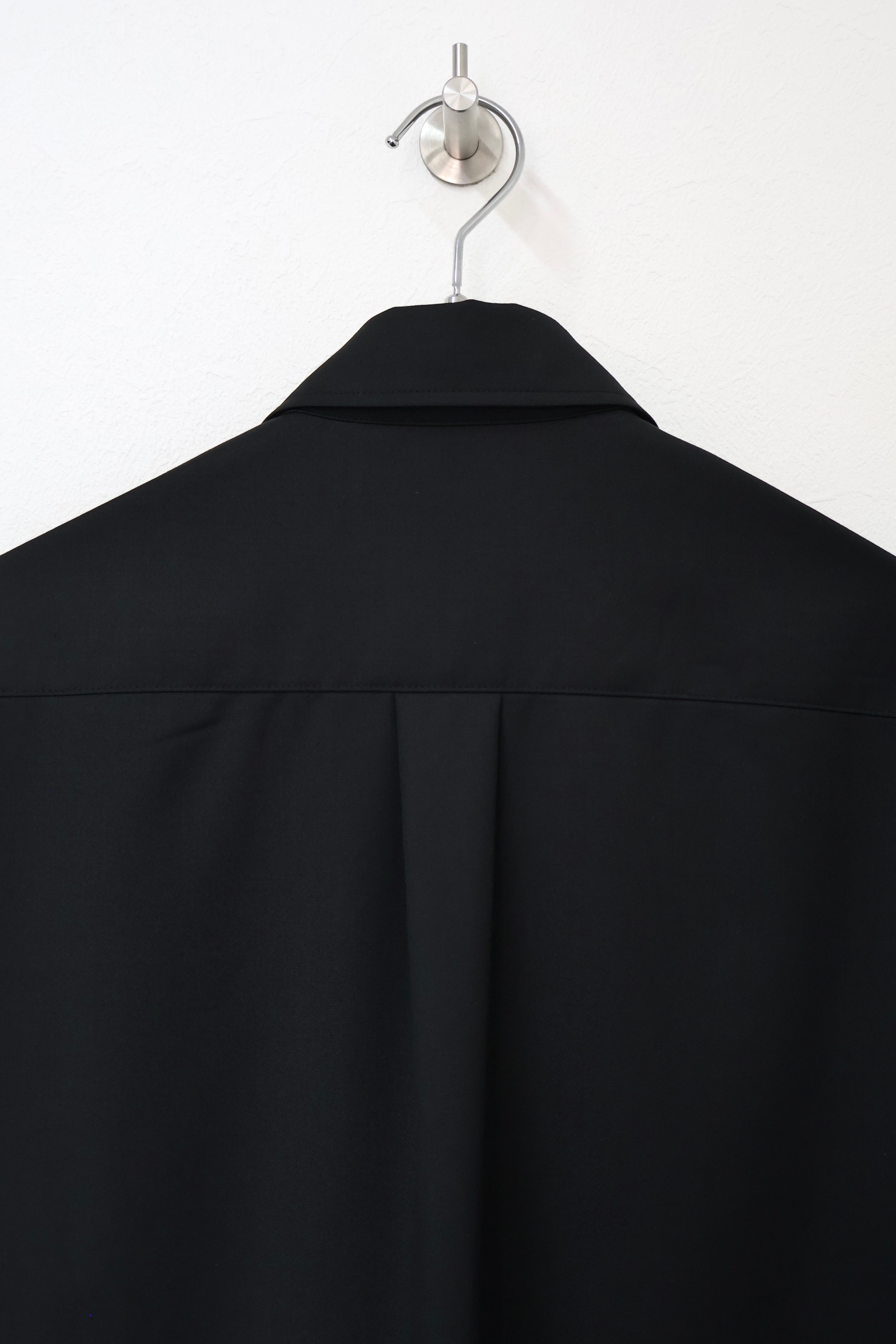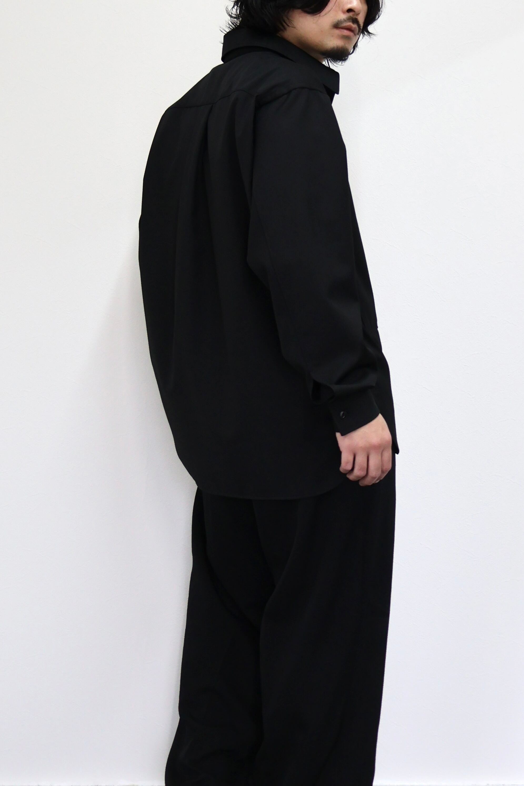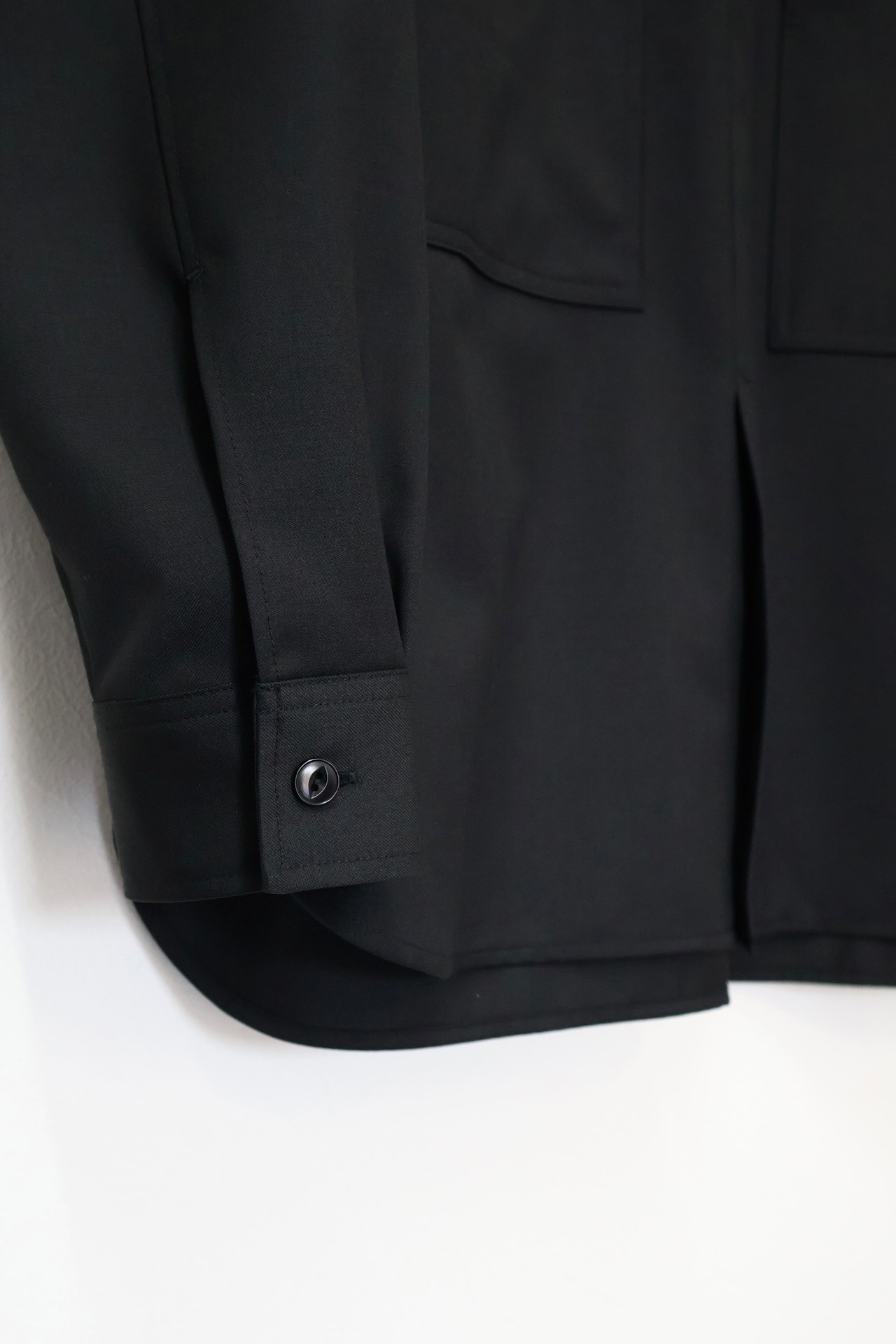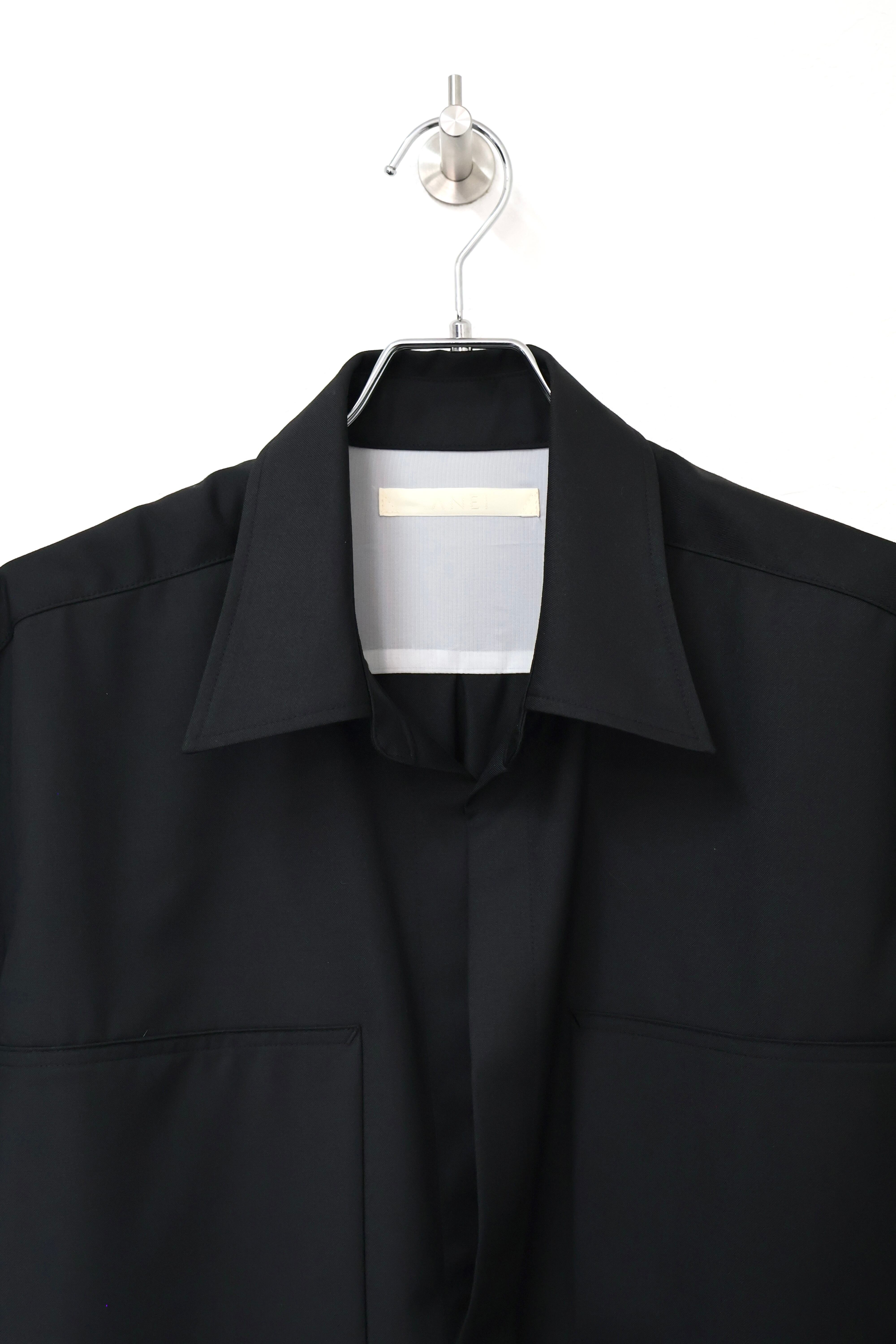 プルオーバーシャツ。ゆったりとしたリラックスフィット。前開きのボタンを無くして一部を縫い留めている変形前開き仕様。カジュアルなデザインながらヴァルースシャツのようなアイテムをイメージ。両胸に大きめのスクエアポケットを配置。生地はウール混テクニカルツイルを使用。滑らかな質感と控えめな光沢、自然なオチ感が特徴の綾織りもの。通年使用可能なイージーケア素材。