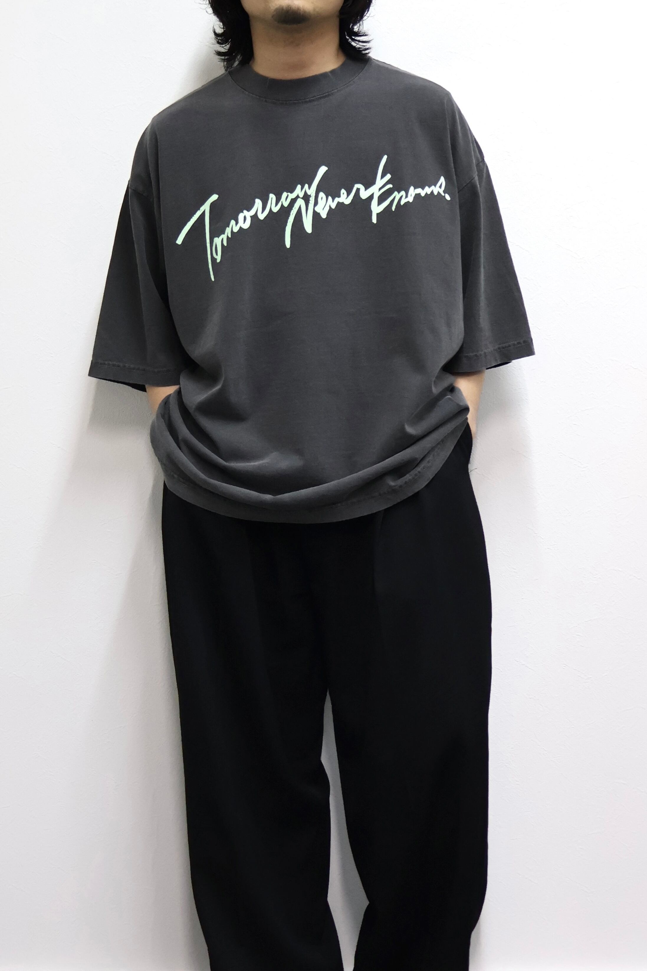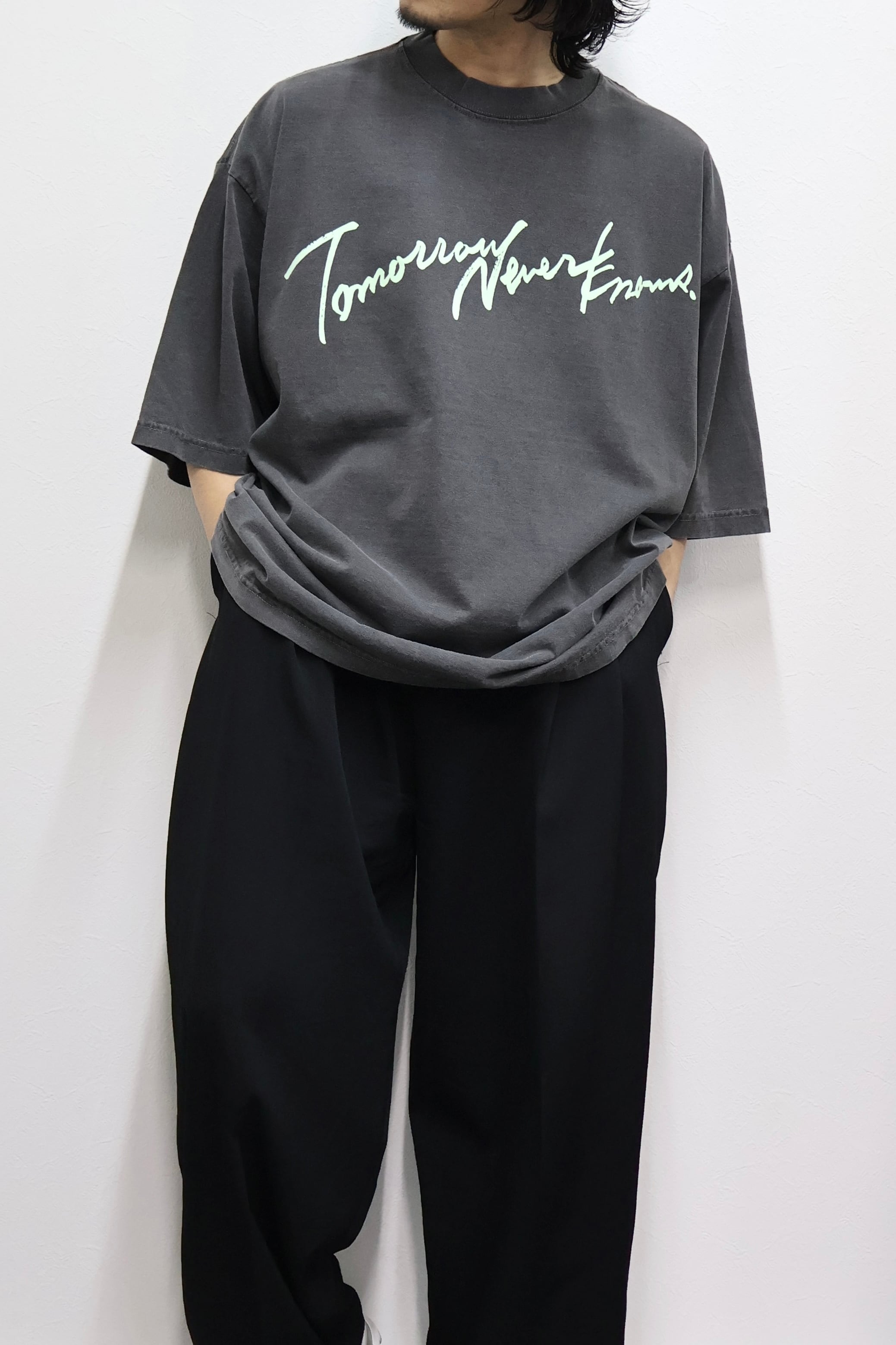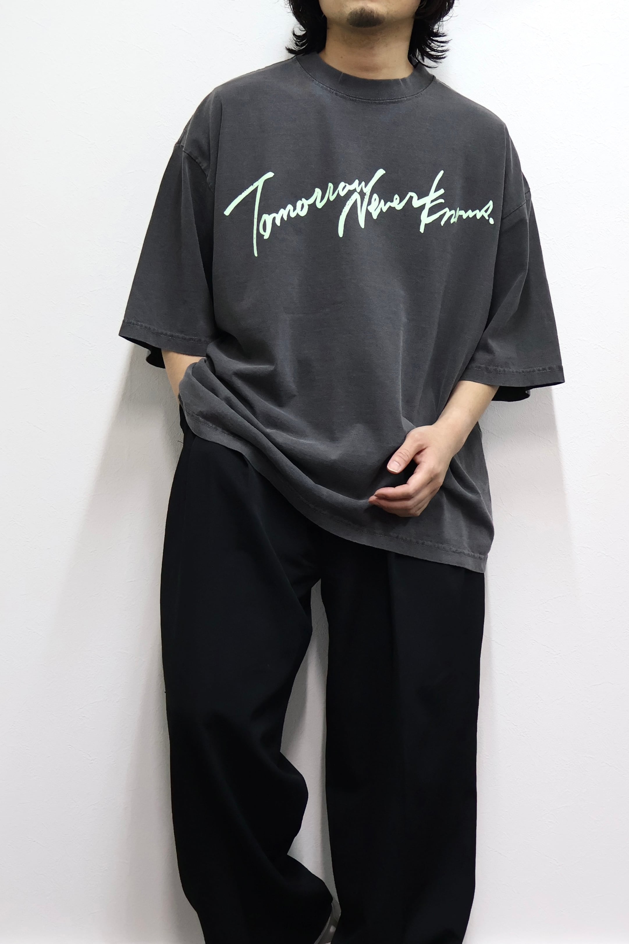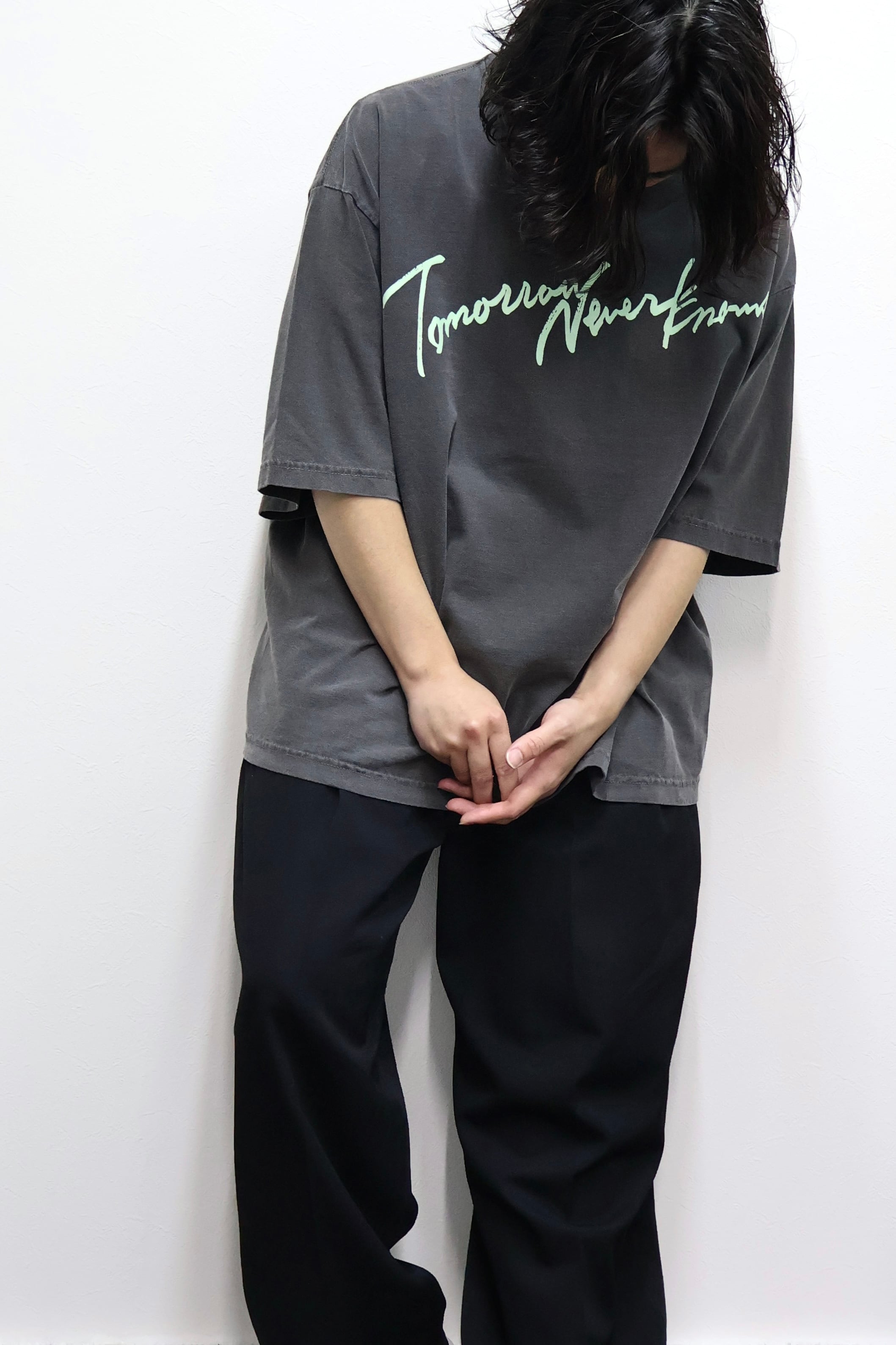 ピグメント(顔料)染料を使用した製品染めにより洗い重ねる度に退色し雰囲気の増す生地感が特徴。アンディウォーホールによって創刊されたインタビューマガジンのロゴを着想に、BEATLESの楽曲 "TOMORROW NEVER KNOWS" を掛け合わせたオリジナルデザイン。