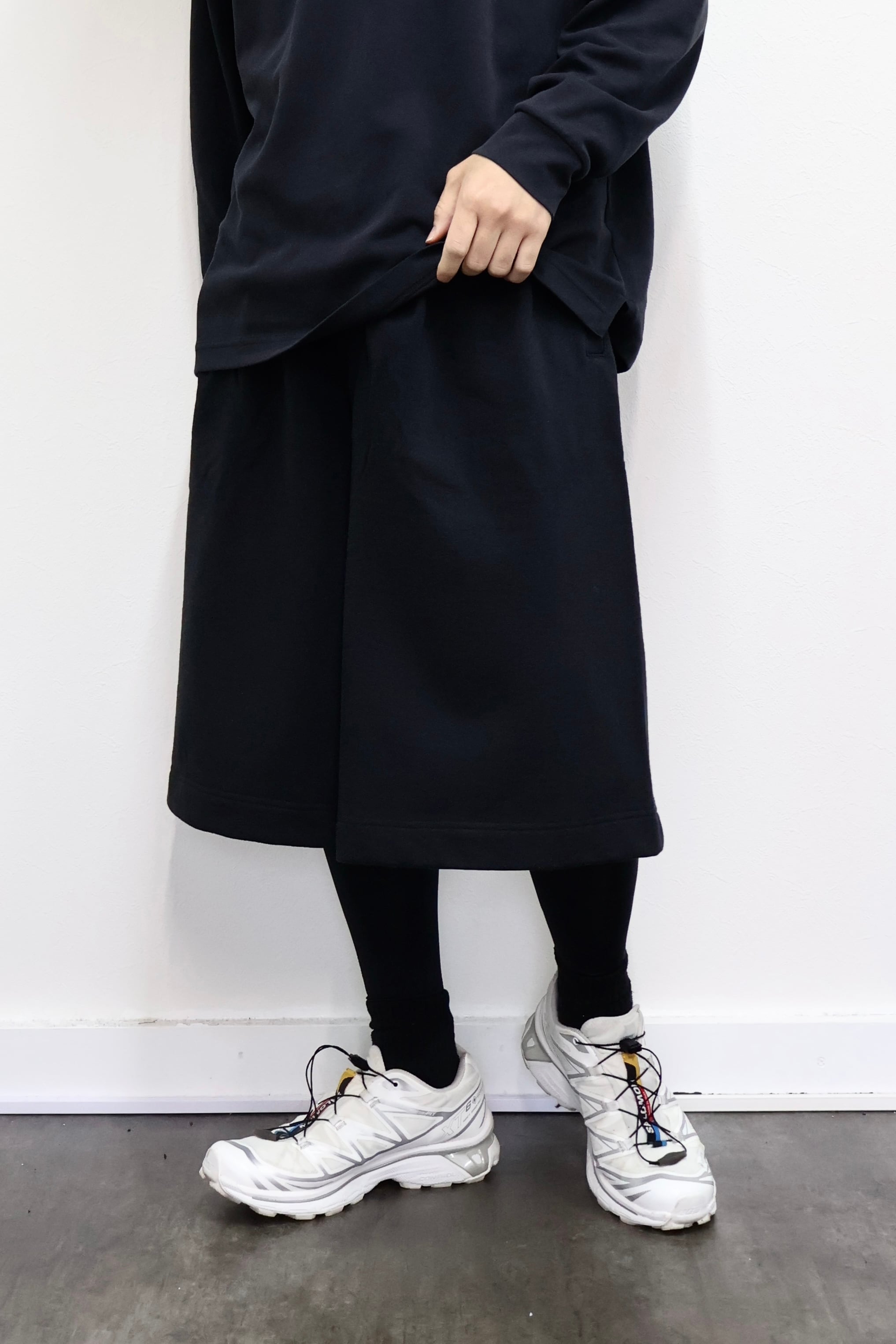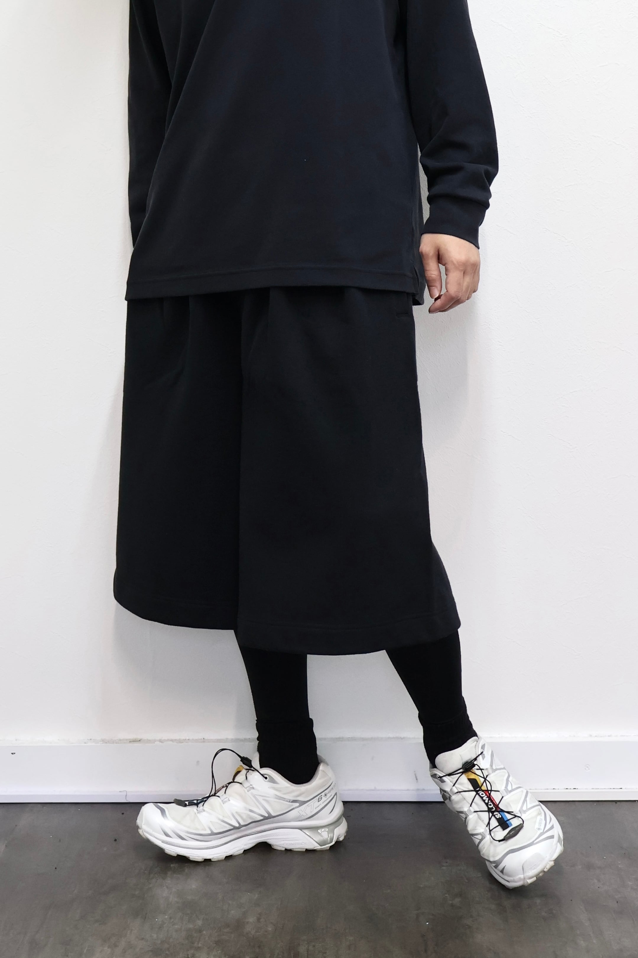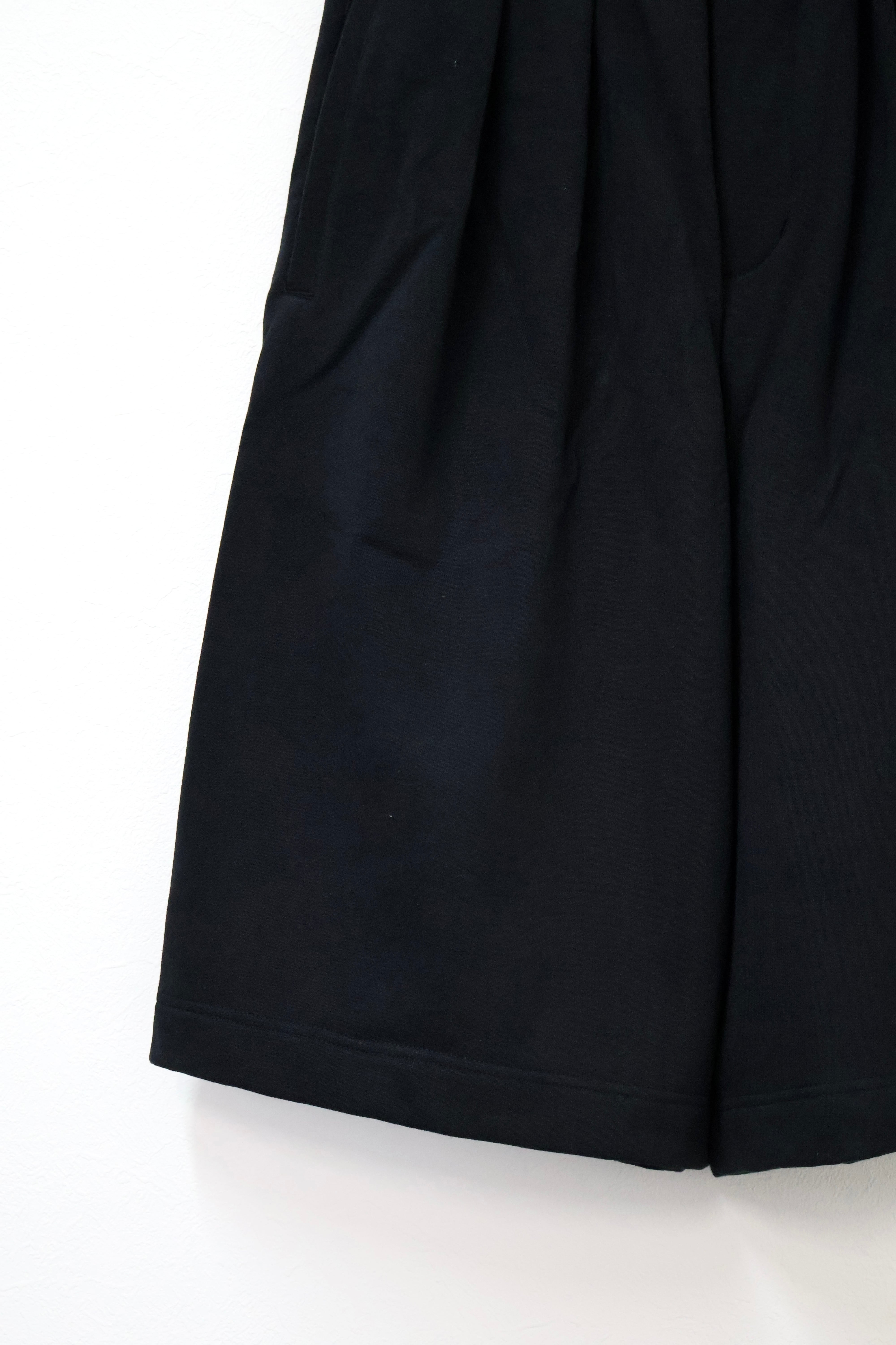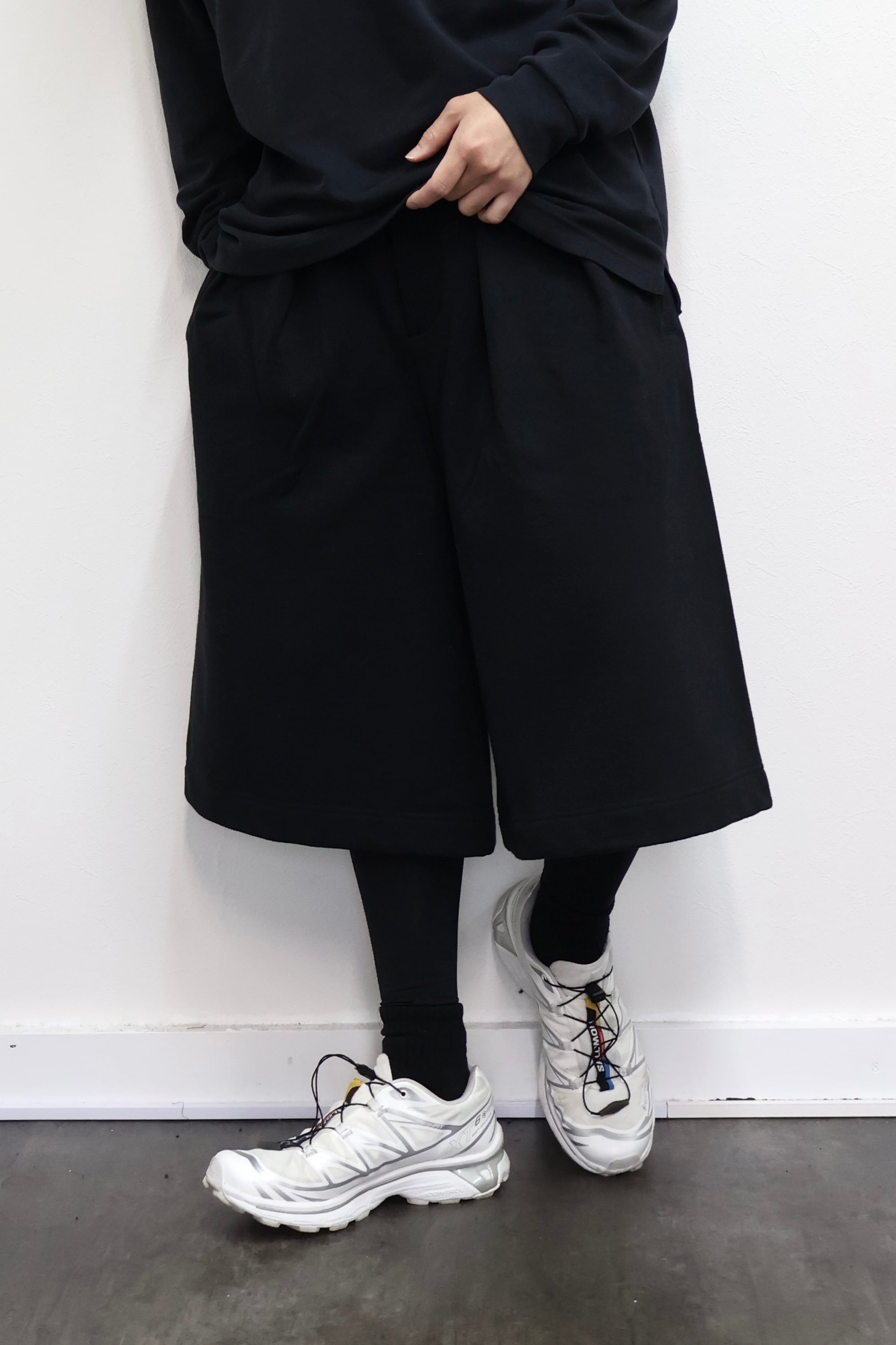 2本のタックを入れたハカマシルエットのスウェットショーツ。ハリのある薄手のオリジナル裏毛素材を使用。脇線を排除するパターンを採用することで自然な膨らみを表現。