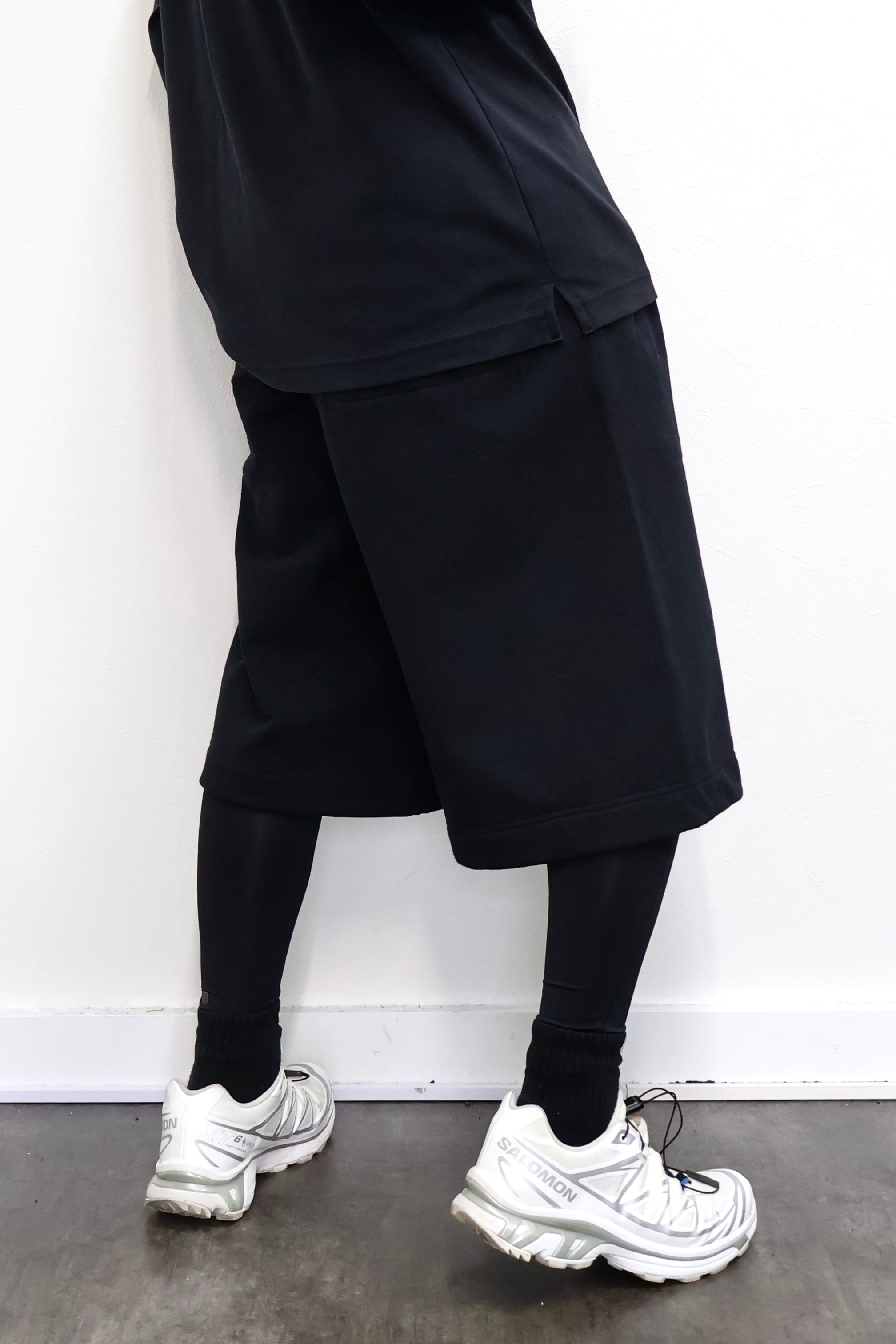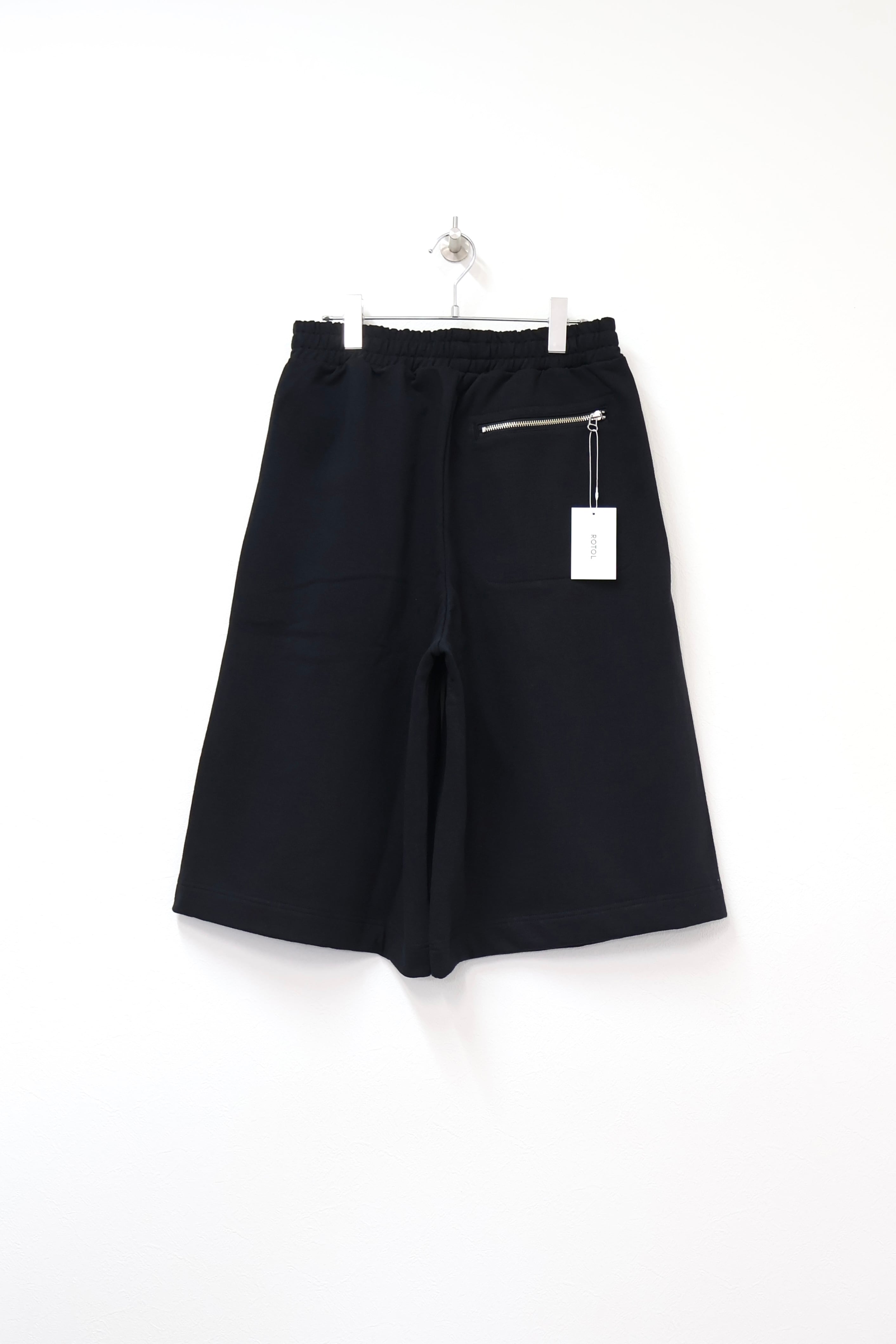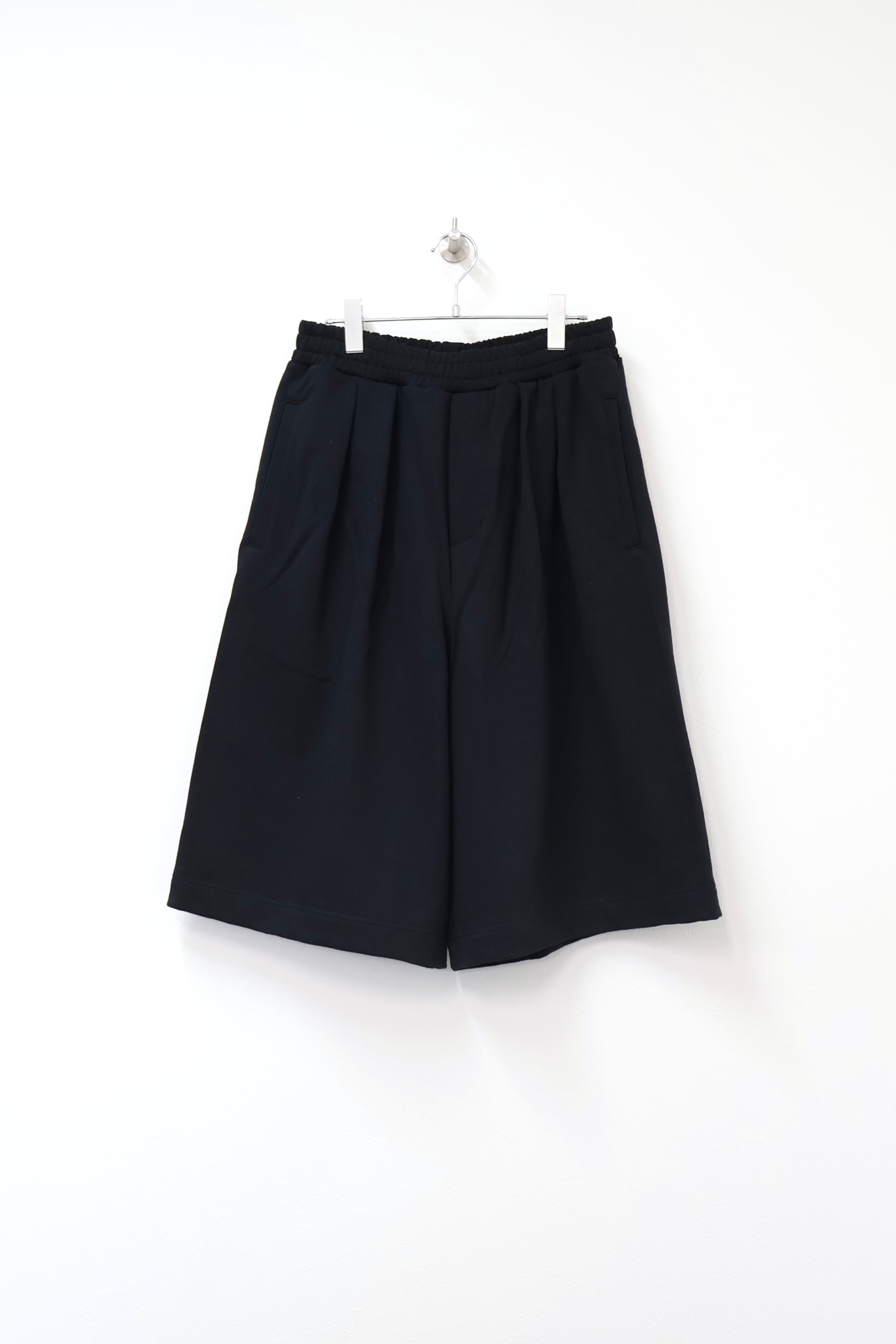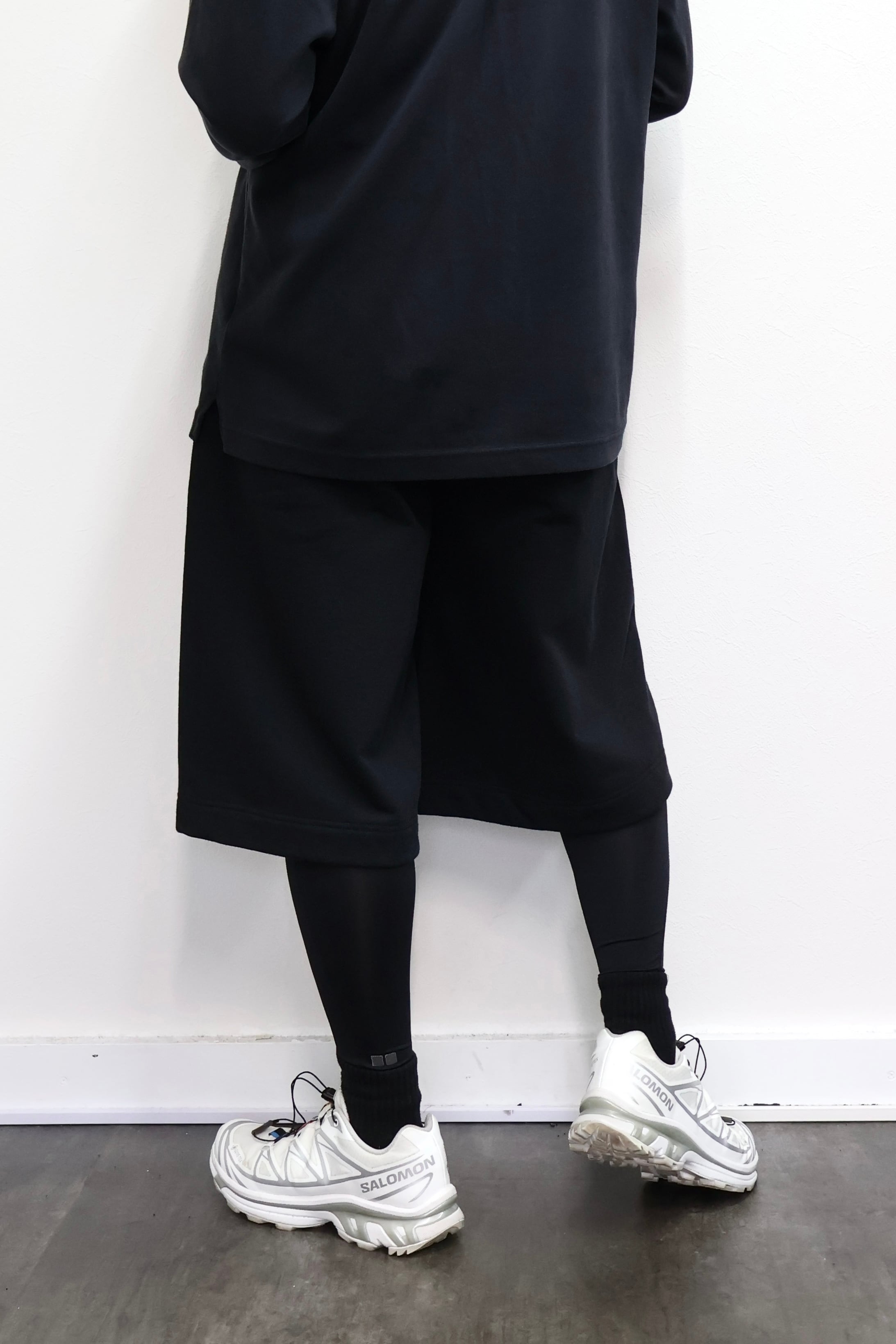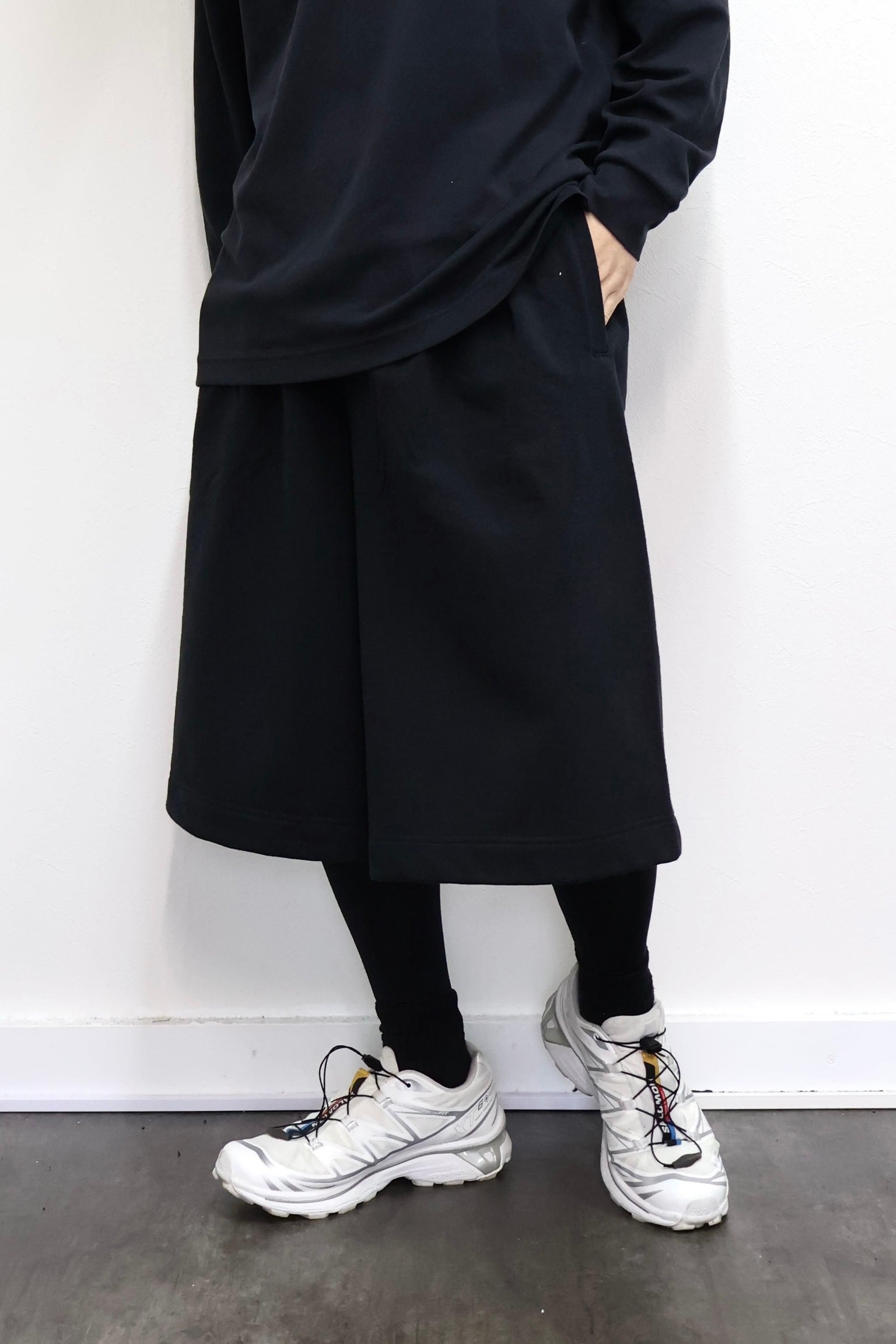 2本のタックを入れたハカマシルエットのスウェットショーツ。ハリのある薄手のオリジナル裏毛素材を使用。脇線を排除するパターンを採用することで自然な膨らみを表現。