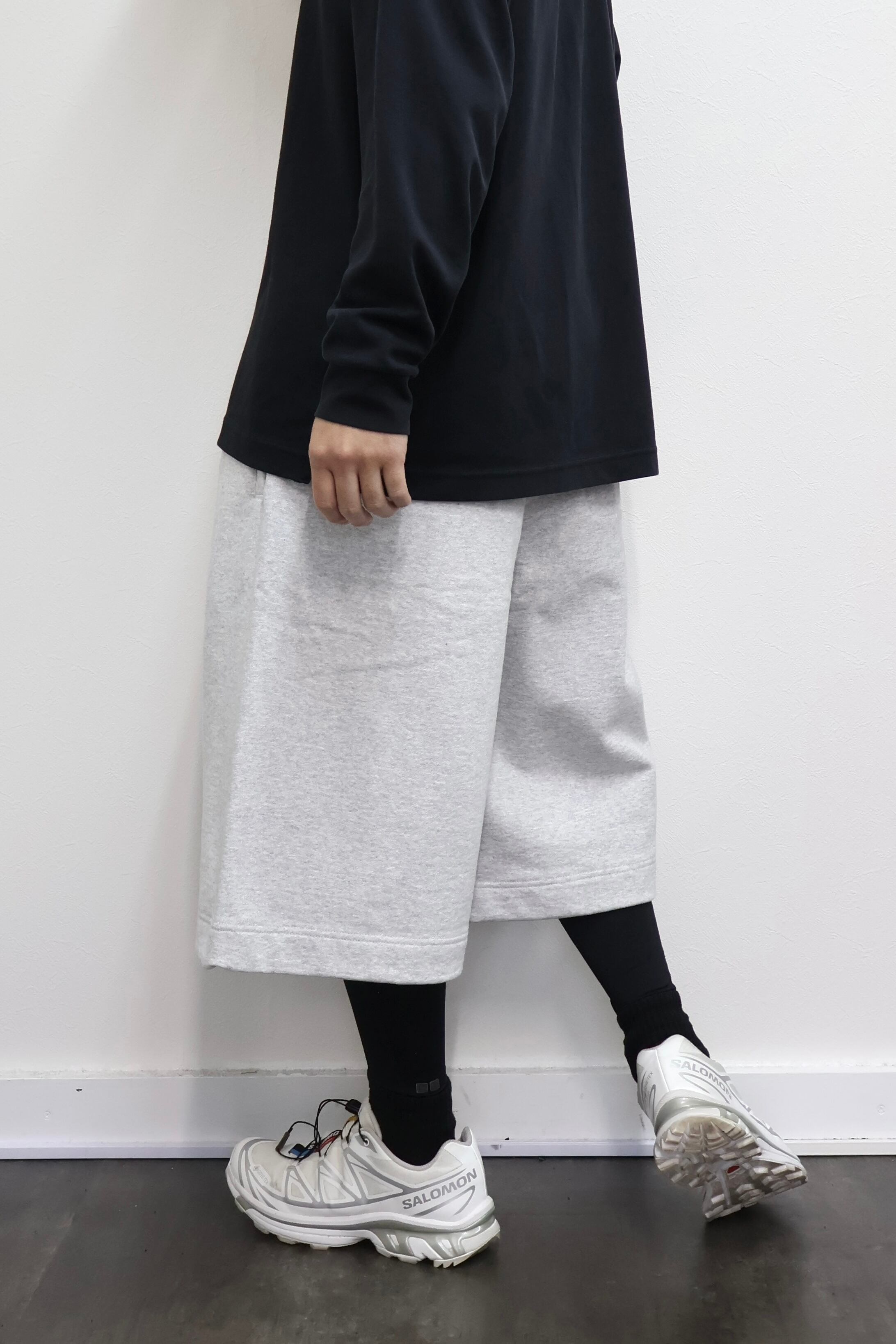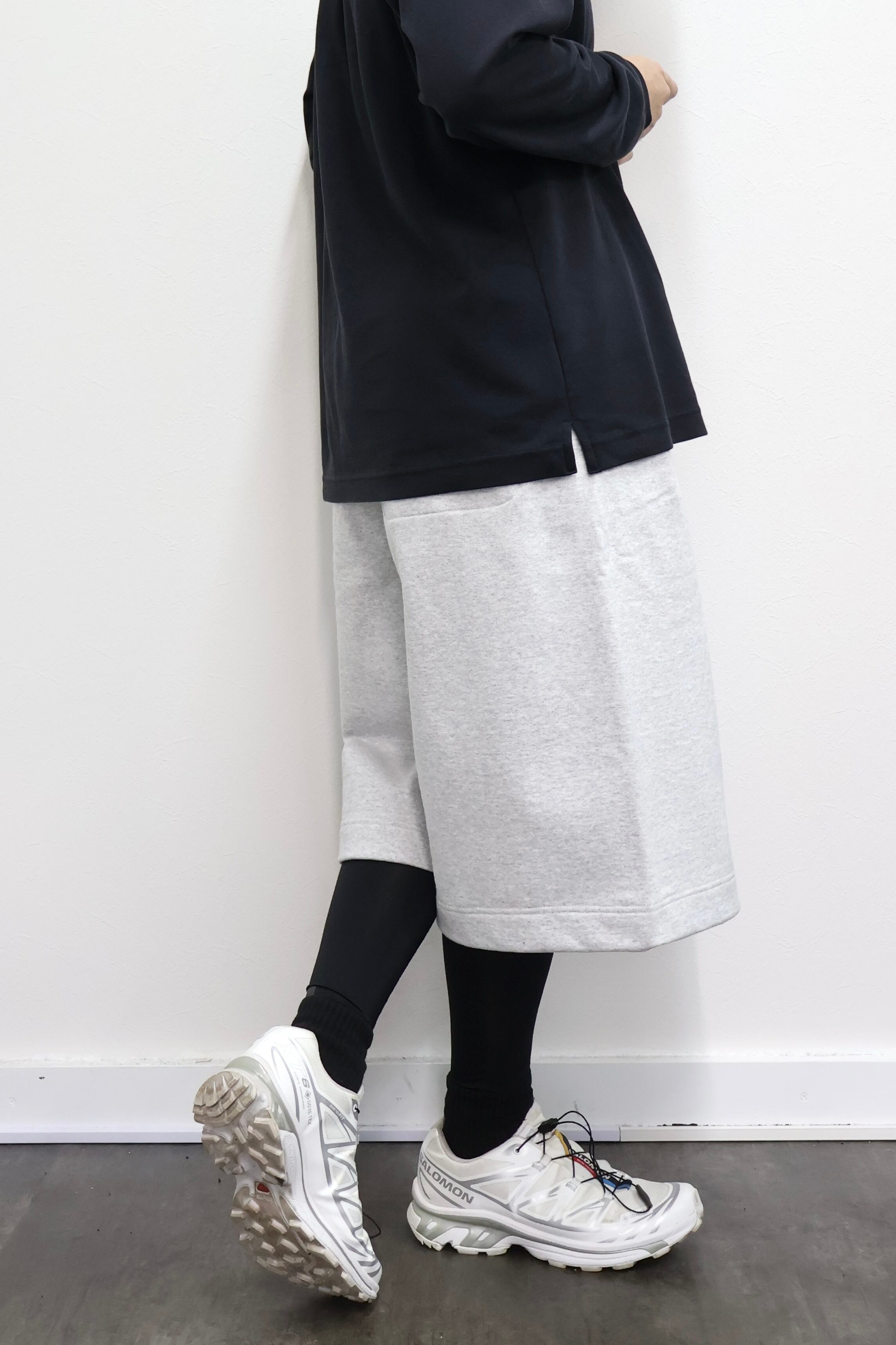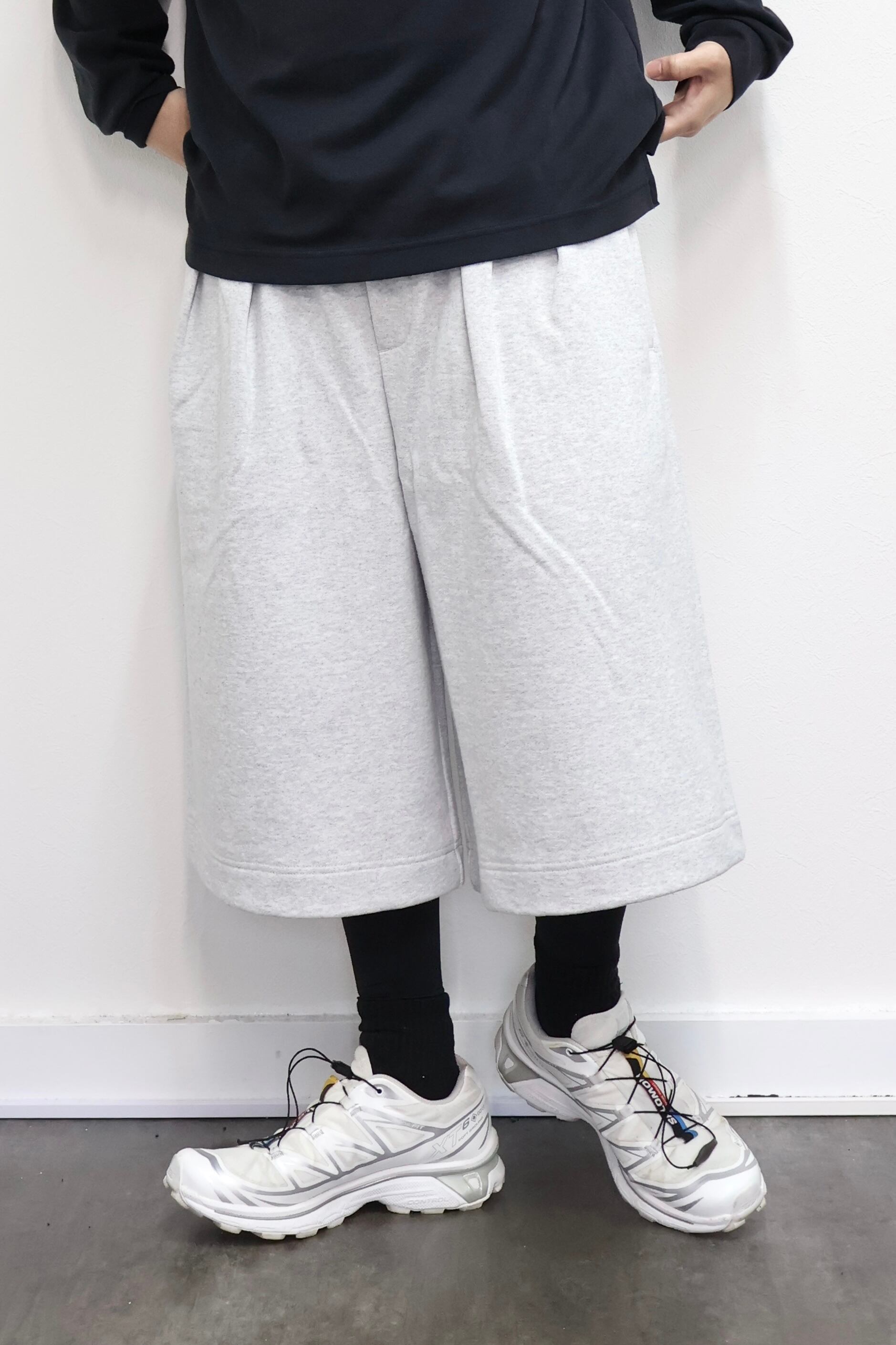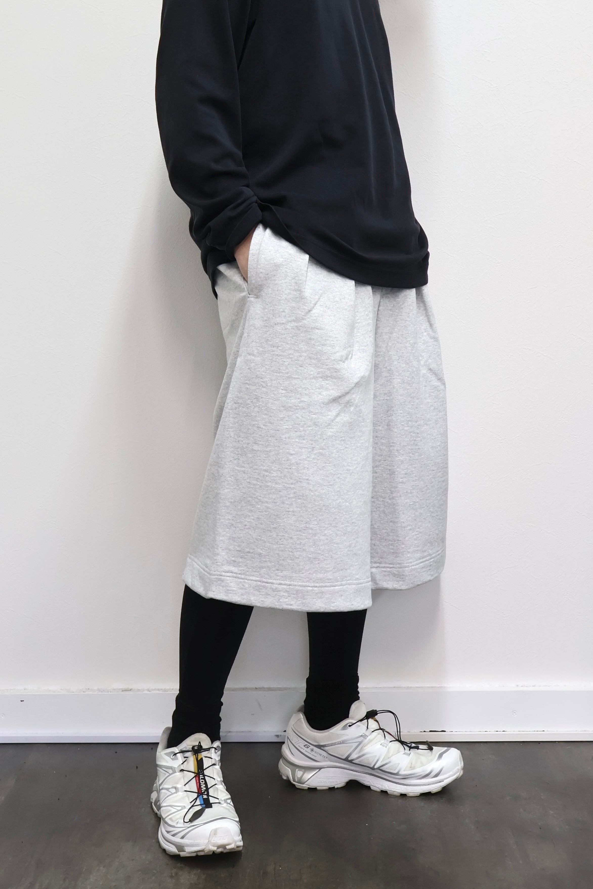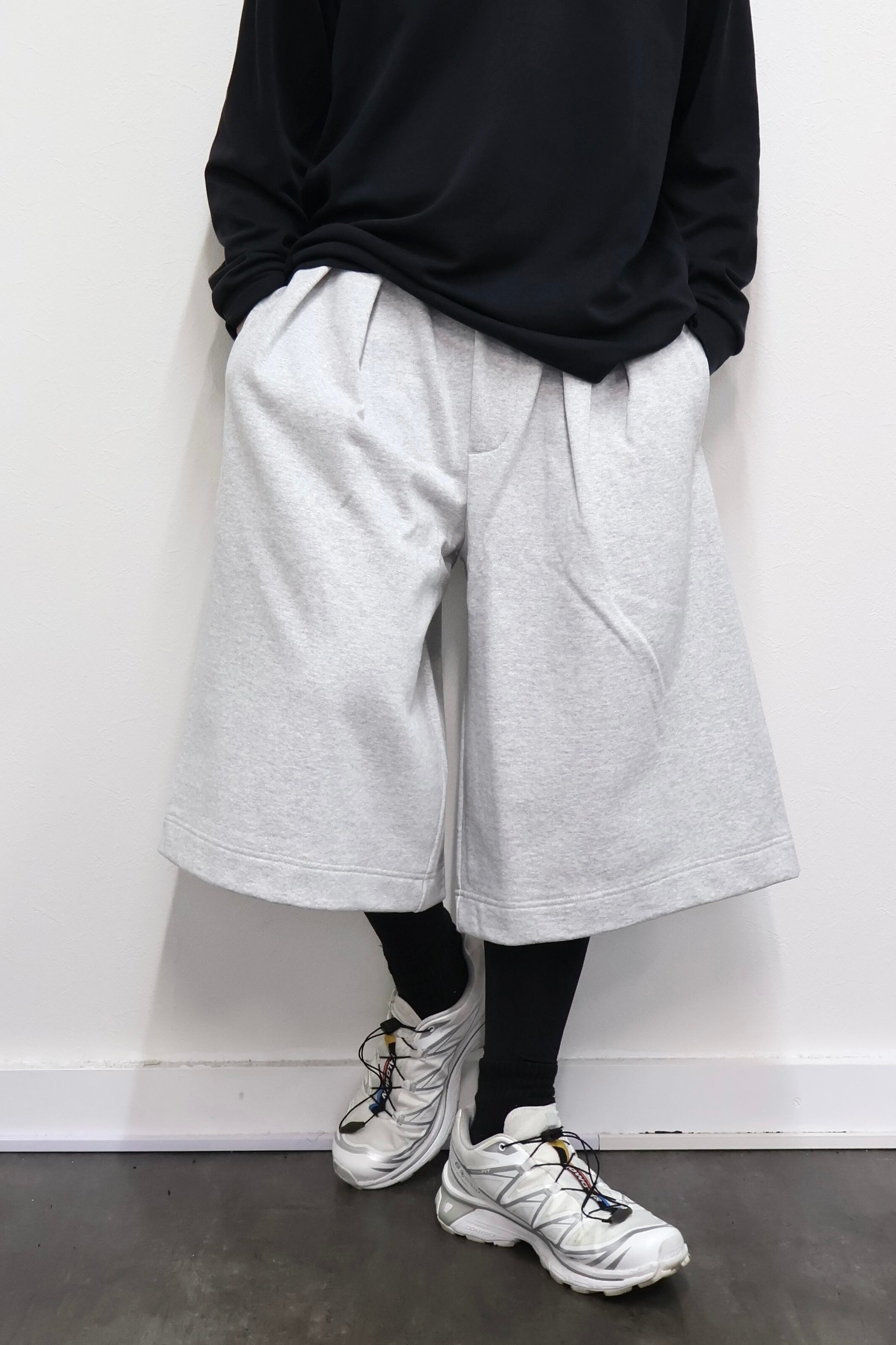 2本のタックを入れたハカマシルエットのスウェットショーツ。ハリのある薄手のオリジナル裏毛素材を使用。脇線を排除するパターンを採用することで自然な膨らみを表現。