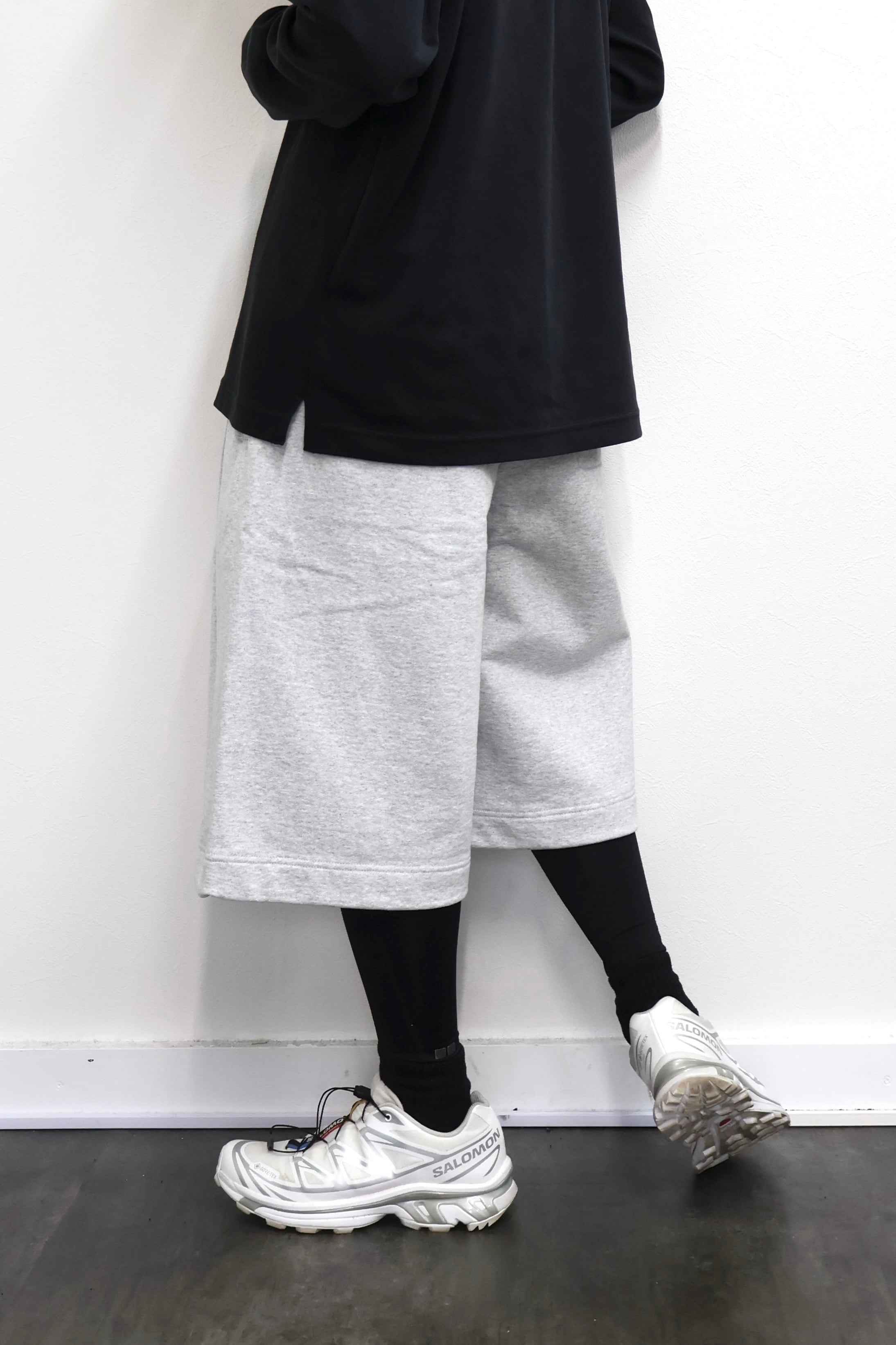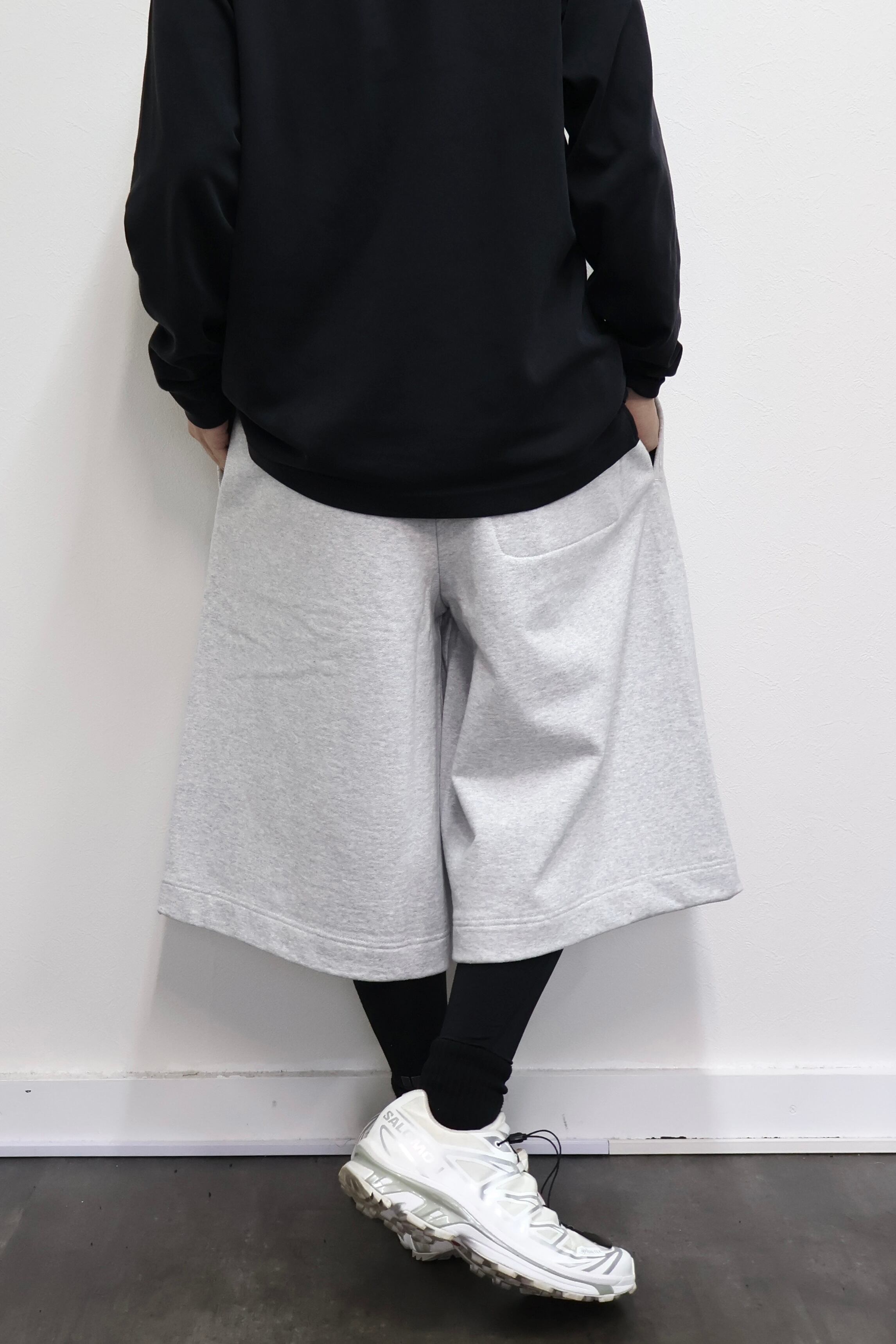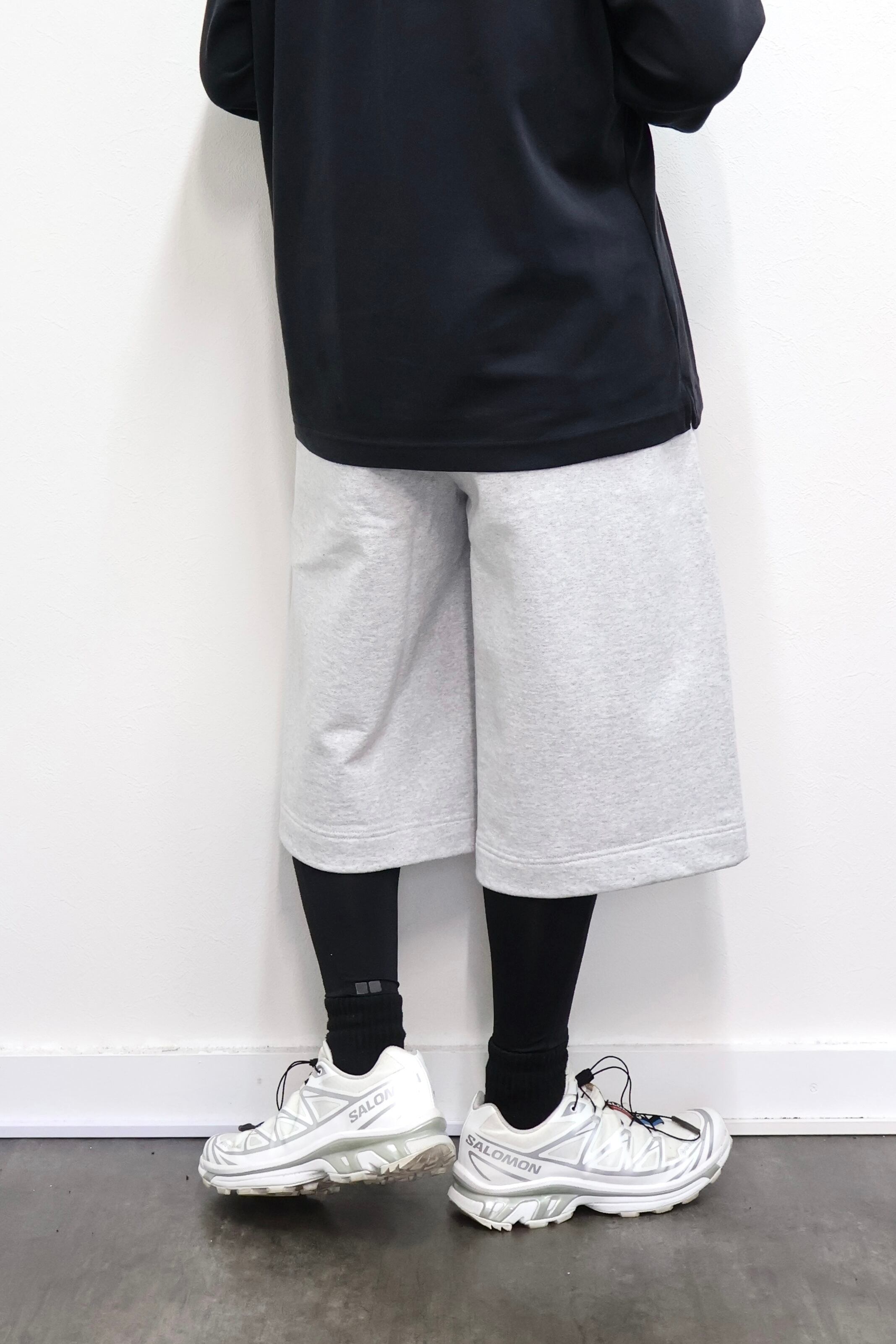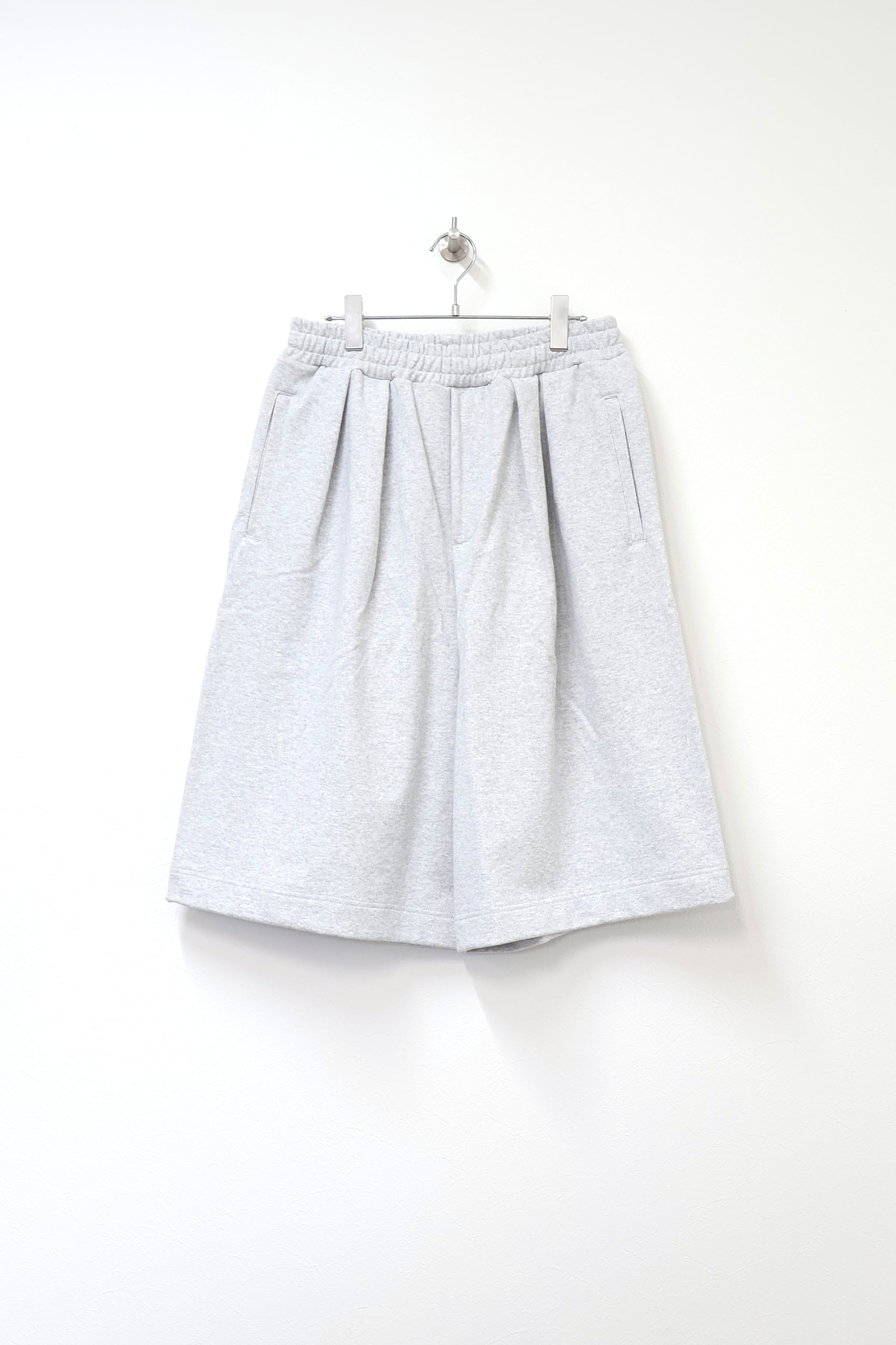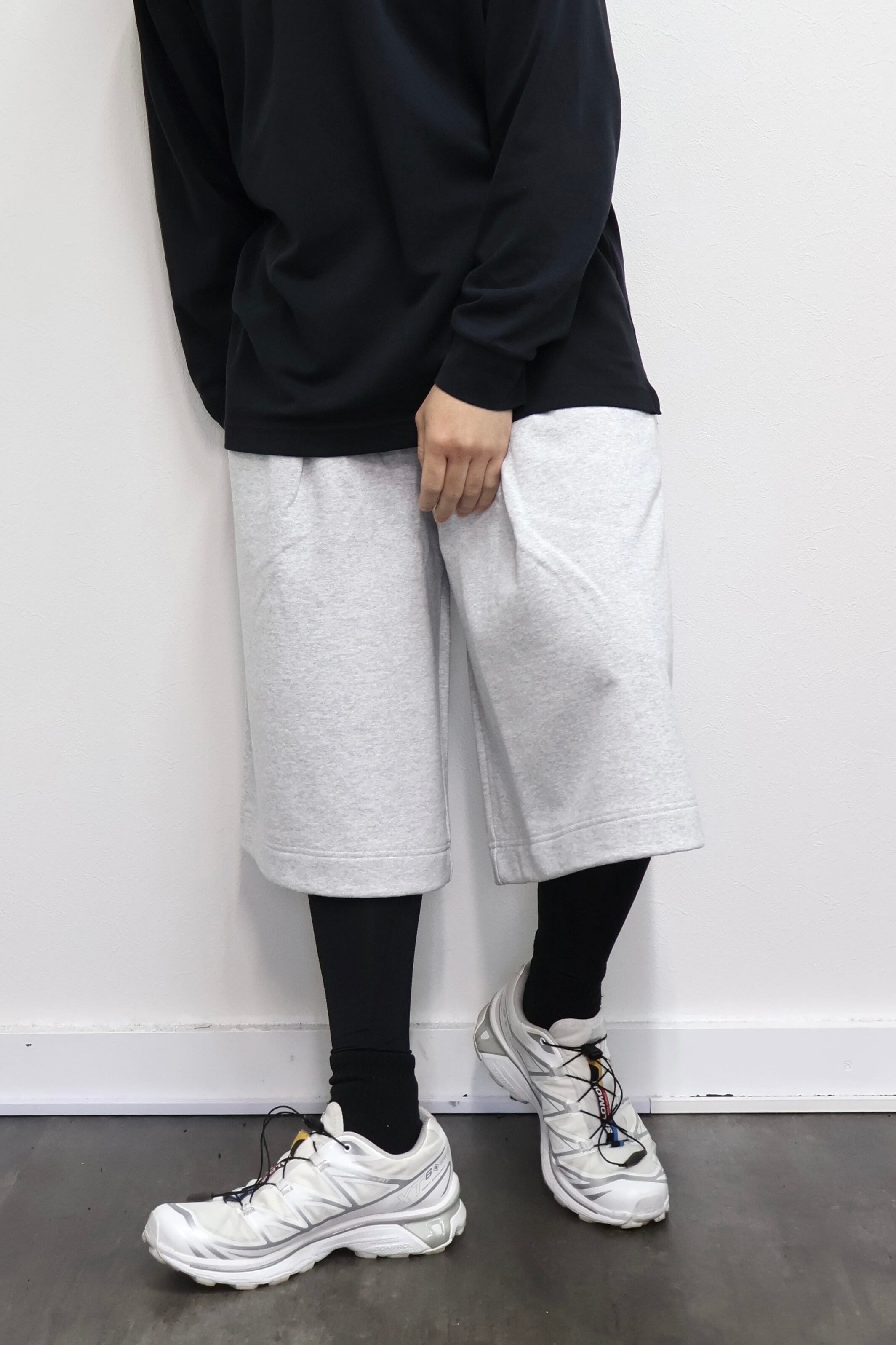 2本のタックを入れたハカマシルエットのスウェットショーツ。ハリのある薄手のオリジナル裏毛素材を使用。脇線を排除するパターンを採用することで自然な膨らみを表現。