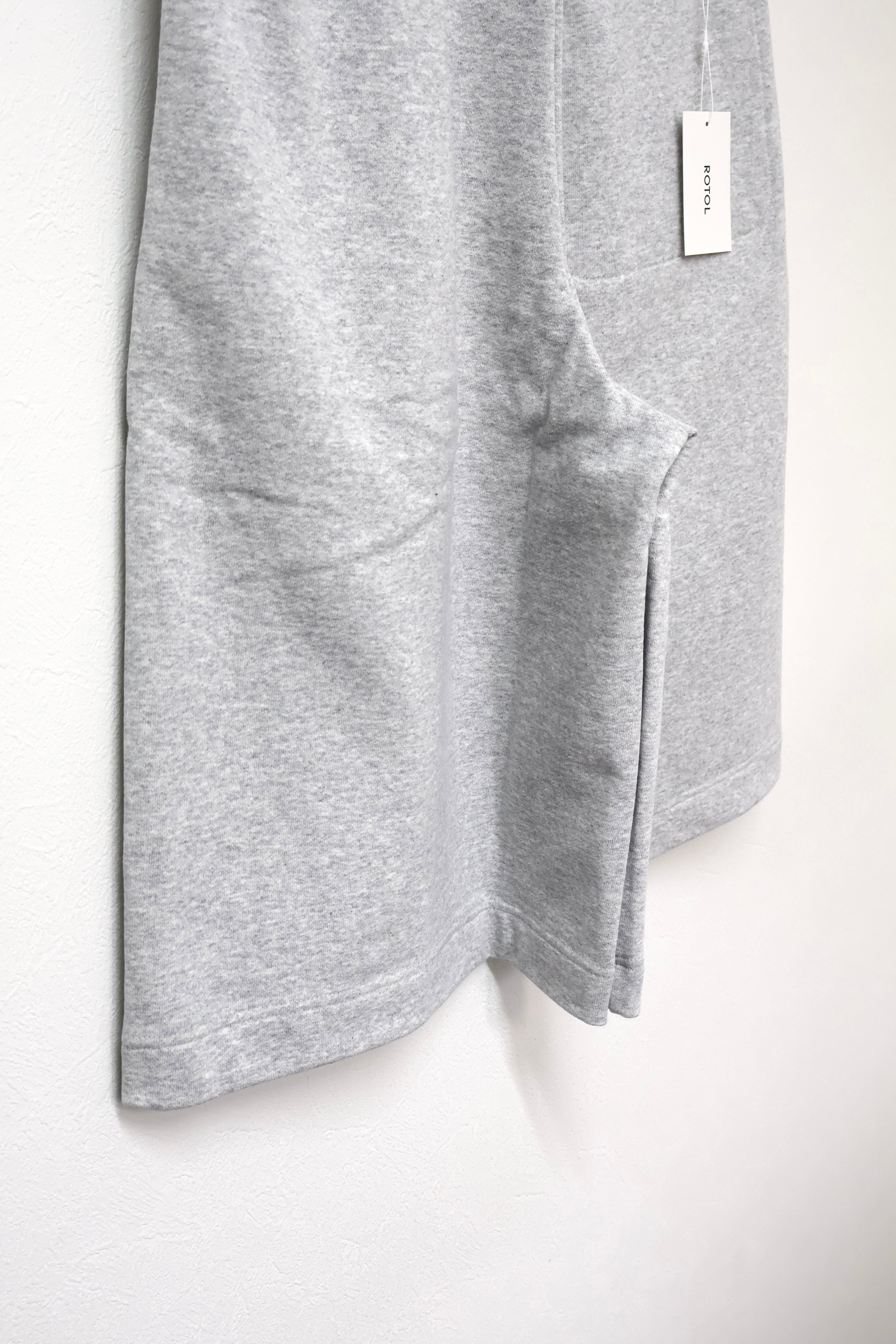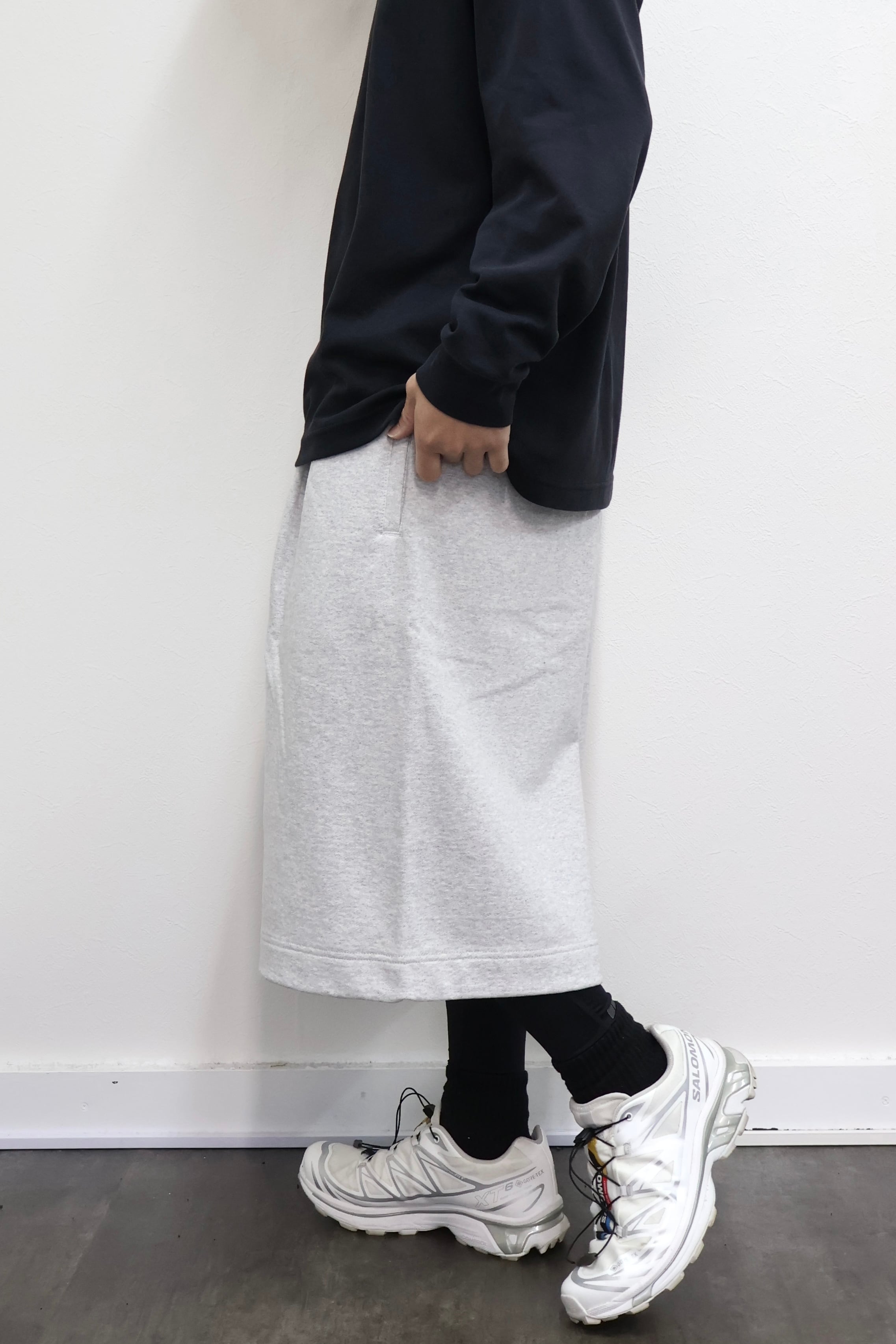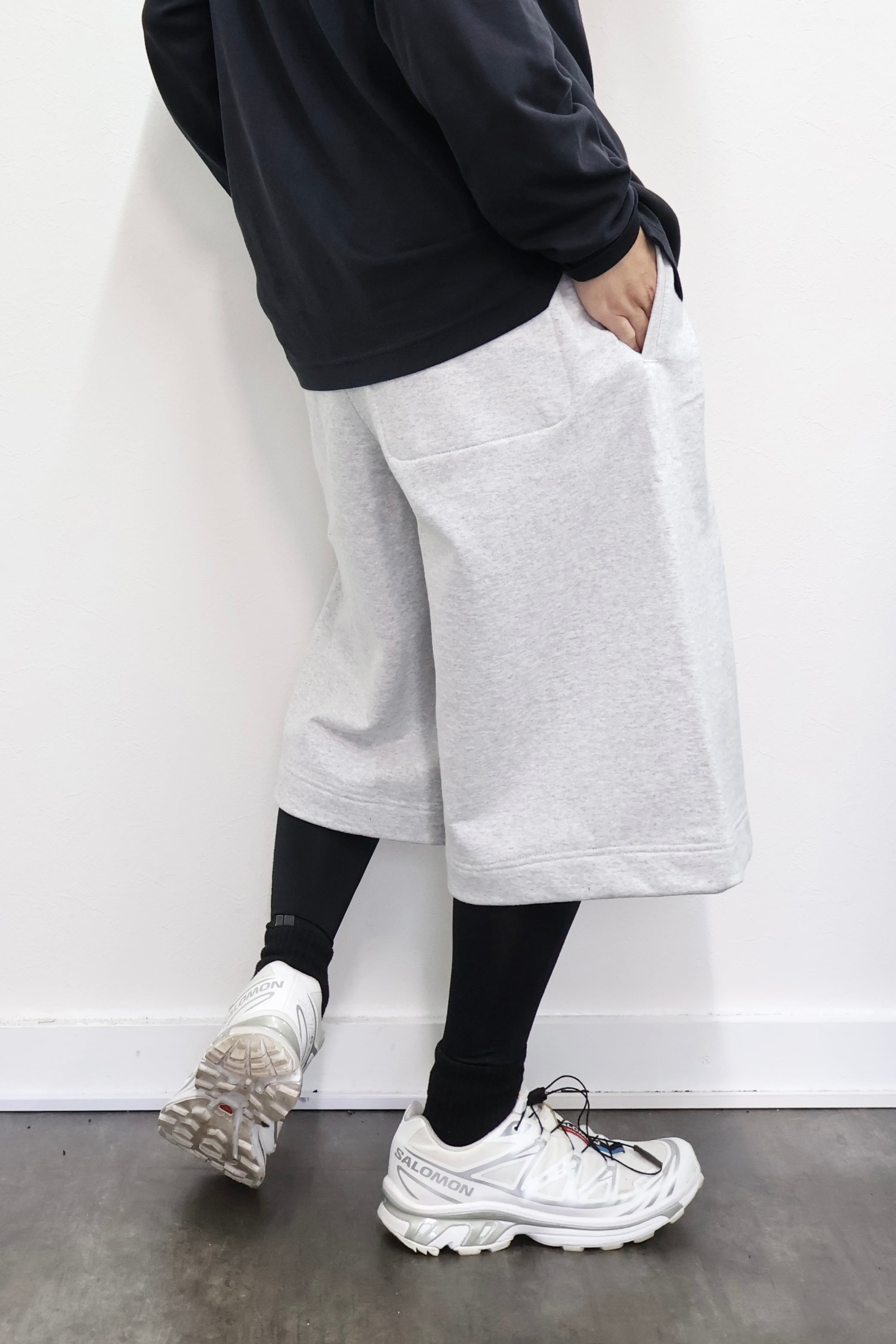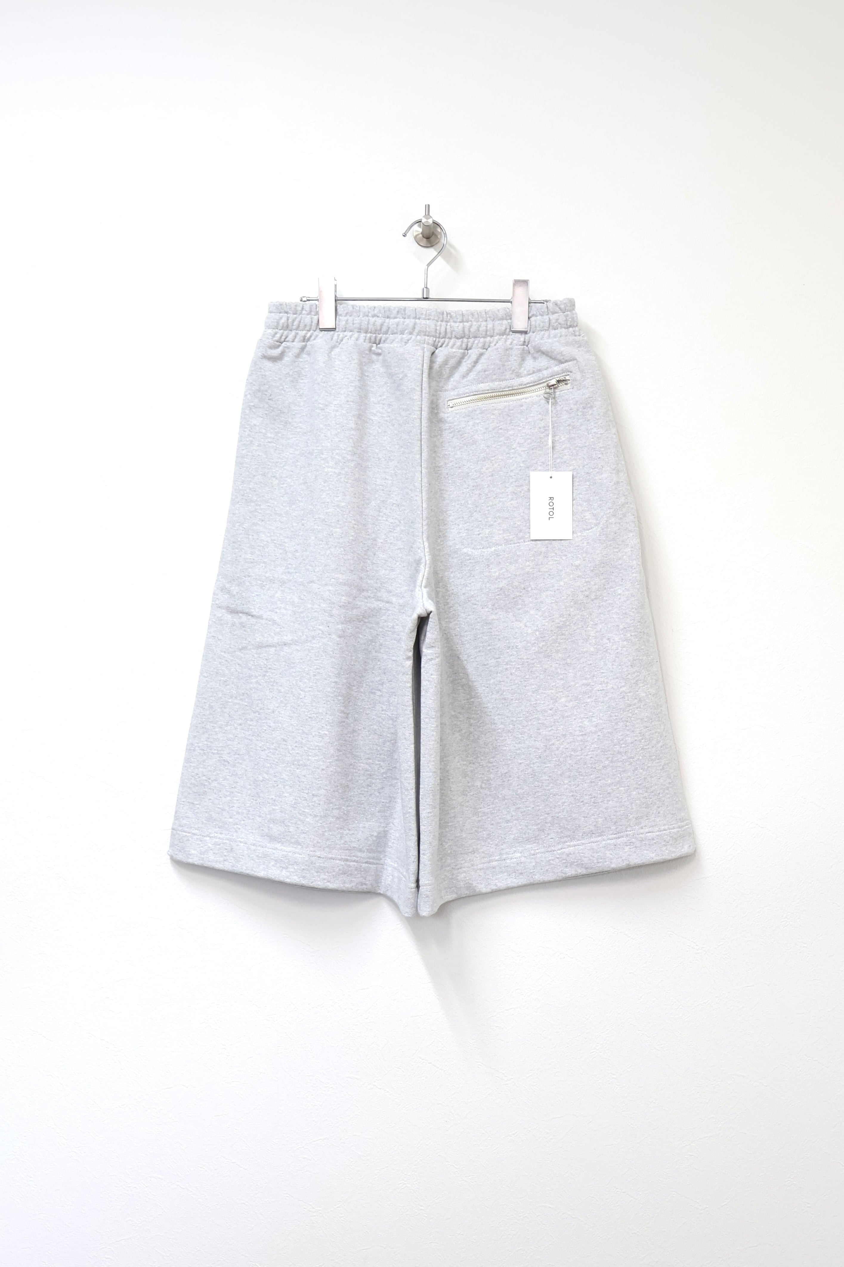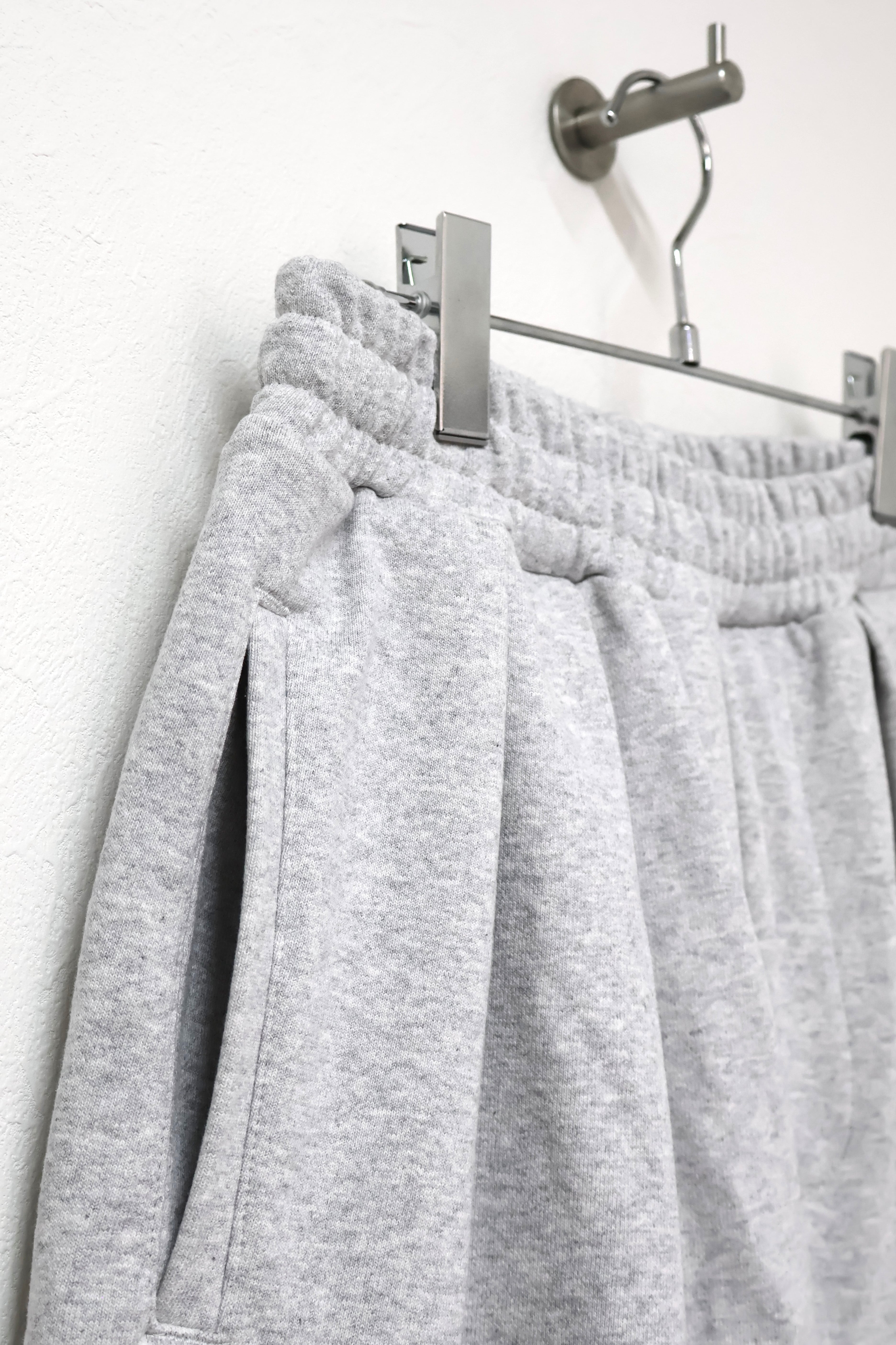 2本のタックを入れたハカマシルエットのスウェットショーツ。ハリのある薄手のオリジナル裏毛素材を使用。脇線を排除するパターンを採用することで自然な膨らみを表現。