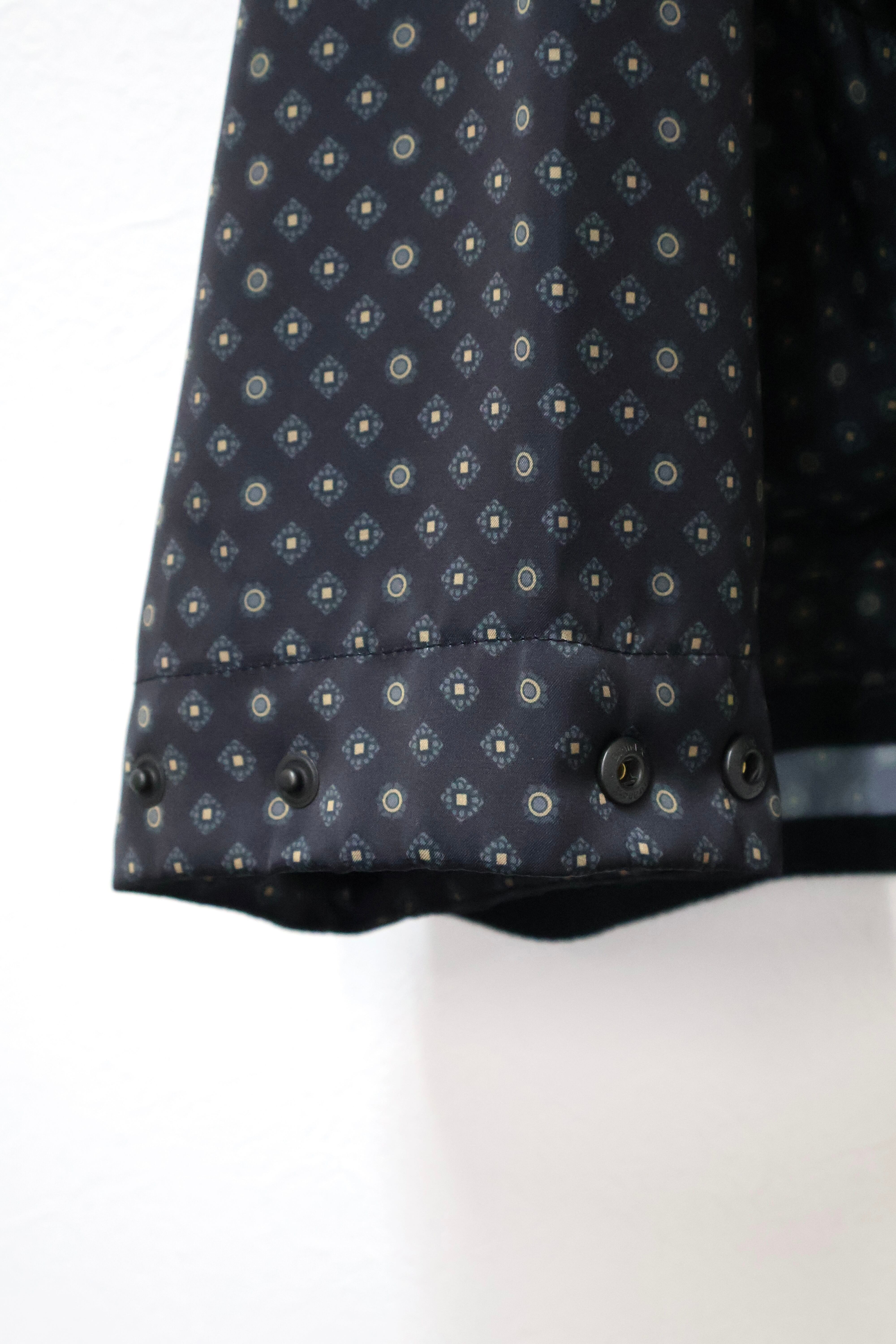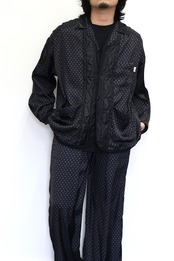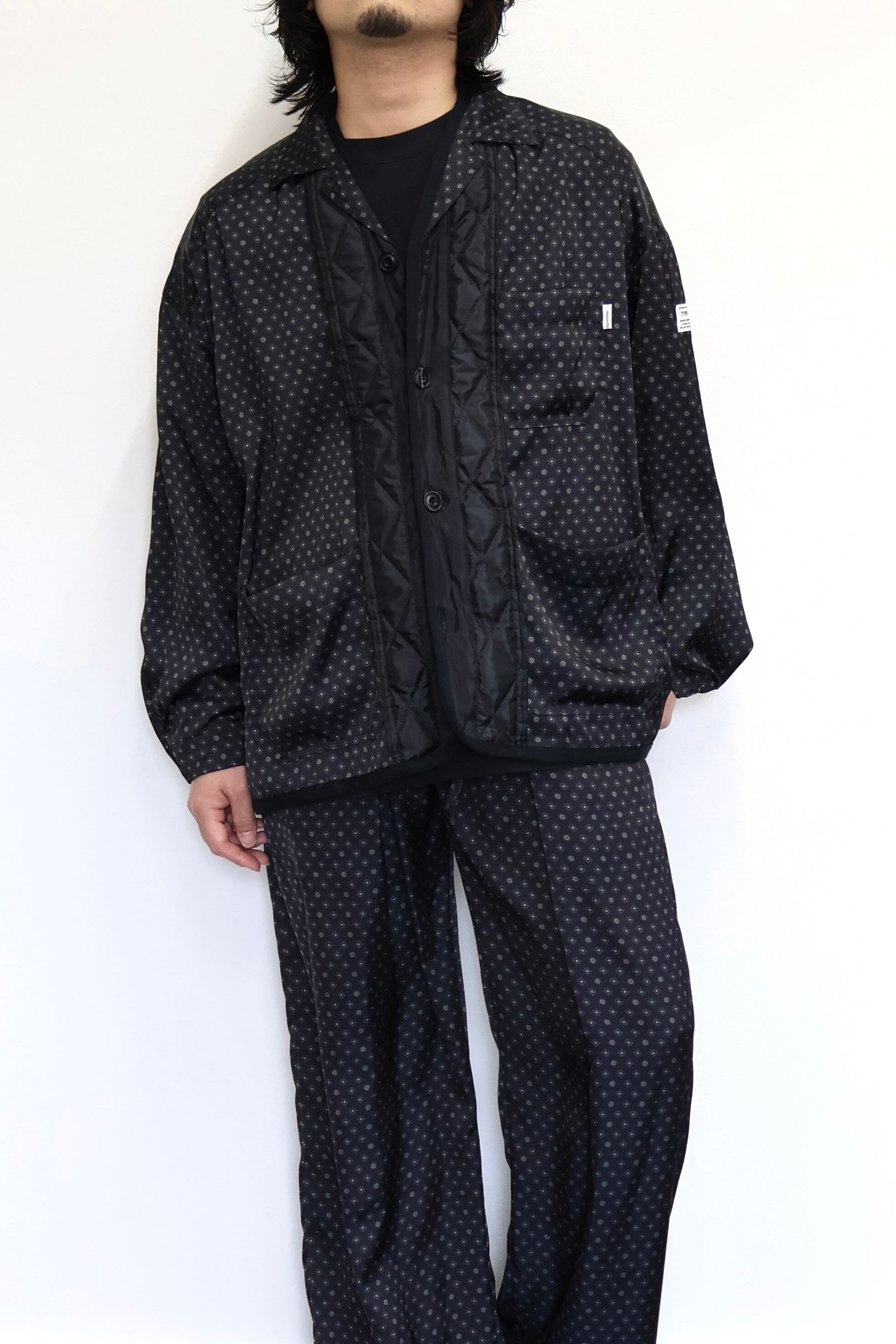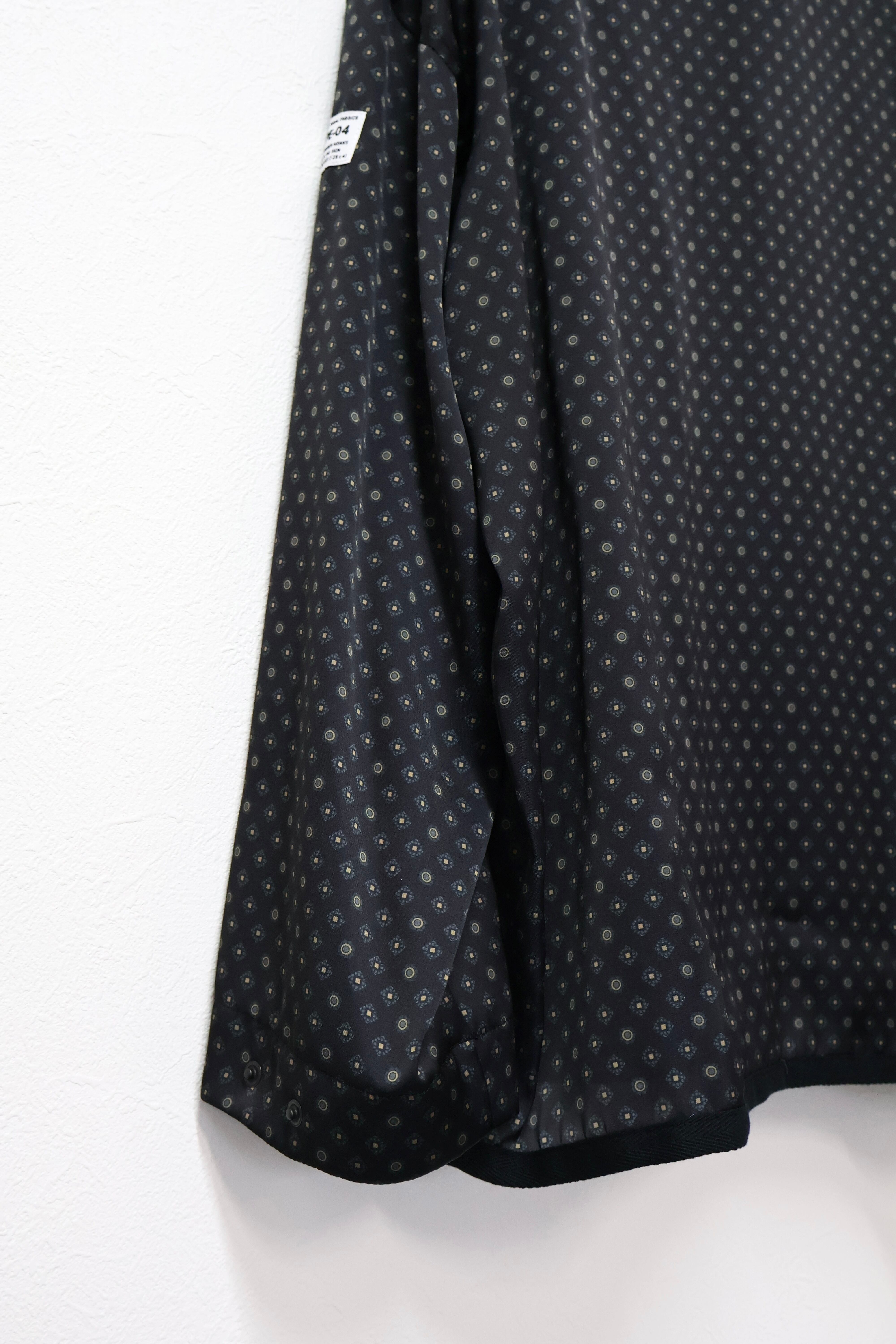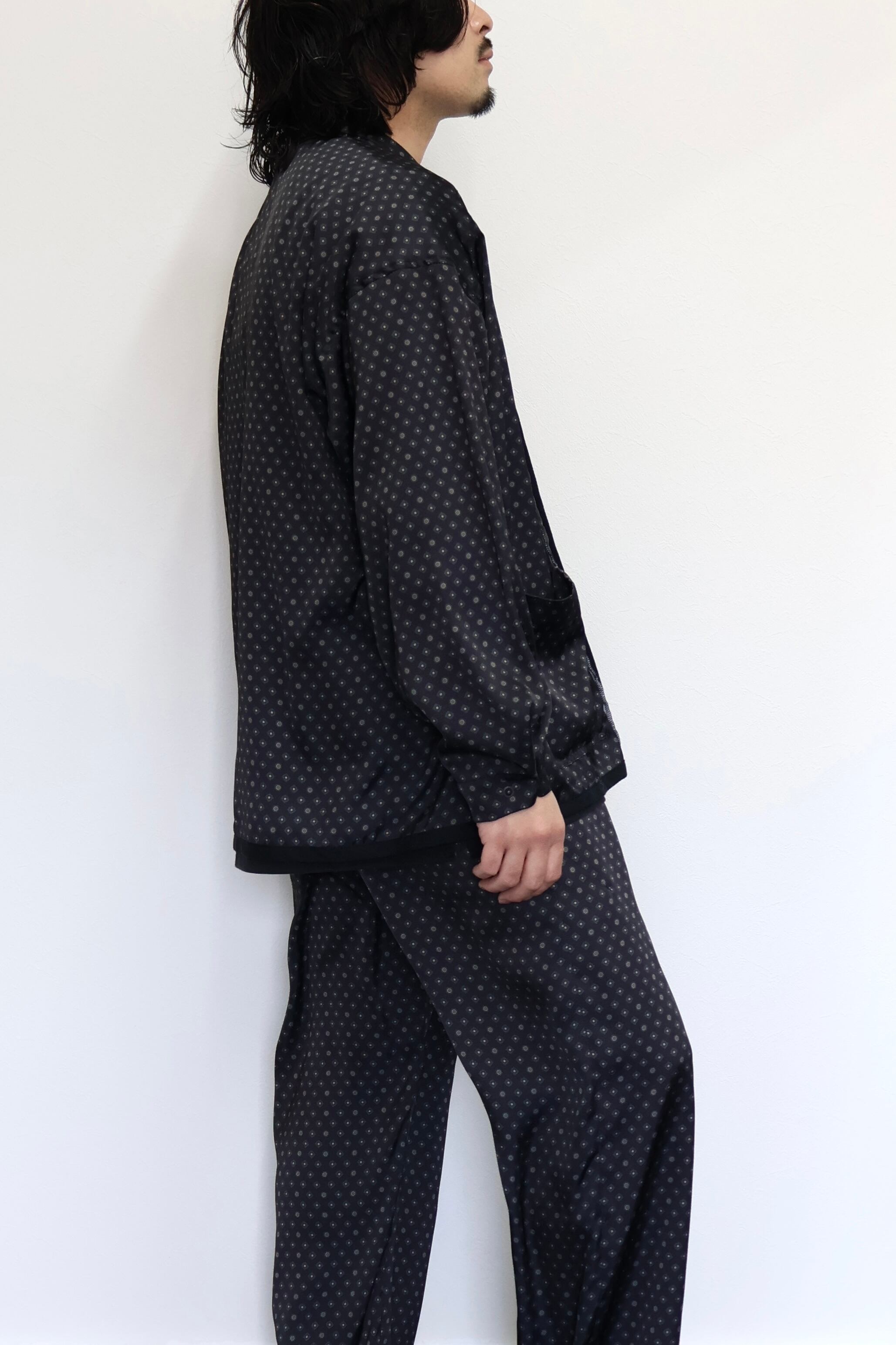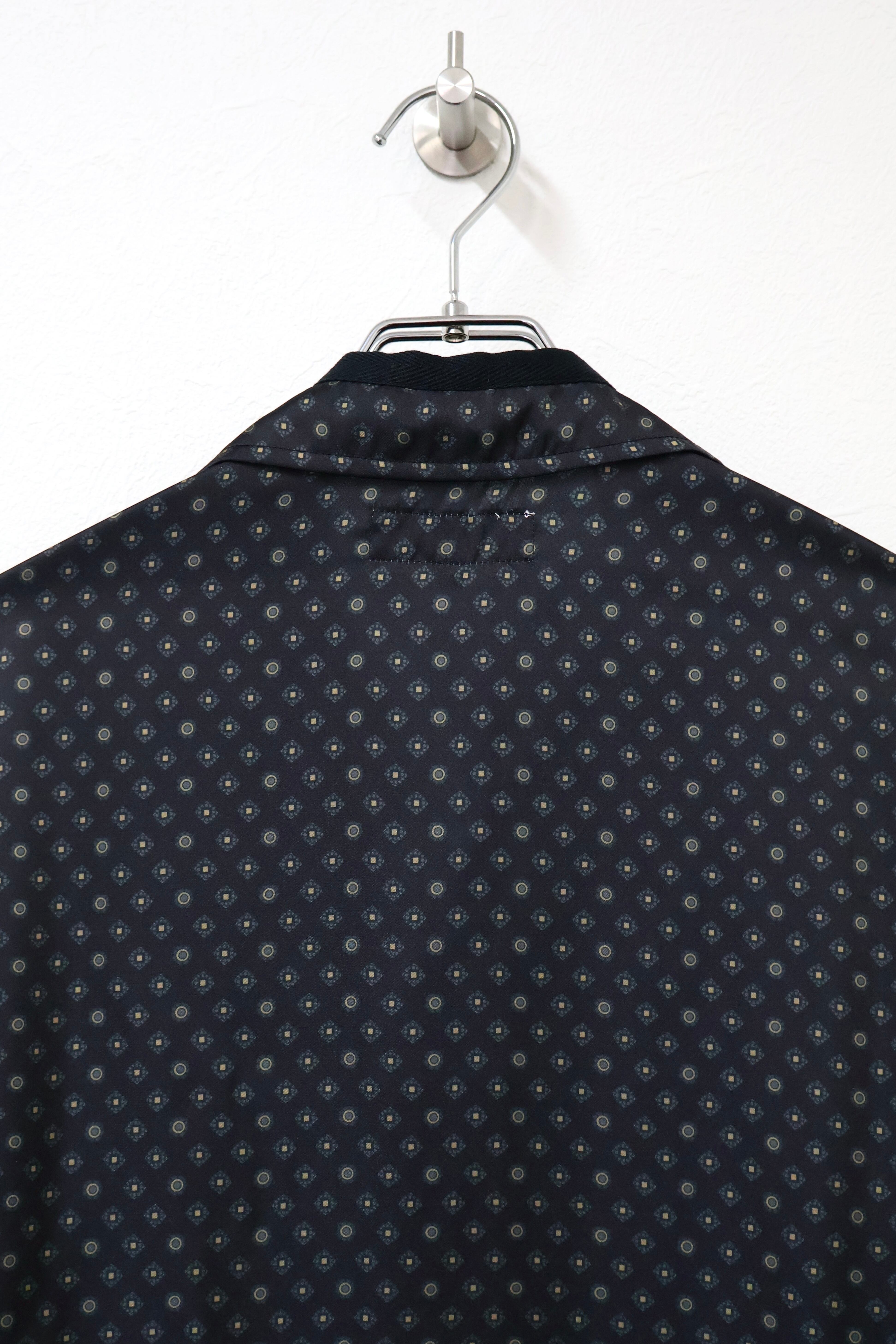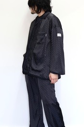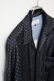 パジャマシャツとキルティングライナーをドッキングしたアイテム。素材には非常に柔らかくドレープ感のあるサテン地に昇華転写プリントを施したオリジナルファブリックを使用。縫製後に襟を折りたたみ、プレス加工を施したのちパイピング縫製を実施。袖口にはスナップボタンを配置しサイズ調整が可能。