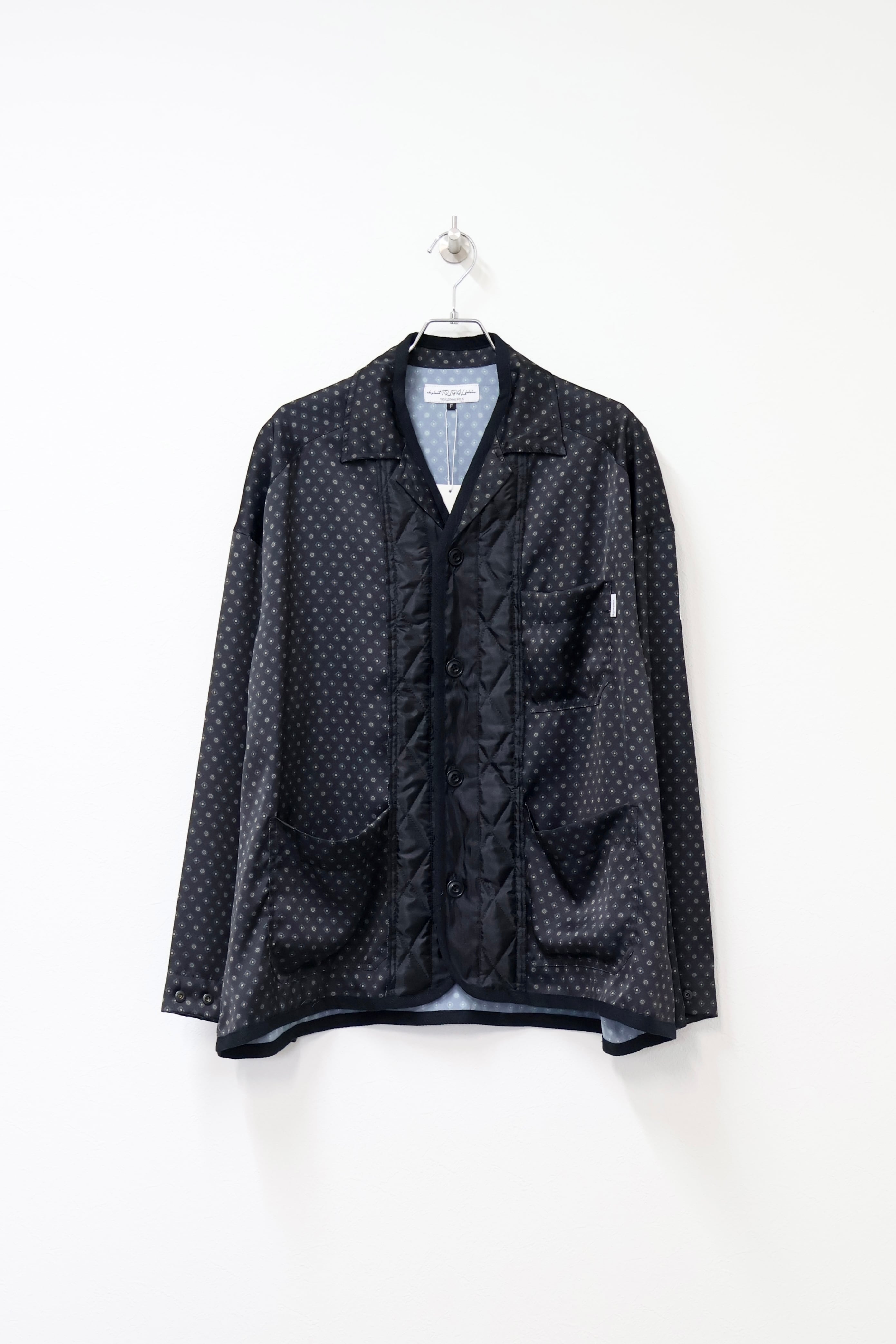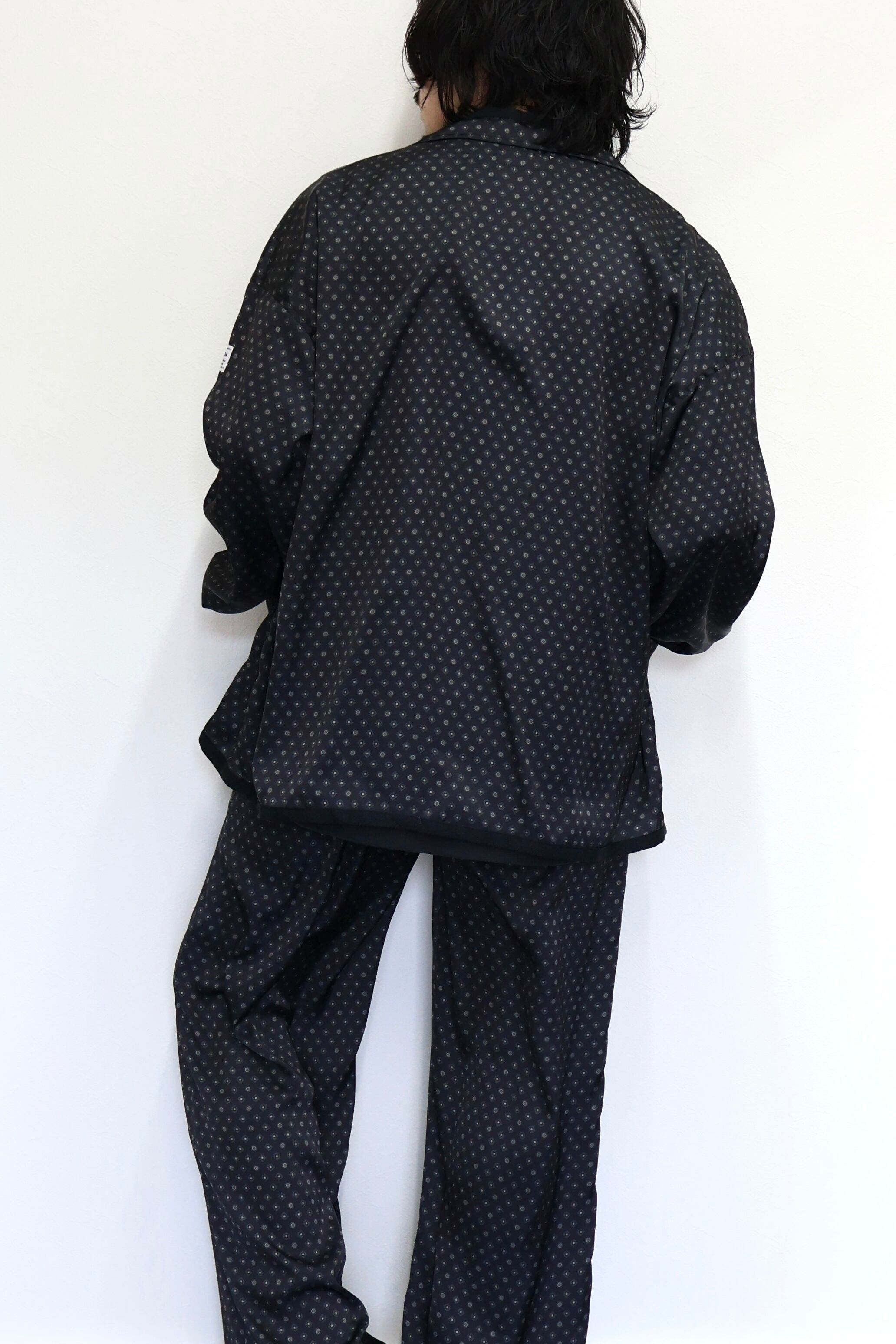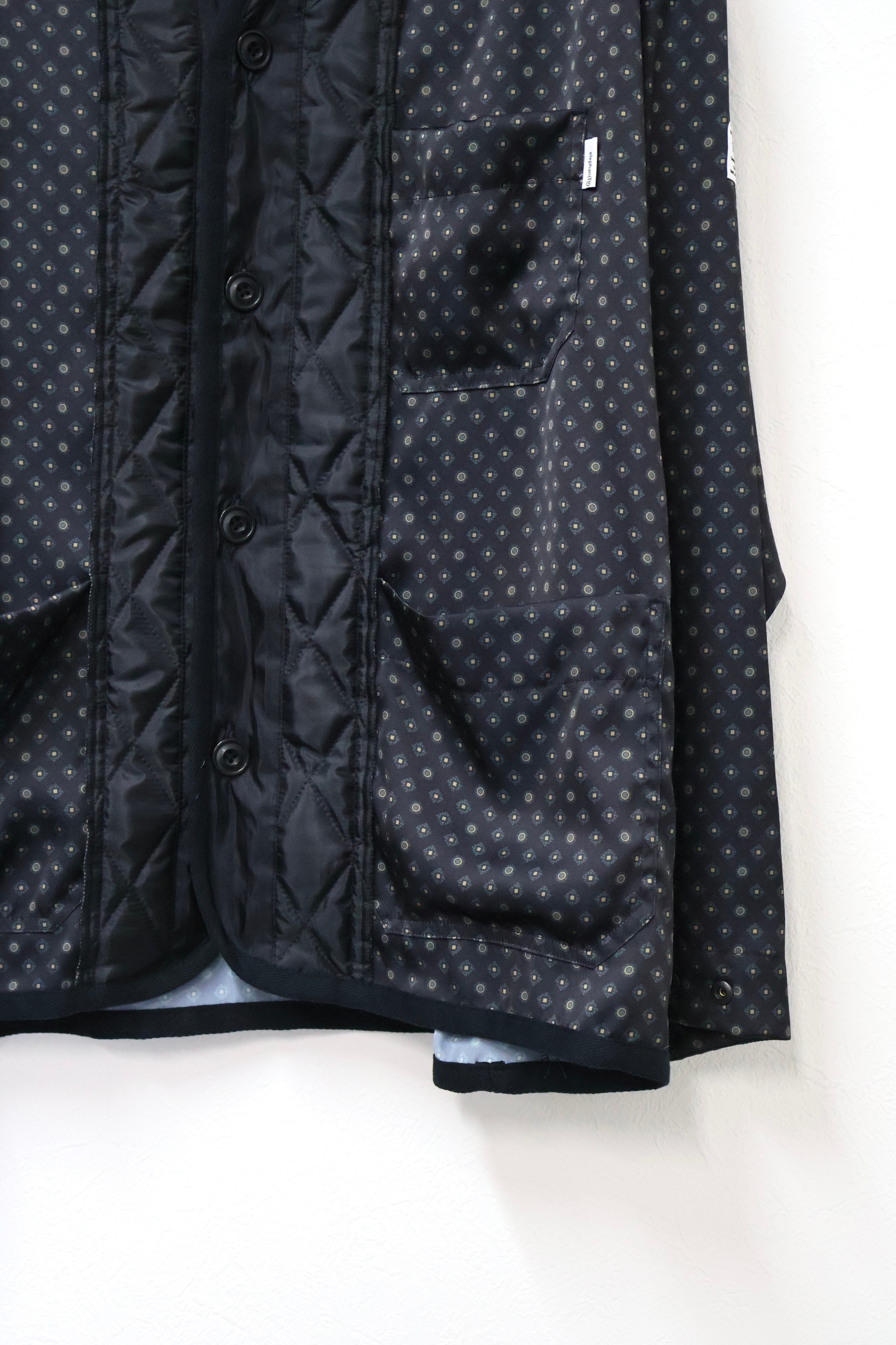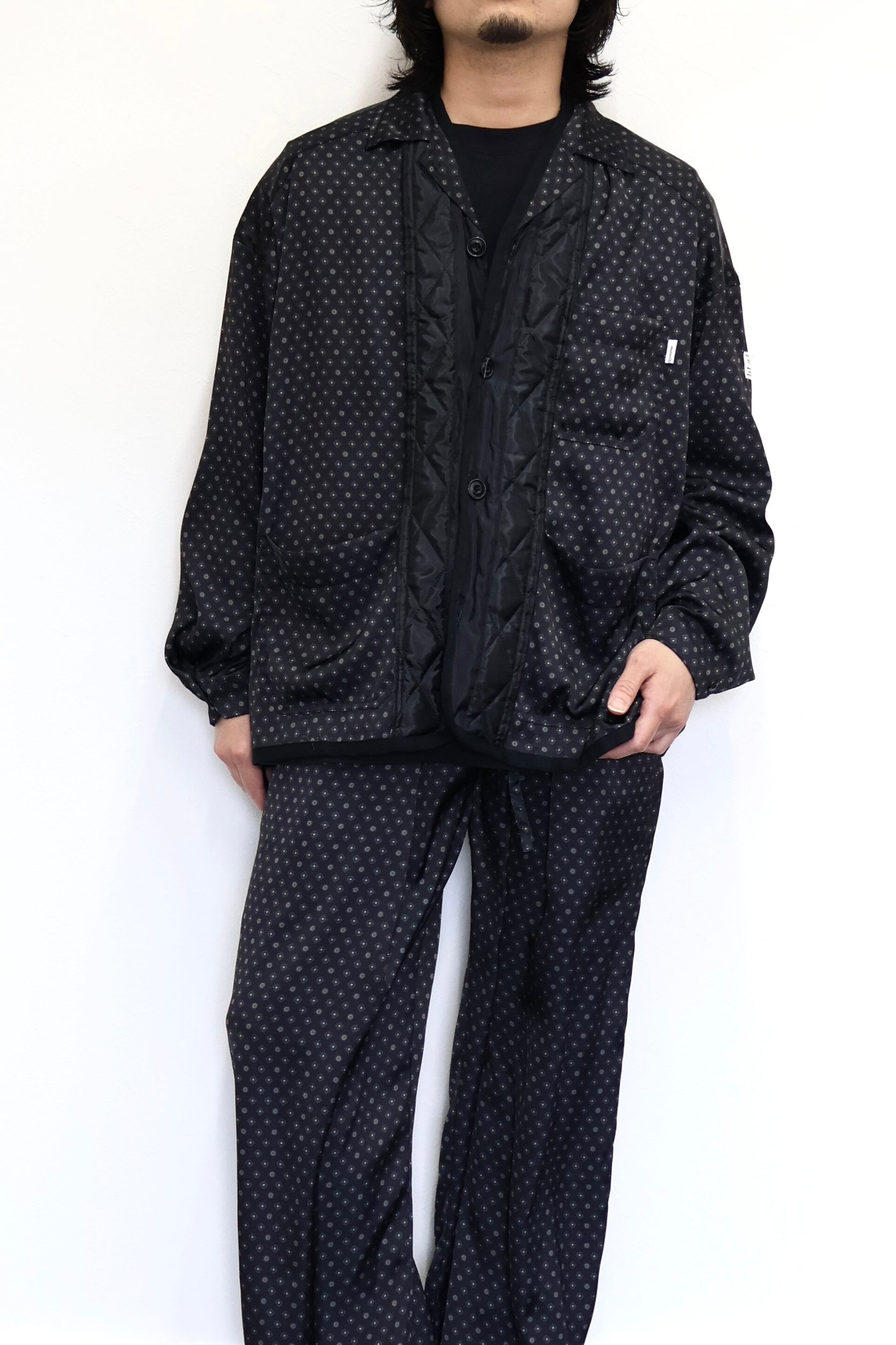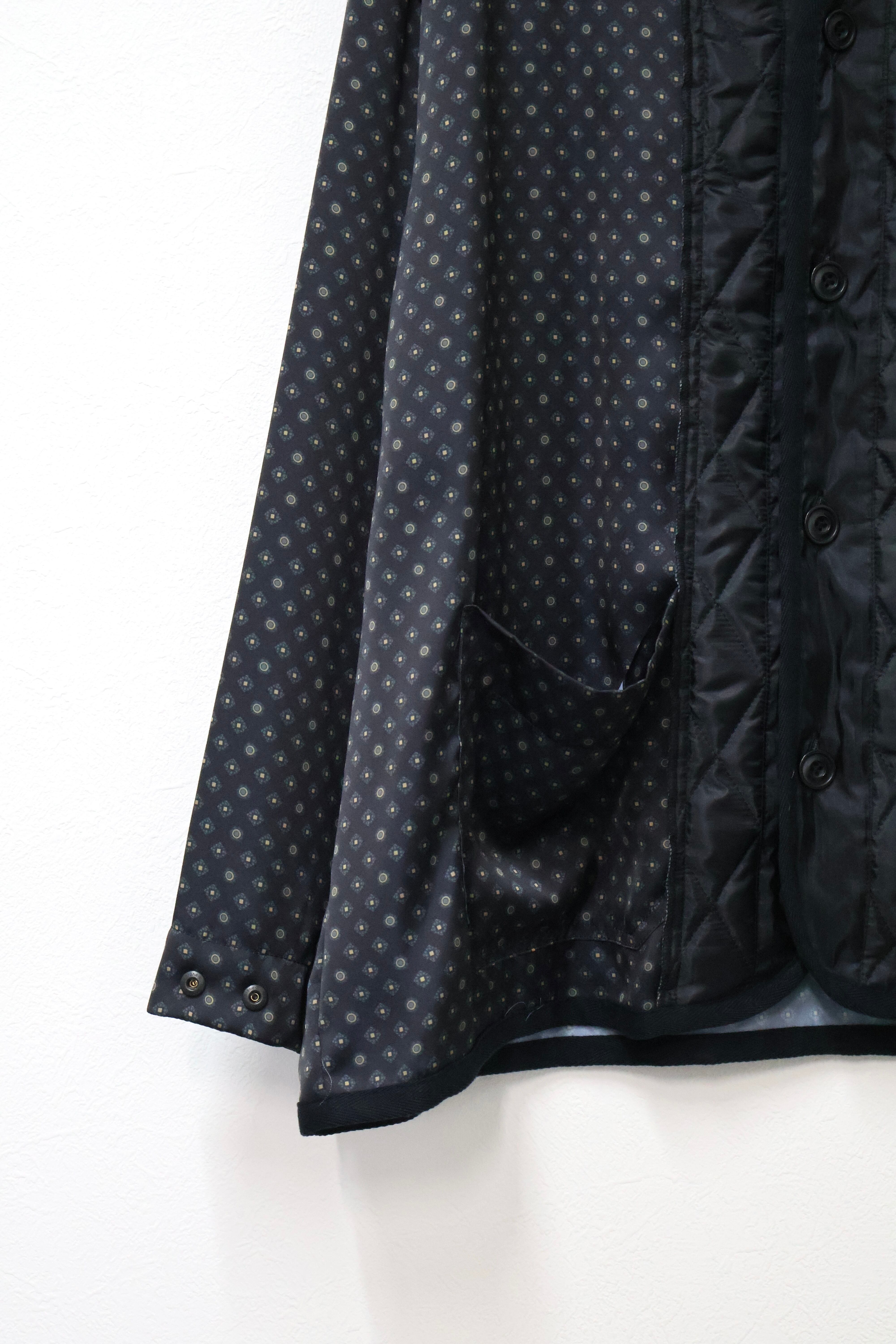 パジャマシャツとキルティングライナーをドッキングしたアイテム。素材には非常に柔らかくドレープ感のあるサテン地に昇華転写プリントを施したオリジナルファブリックを使用。縫製後に襟を折りたたみ、プレス加工を施したのちパイピング縫製を実施。袖口にはスナップボタンを配置しサイズ調整が可能。