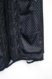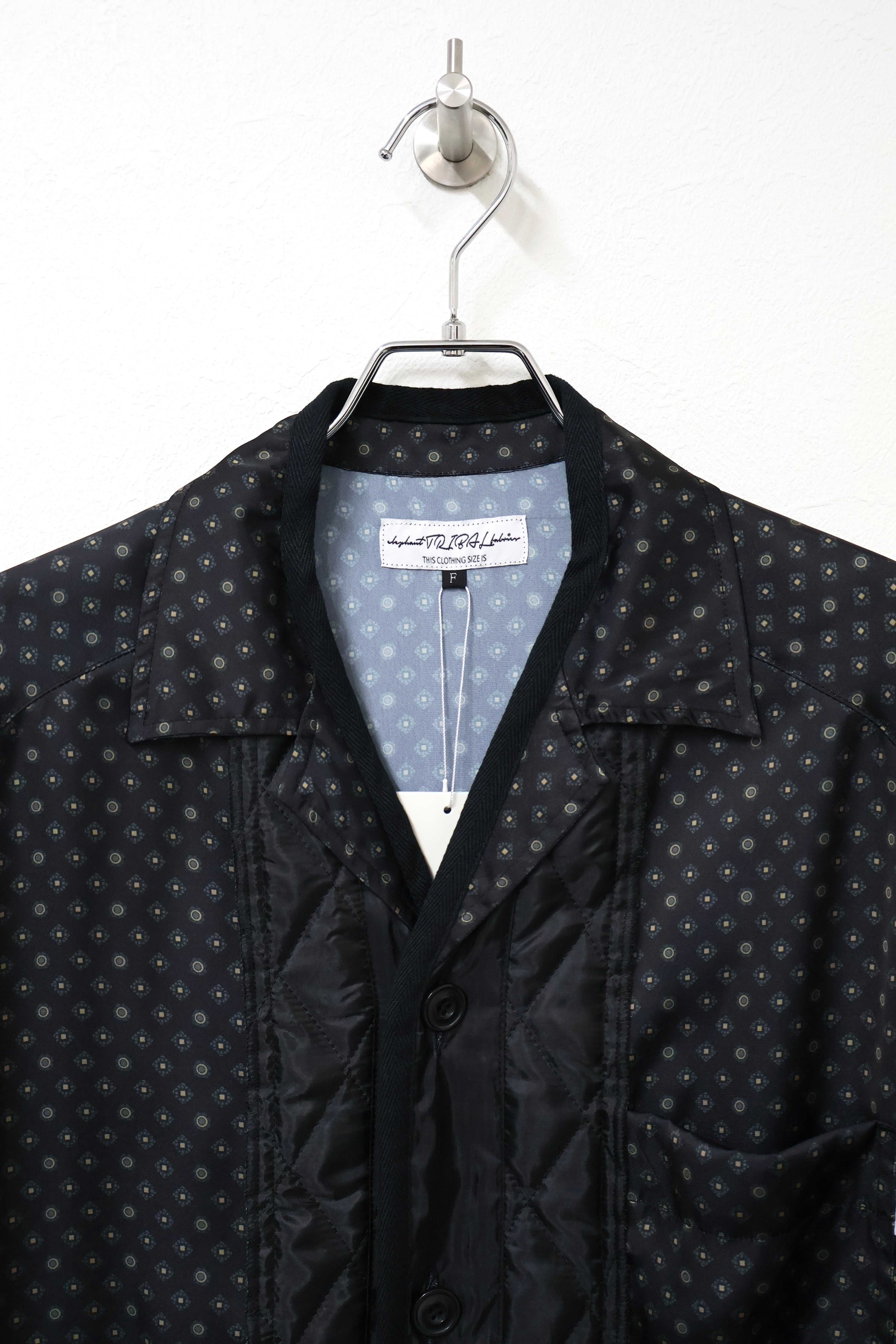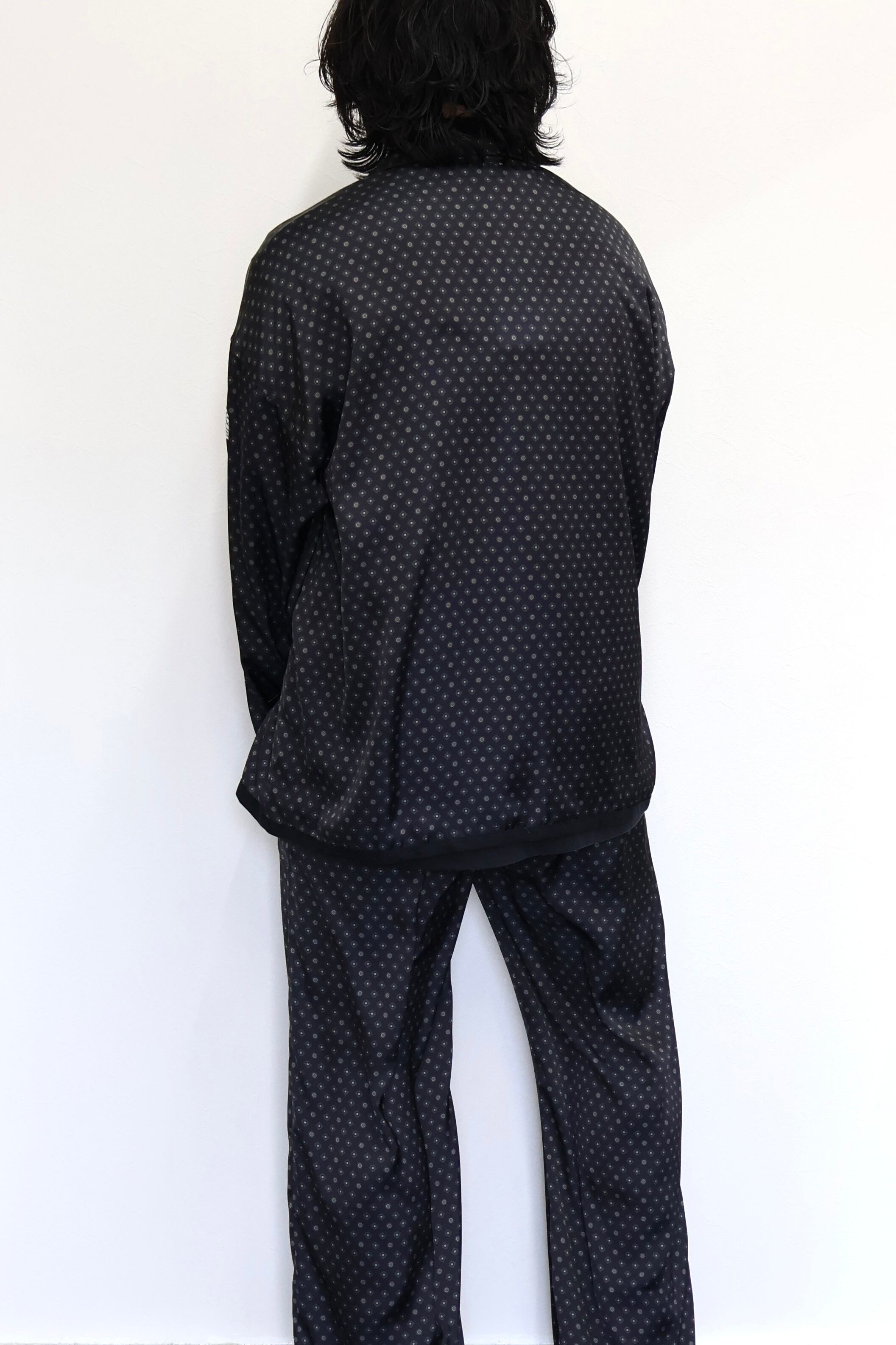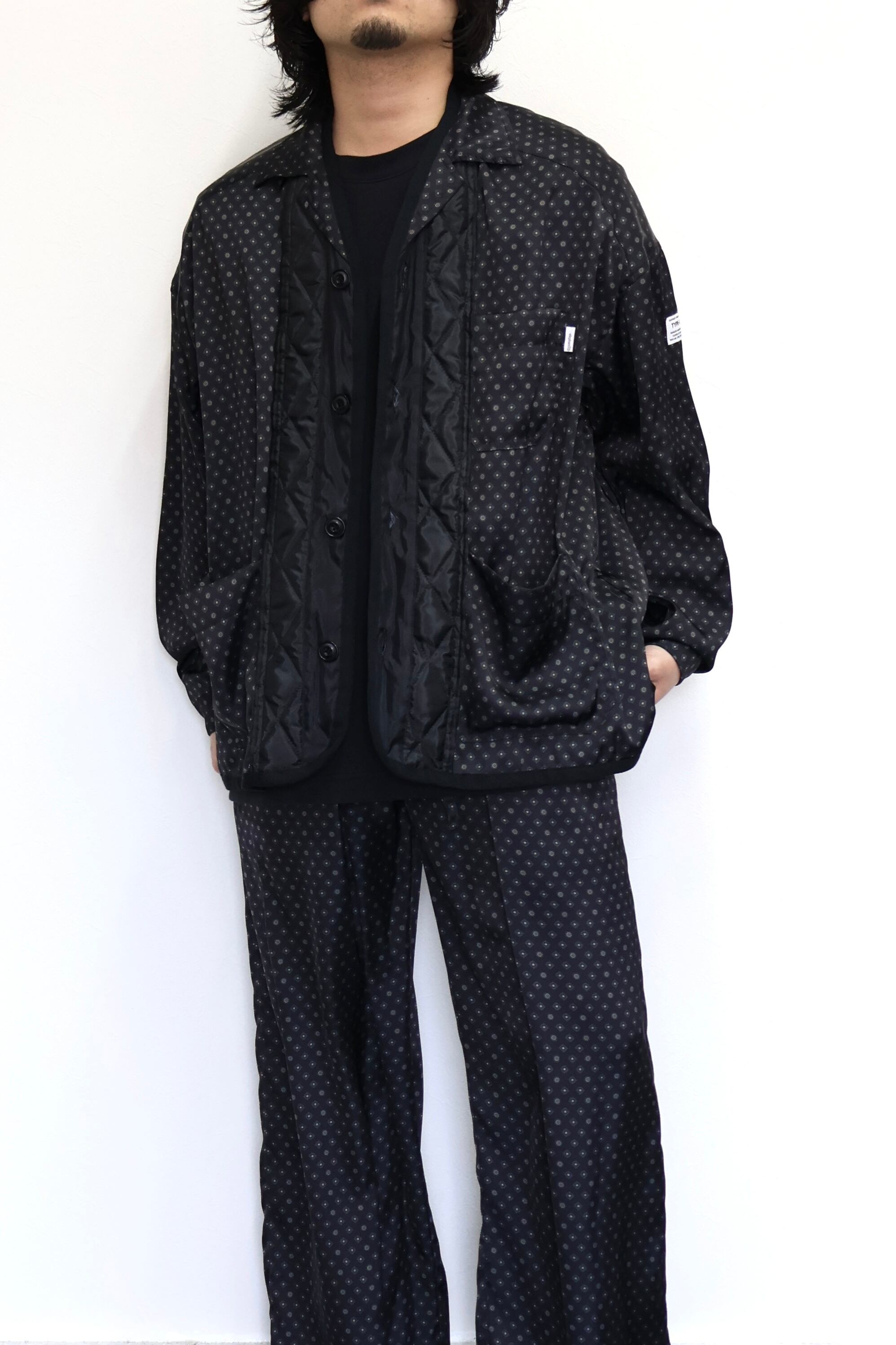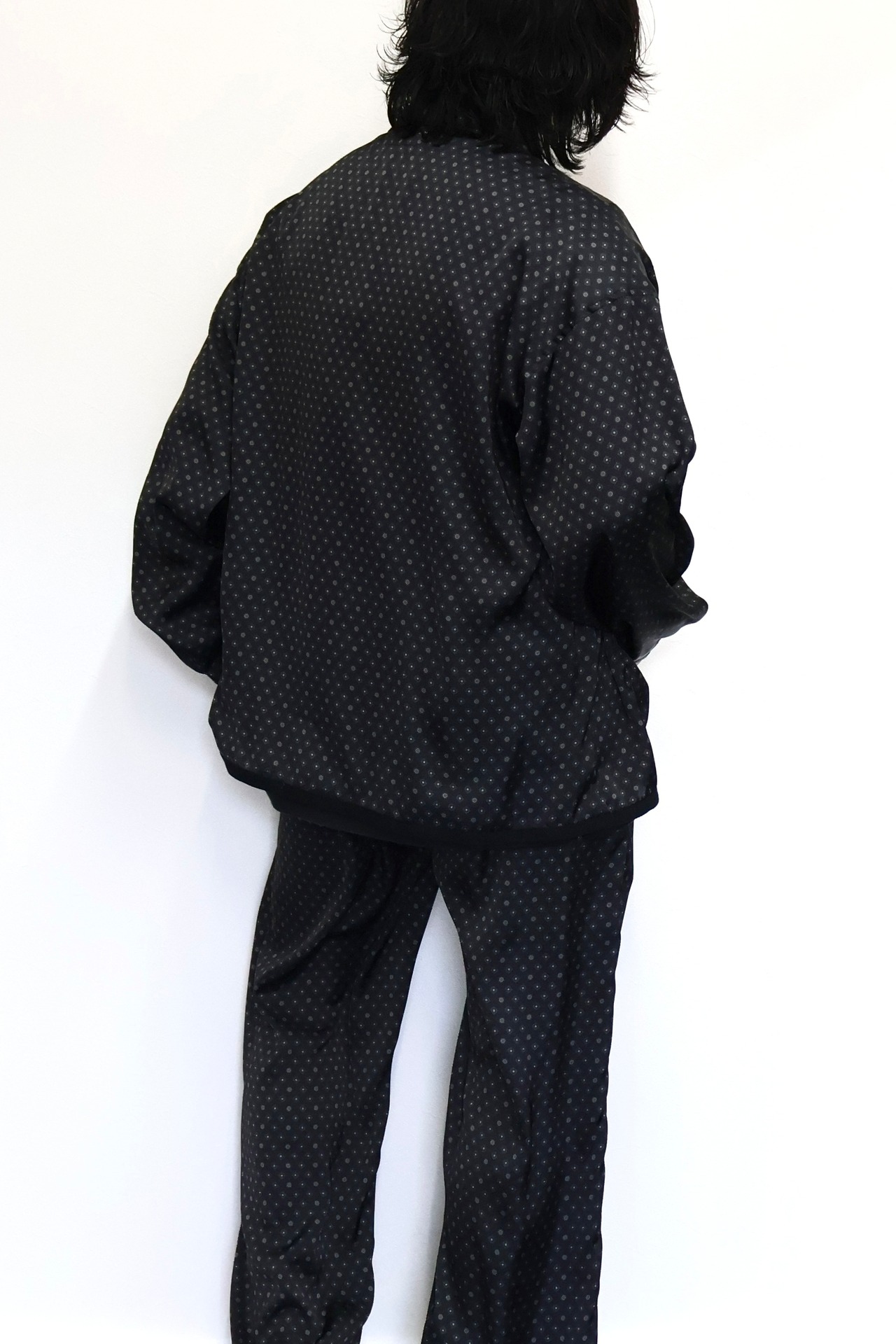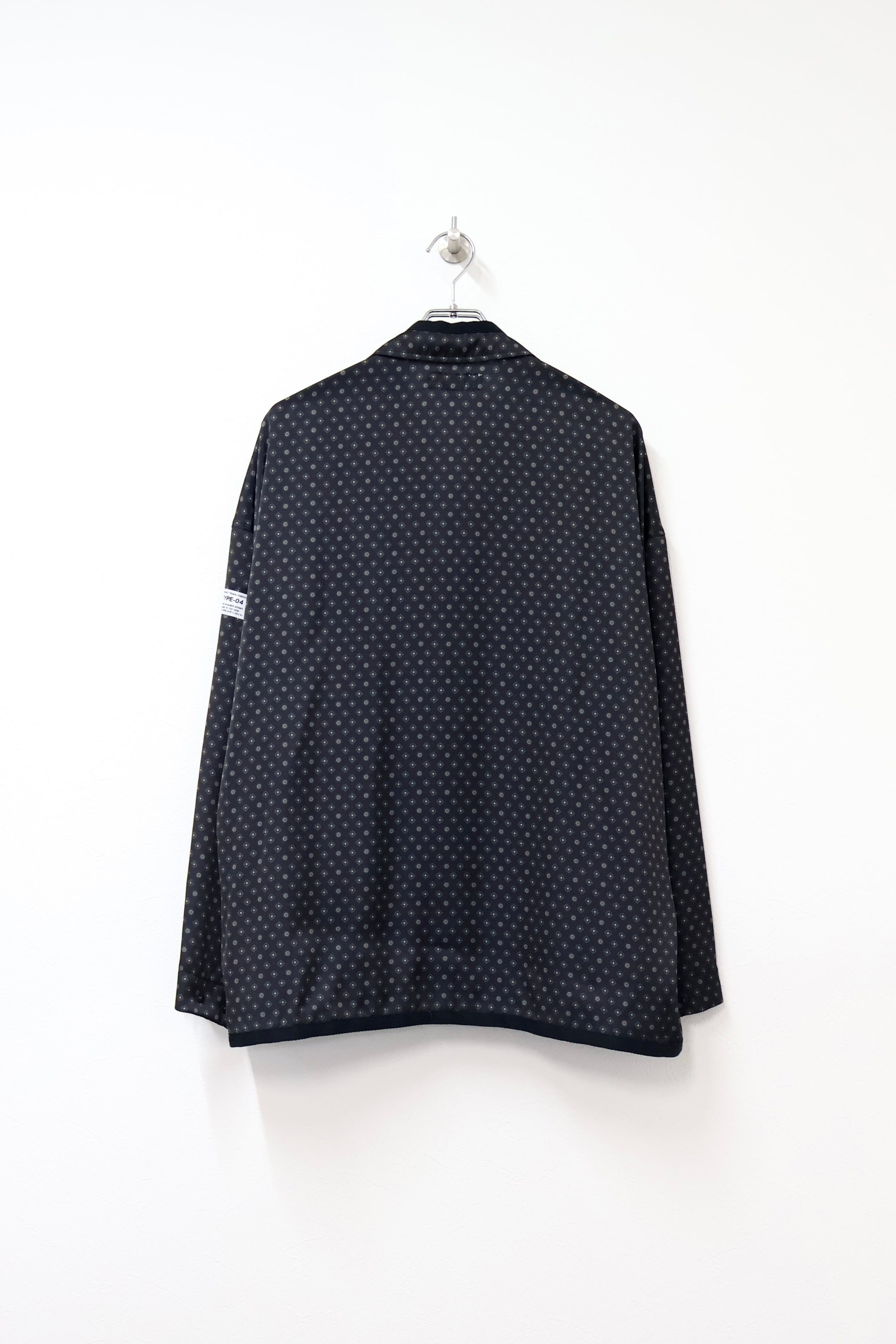 パジャマシャツとキルティングライナーをドッキングしたアイテム。素材には非常に柔らかくドレープ感のあるサテン地に昇華転写プリントを施したオリジナルファブリックを使用。縫製後に襟を折りたたみ、プレス加工を施したのちパイピング縫製を実施。袖口にはスナップボタンを配置しサイズ調整が可能。