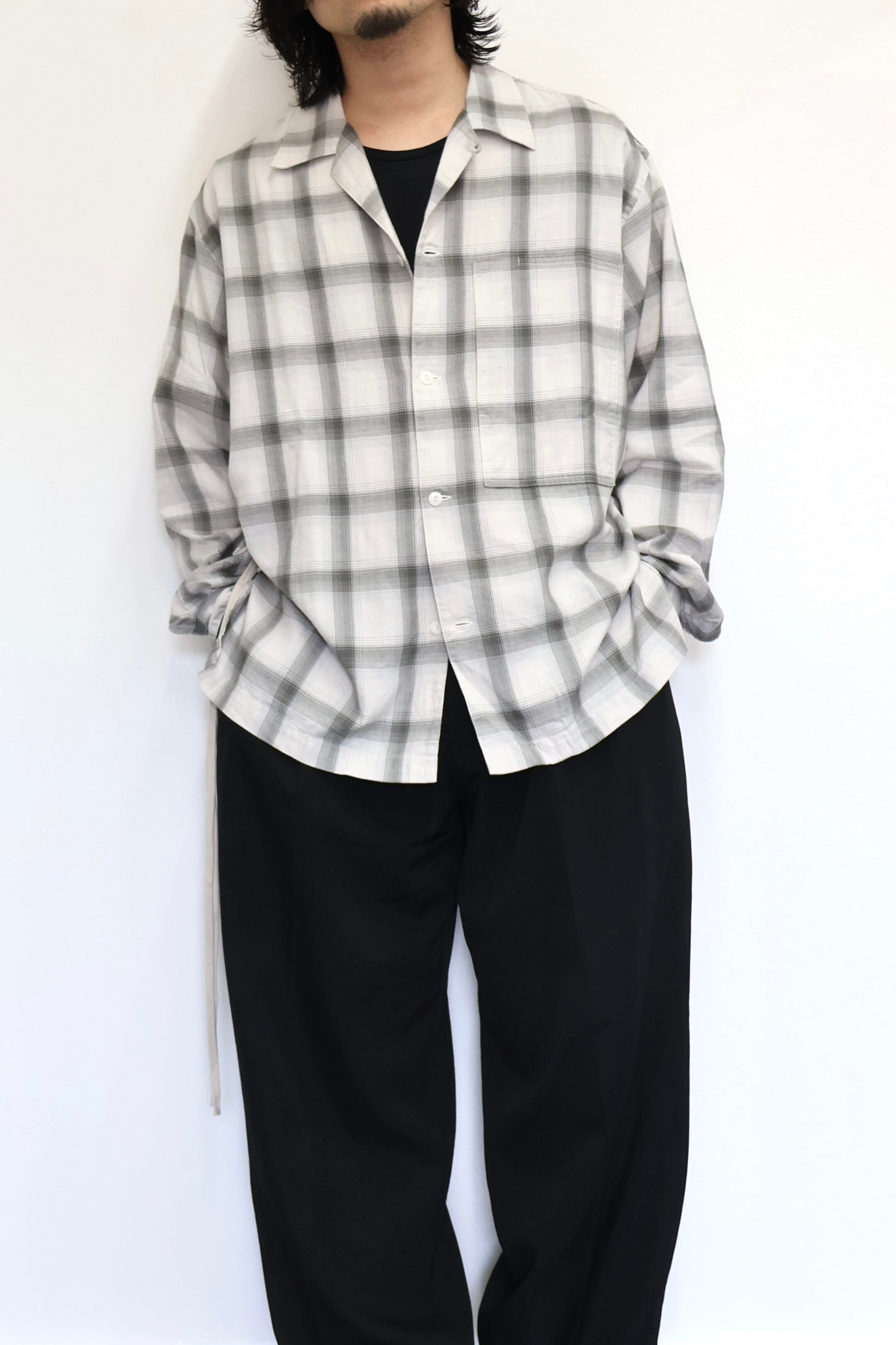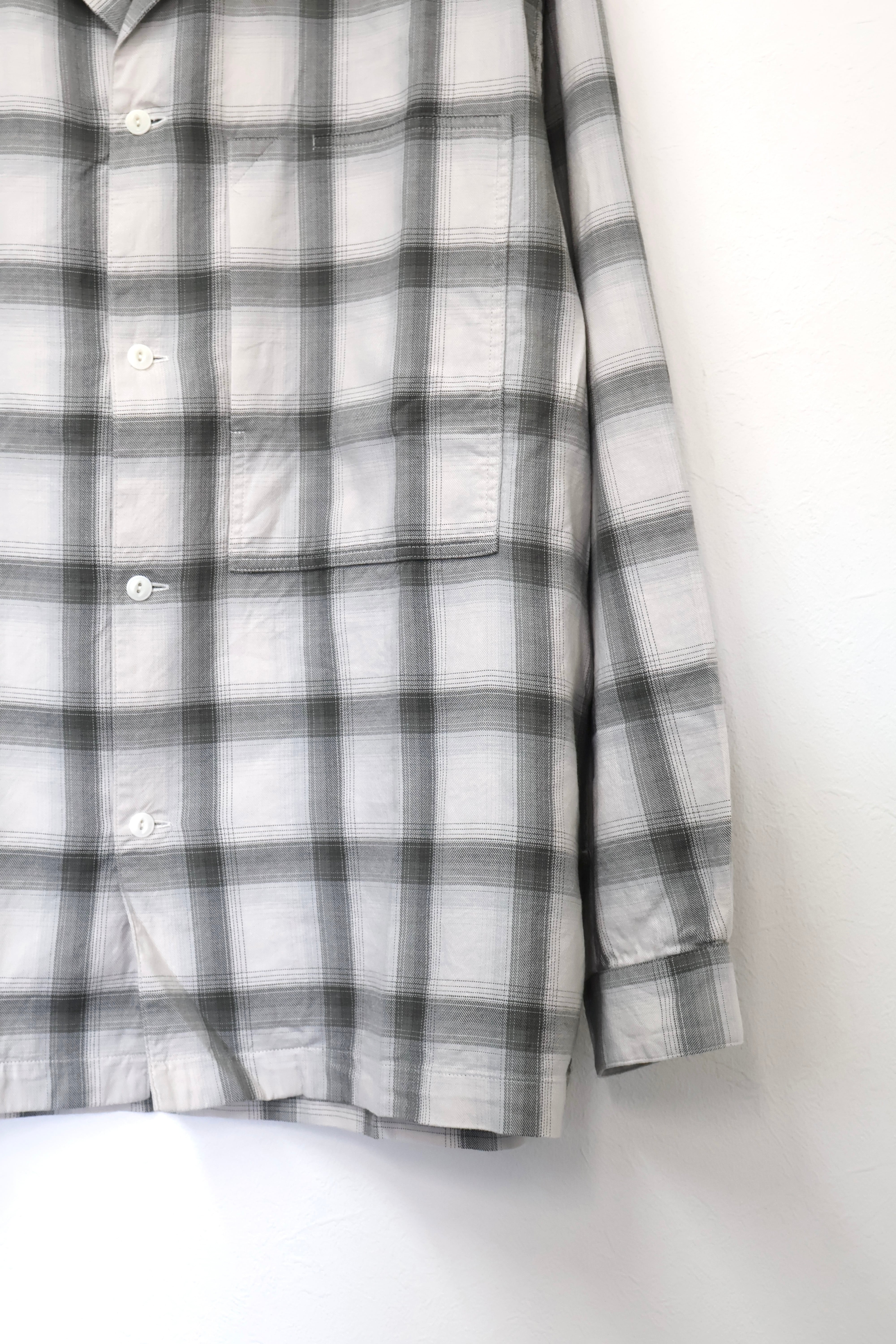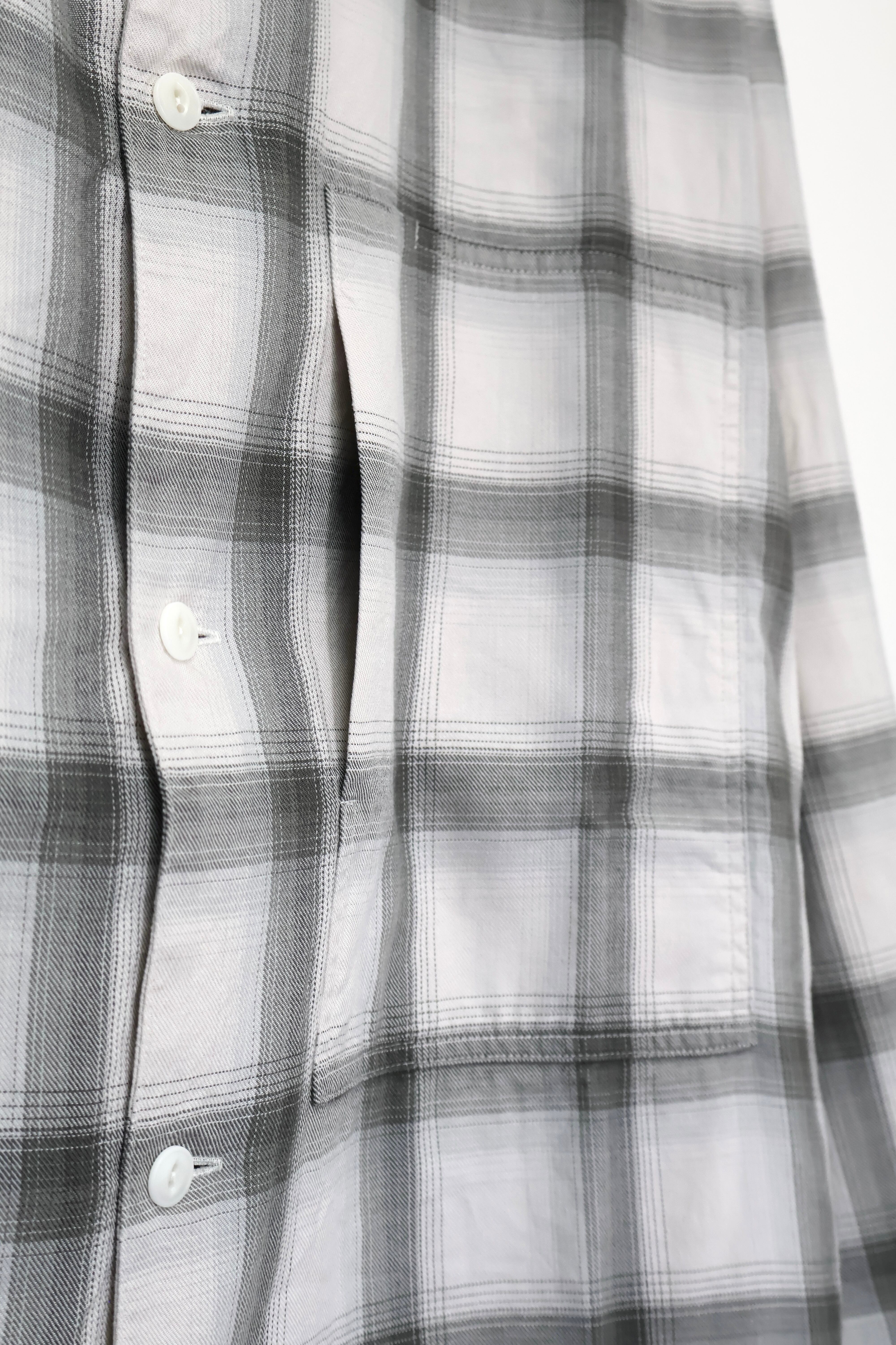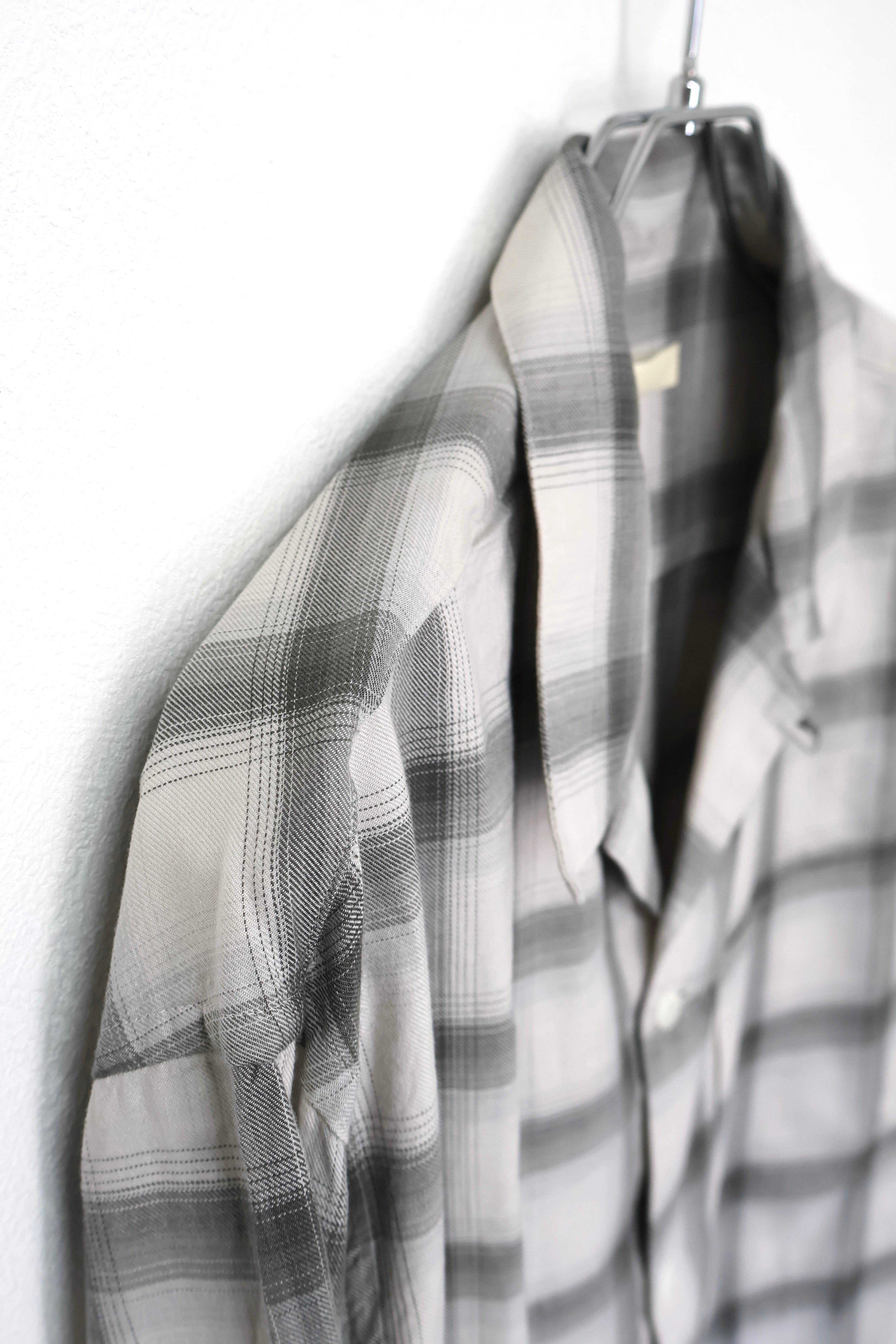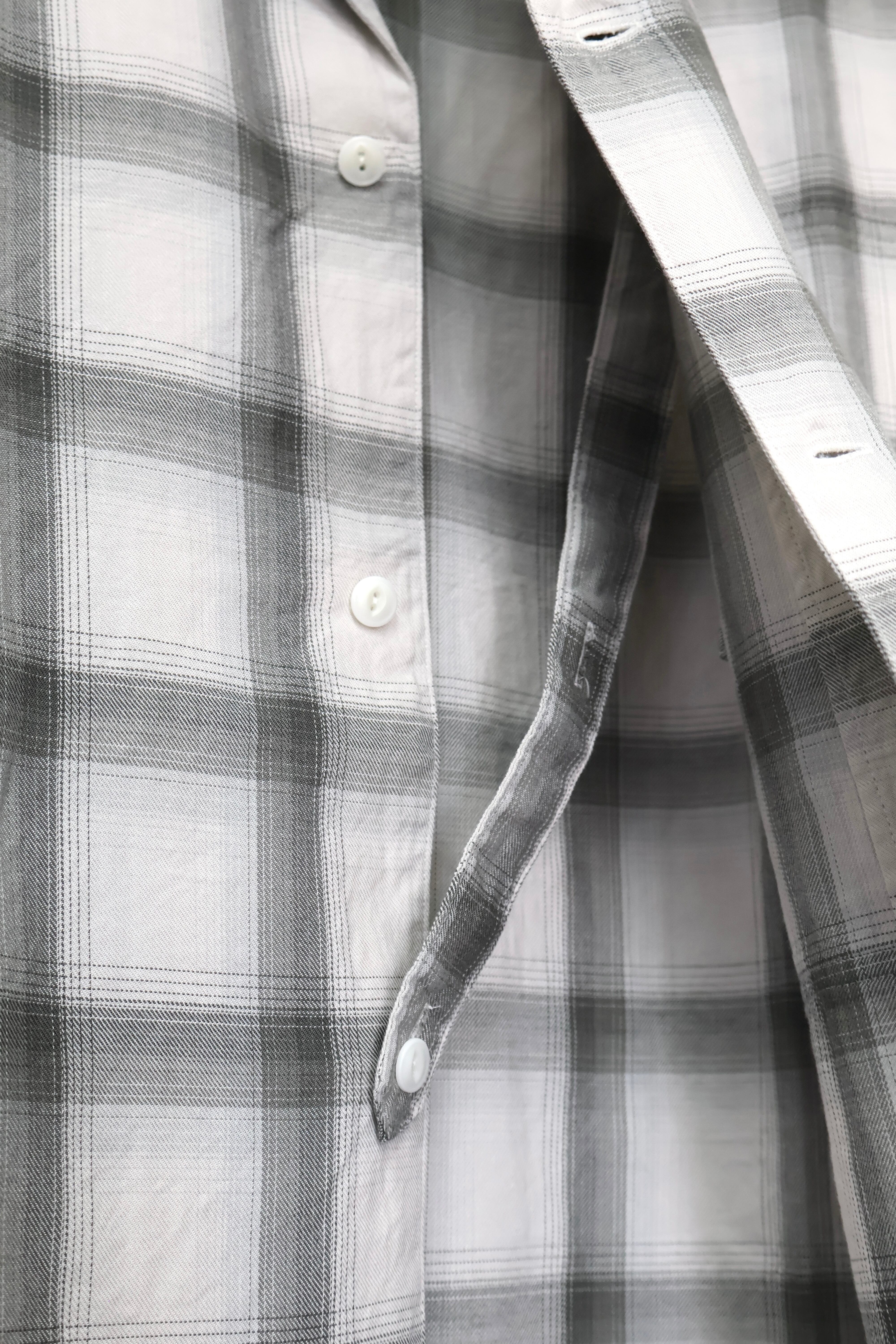 新型オープンカラーシャツ。コットンレーヨン素材のオンブレーチェック、アイボリーをベースにグレーを組み合わせたアイテム。しっとりとした肌触りとオチ感が魅力。播州産地にて生産。