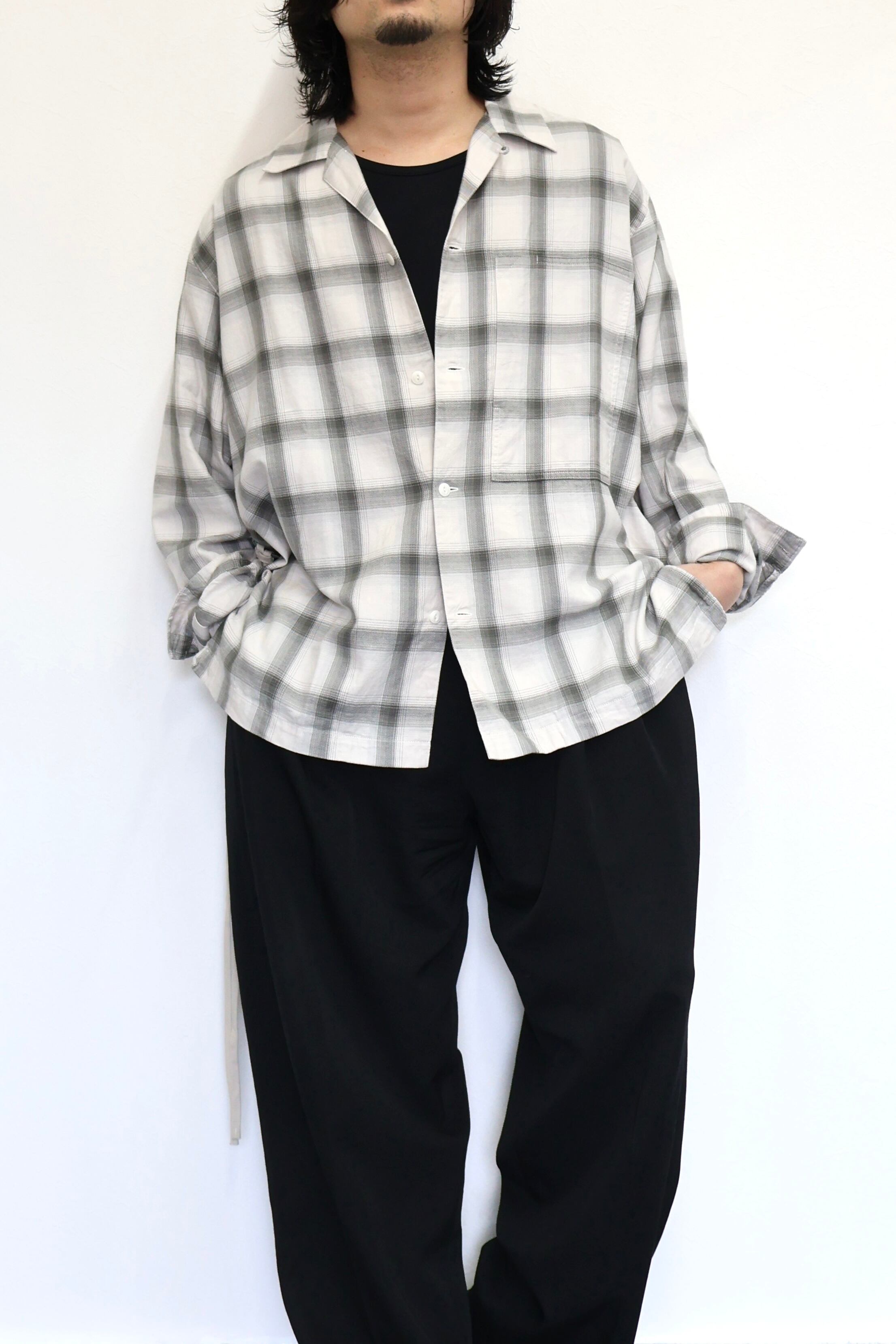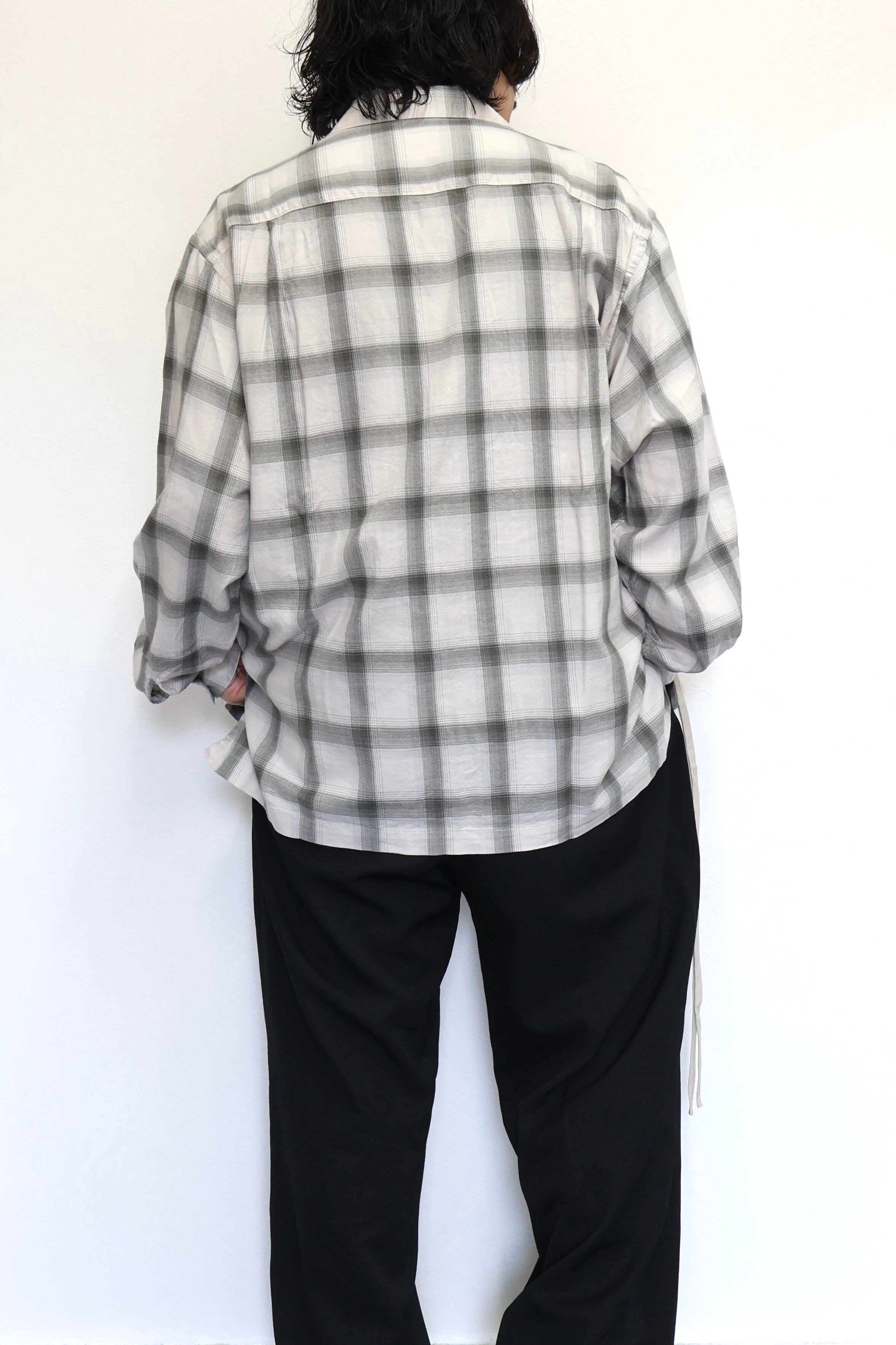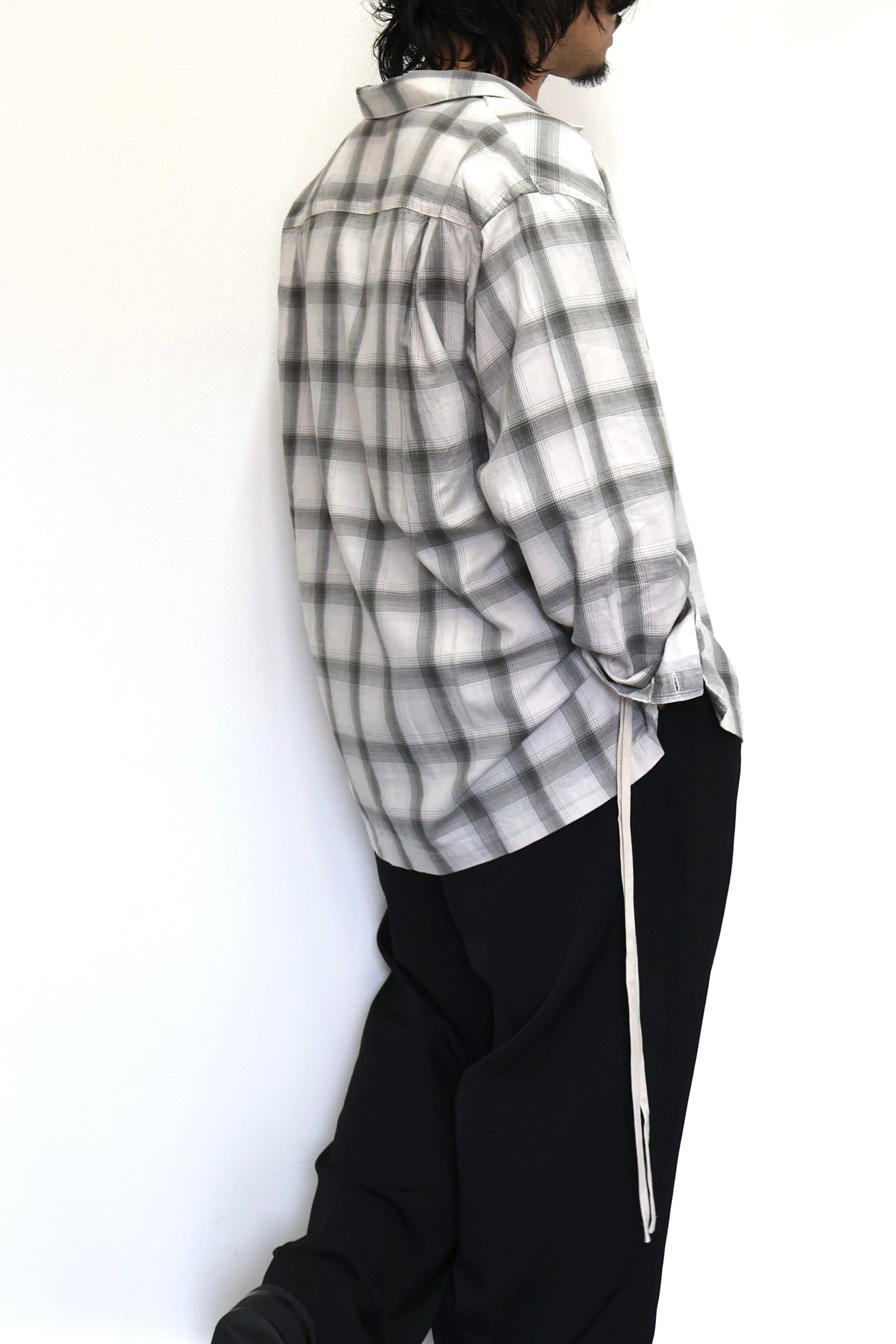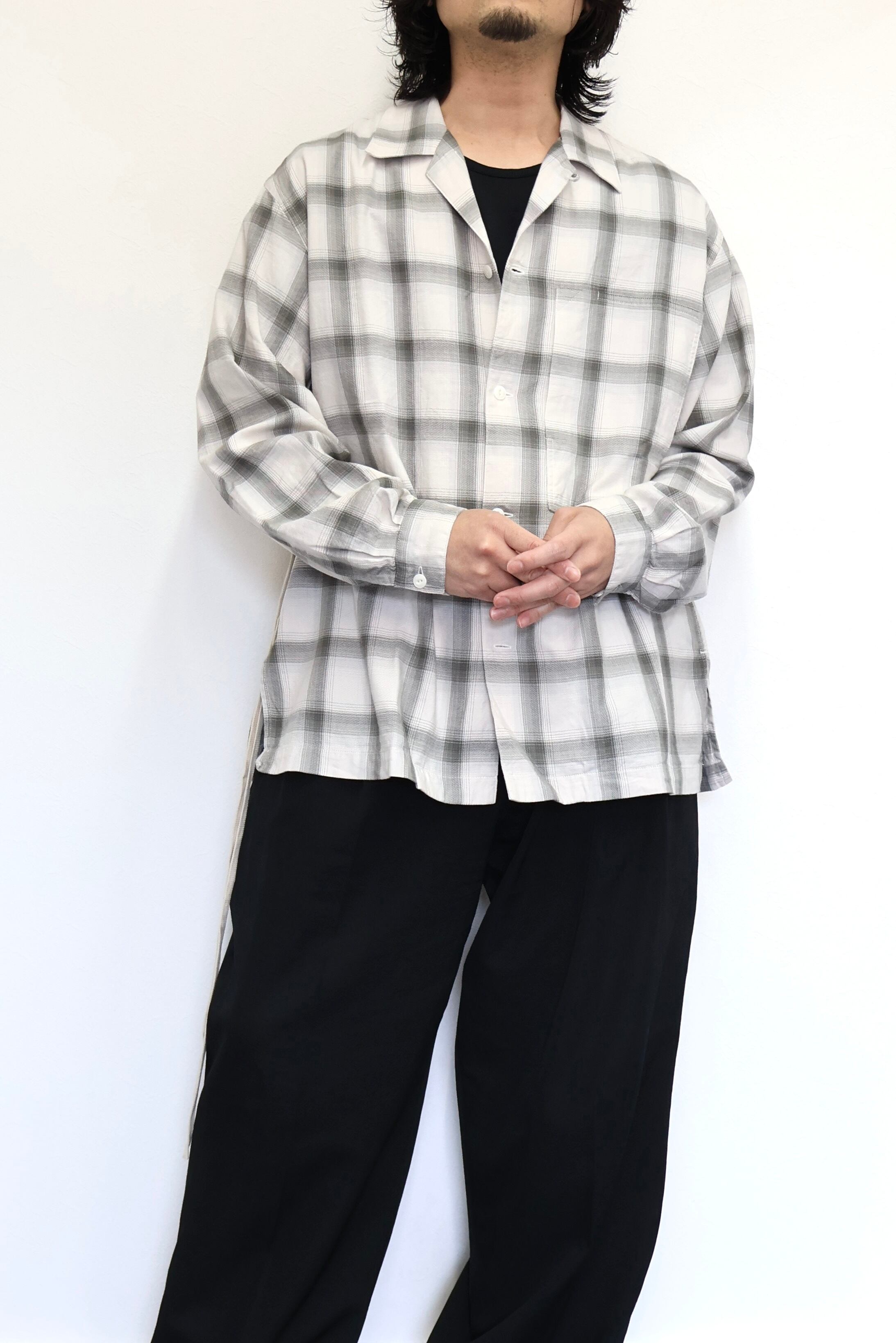 新型オープンカラーシャツ。コットンレーヨン素材のオンブレーチェック、アイボリーをベースにグレーを組み合わせたアイテム。しっとりとした肌触りとオチ感が魅力。播州産地にて生産。