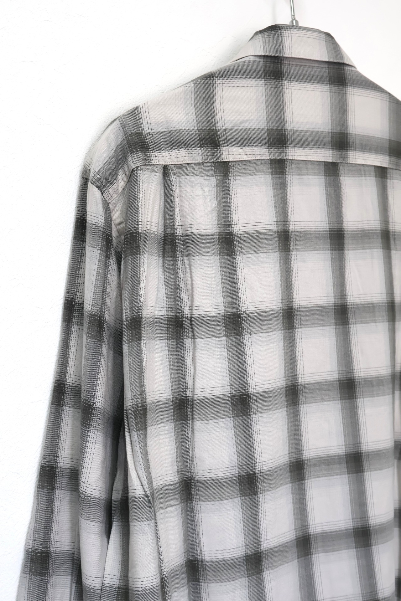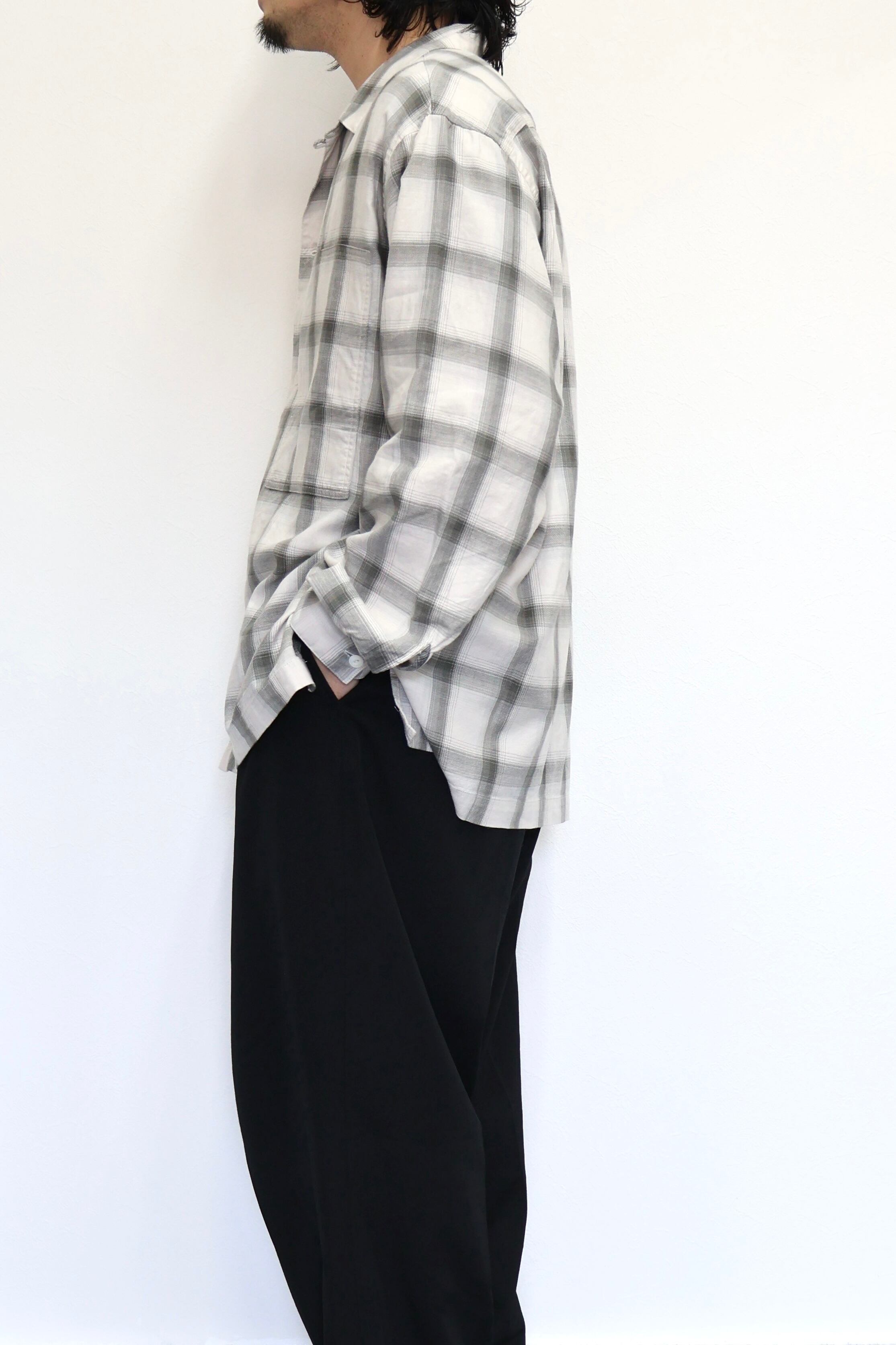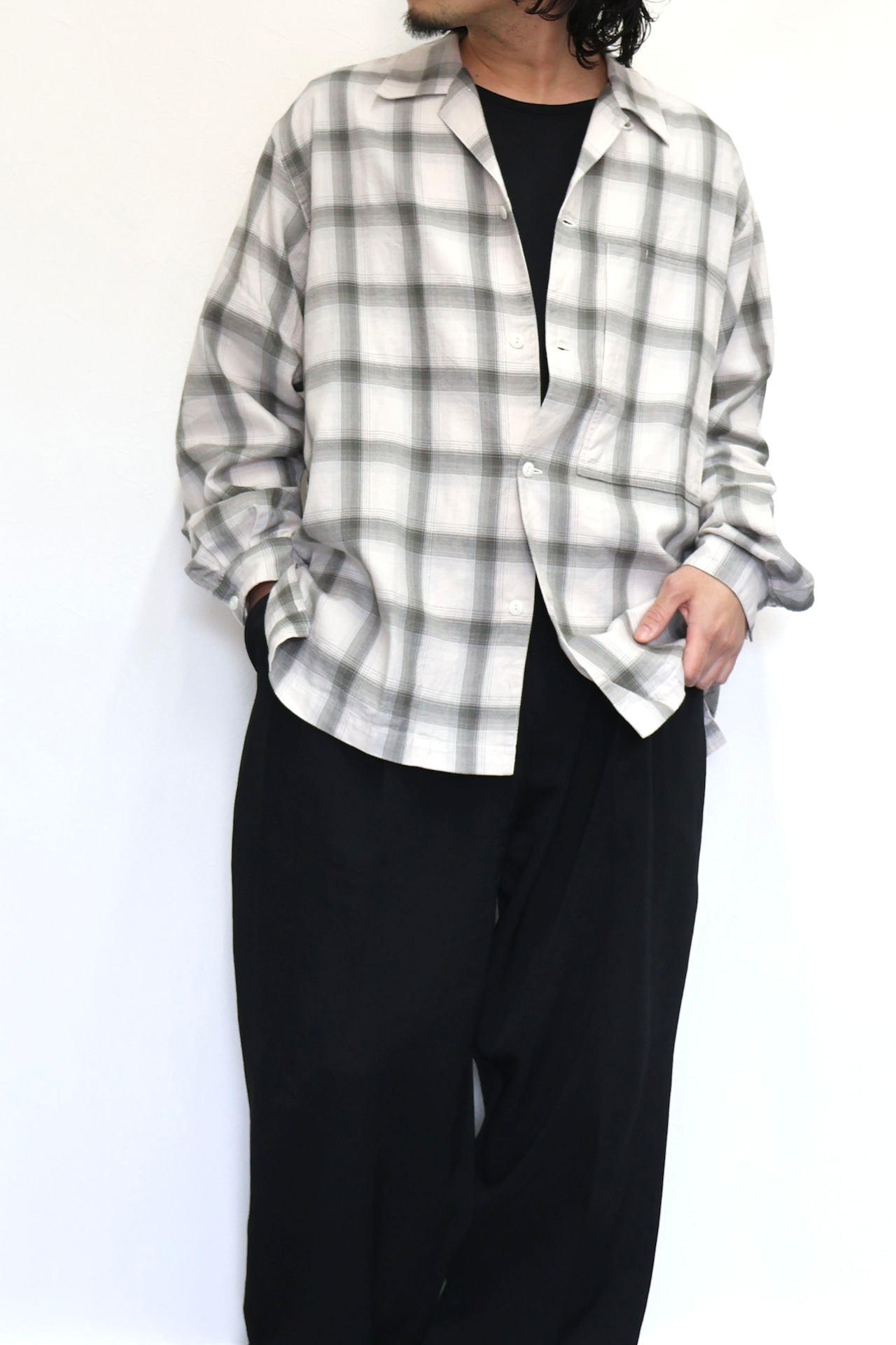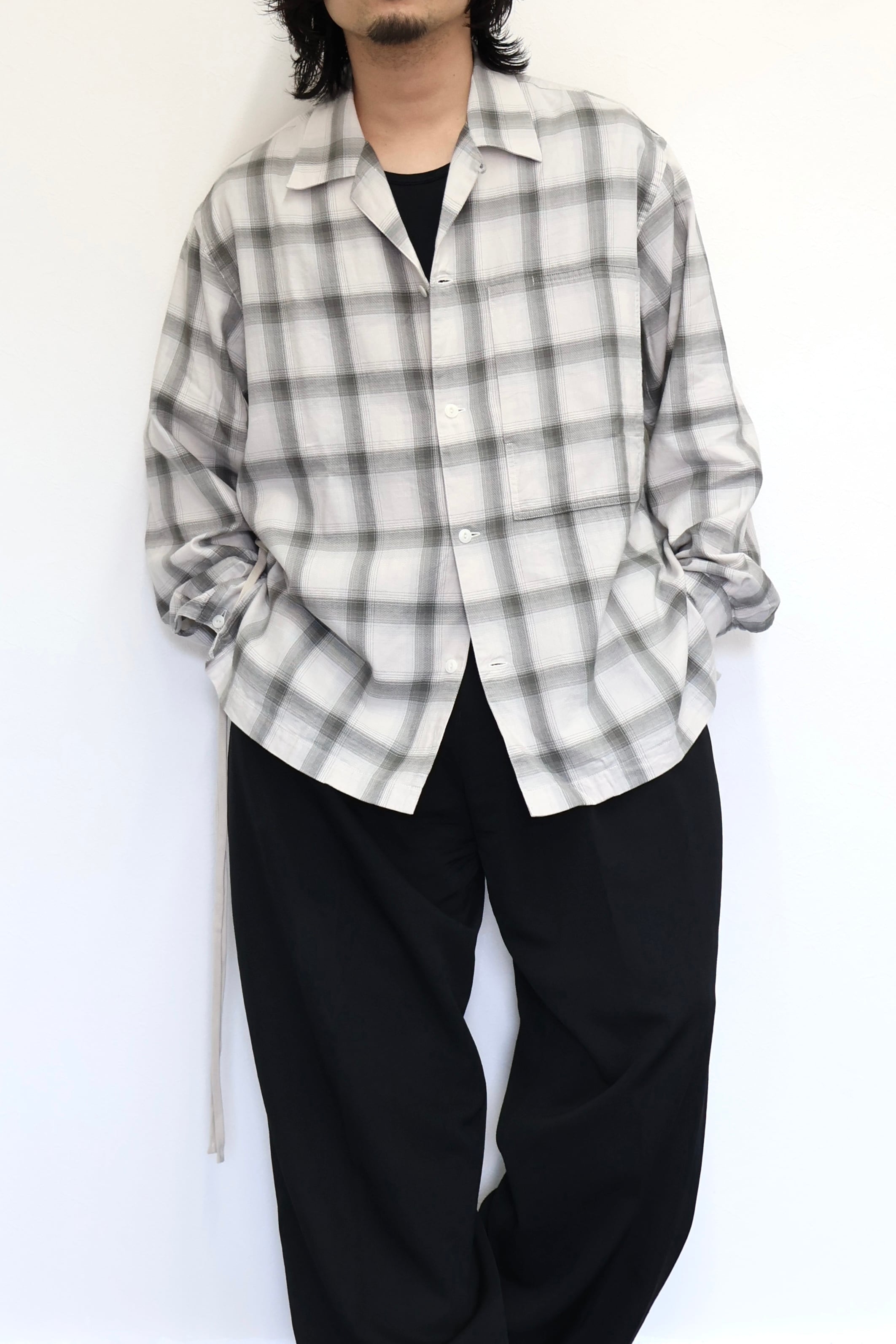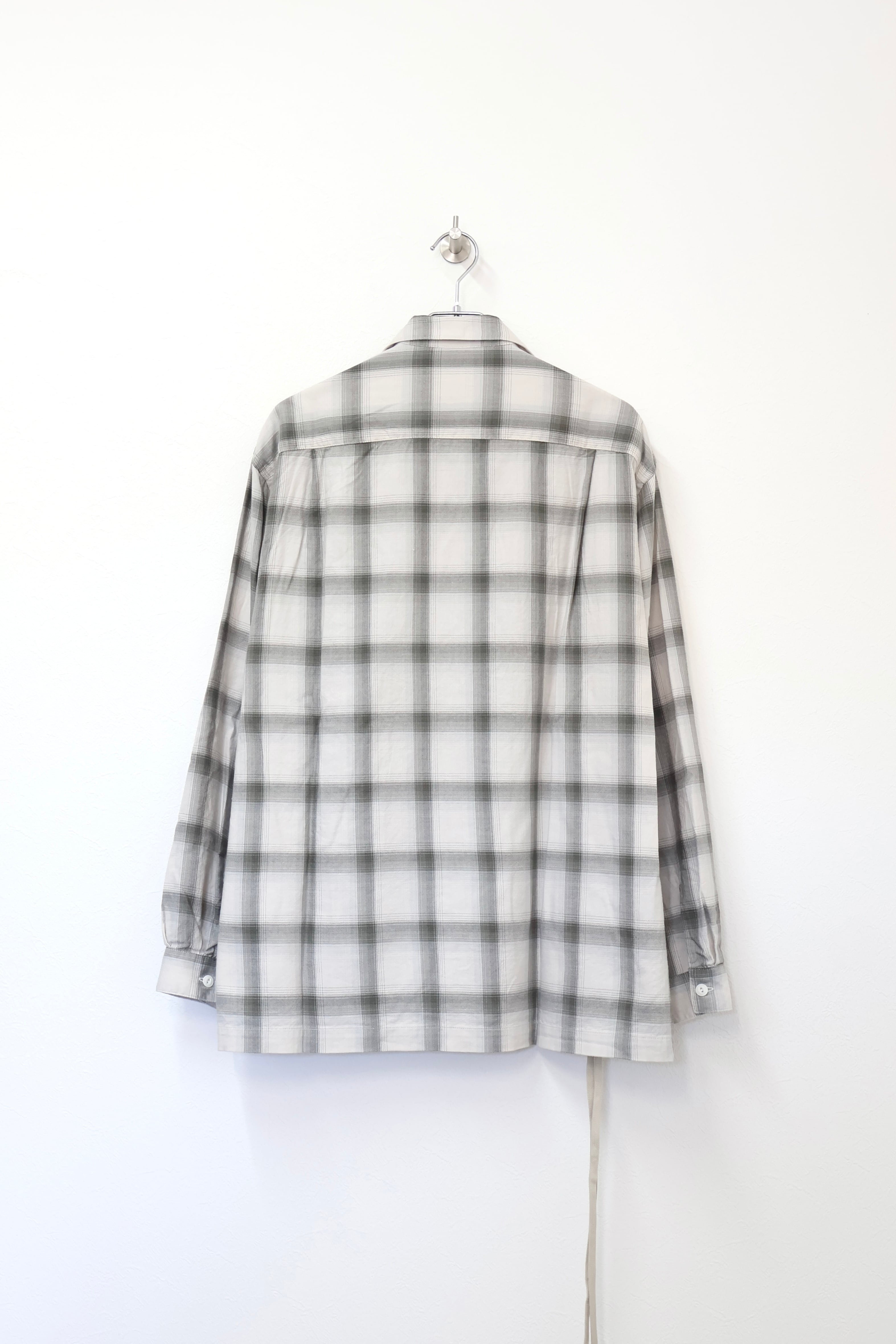 新型オープンカラーシャツ。コットンレーヨン素材のオンブレーチェック、アイボリーをベースにグレーを組み合わせたアイテム。しっとりとした肌触りとオチ感が魅力。播州産地にて生産。