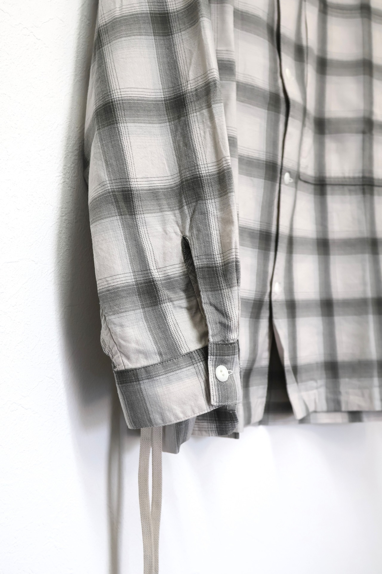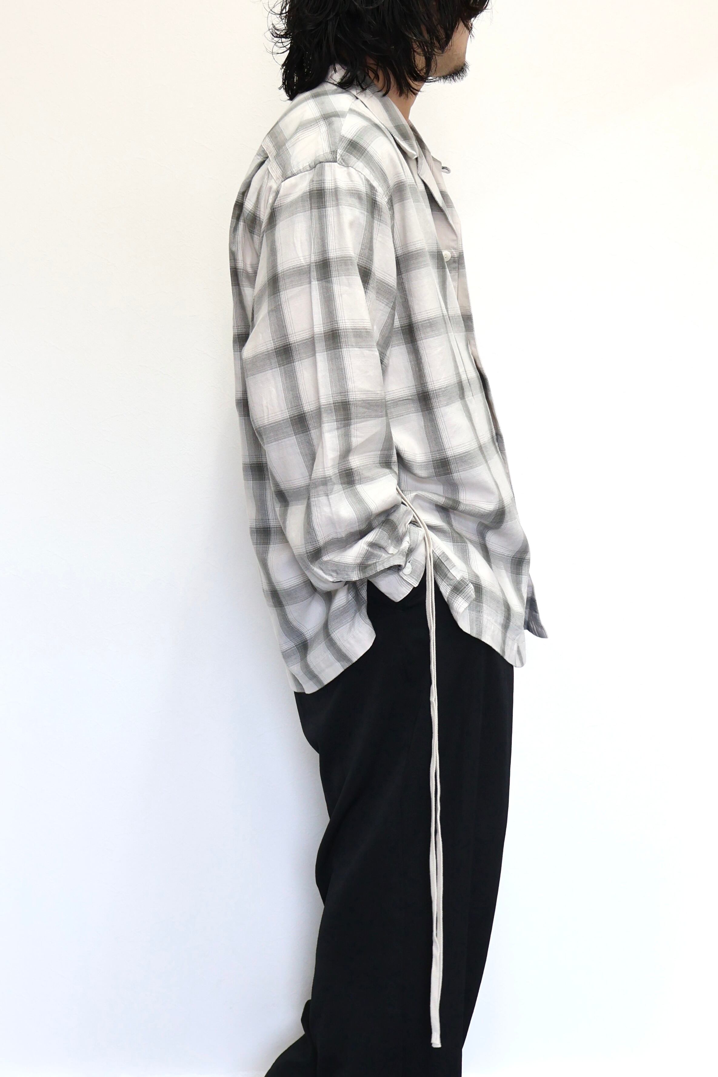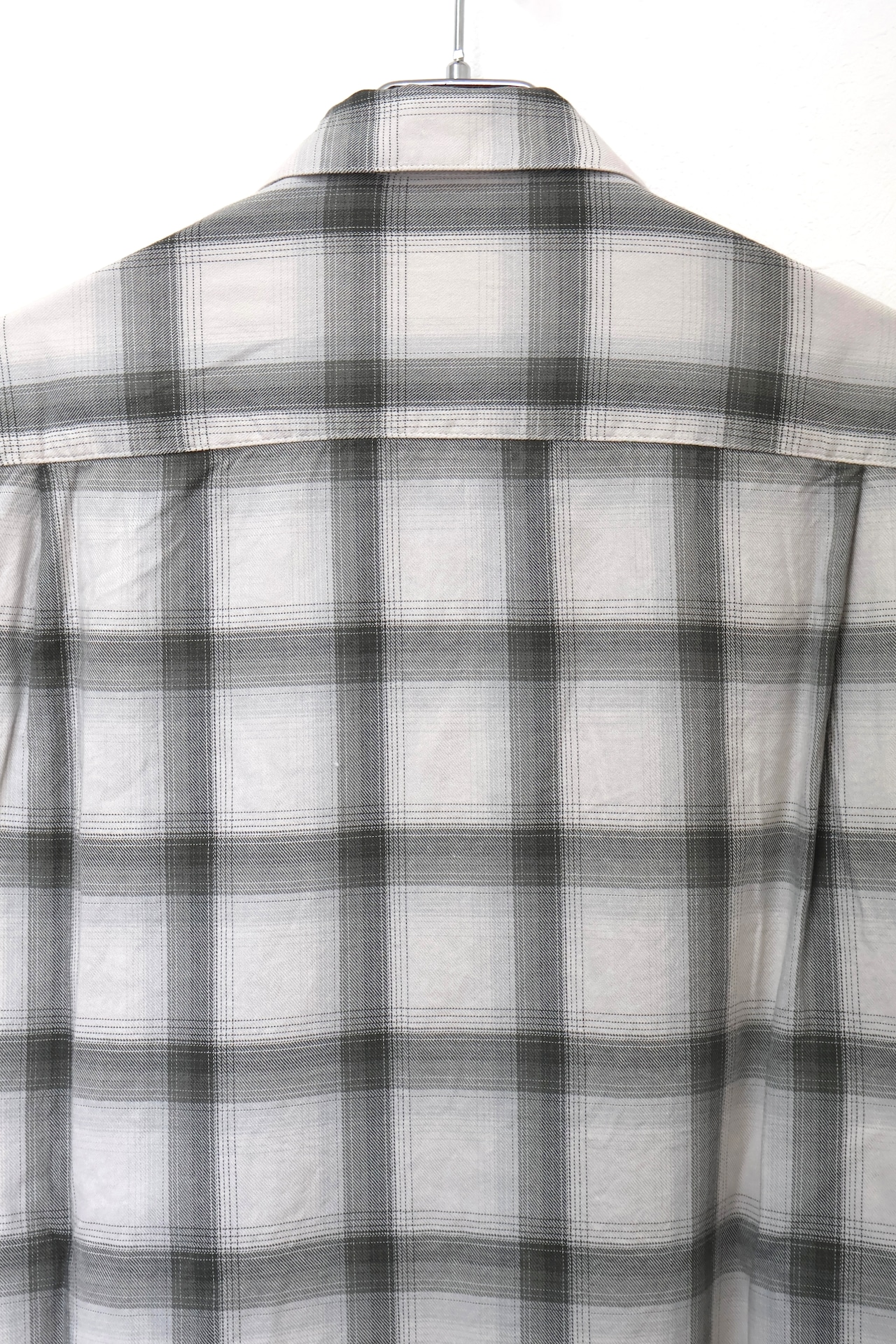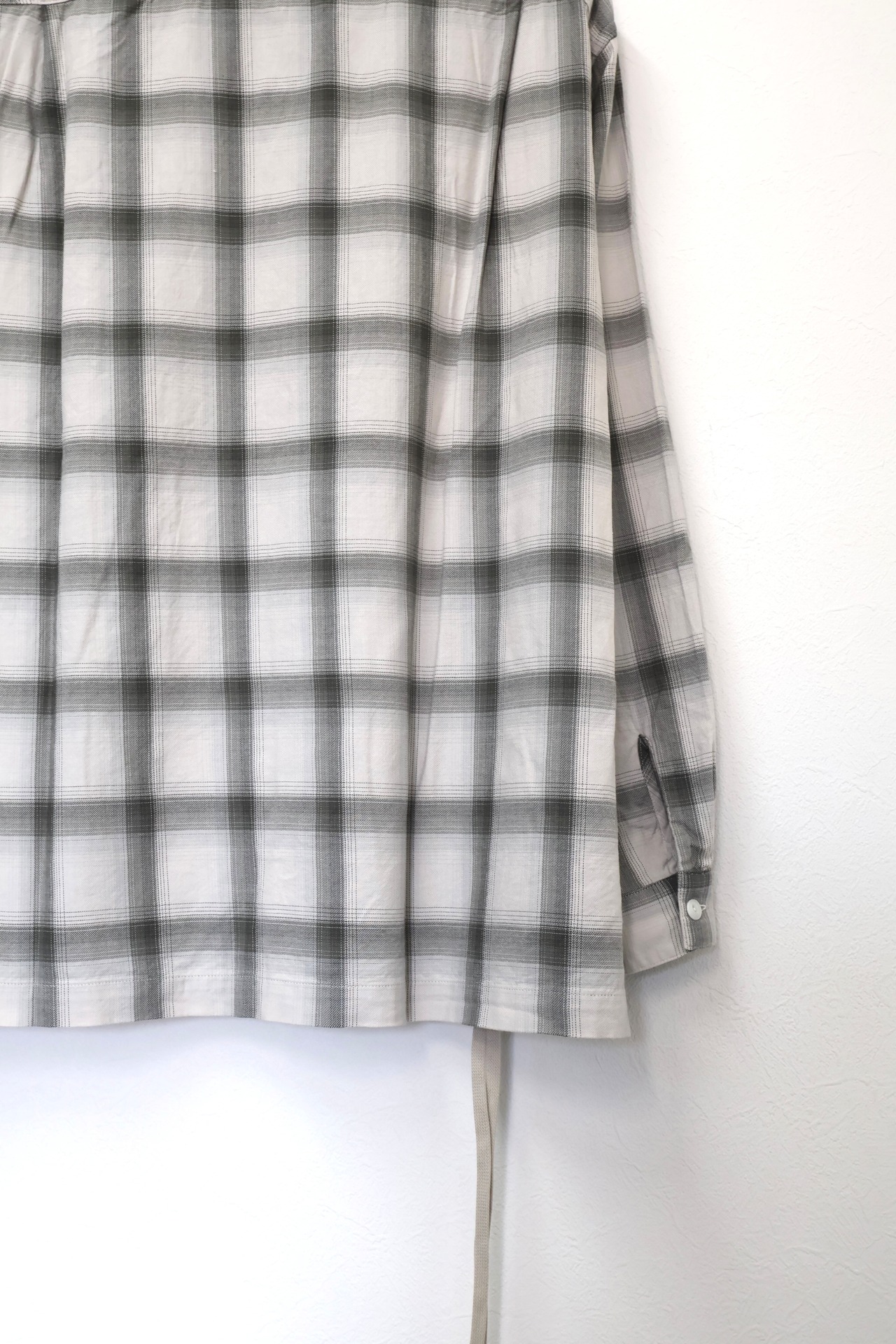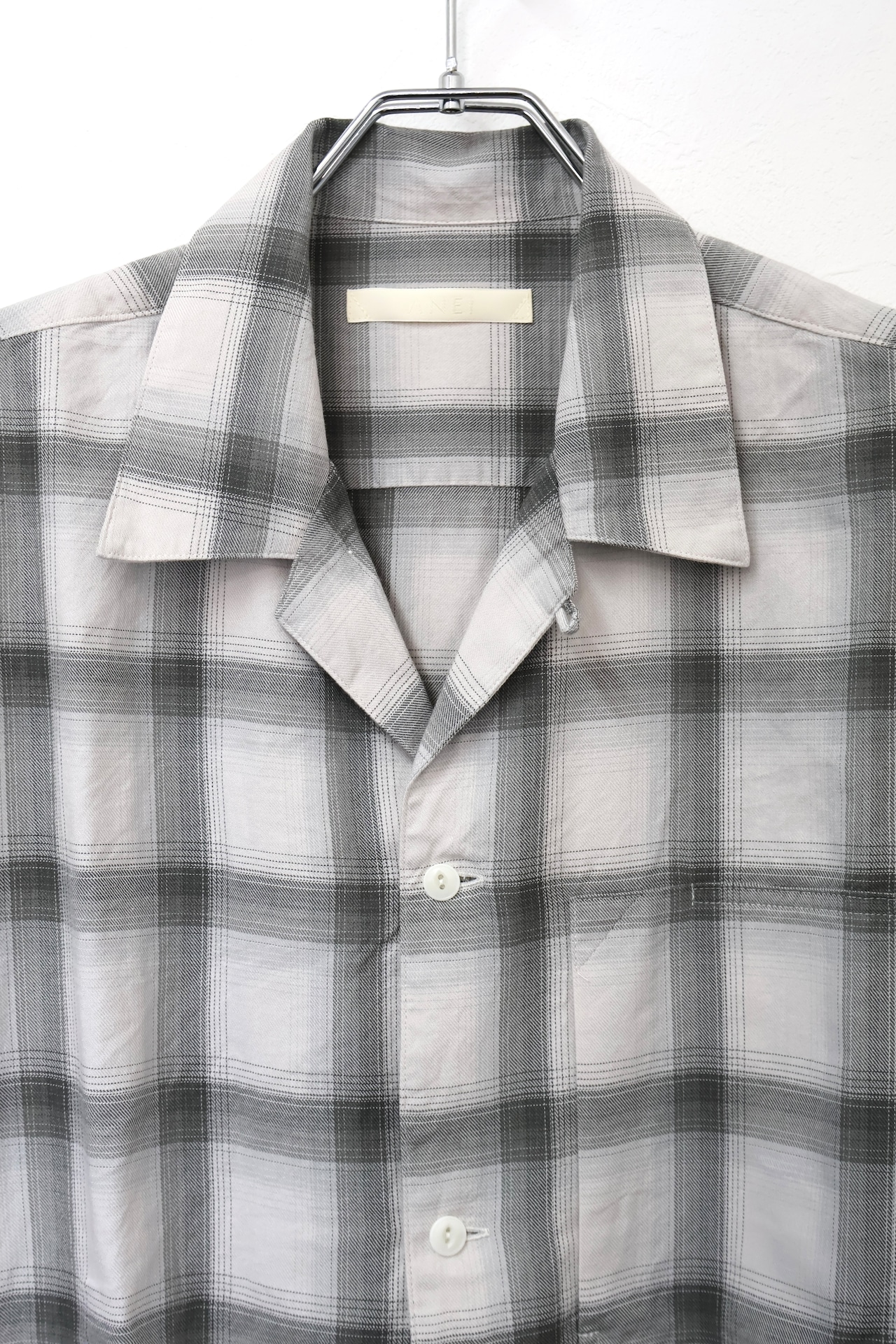 新型オープンカラーシャツ。コットンレーヨン素材のオンブレーチェック、アイボリーをベースにグレーを組み合わせたアイテム。しっとりとした肌触りとオチ感が魅力。播州産地にて生産。