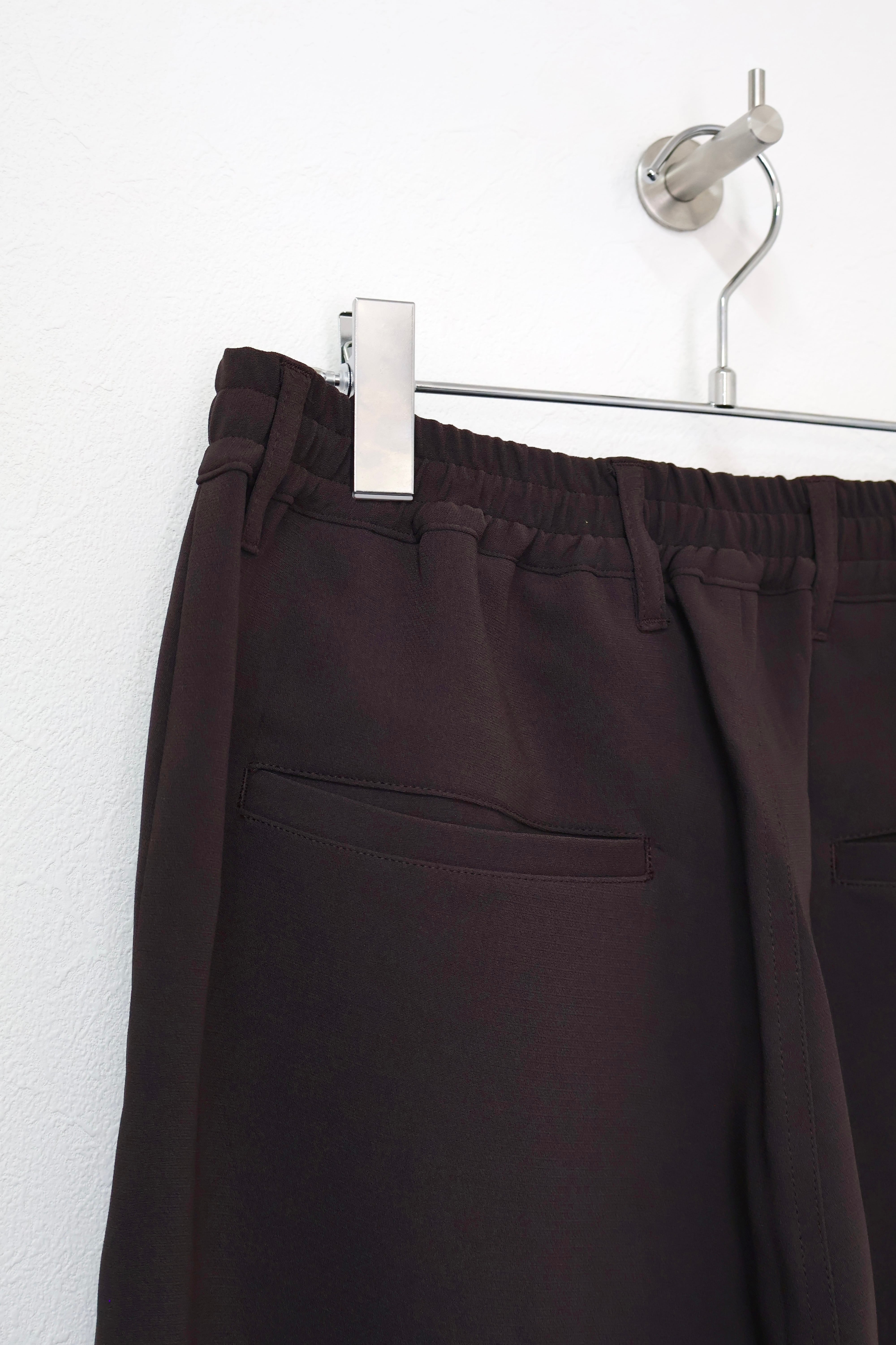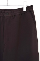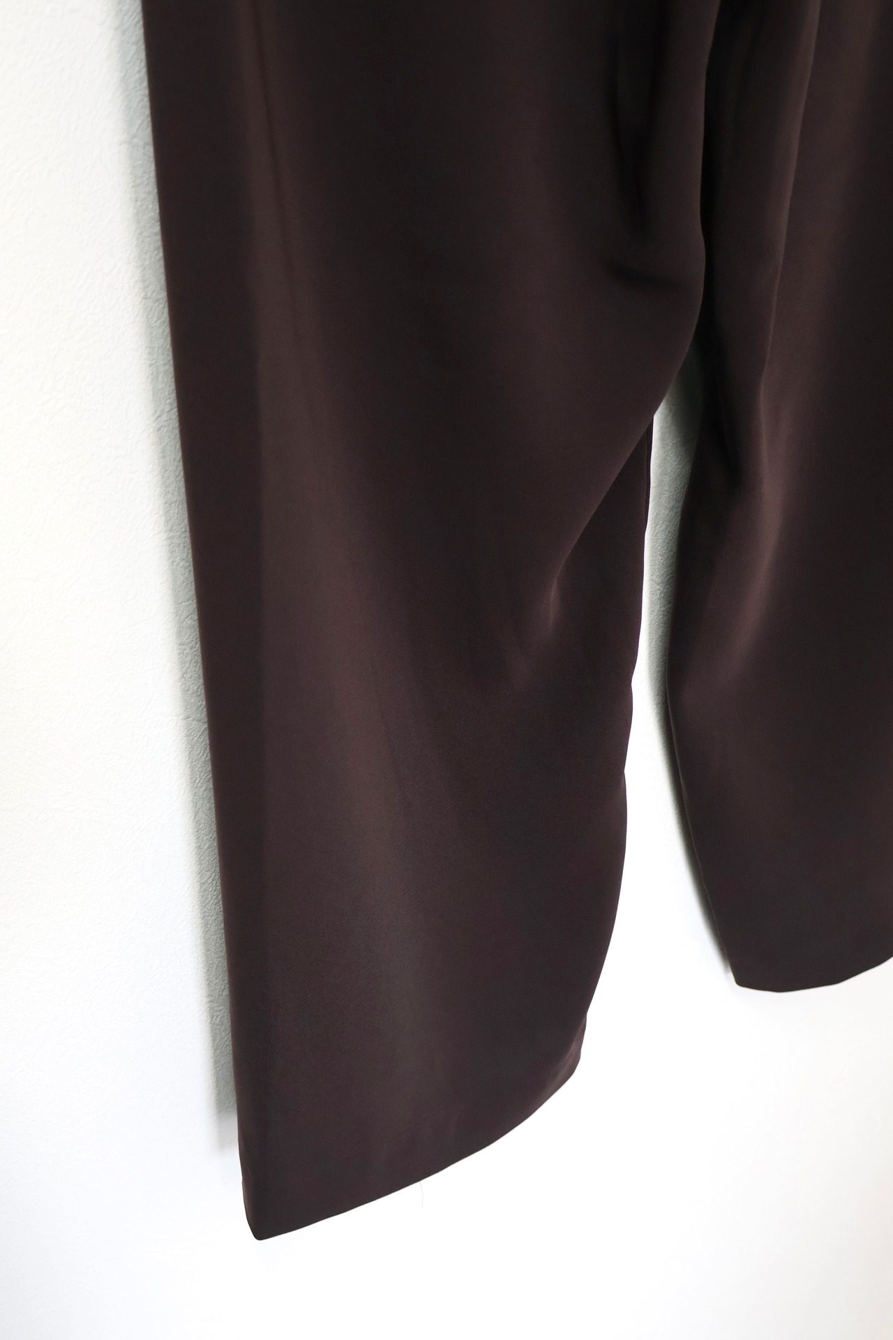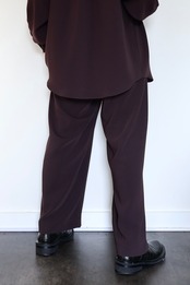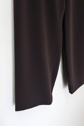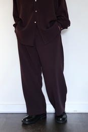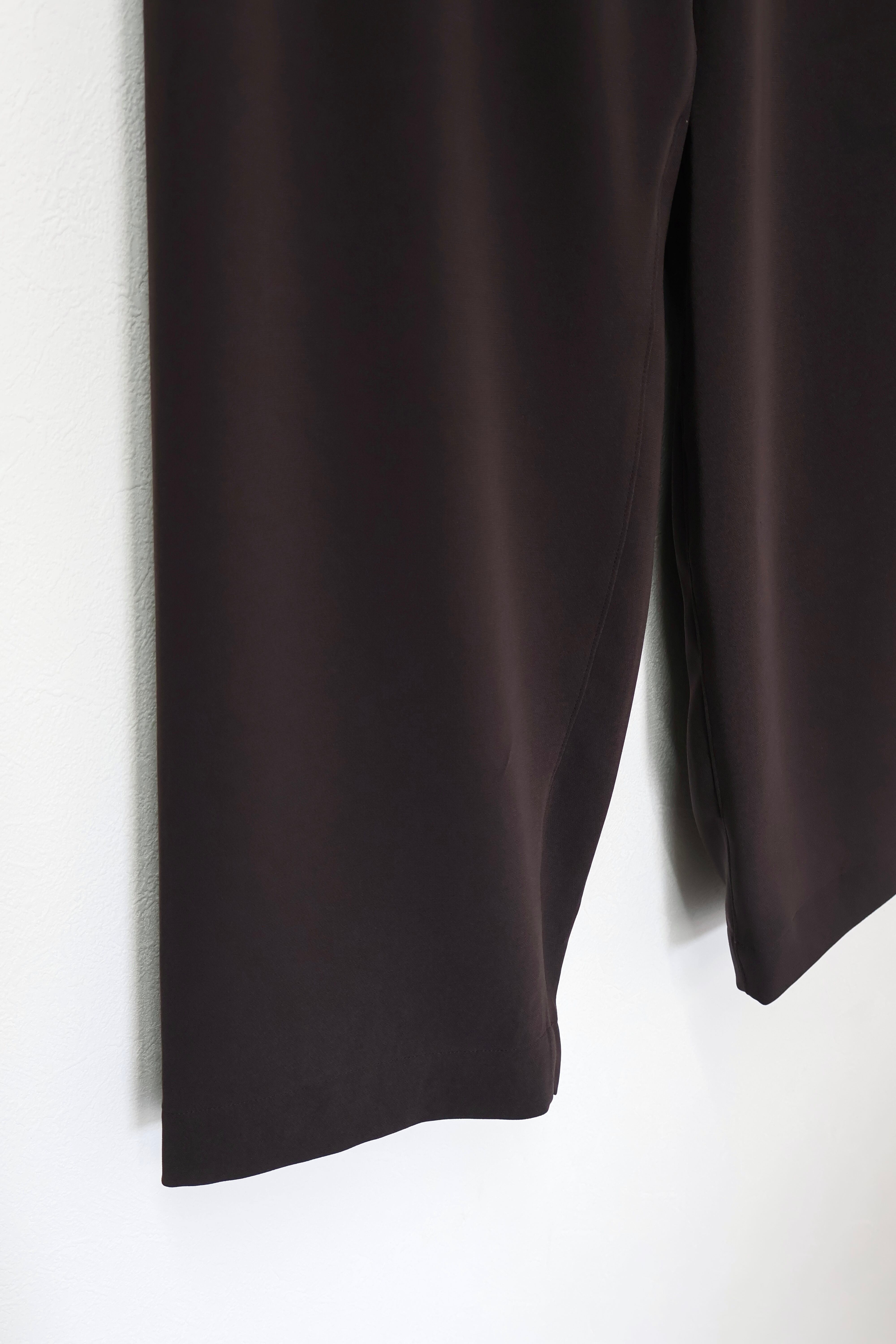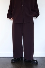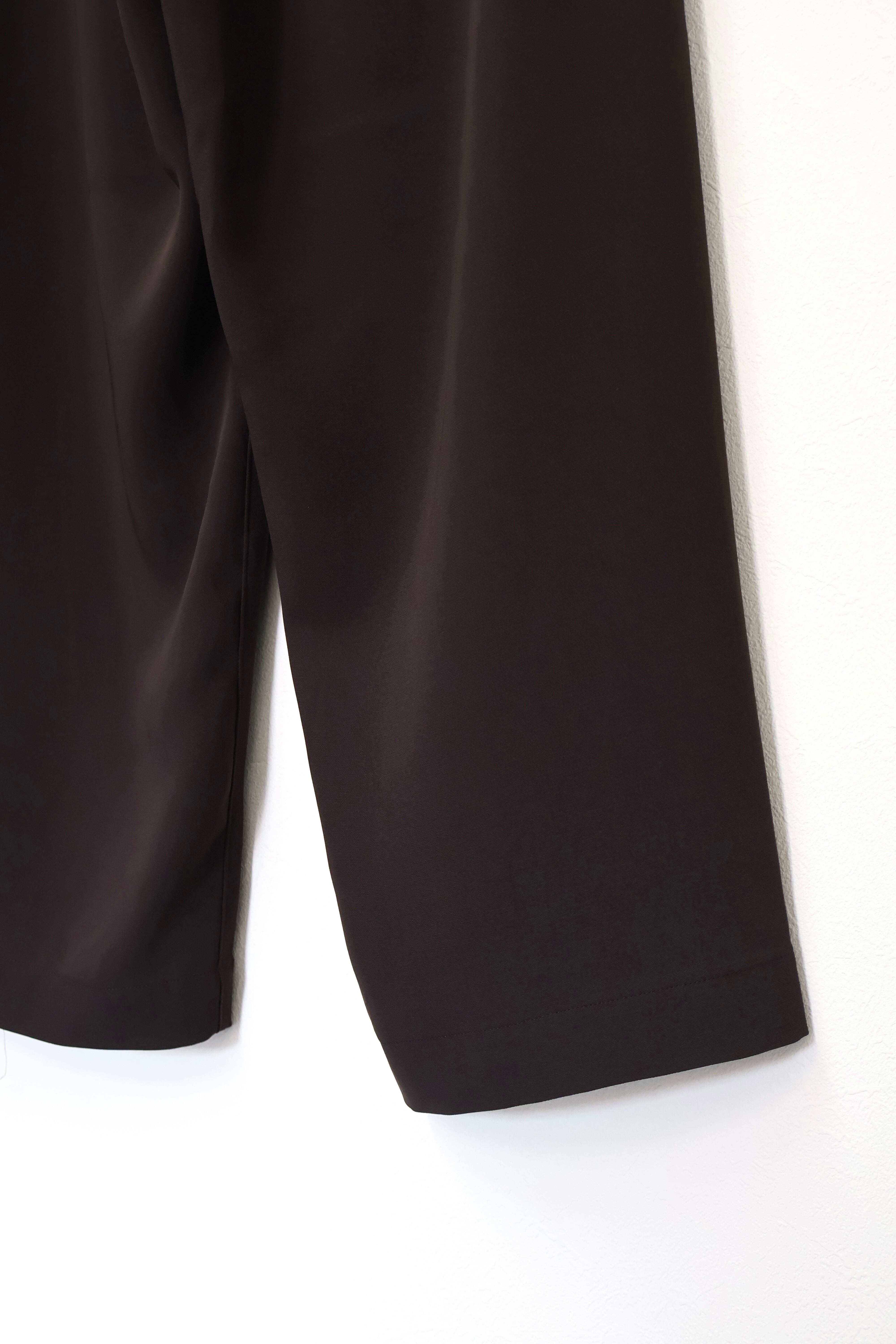 上質なトリアセテート素材を使用したイージースラックス。フロントは腰回りをすっきりと見せるノータック仕様でフロント部以外はギャザー仕様になっている。柔らかく上品な肌触りとドレープ感が特徴。
