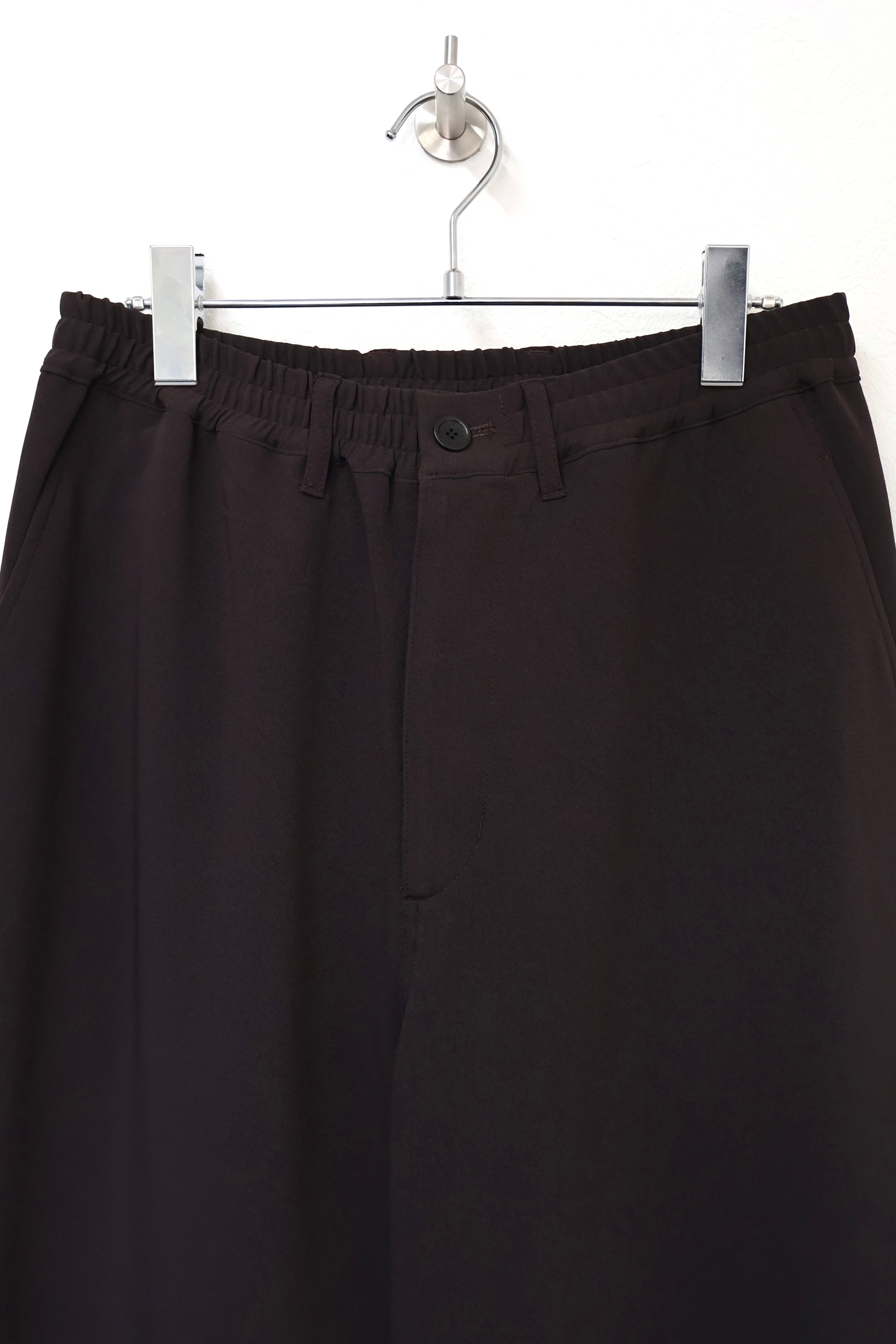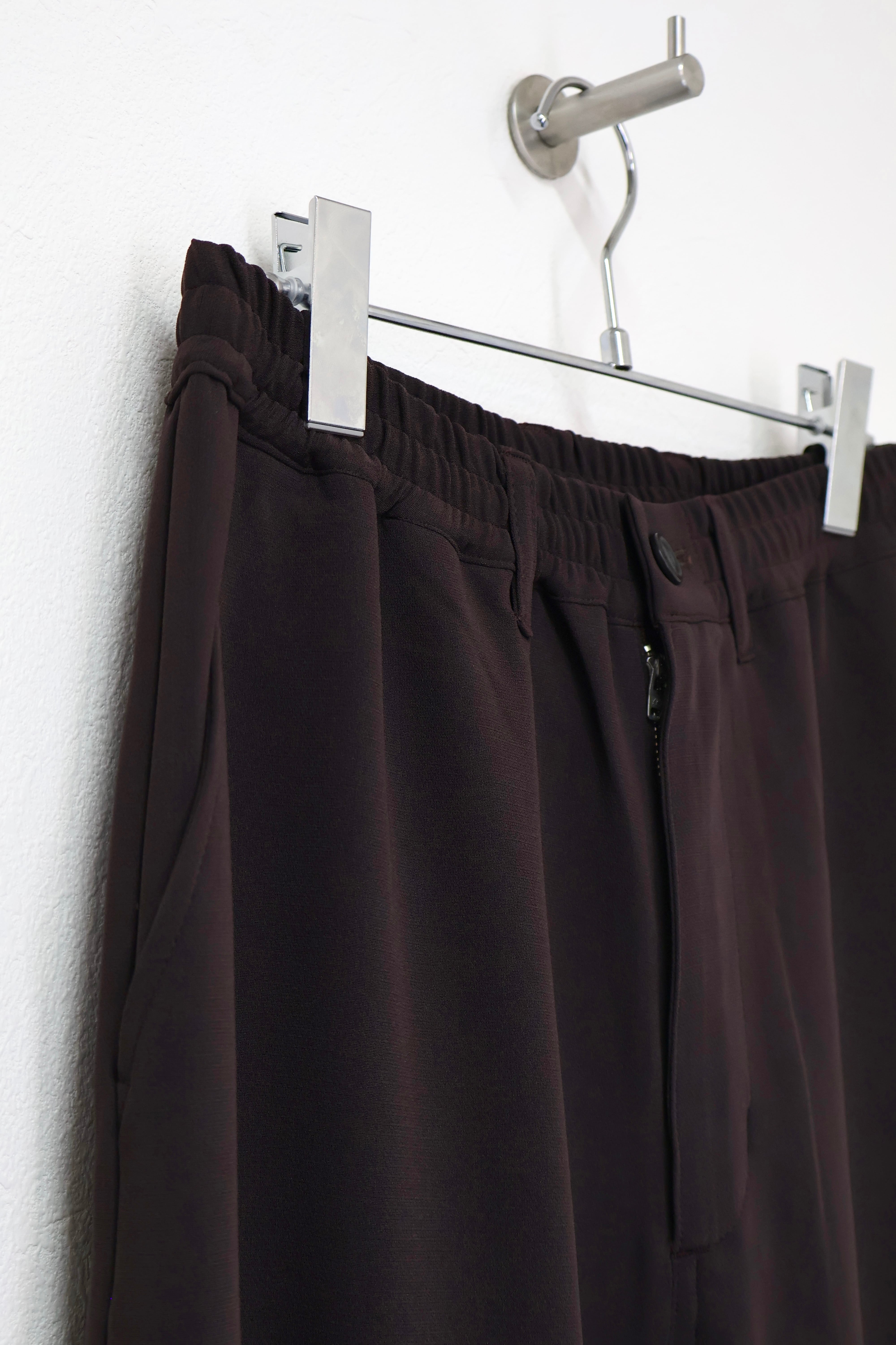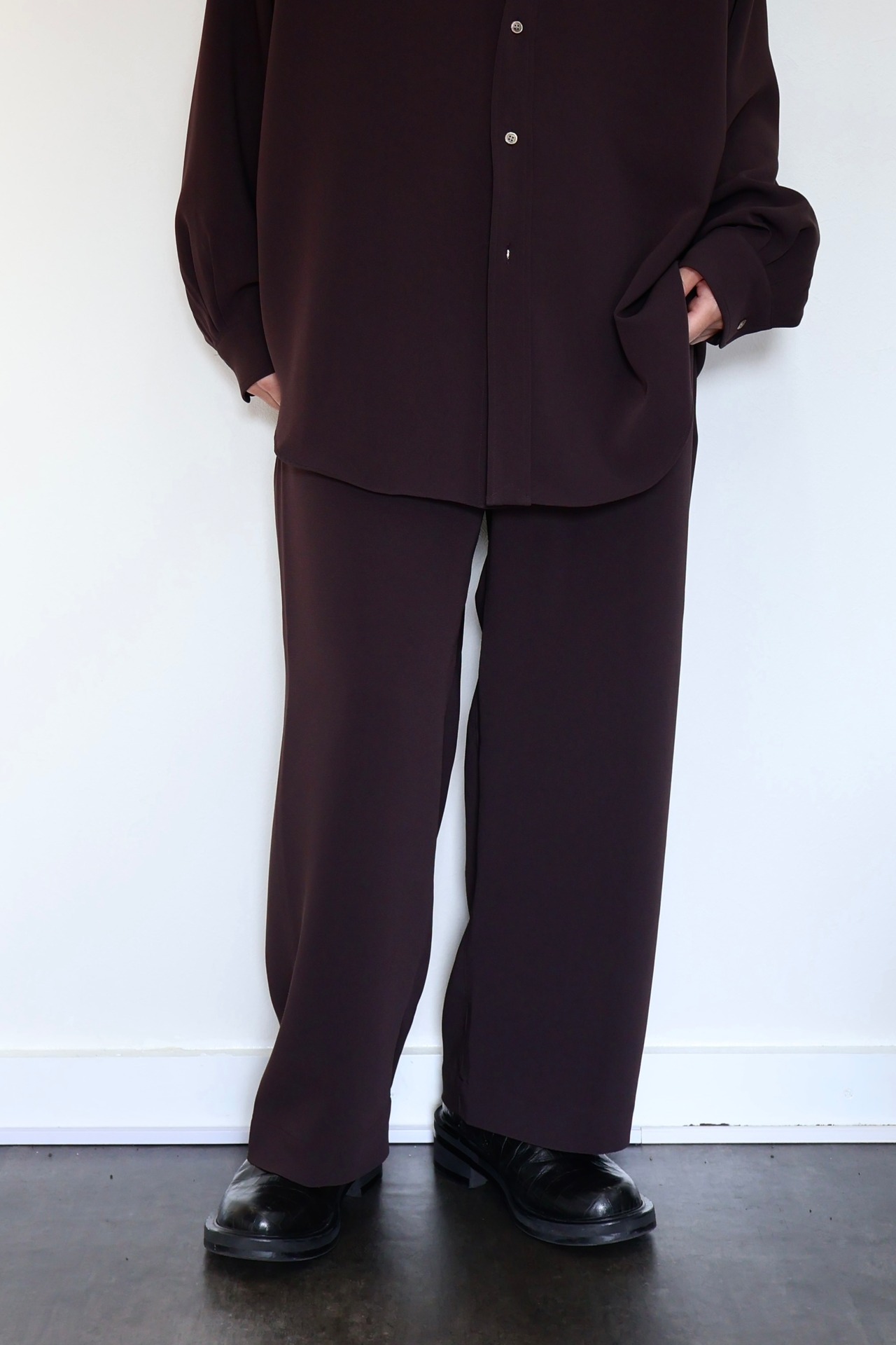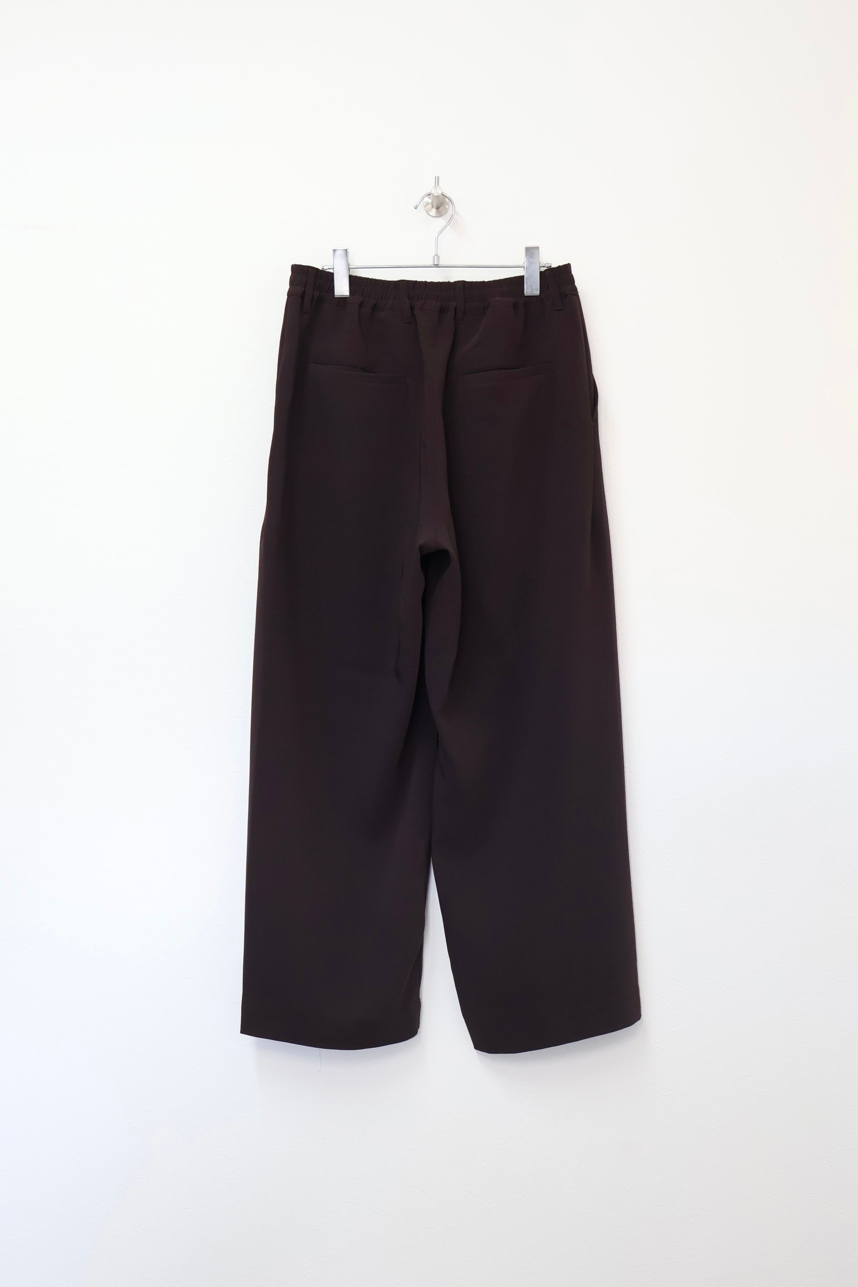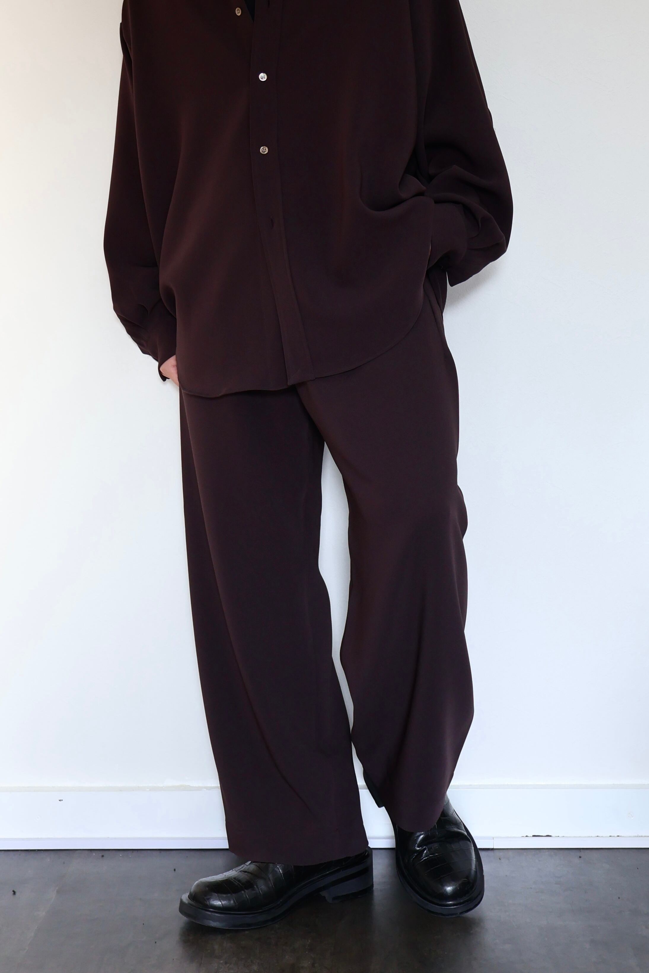 上質なトリアセテート素材を使用したイージースラックス。フロントは腰回りをすっきりと見せるノータック仕様でフロント部以外はギャザー仕様になっている。柔らかく上品な肌触りとドレープ感が特徴。