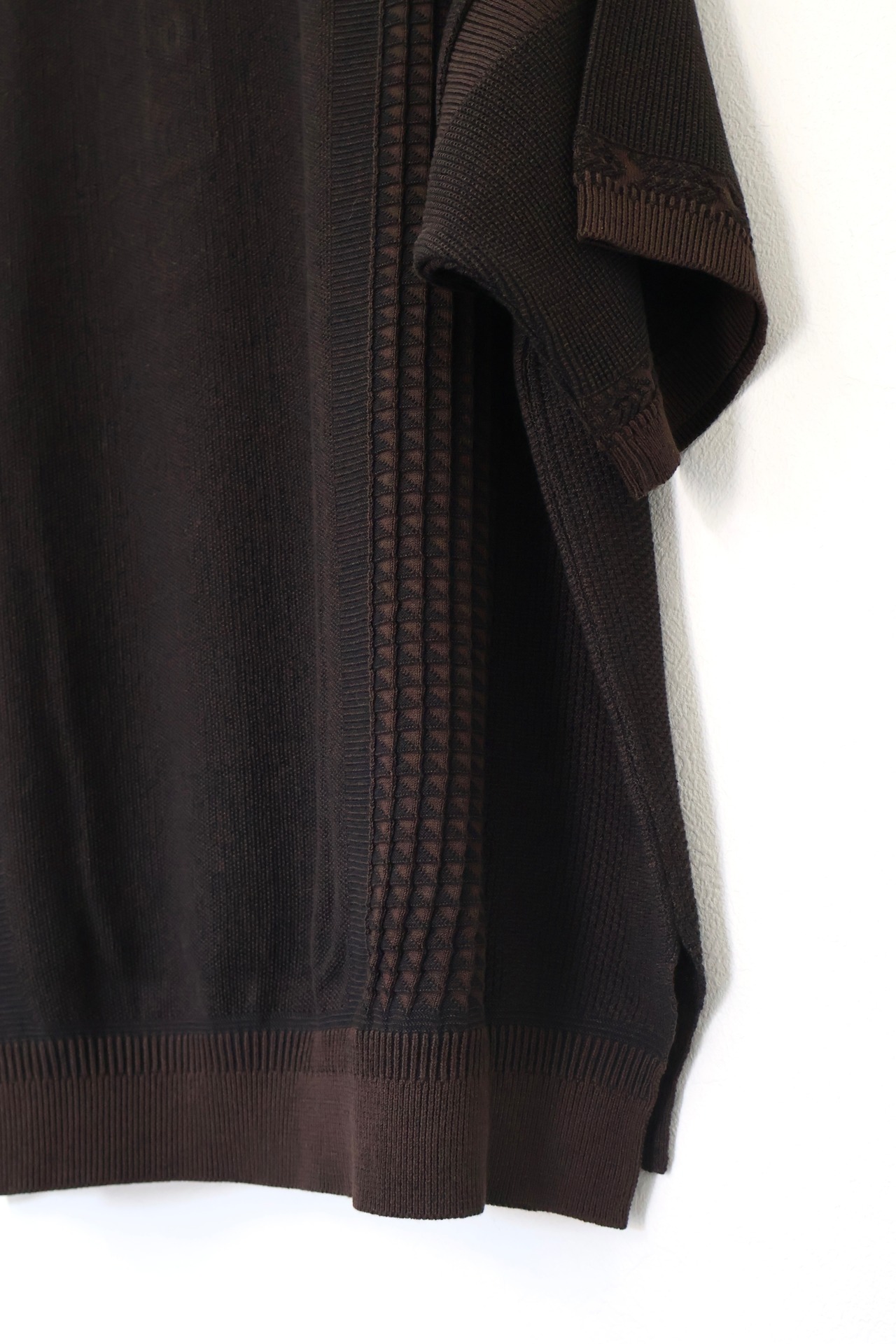 プレーティング編みと言われる表目側と裏目側で異なる糸を編む技法を使用し表と裏で糸の色を変えて、2個で編むことで奥行きのある表情に仕上げた。着用時に肩が落ちて柔らかな印象になる様にYASHIKIでは定番となった着物のパターンをオマージュして仕上げています。サイドのスリットで軽やかな印象をプラス。袖口にはブランドアイコンの【矢絣1柄が入ります。