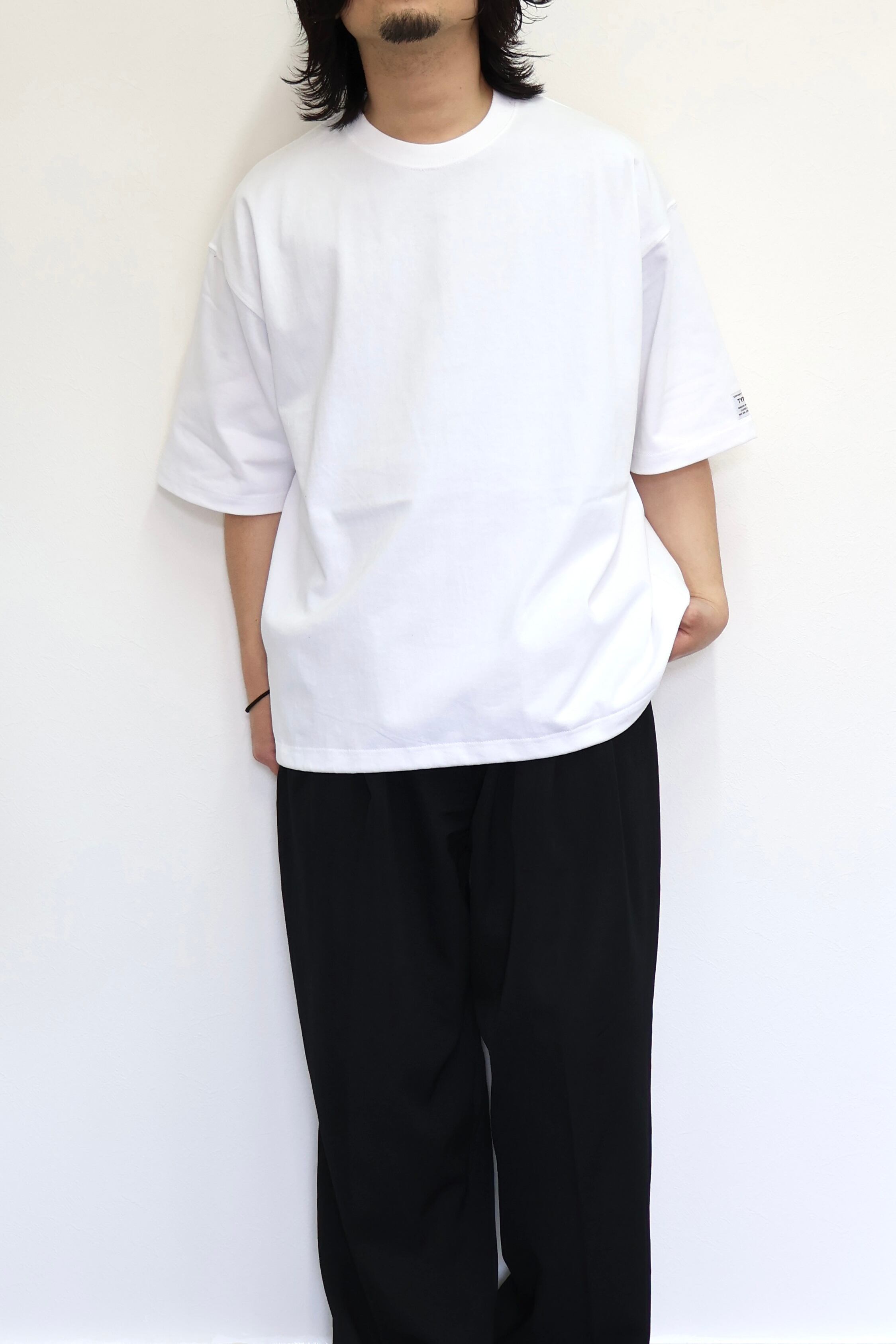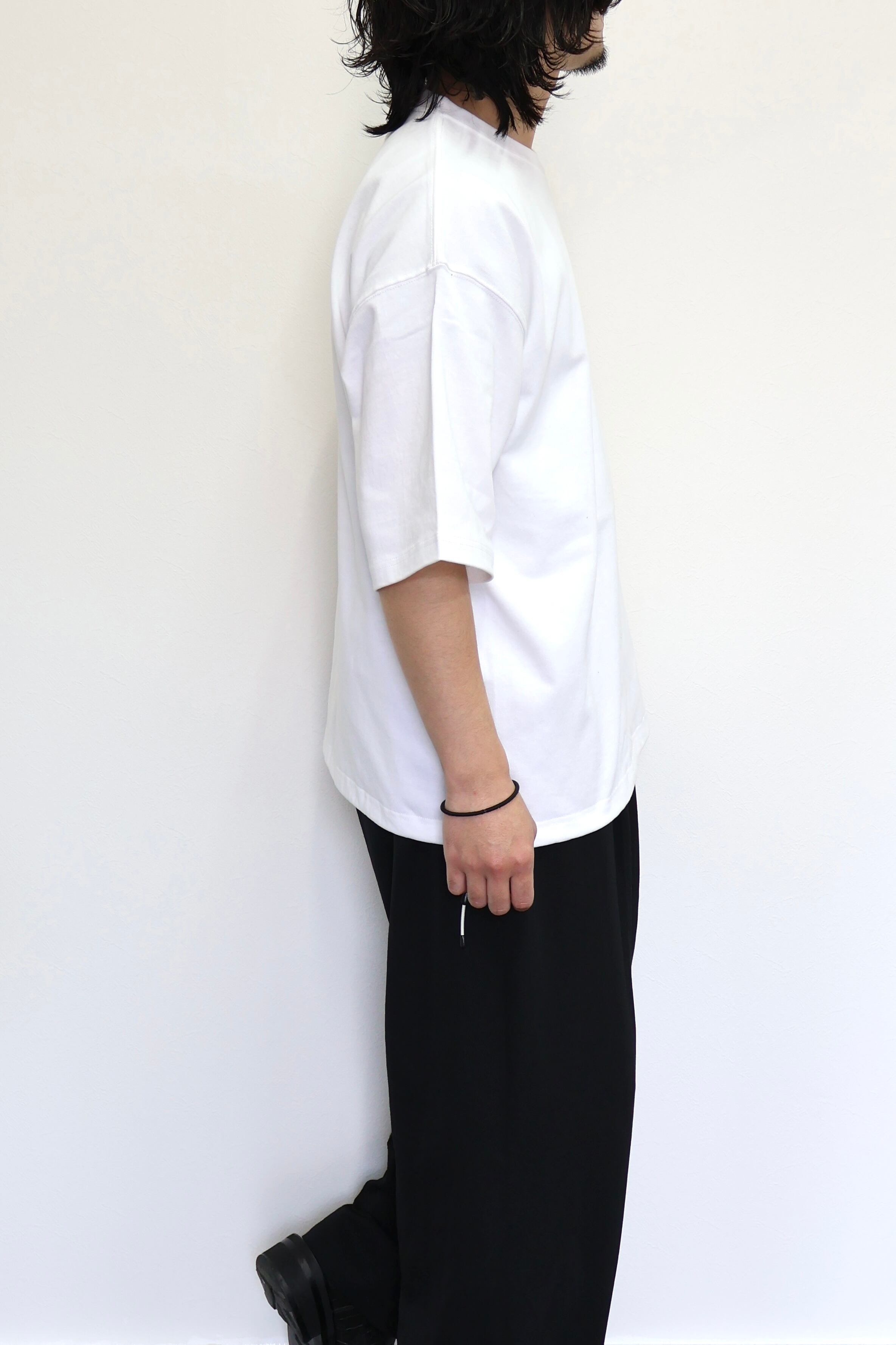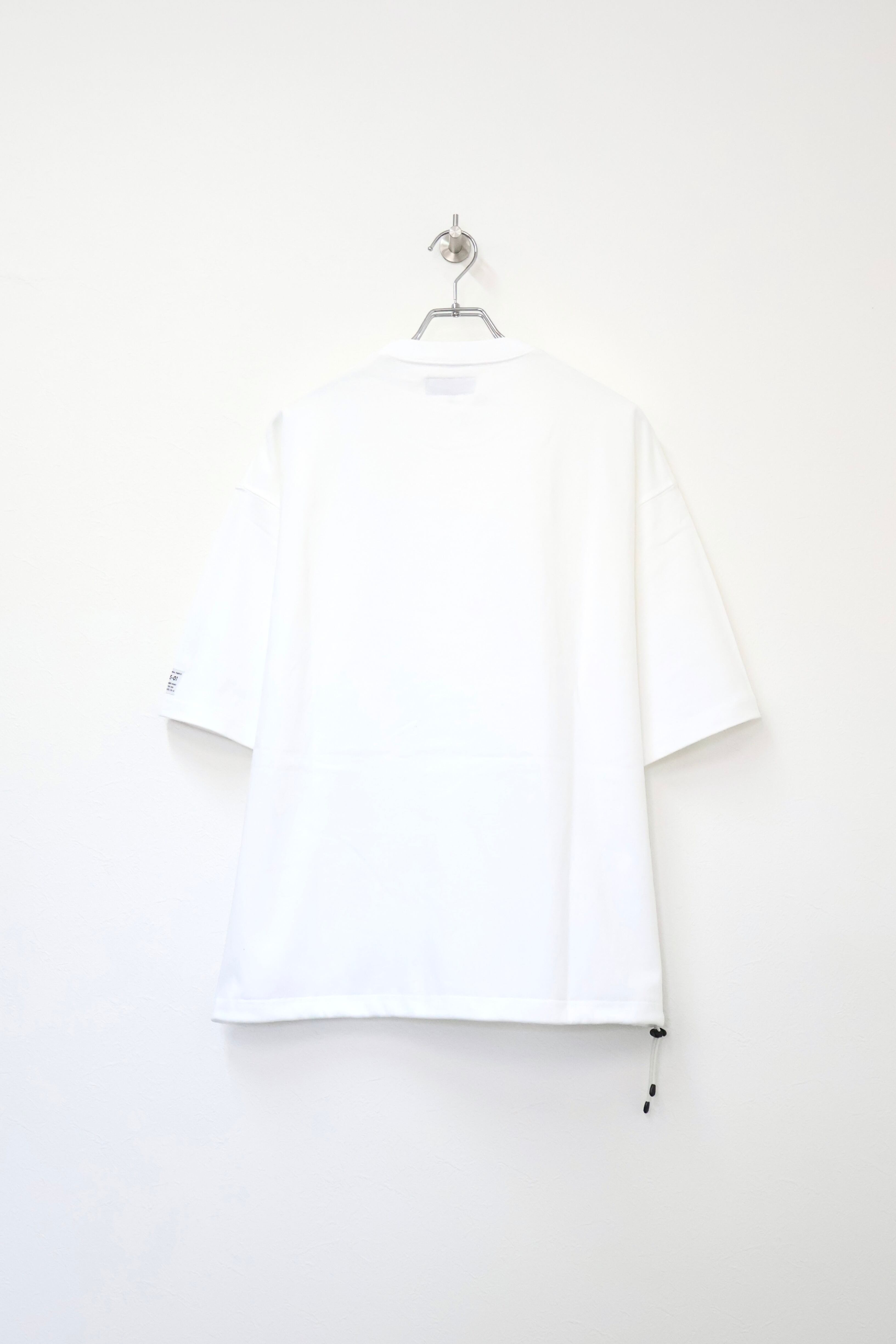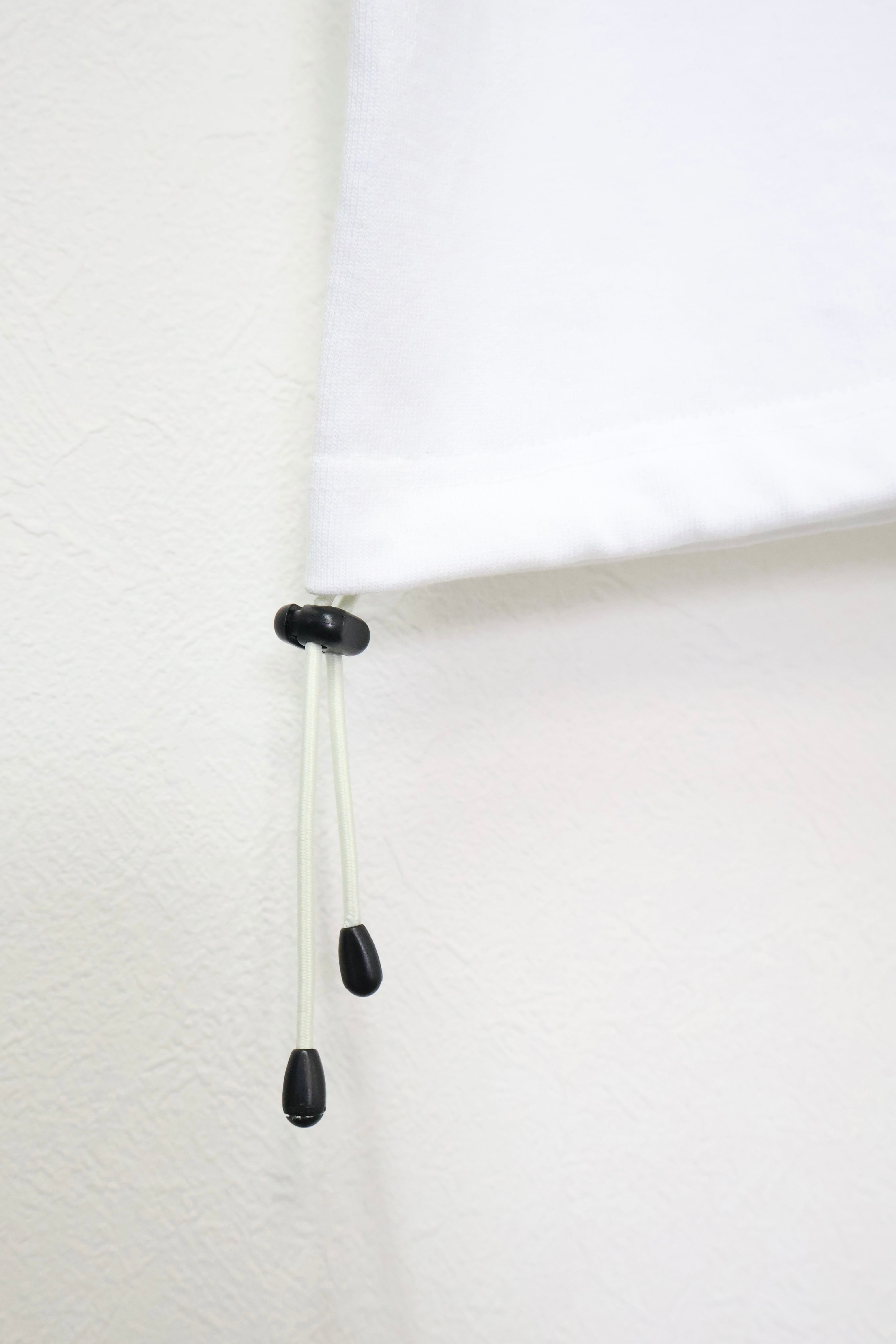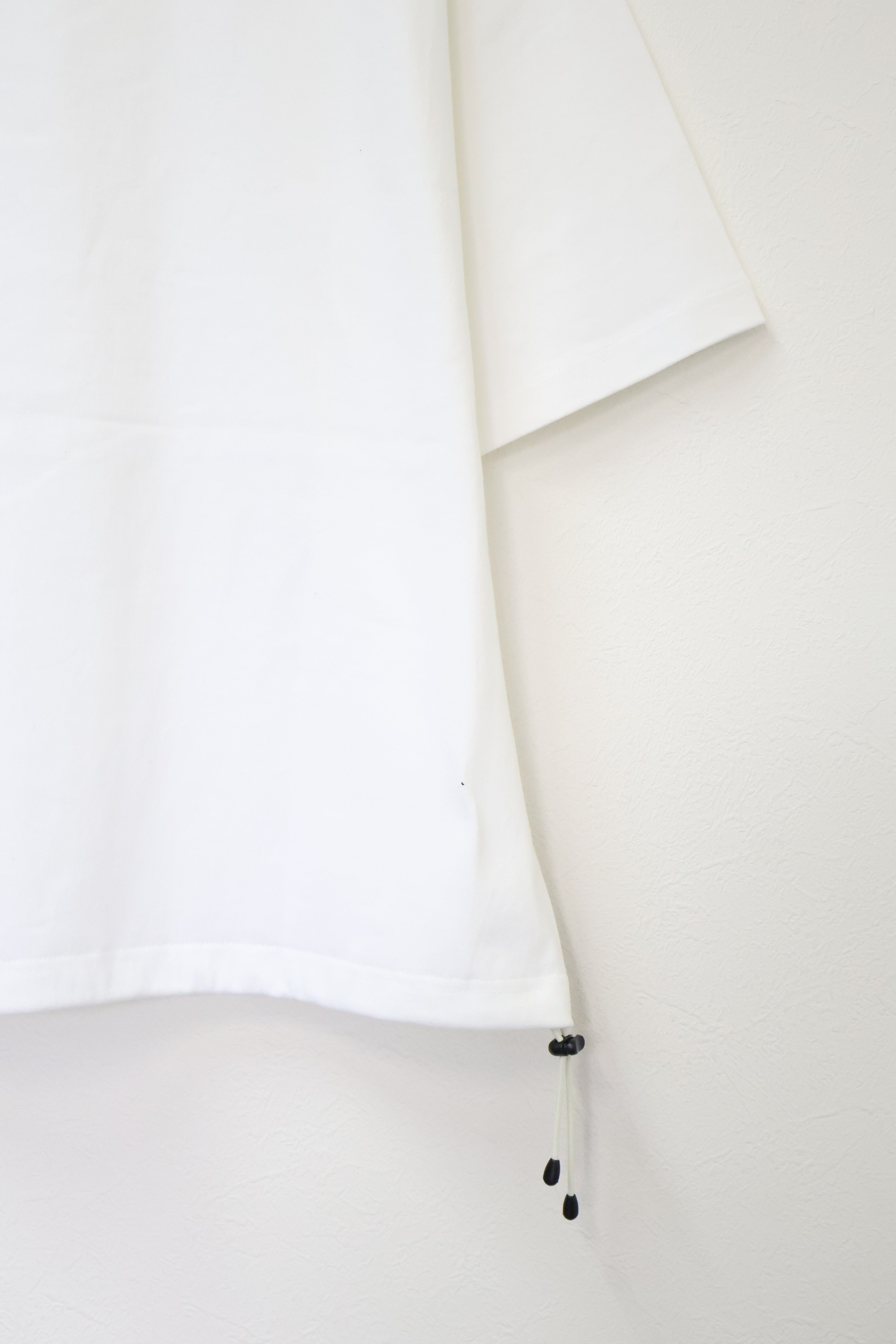 定番で展開している身幅にゆとりをもたせたボックスシルエットのアイテム。素材には強撚糸を使用したシャリ感のあるヘビーオンスコットン天竺を使用。裾部分にはアジャスター付きドローコードを配置しシルエット変更が可能。