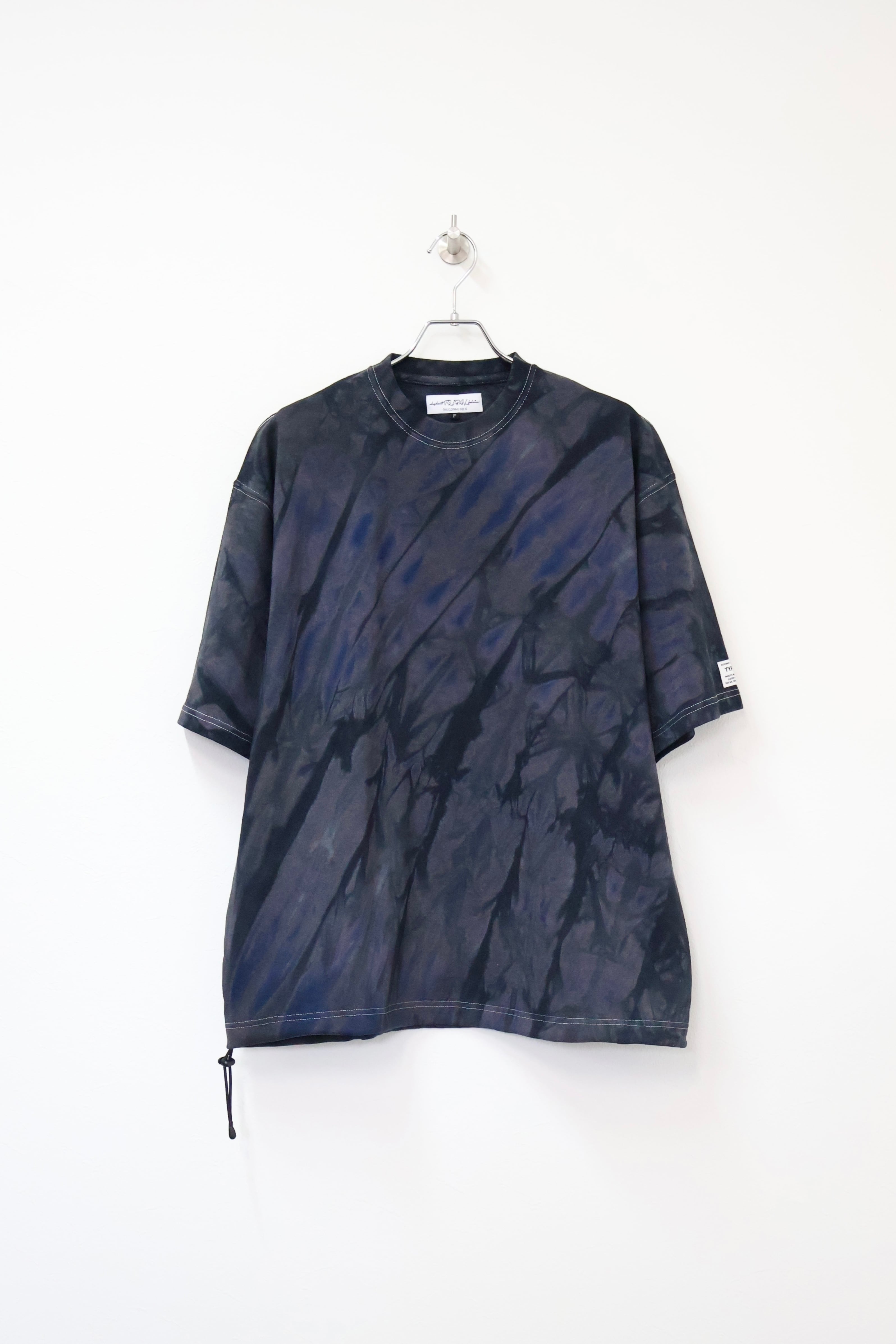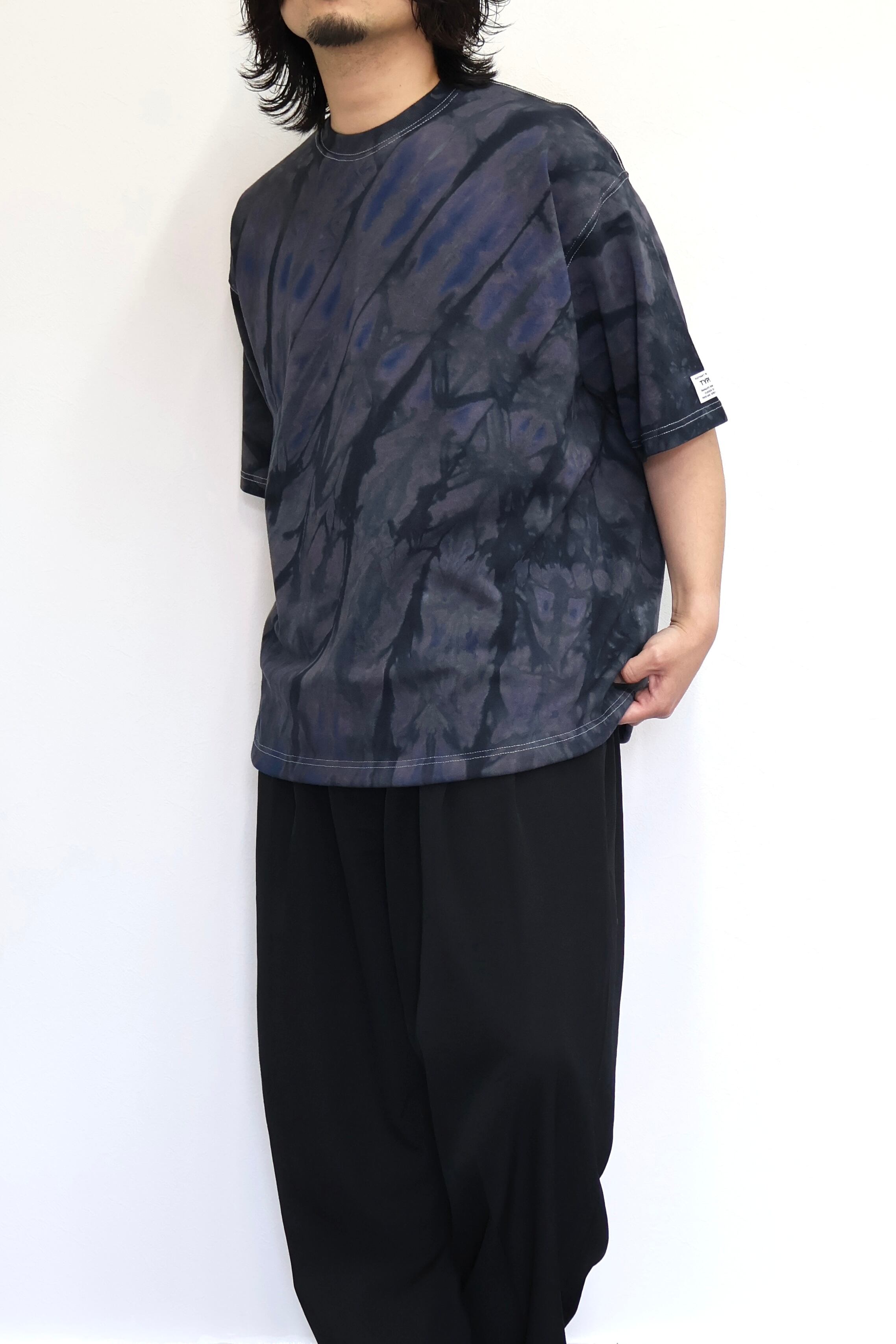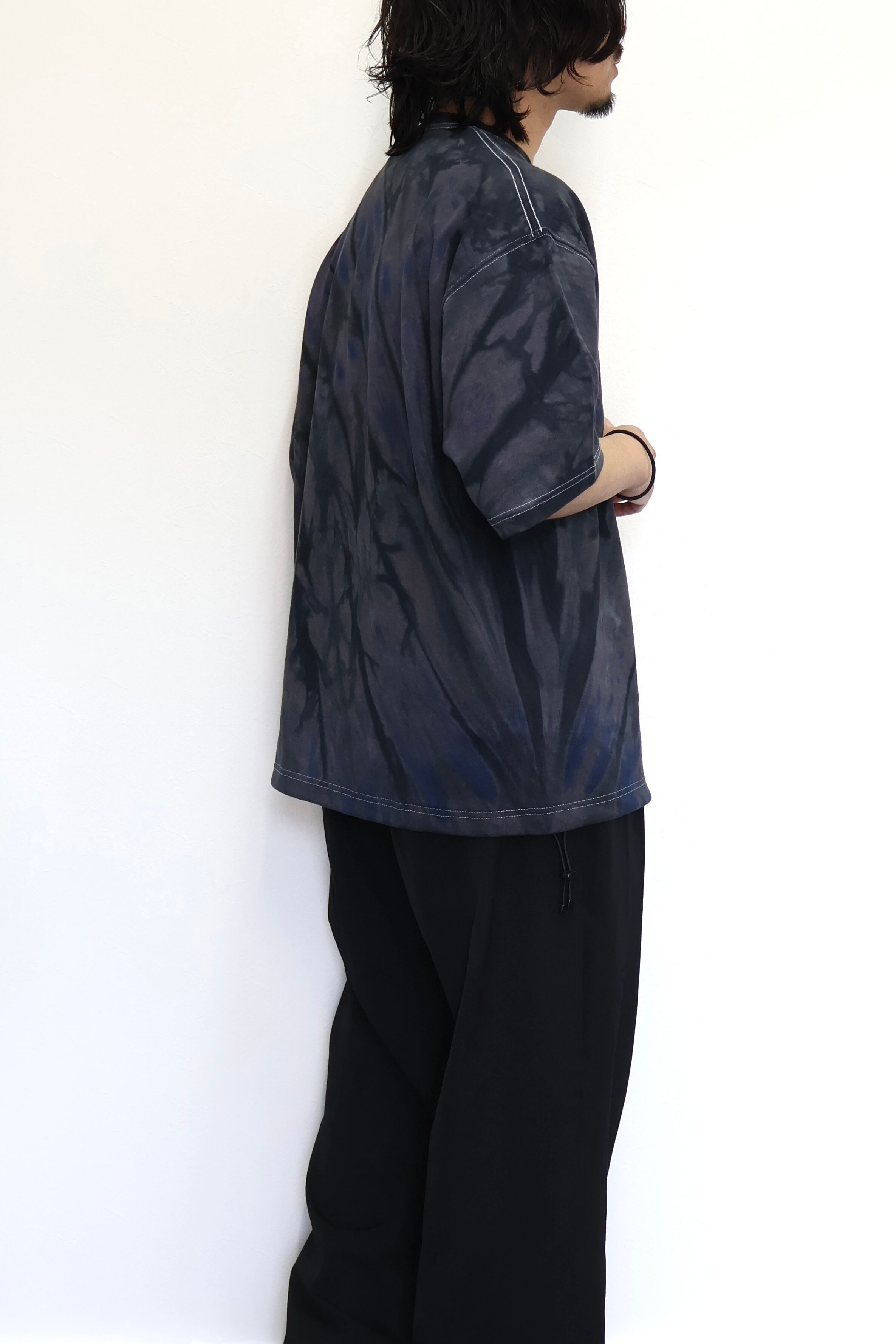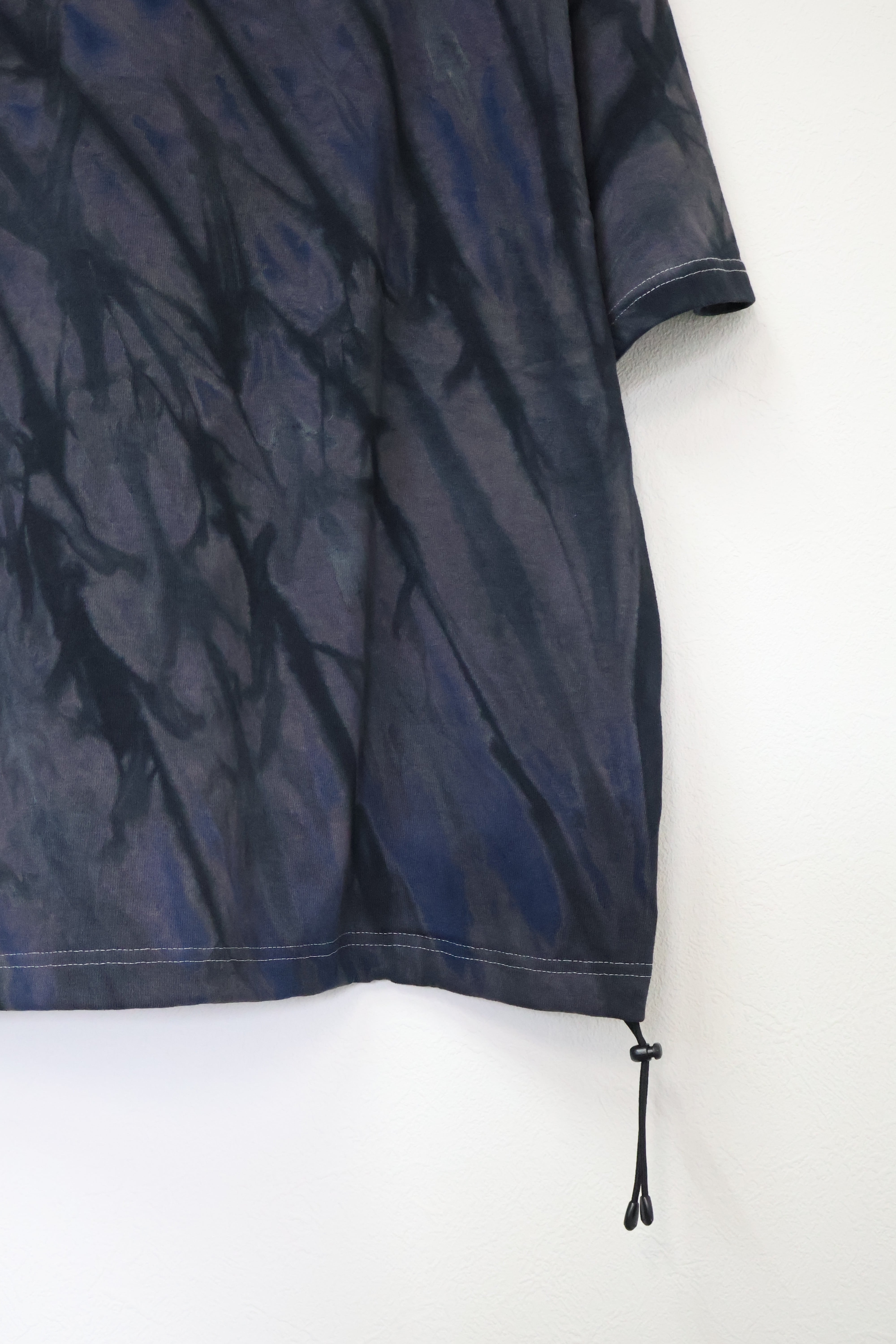 職人の手作業によるオーバーダイ加工、抜染加工、たたみ染め加工の3種の染色技法を組み合わせ、夜明け前の海が見せる複雑な表情と揺らぎを表現。素材には強撚糸を使用した、シャリ感のあるヘビーオンスコットン天竺を使用。身幅にゆとりを持たせたボックスシルエット。裾部分にはアジャスター付きドローコードを配置しシルエット変更が可能。