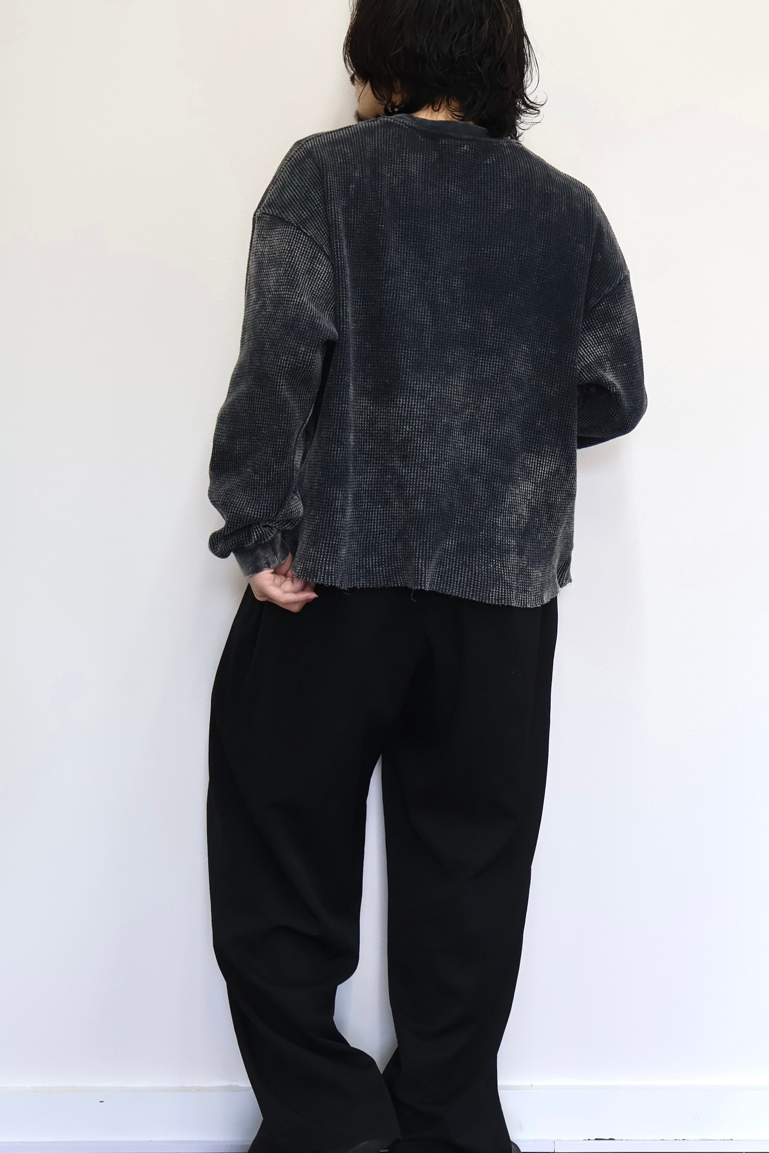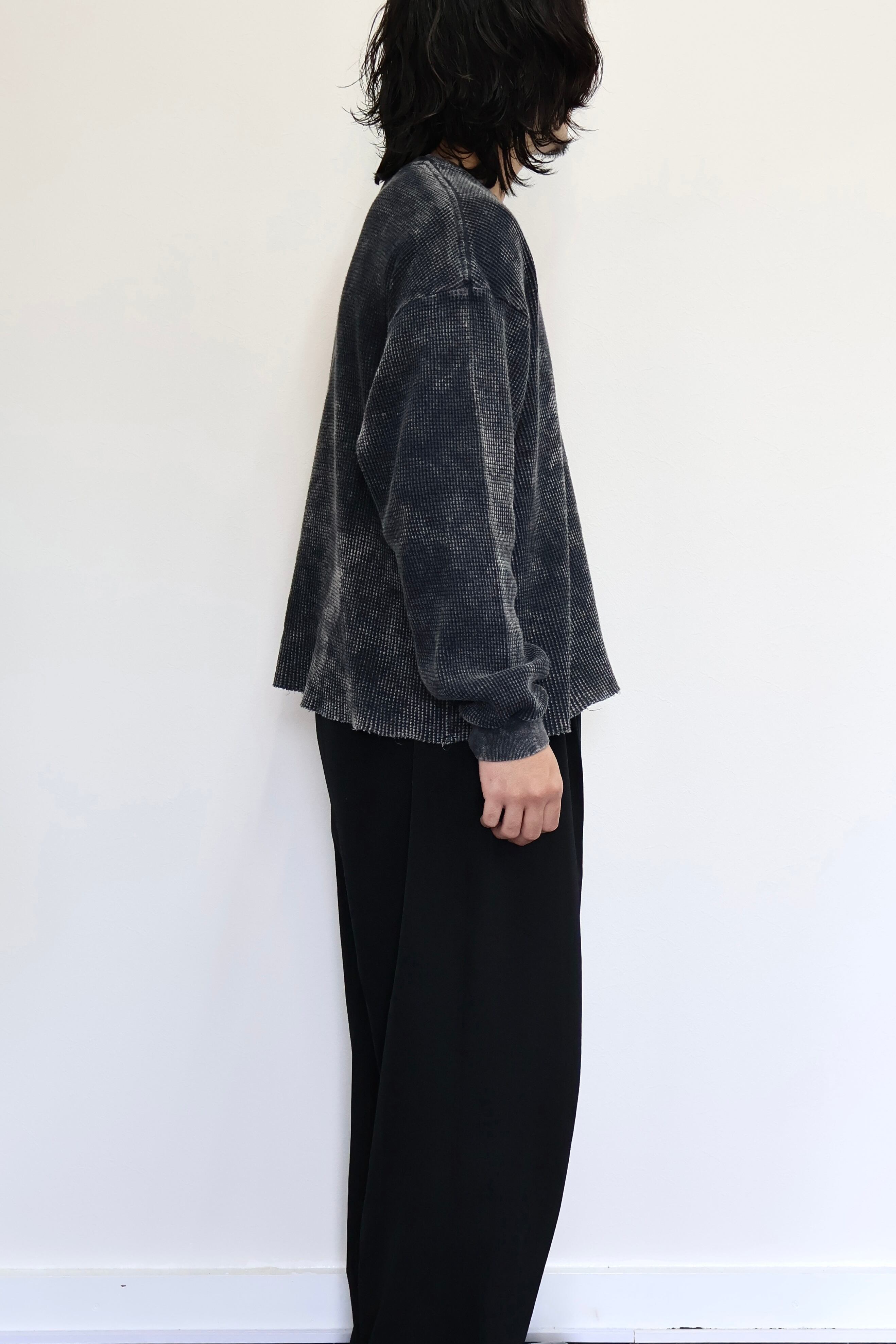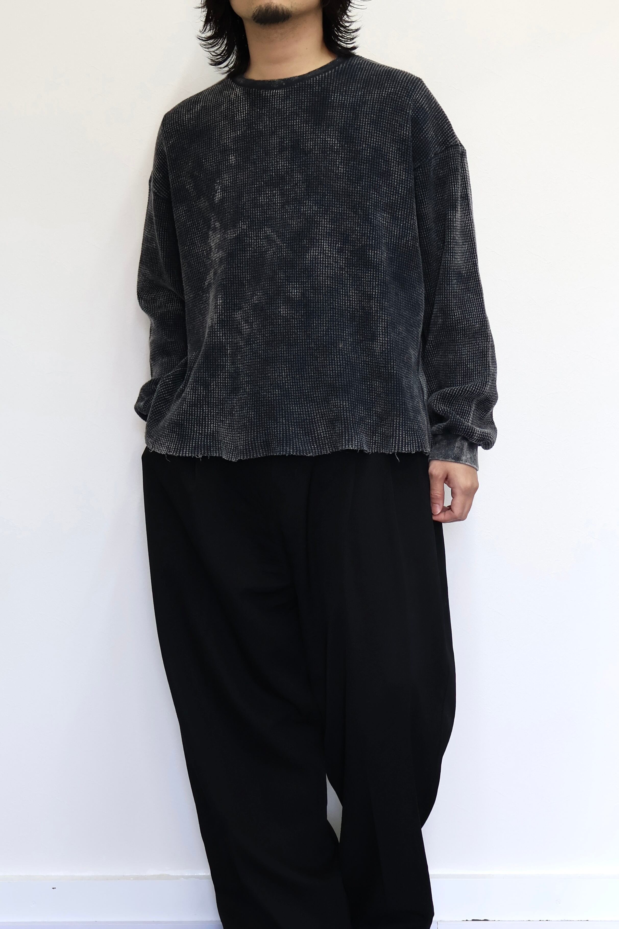 ケミカルウォッシュによる独特な製品染めを施したワッフル素材のロングスリーブカットソー。身幅とアームを大きめに設定したワイドシルエット。製品加工の特性上、一点ごとに風合いが異なる仕上がり。