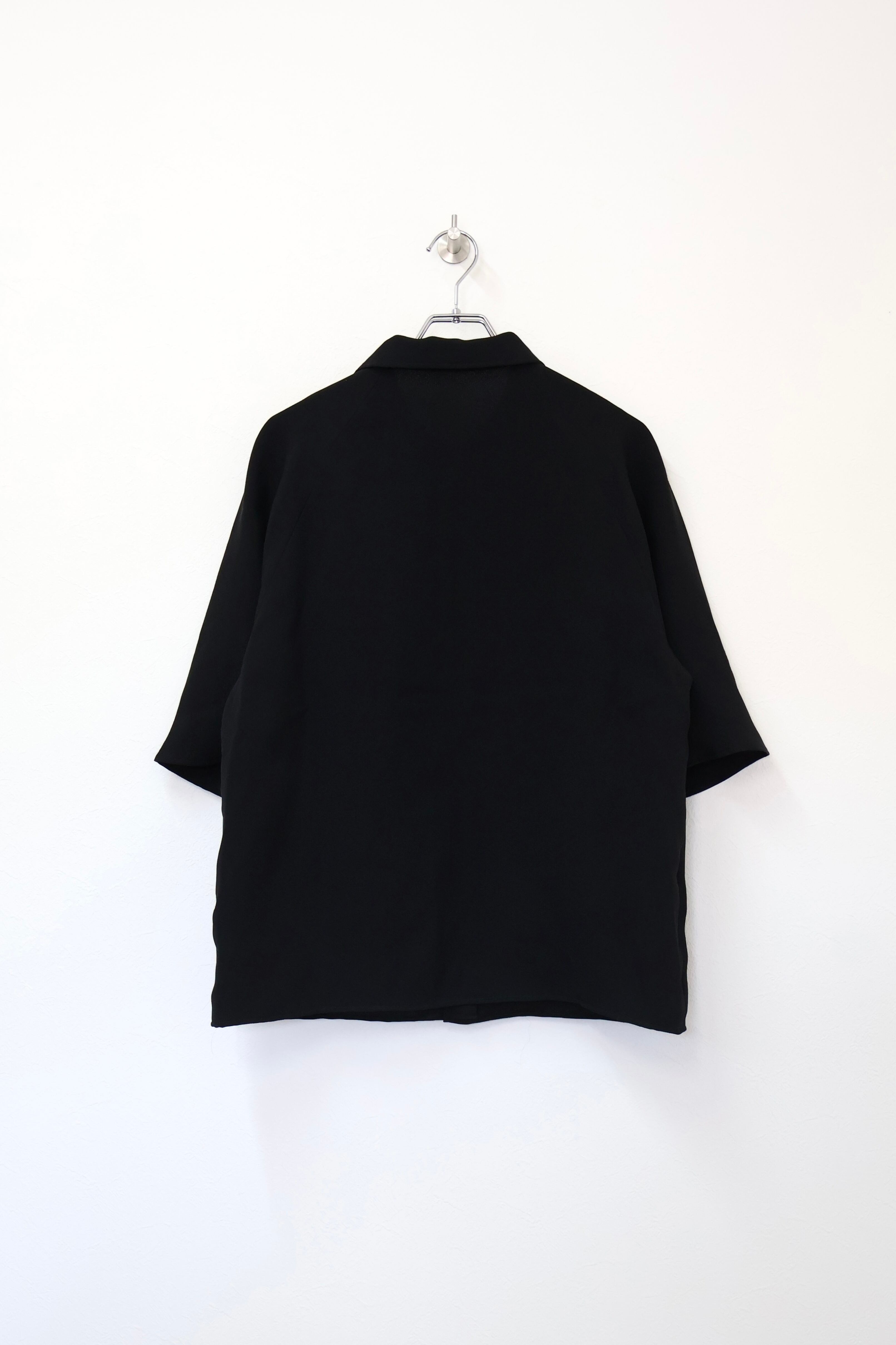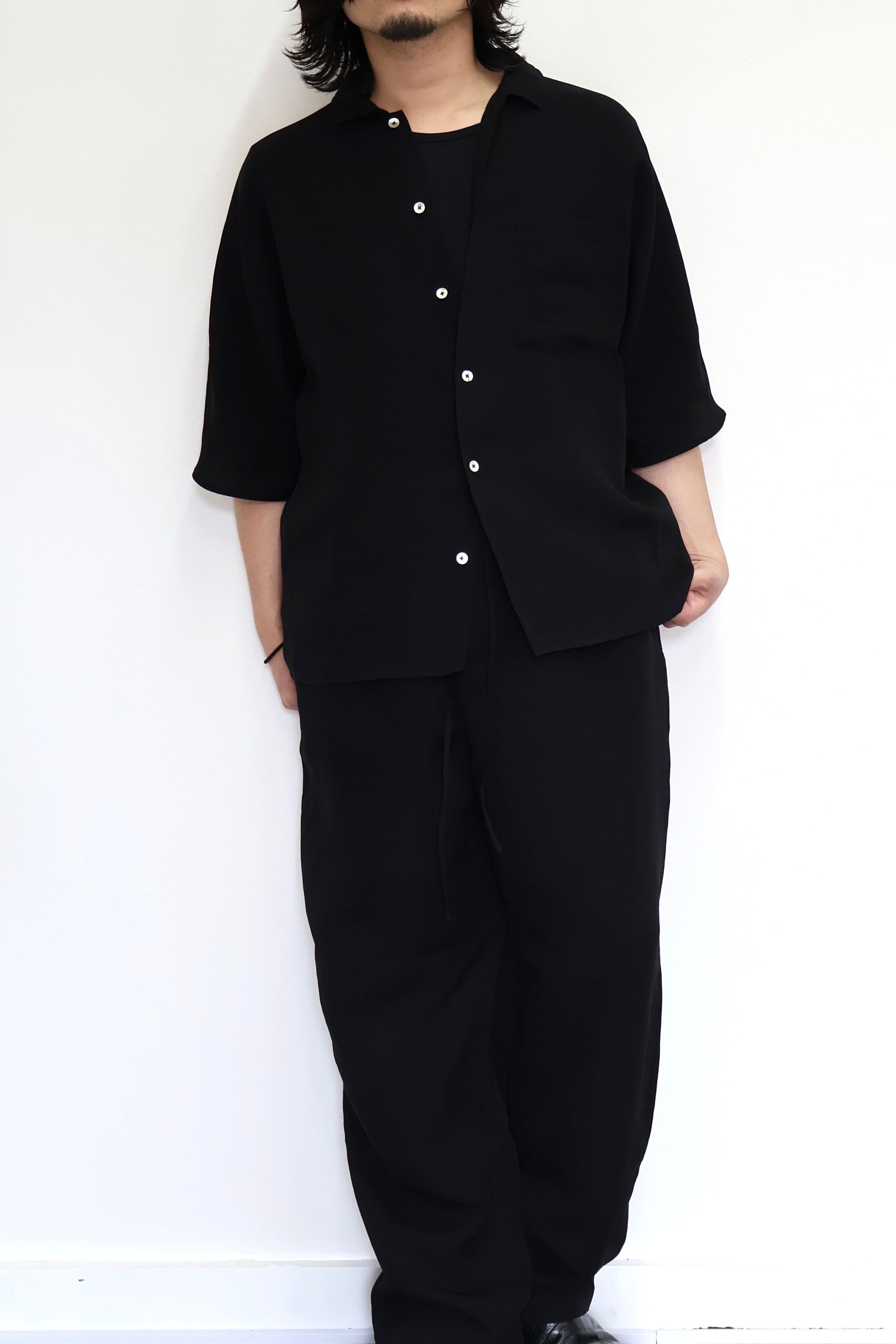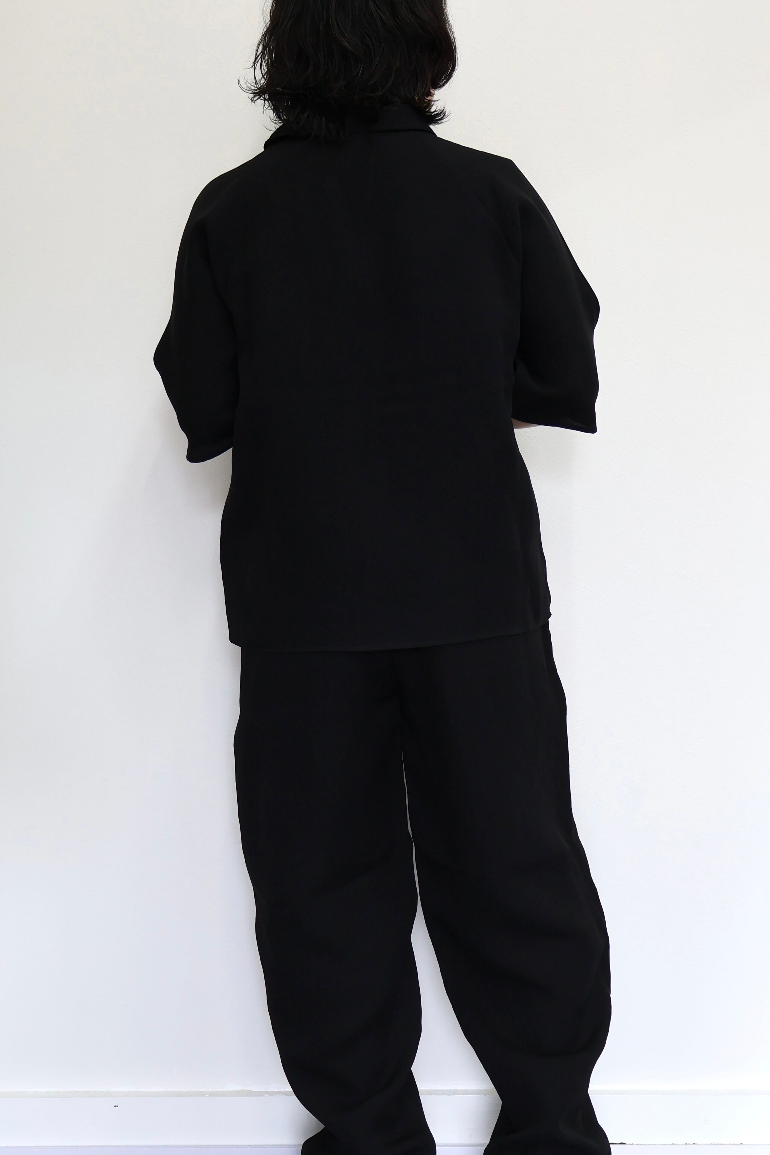 一見普通のショートスリーブシャツではなくメンズでは珍しいドルマンスリーブの仕様で前見頃が後見頃にラグランスリーブの仕様で繋がっている。一癖パターンに与えて作成した1着。素材にはシルクアセテイトを採用。上品な生地表面とさりげない柄、ハリの中にも柔らかさのある風合いが特徴。P004B-SAとセットアップで着用可能。