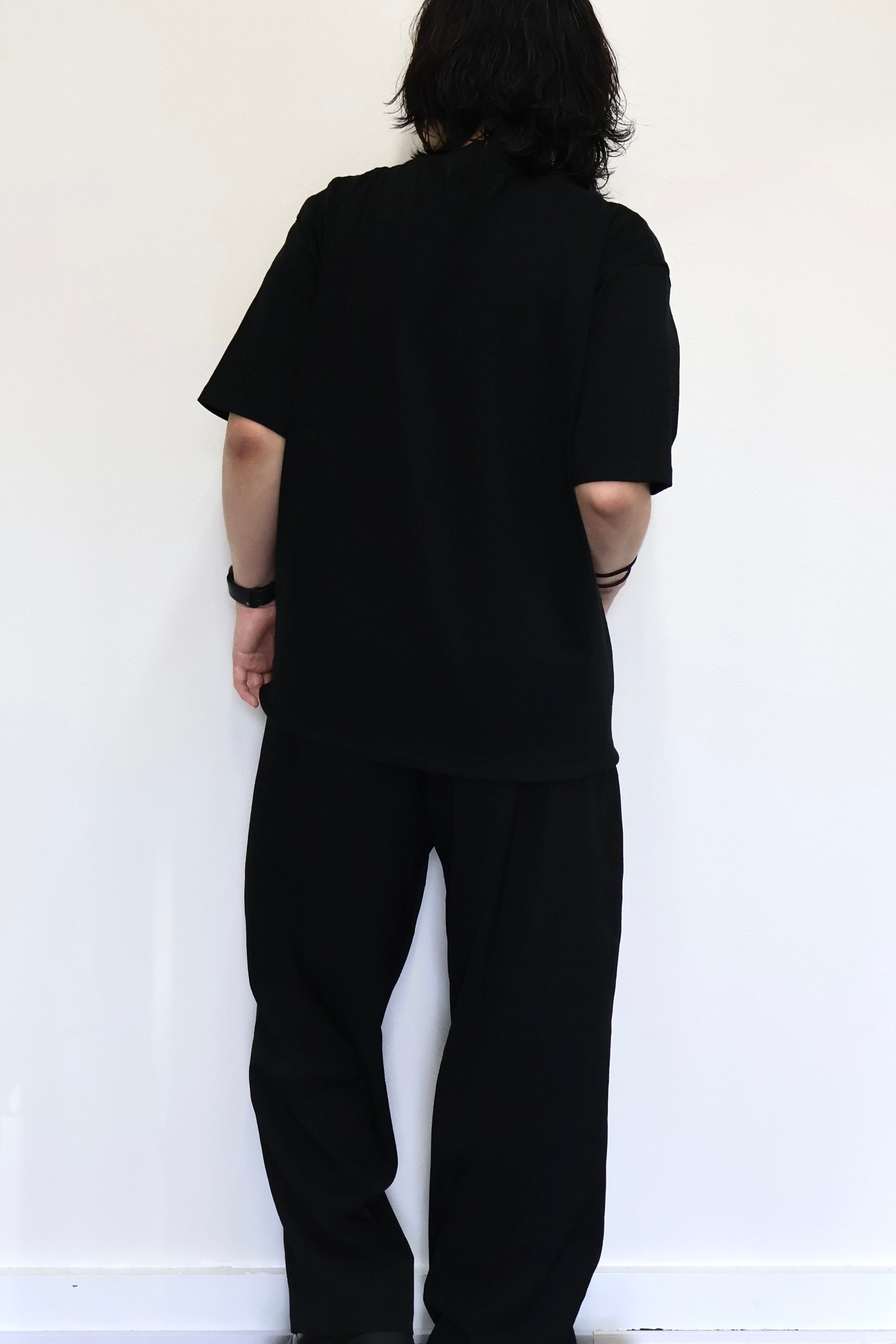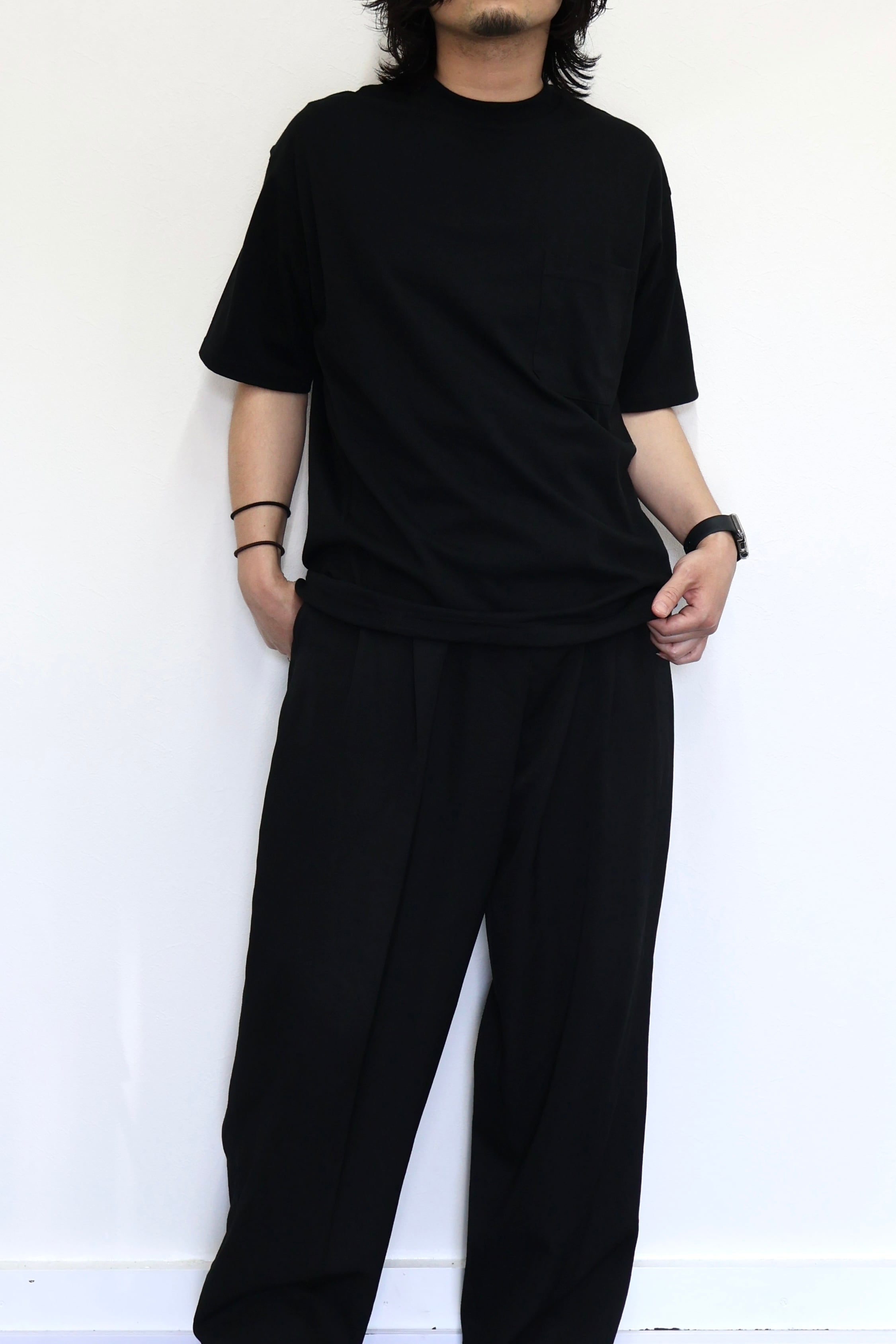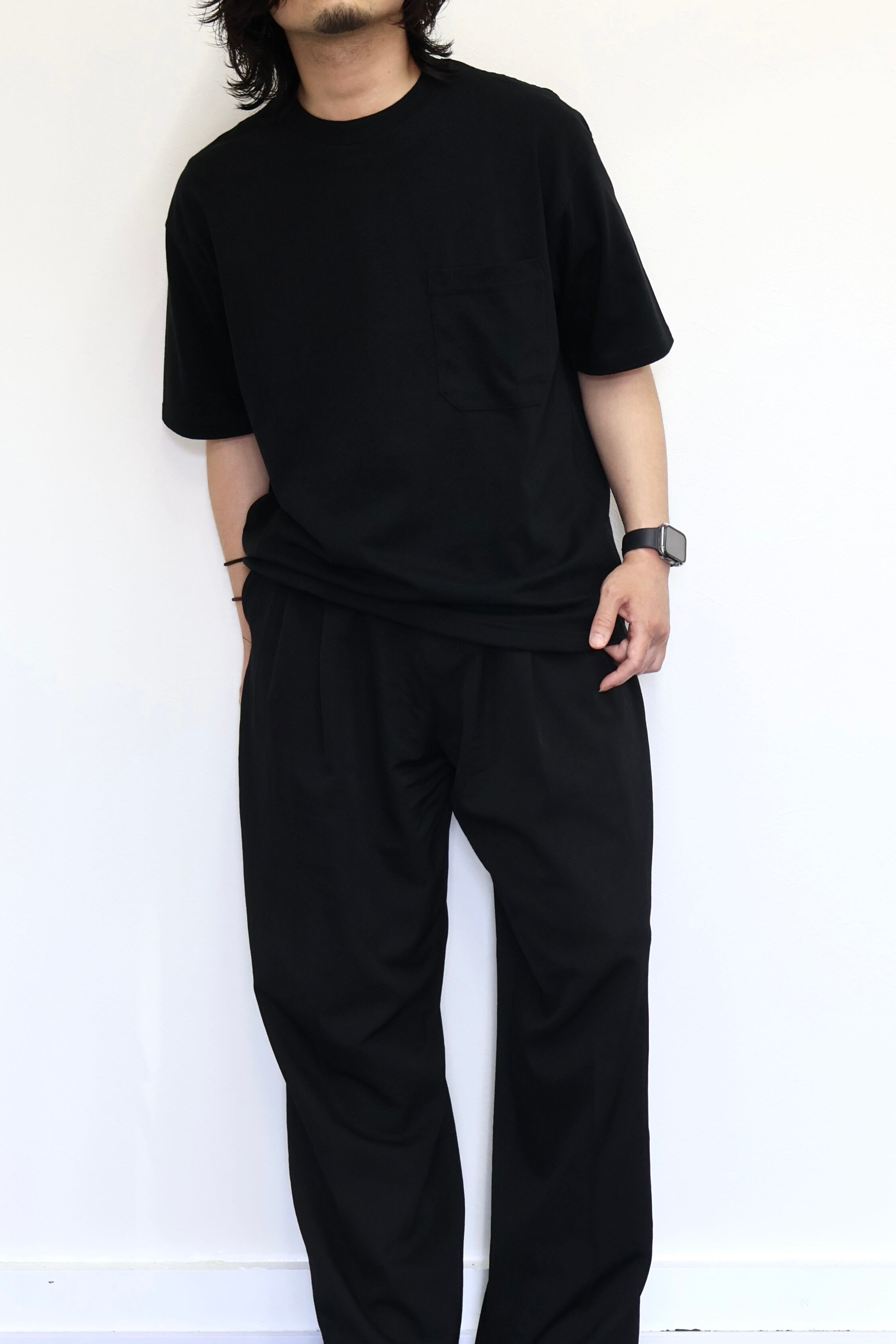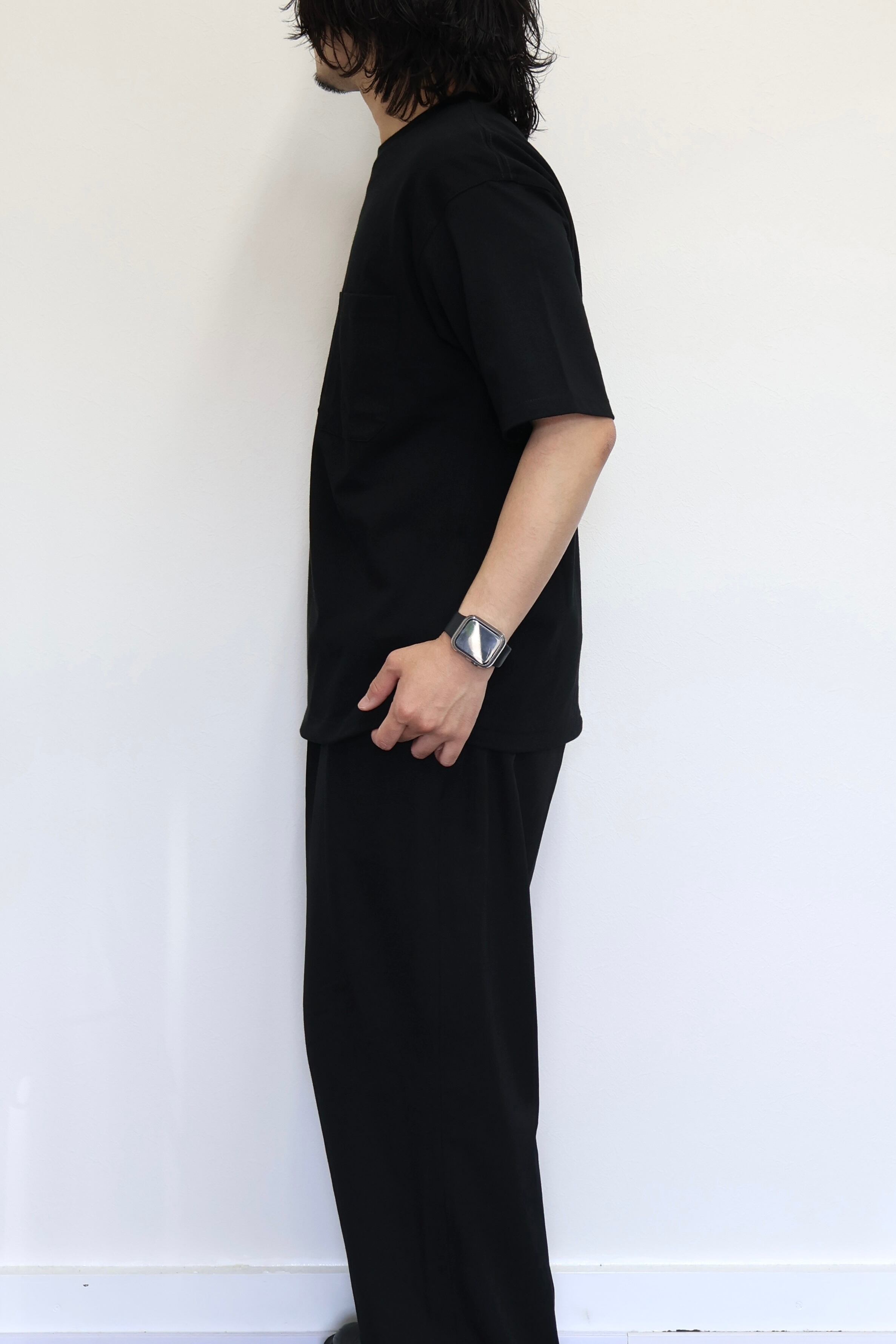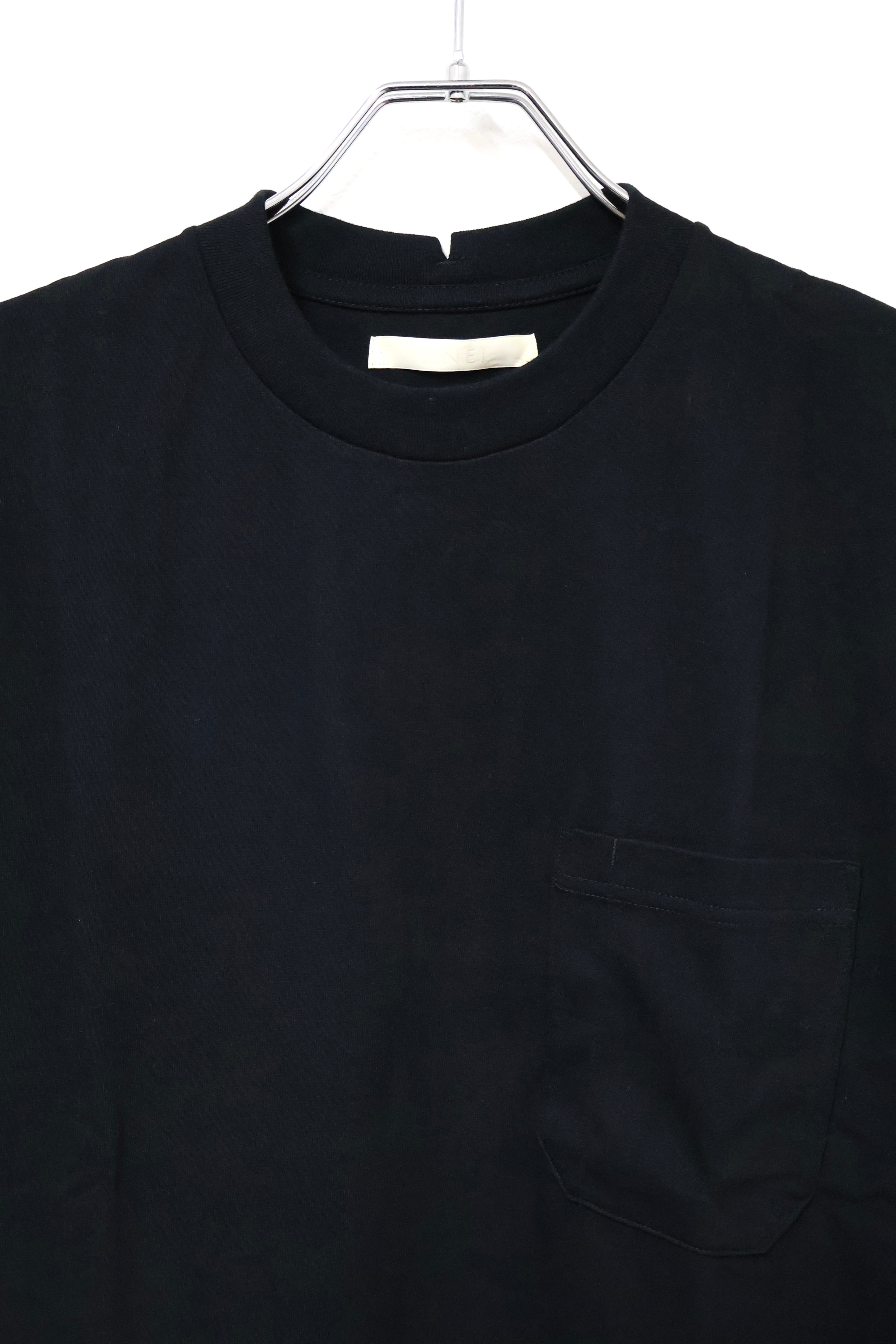 ポケットTシャツ。生地はUSコットンを使用した7オンス天竺。ドライタッチな風合いとしっかりした厚みが特徴。左胸のポケットには仕切りステッチがあり、細い方にはサングラスやペンを。大きい仕切りには携帯電話が程よく収まる仕様。裾にはスピンドルを配置しシルエットのアレンジが可能。襟に入る小さなスリットもポイント。