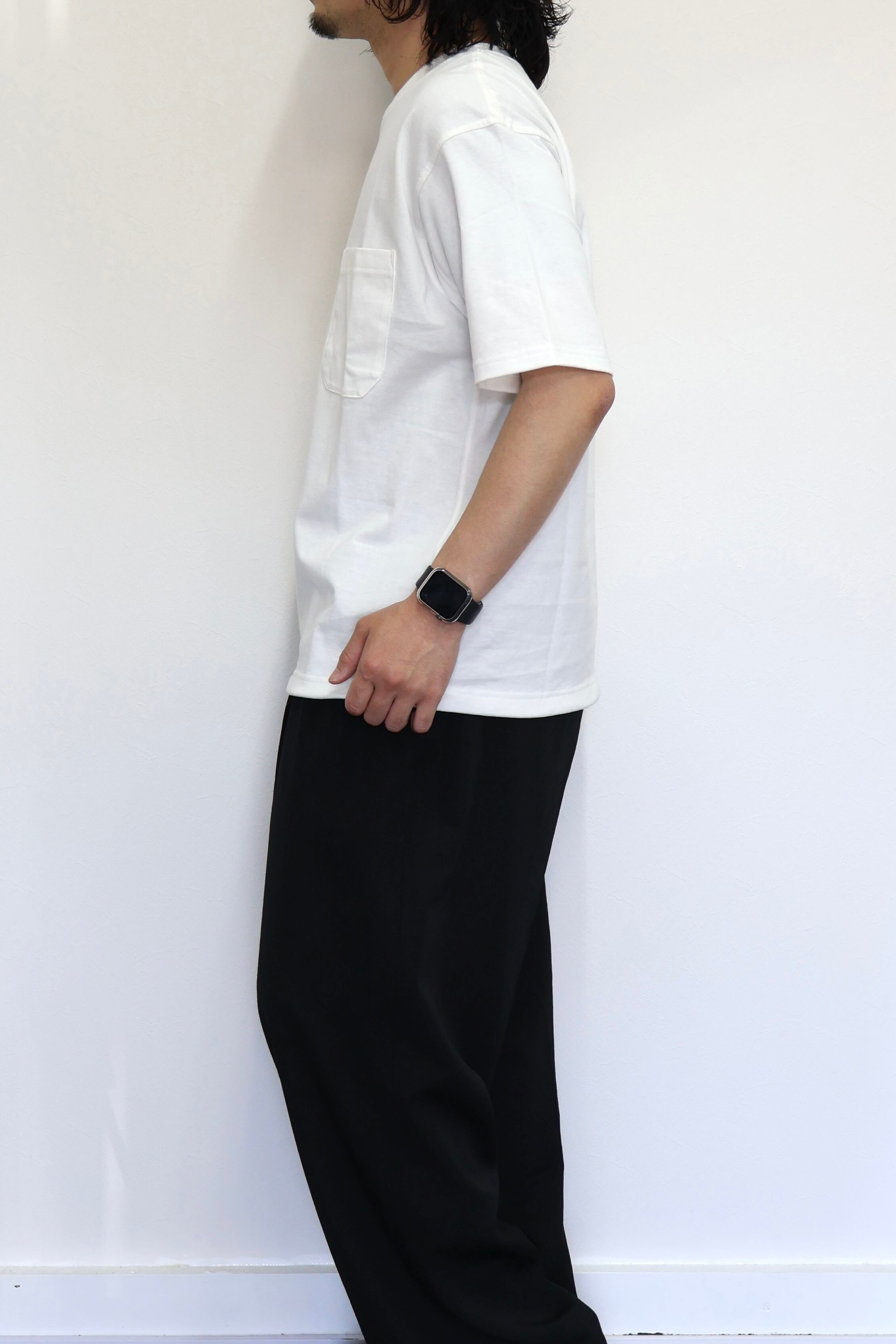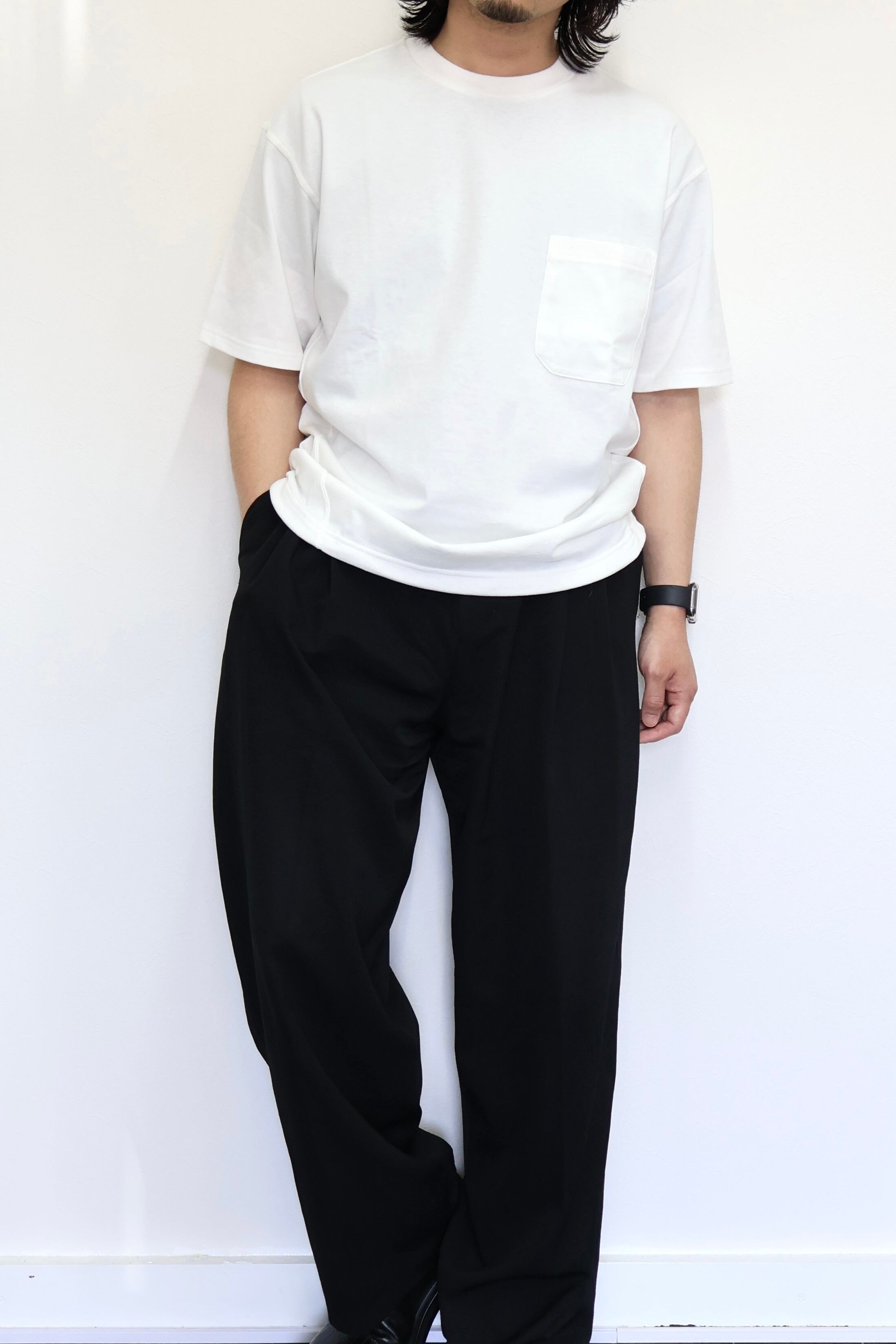 ポケットTシャツ。生地はUSコットンを使用した7オンス天竺。ドライタッチな風合いとしっかりした厚みが特徴。左胸のポケットには仕切りステッチがあり、細い方にはサングラスやペンを。大きい仕切りには携帯電話が程よく収まる仕様。裾にはスピンドルを配置しシルエットのアレンジが可能。襟に入る小さなスリットもポイント。